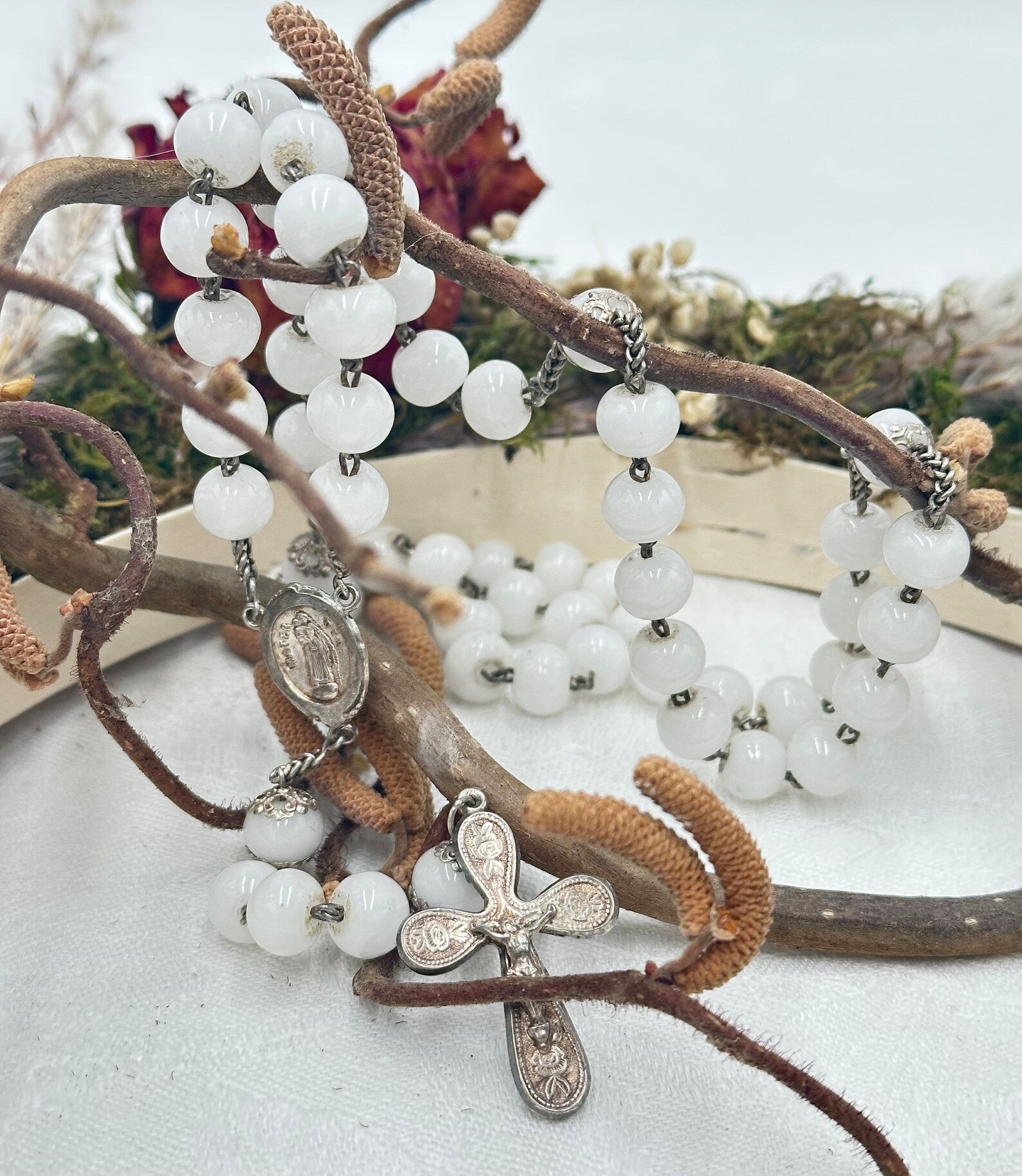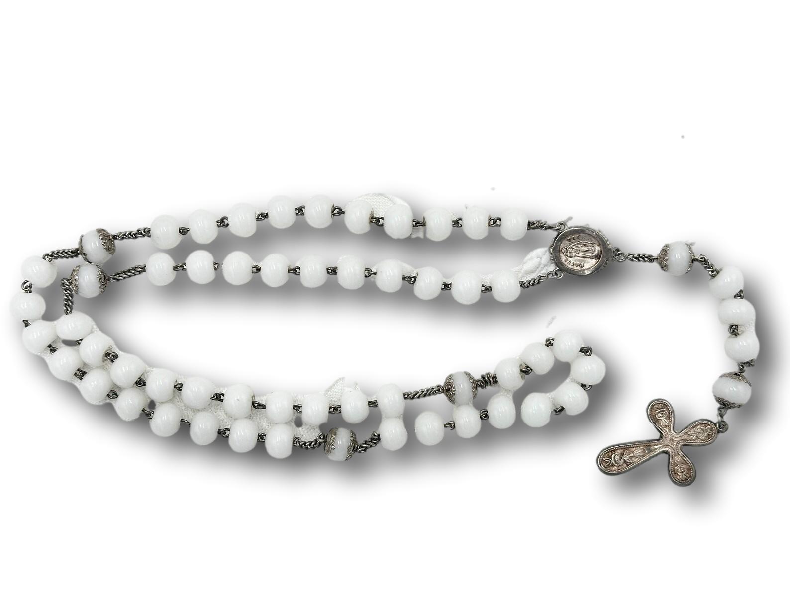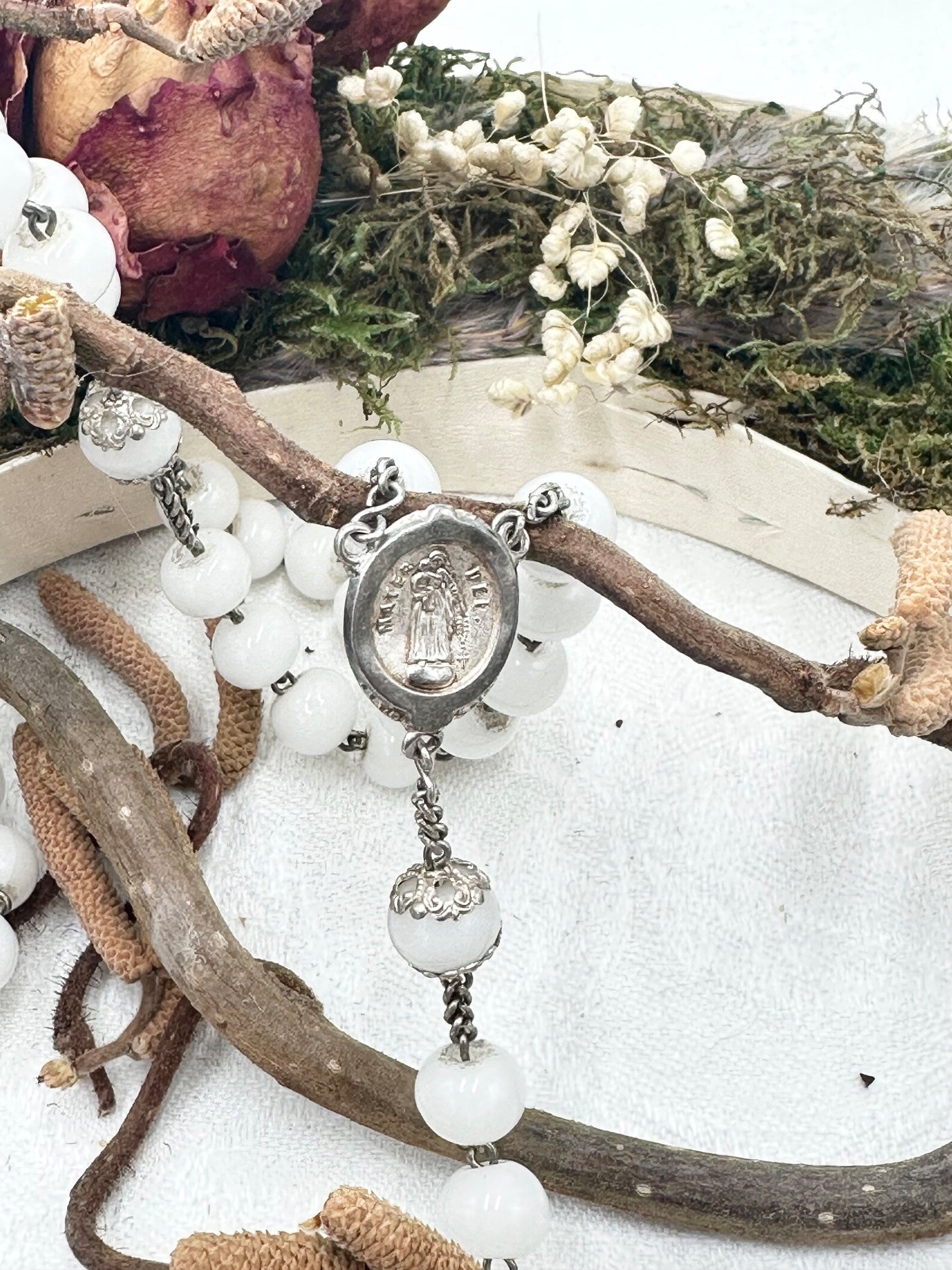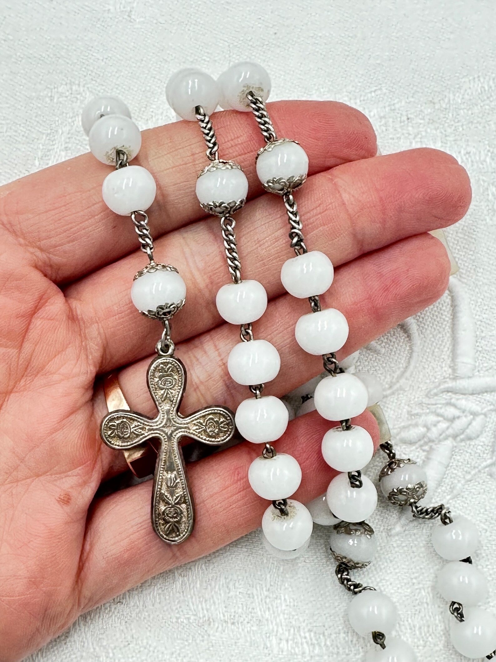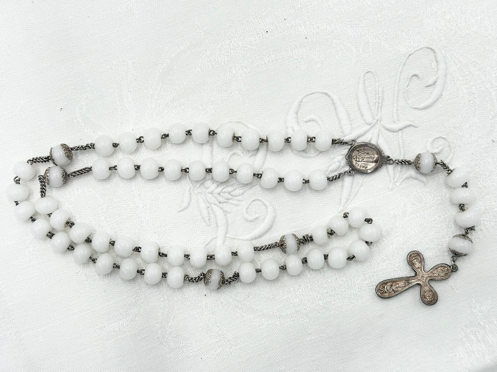 Chapelet en argent sterling et opaline blanche coiffée, chapelet en verre Français antique, cadeau de communion, cadeau de baptême