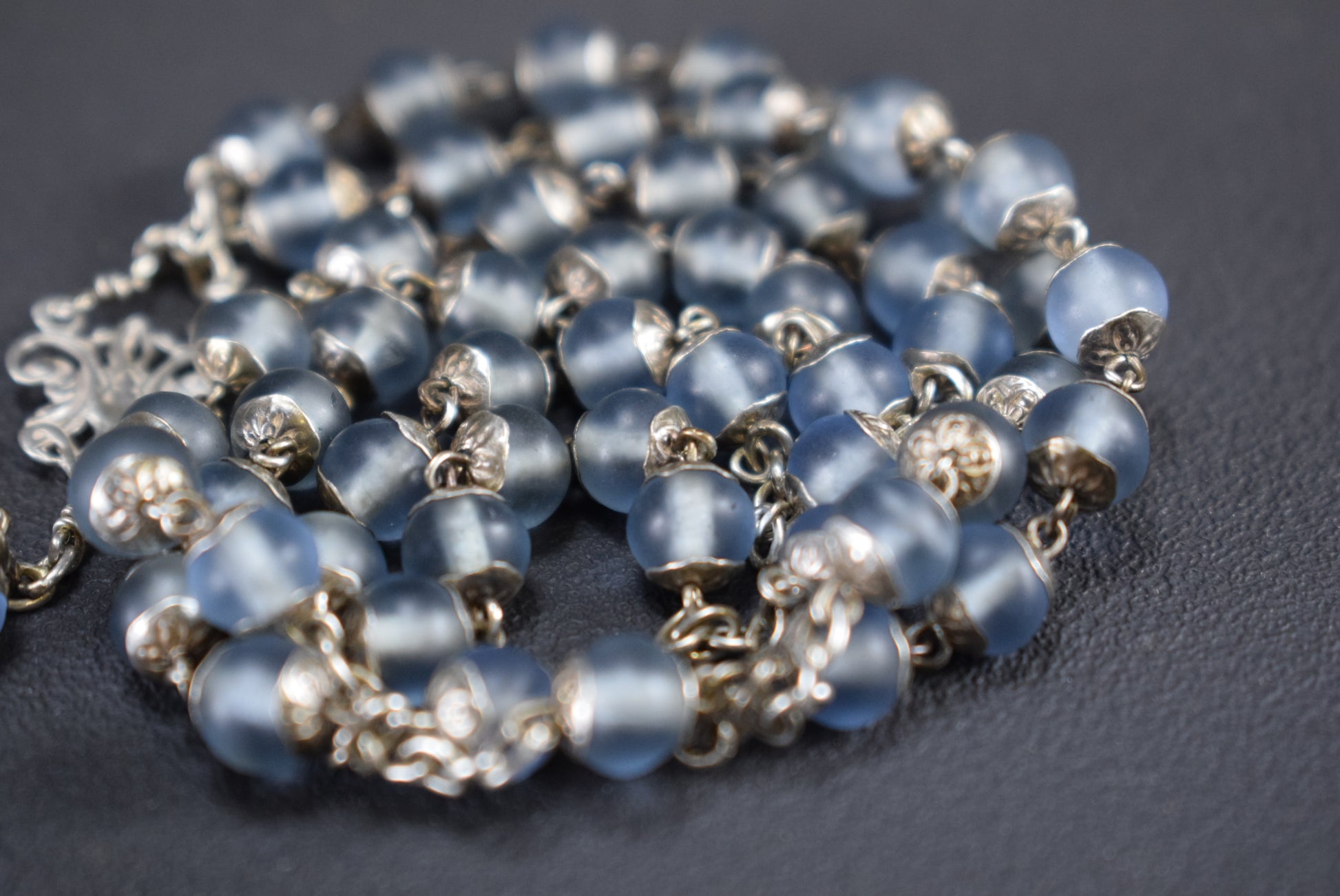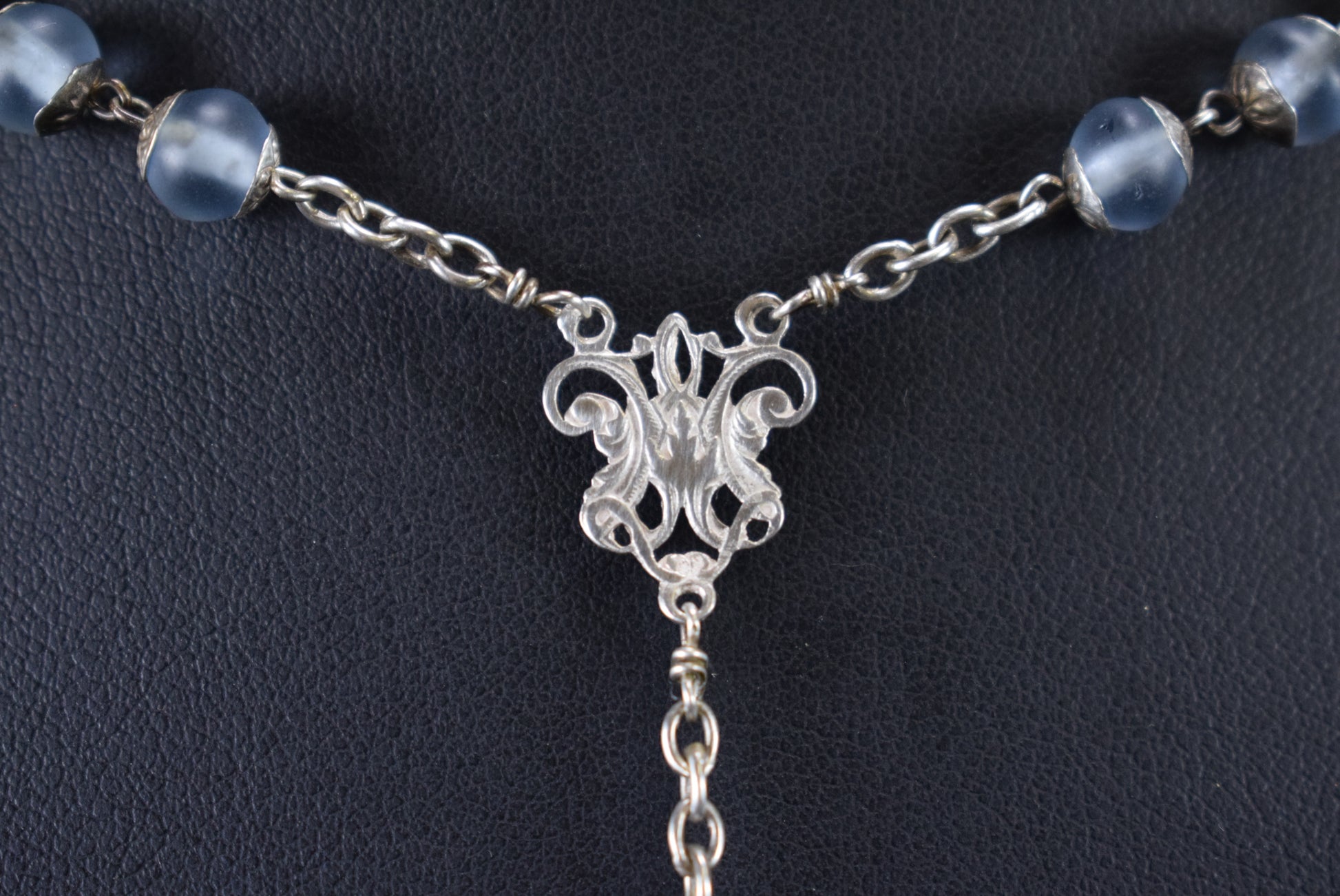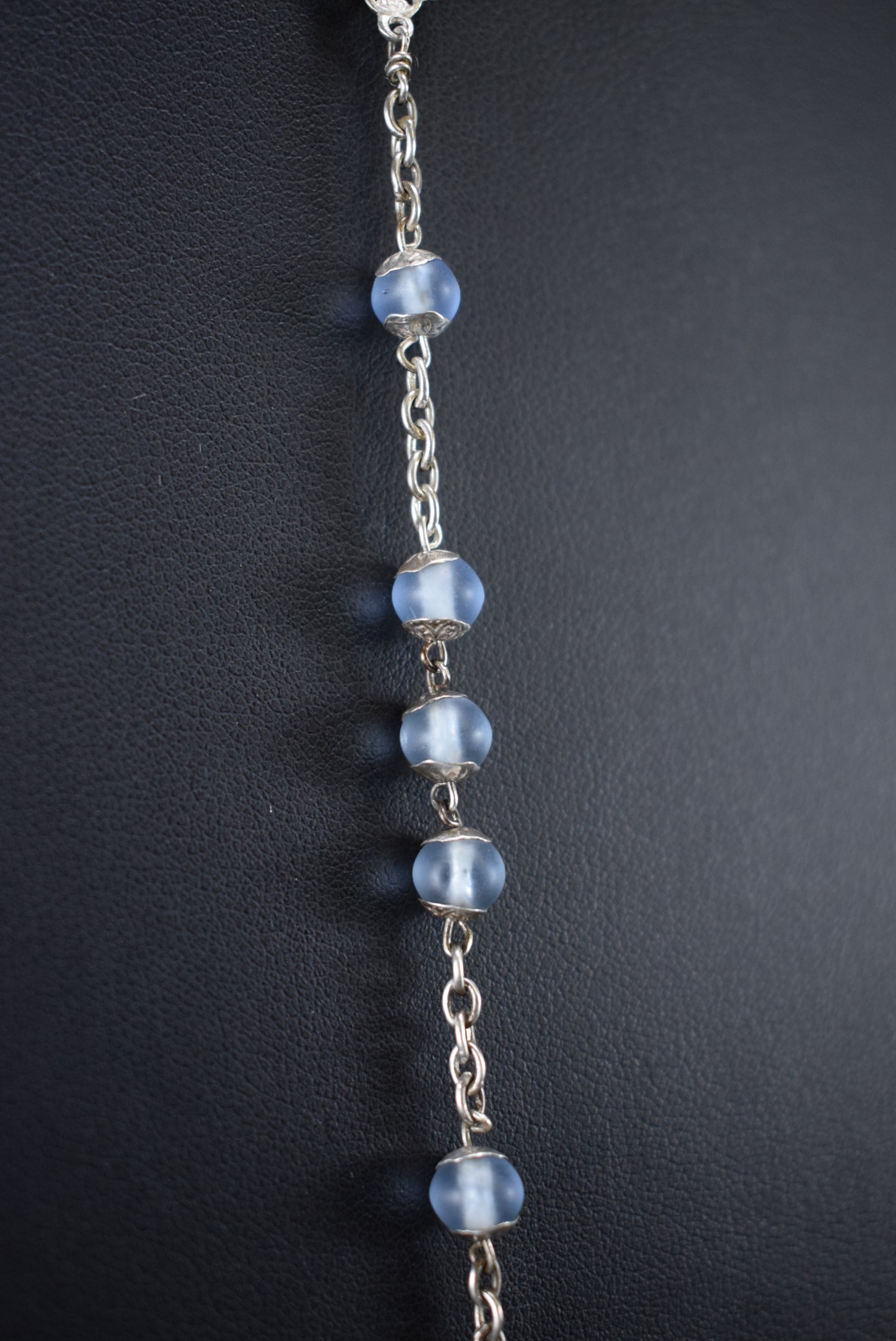 Un fabuleux chapelet français datant de la fin du 19ème siècle. Les perles Mater et Pater sont constituées de perles bleues givrées. Toutes les perles sont coiffées d’une monture en argent sterling. La magnifique pièce maîtresse et la croix sont finement travaillées.