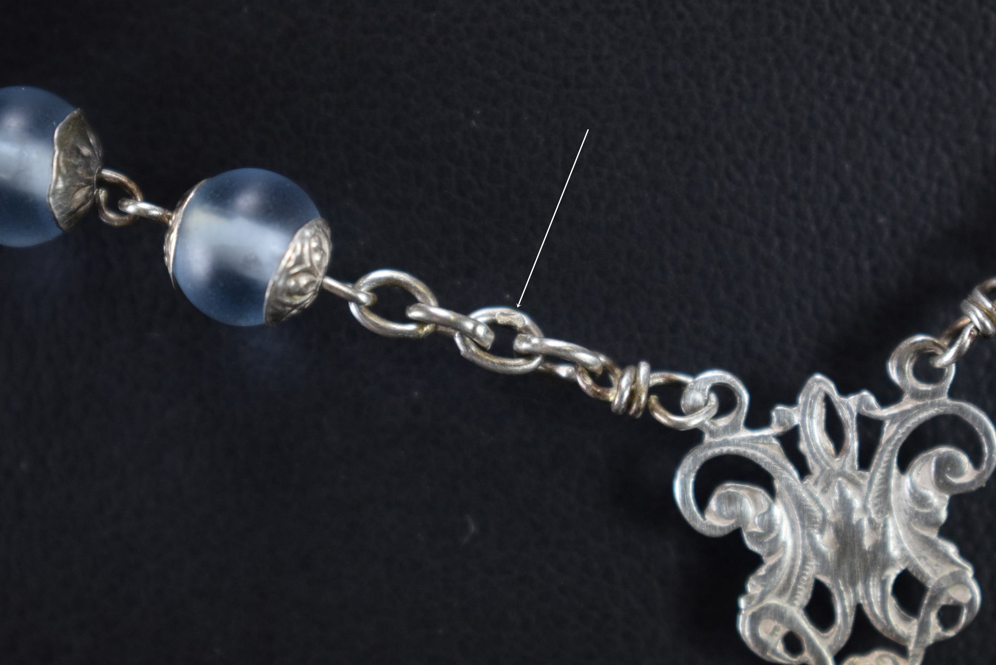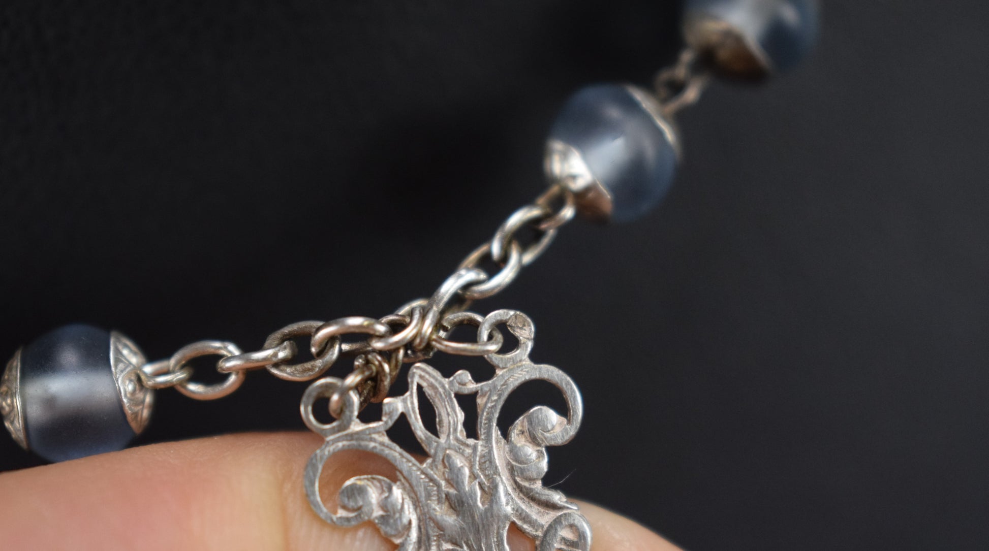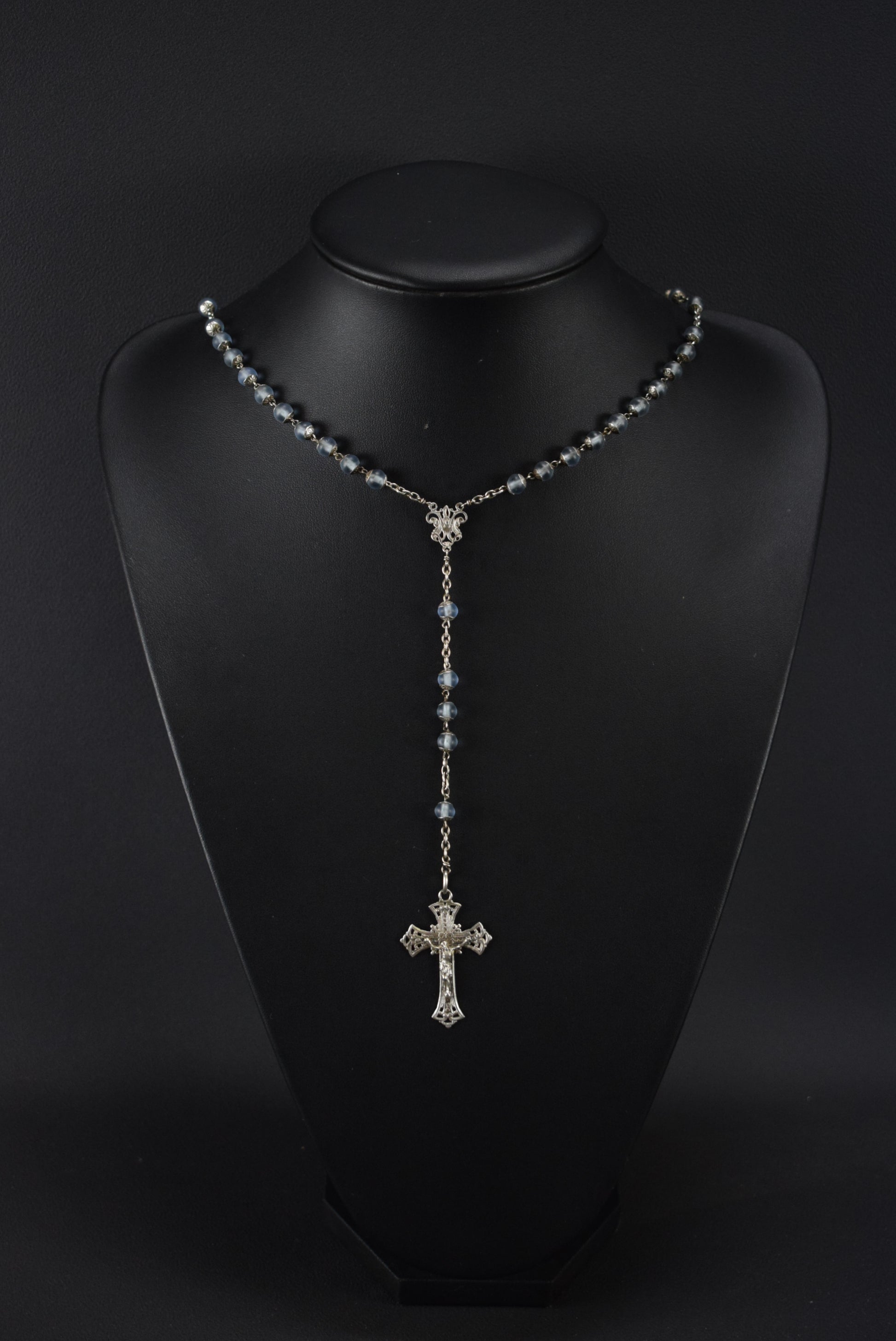 Un fabuleux chapelet français datant de la fin du 19ème siècle. Les perles Mater et Pater sont constituées de perles bleues givrées. Toutes les perles sont coiffées d’une monture en argent sterling. La magnifique pièce maîtresse et la croix sont finement travaillées.