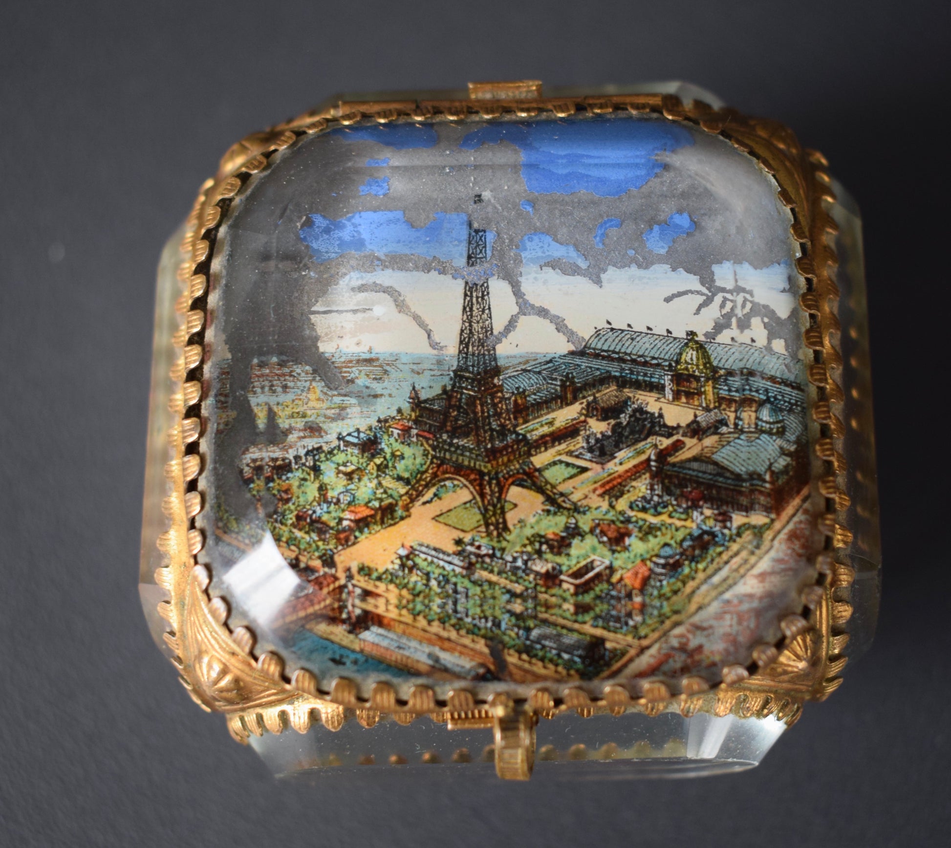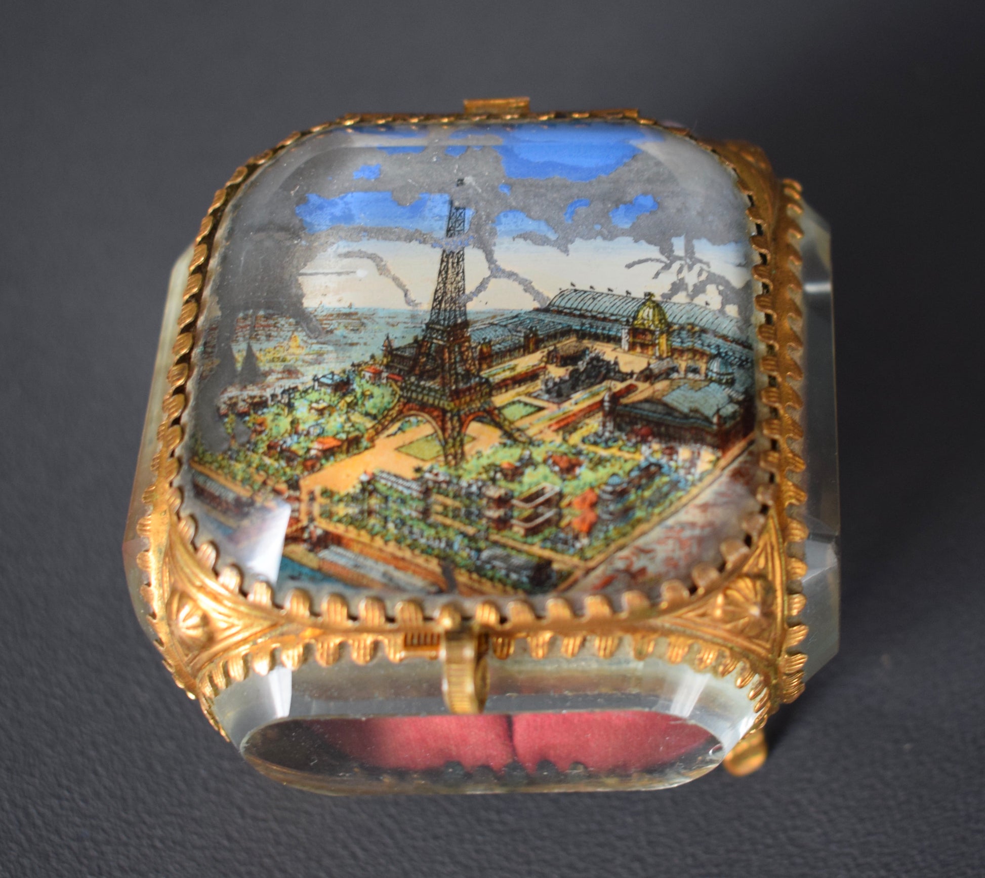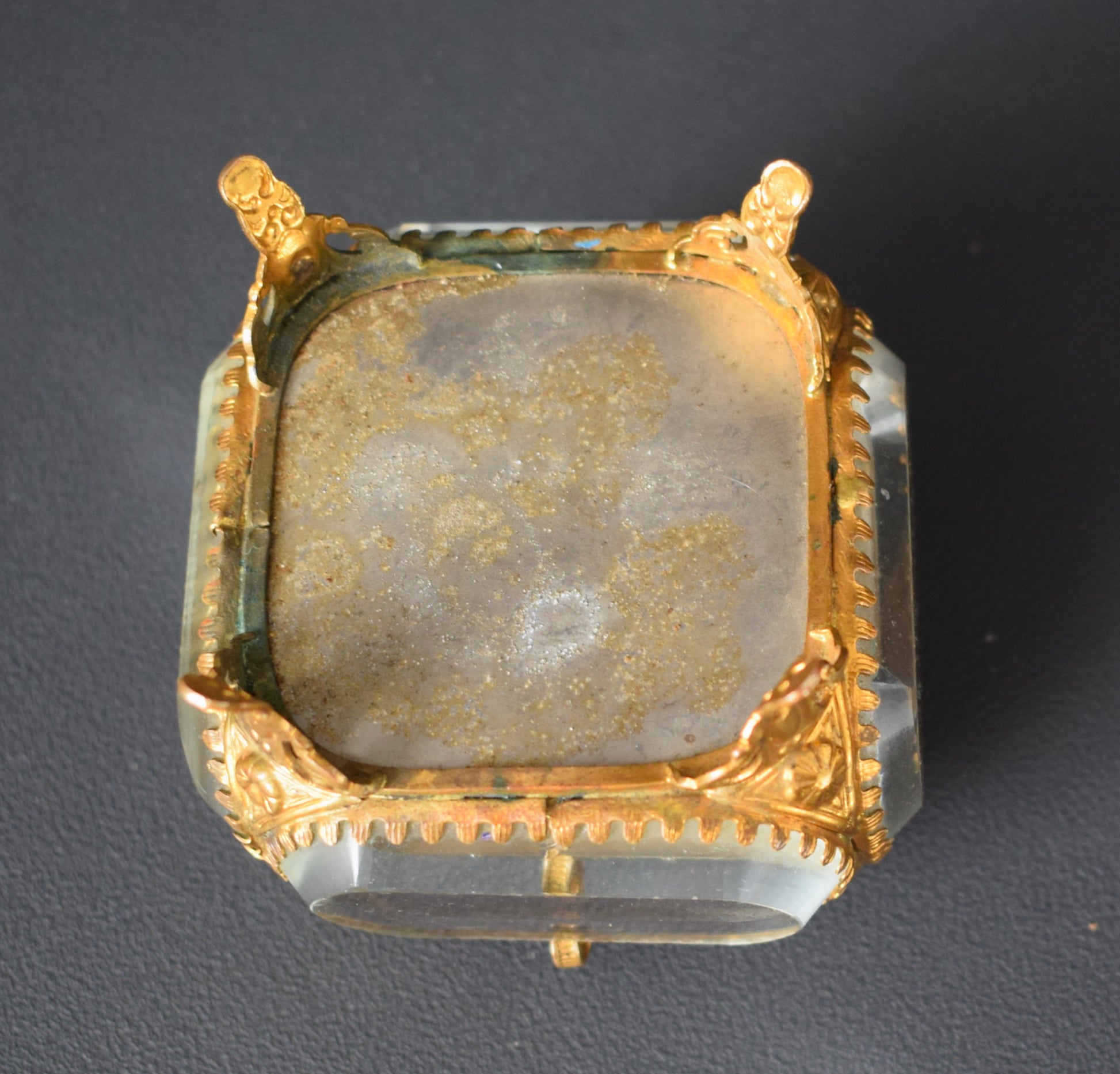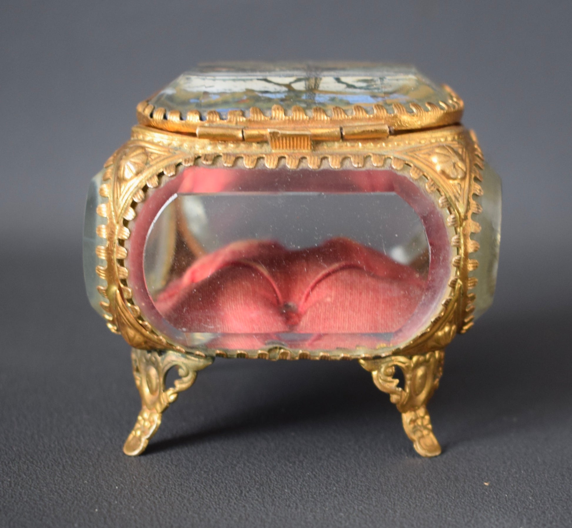 Il s'agit d'une boîte à bibelots antique française en laiton doré doré et en verre biseauté épais, du début du 20ème siècle.