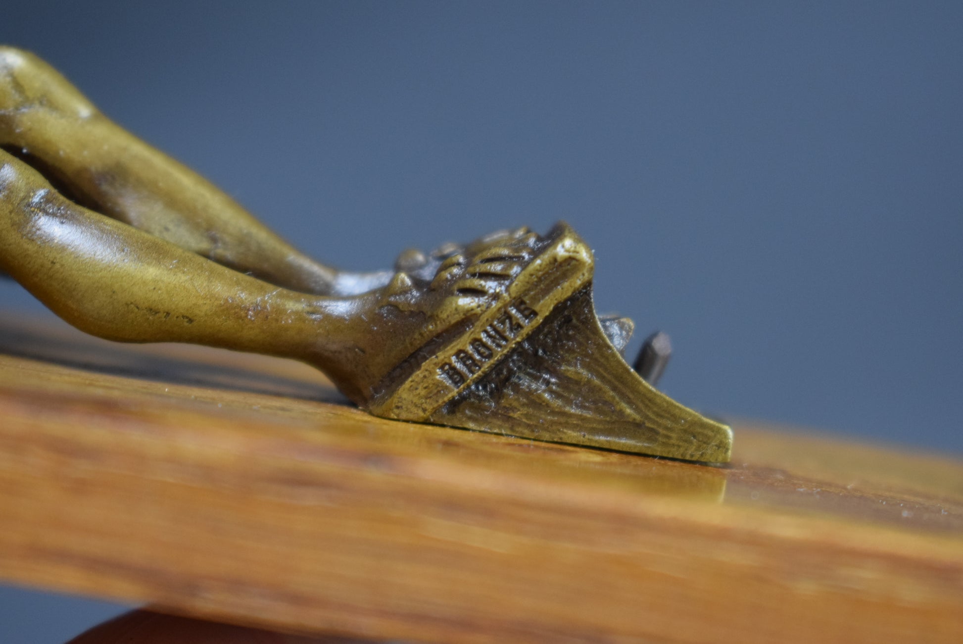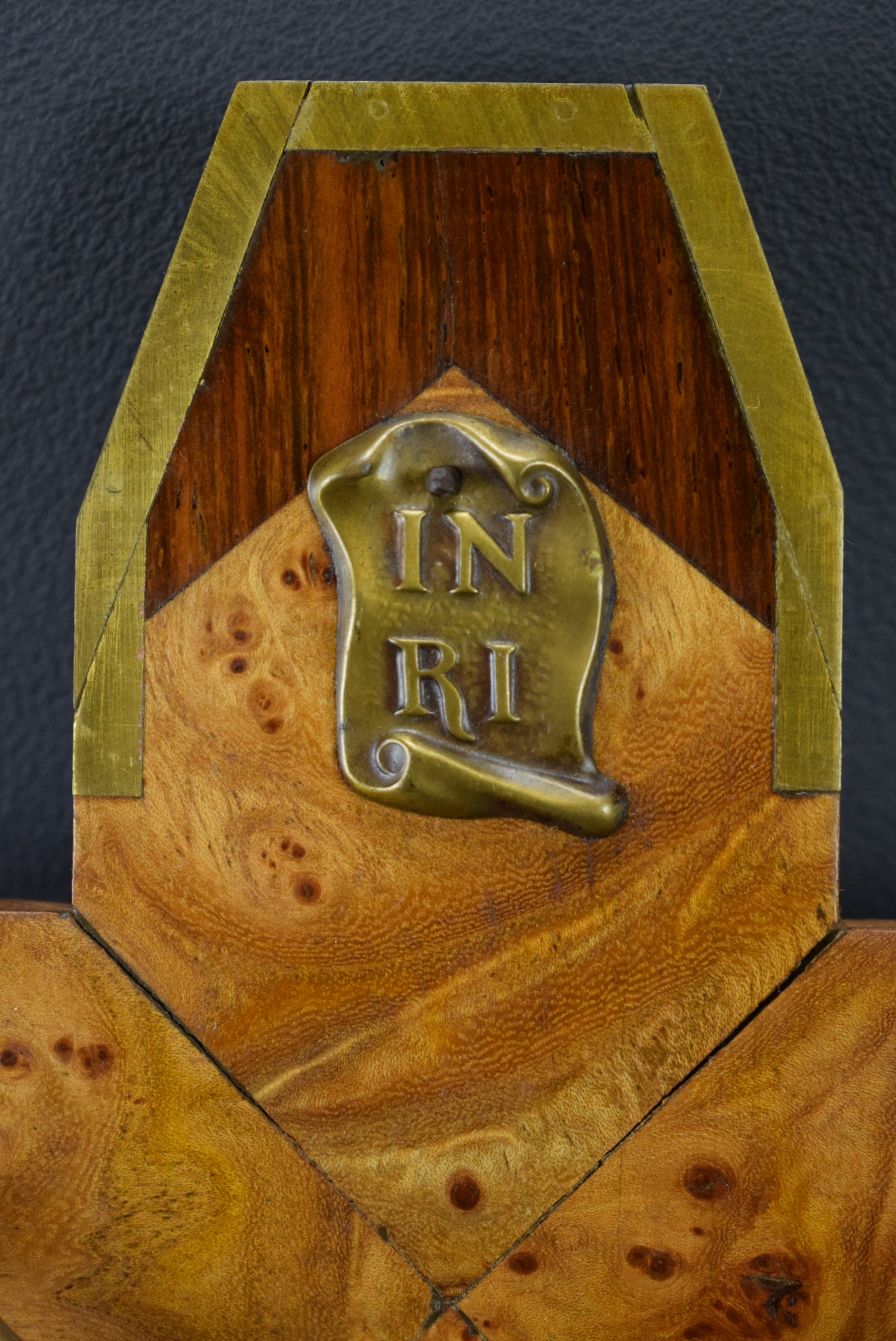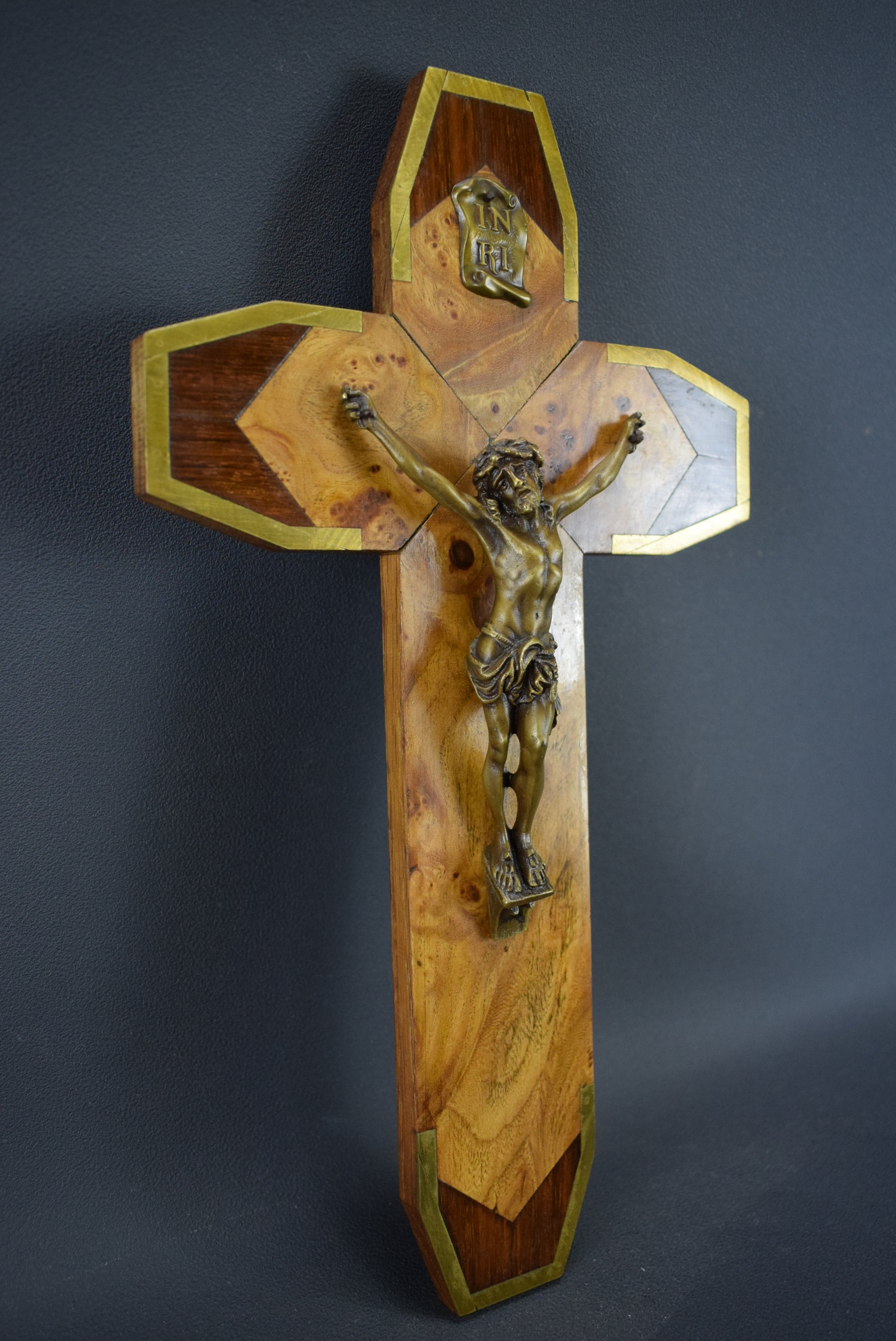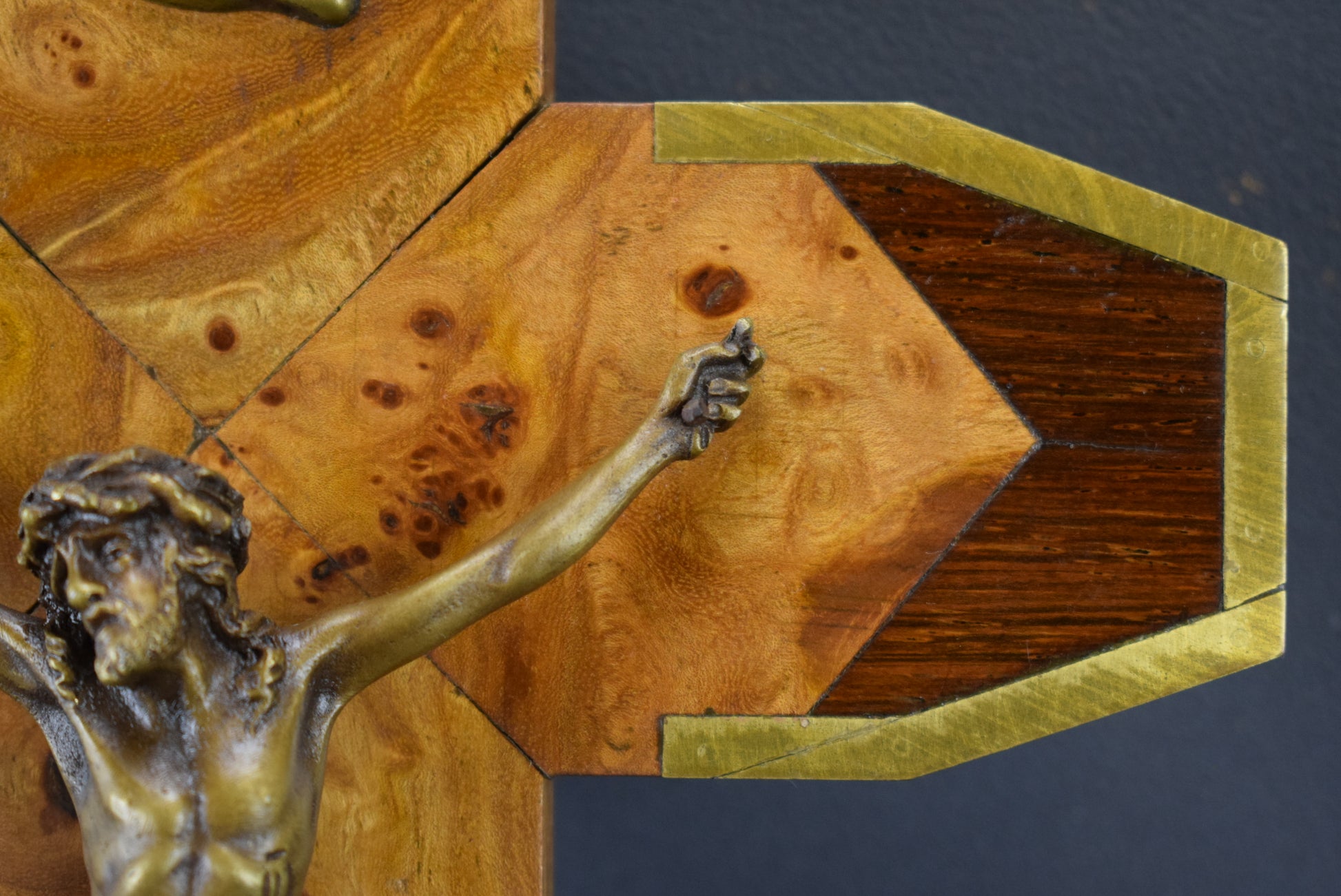 Une superbe croix murale vintage française en bois, laiton et bronze. Le corps de Jésus-Christ a été moulé en bronze. La croix de style Art déco présente des incrustations en laiton et deux placages de bois différents.