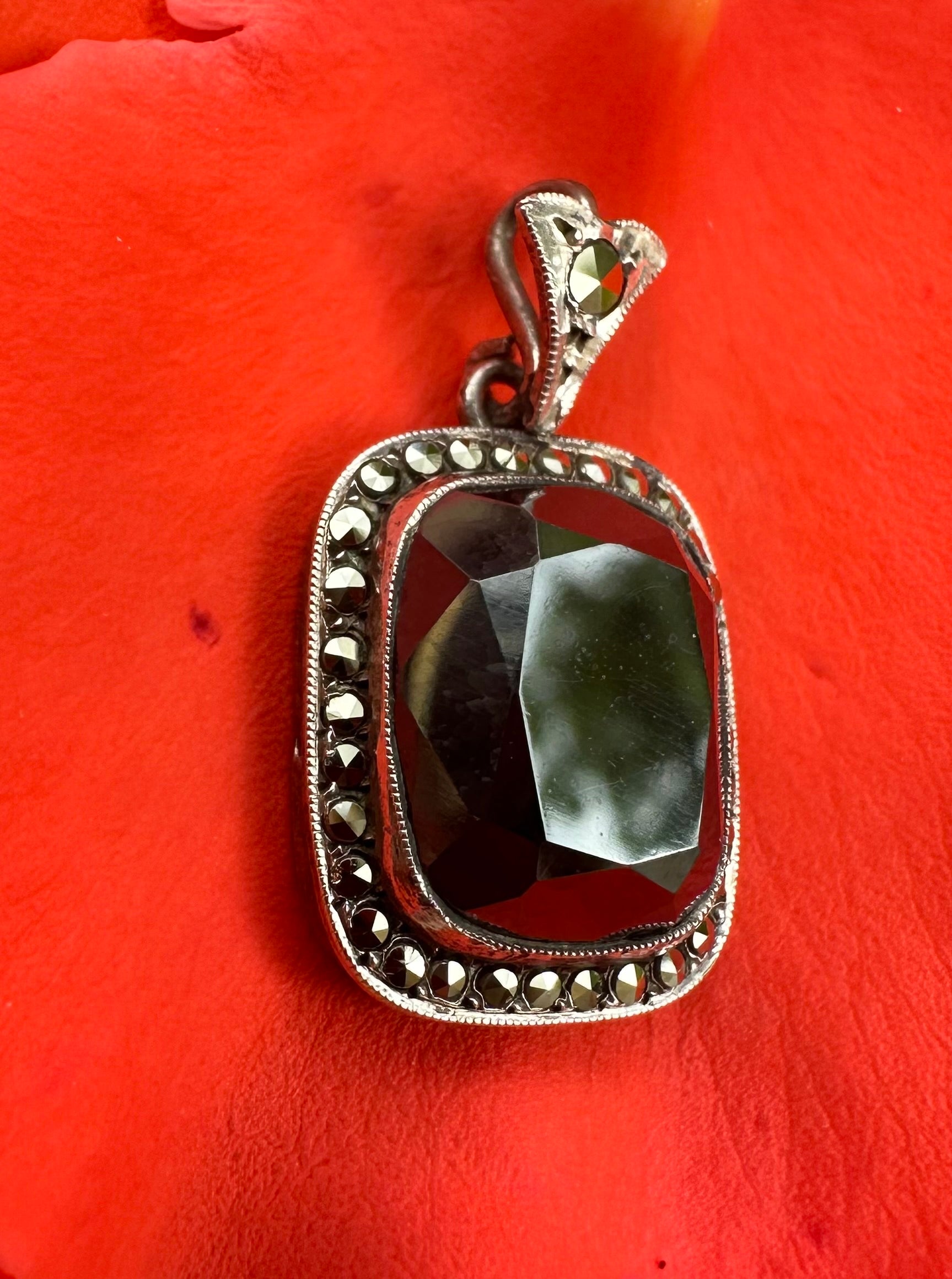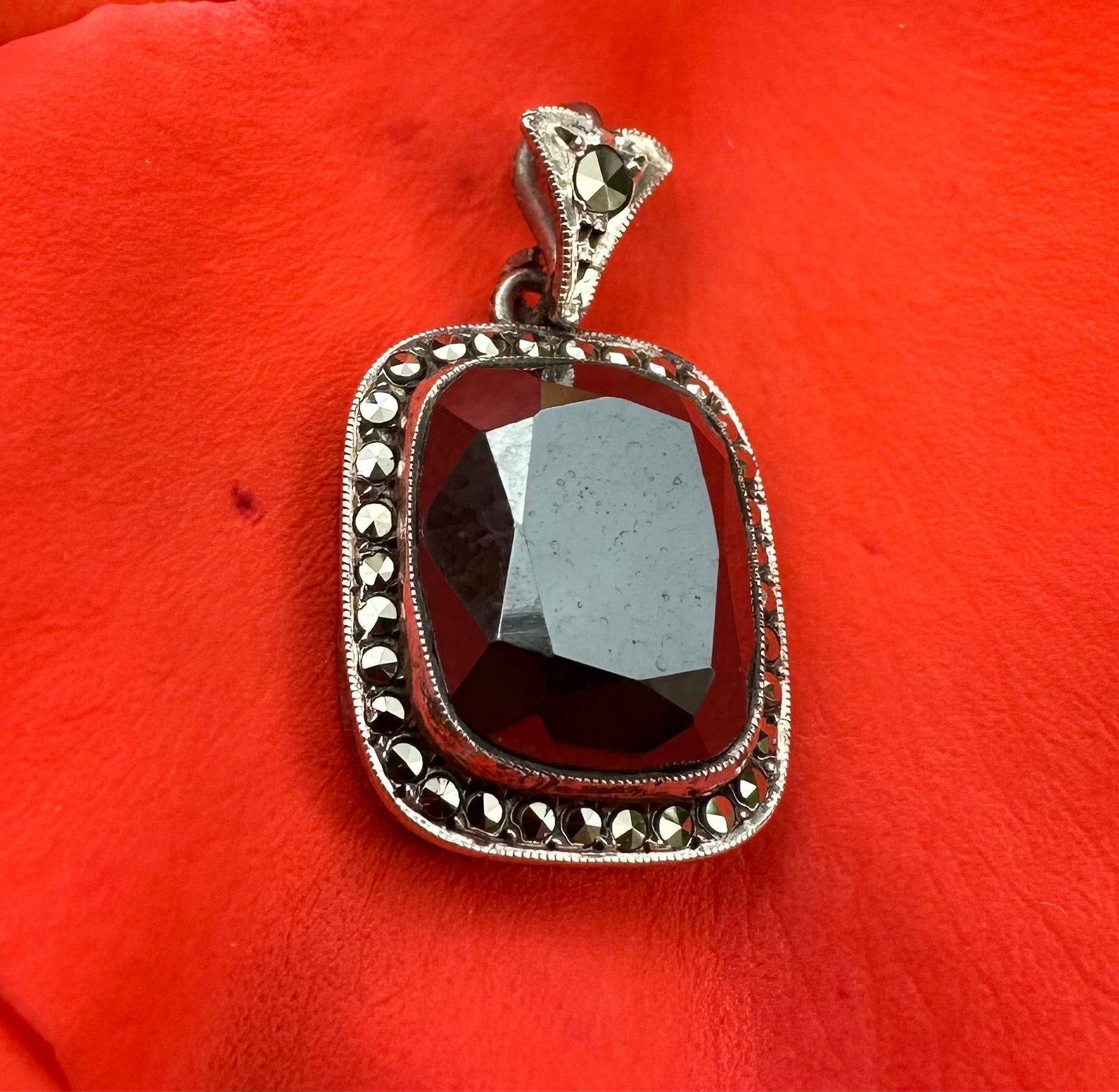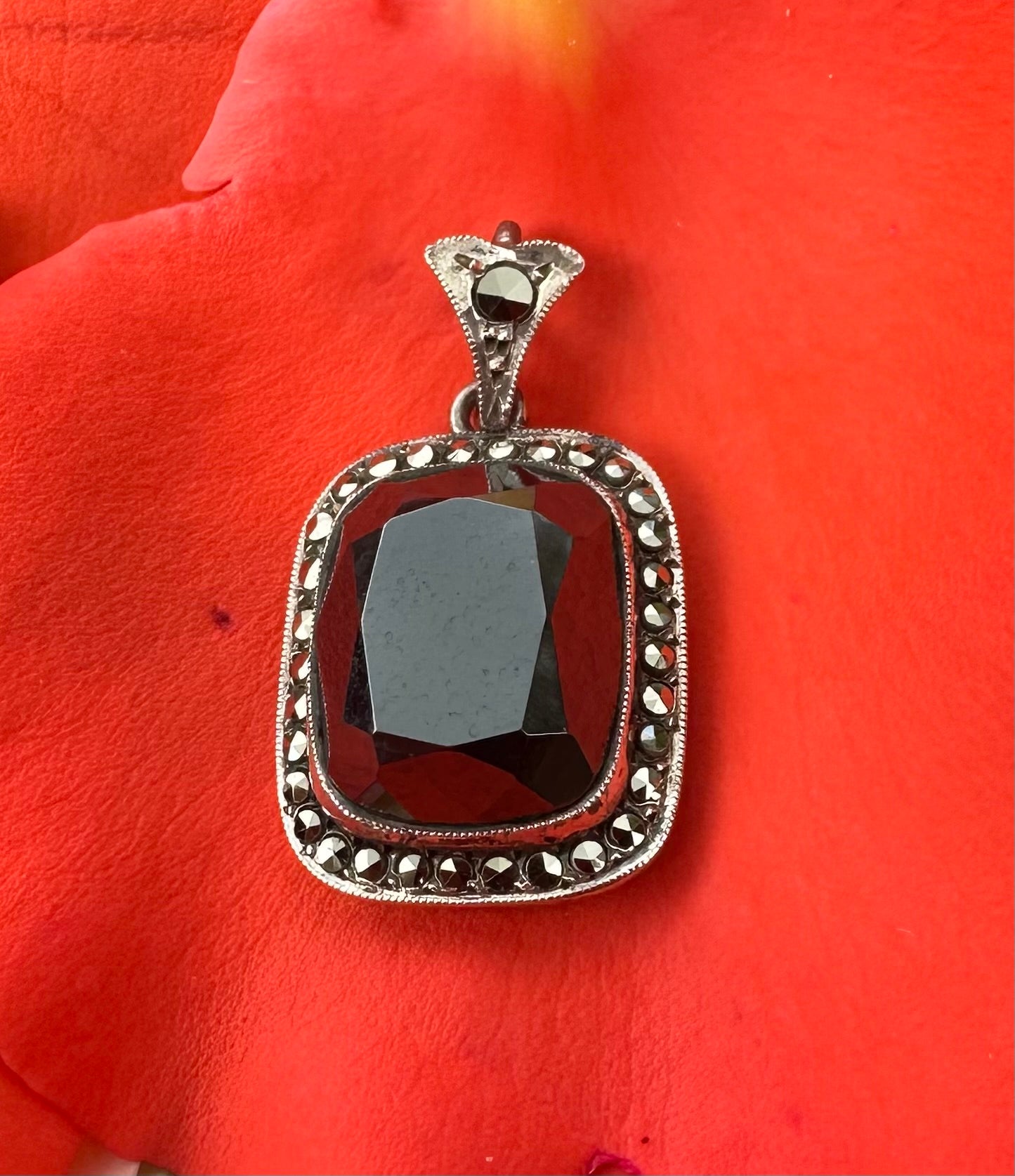 Beautiful French Art Deco Silver Hematite and Marcasite Pendant, Antique Jewelry, Gift for Her