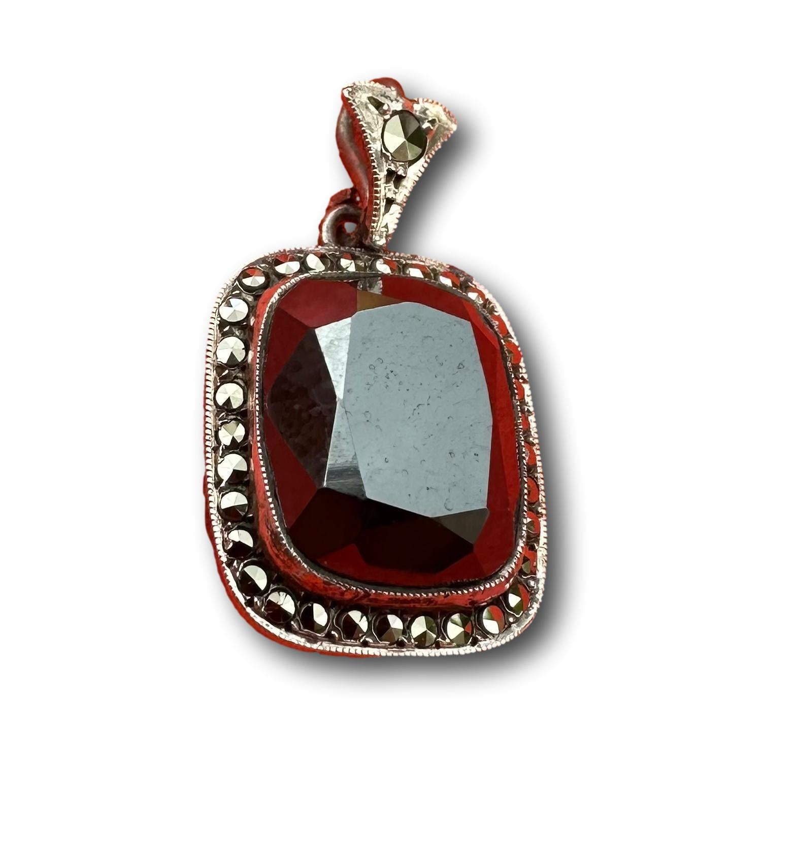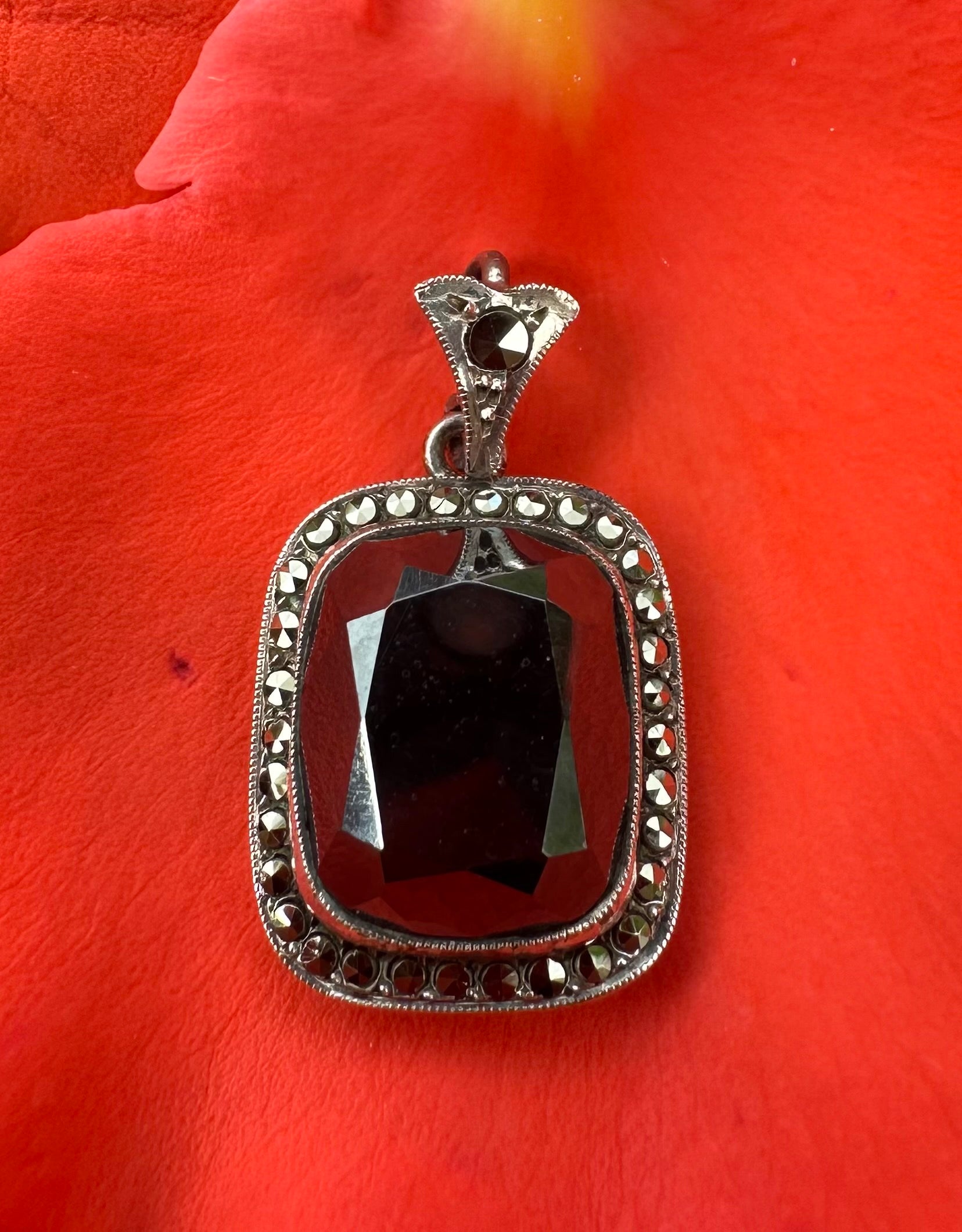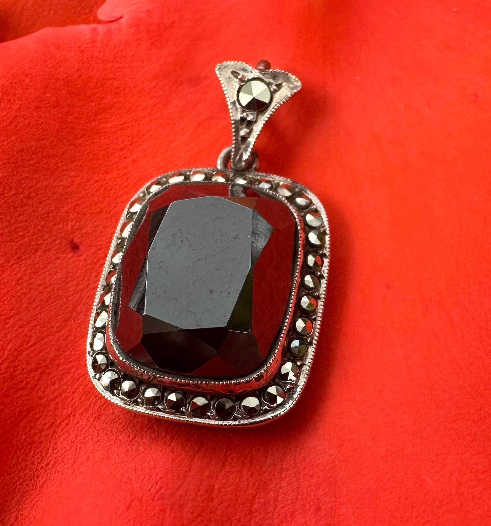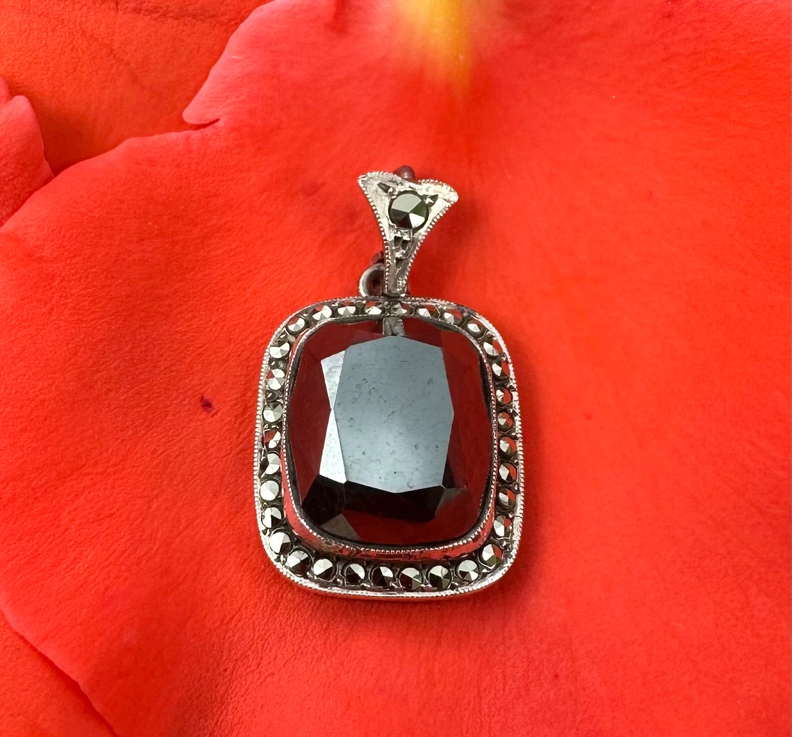 Beautiful French Art Deco Silver Hematite and Marcasite Pendant, Antique Jewelry, Gift for Her