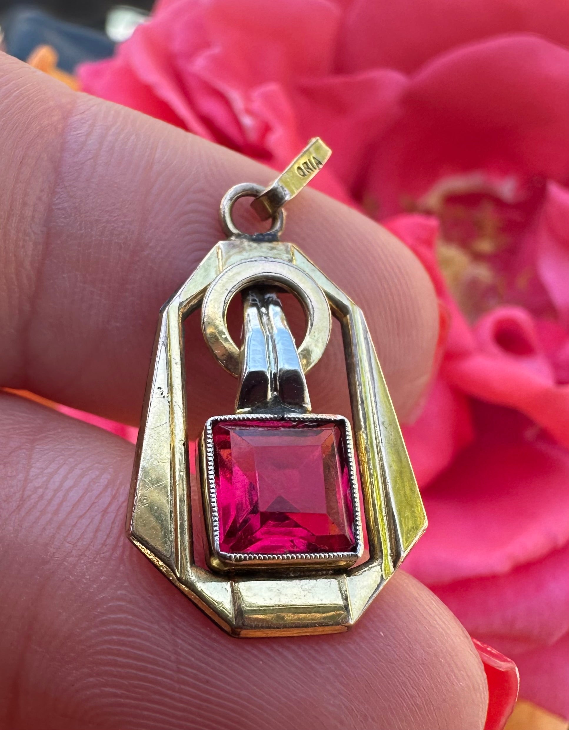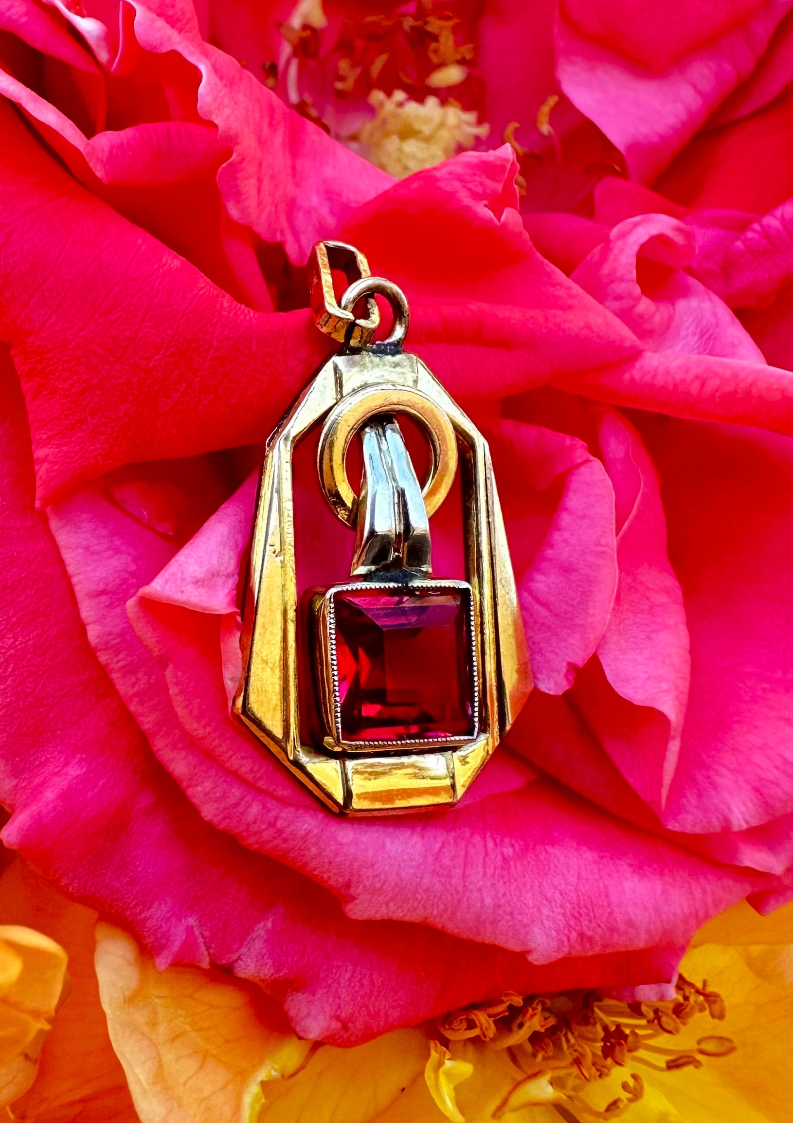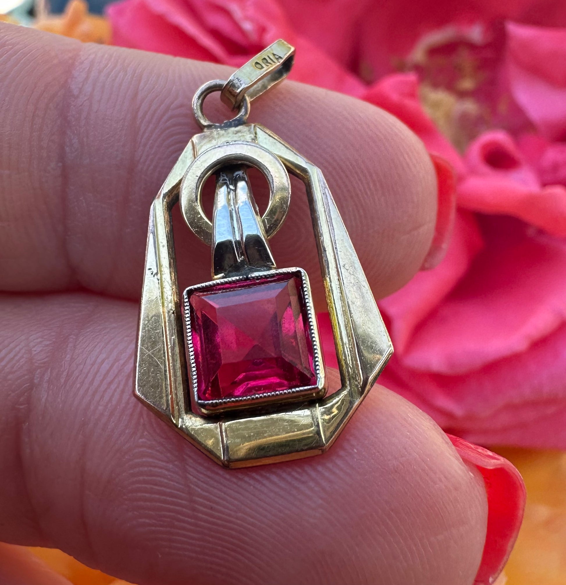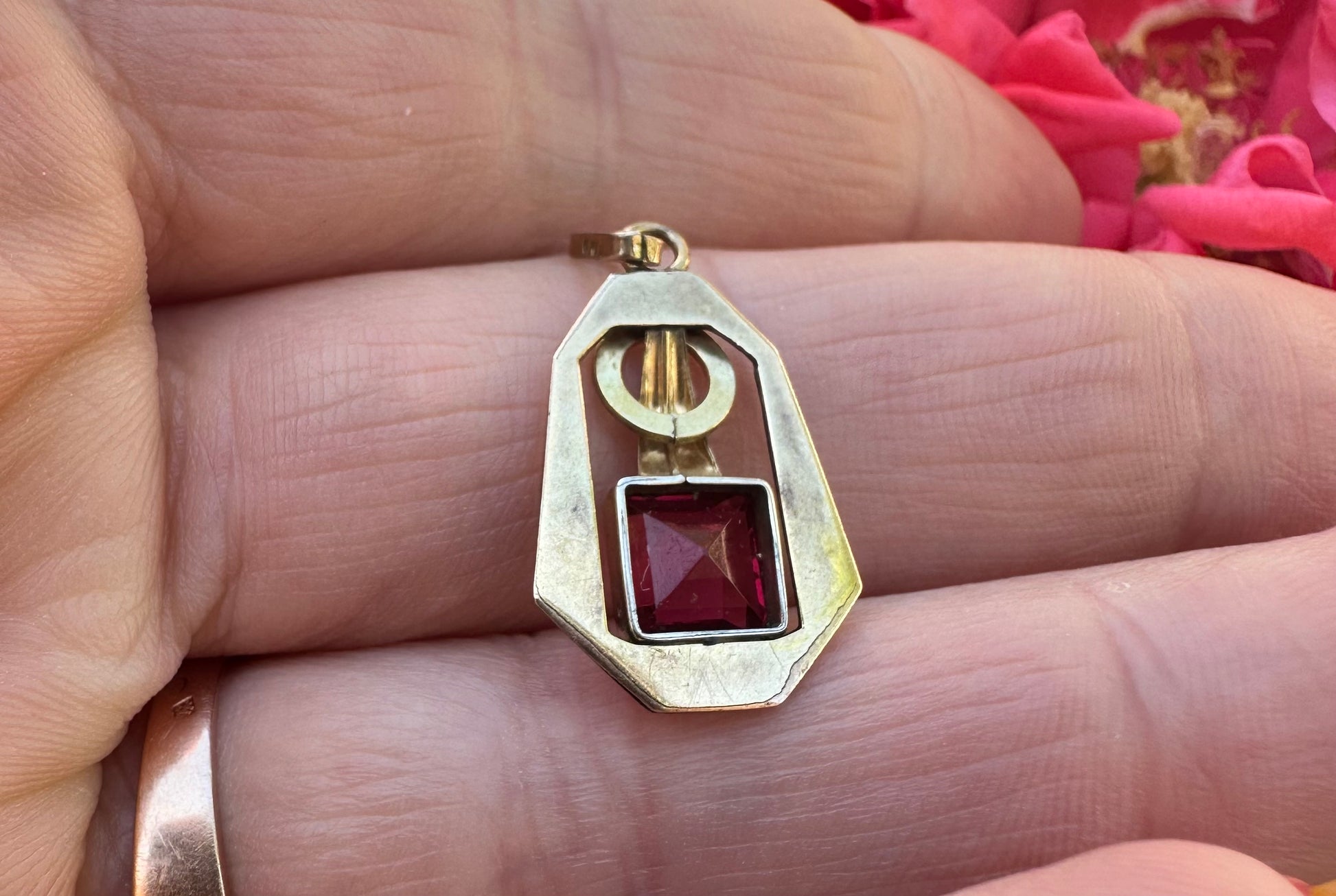 Ce magnifique pendentif a été fabriqué à partir de métal plaqué or 18 carats, offrant une lueur riche et chaleureuse et une durabilité exceptionnelle. La pierre de verre rubis carrée a été sertie dans une monture plaquée argent.