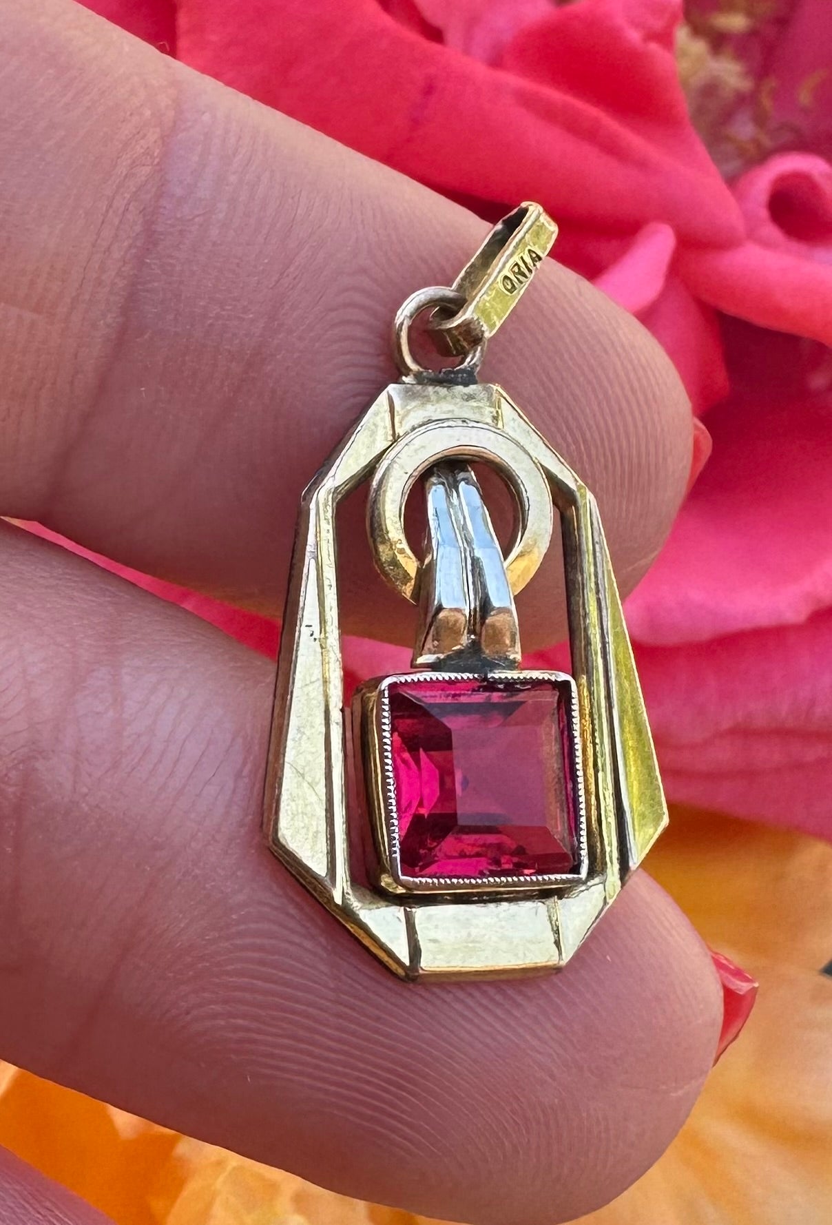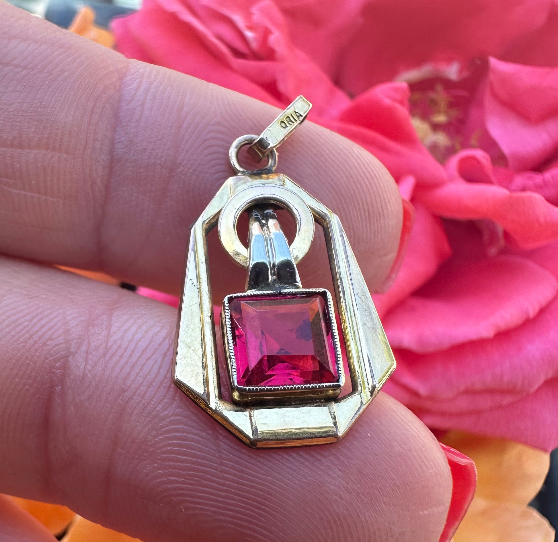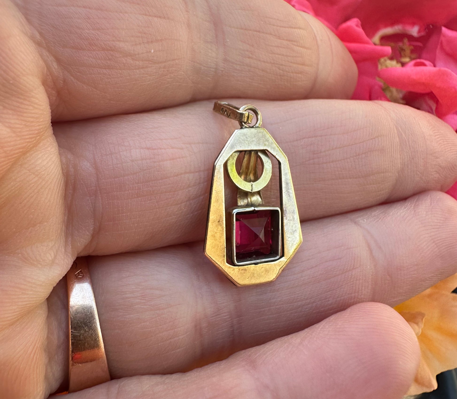 Ce magnifique pendentif a été fabriqué à partir de métal plaqué or 18 carats, offrant une lueur riche et chaleureuse et une durabilité exceptionnelle. La pierre de verre rubis carrée a été sertie dans une monture plaquée argent.