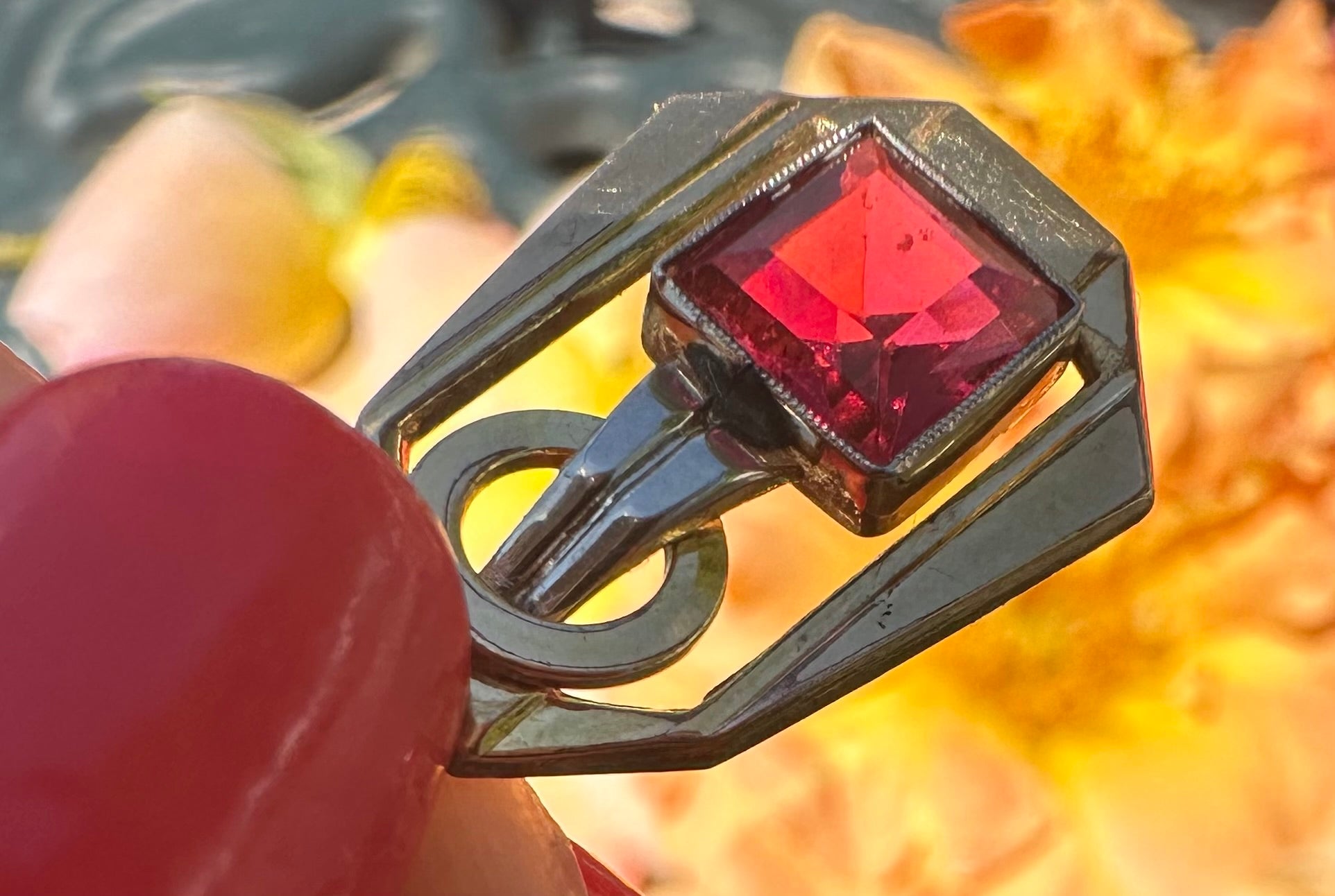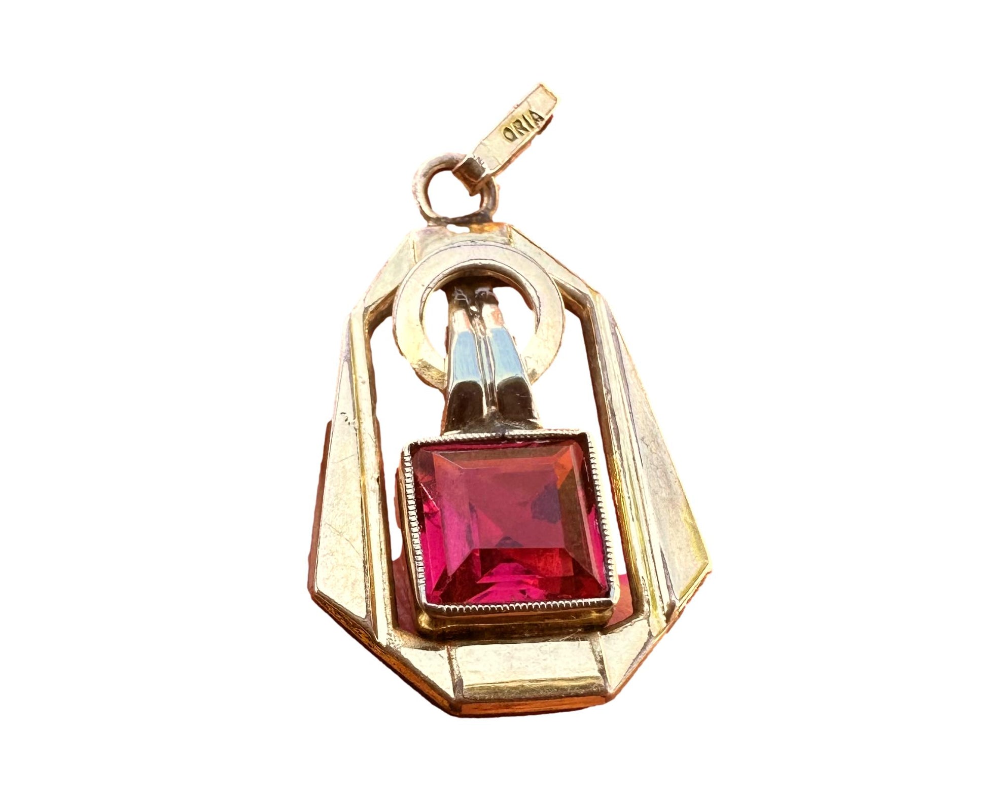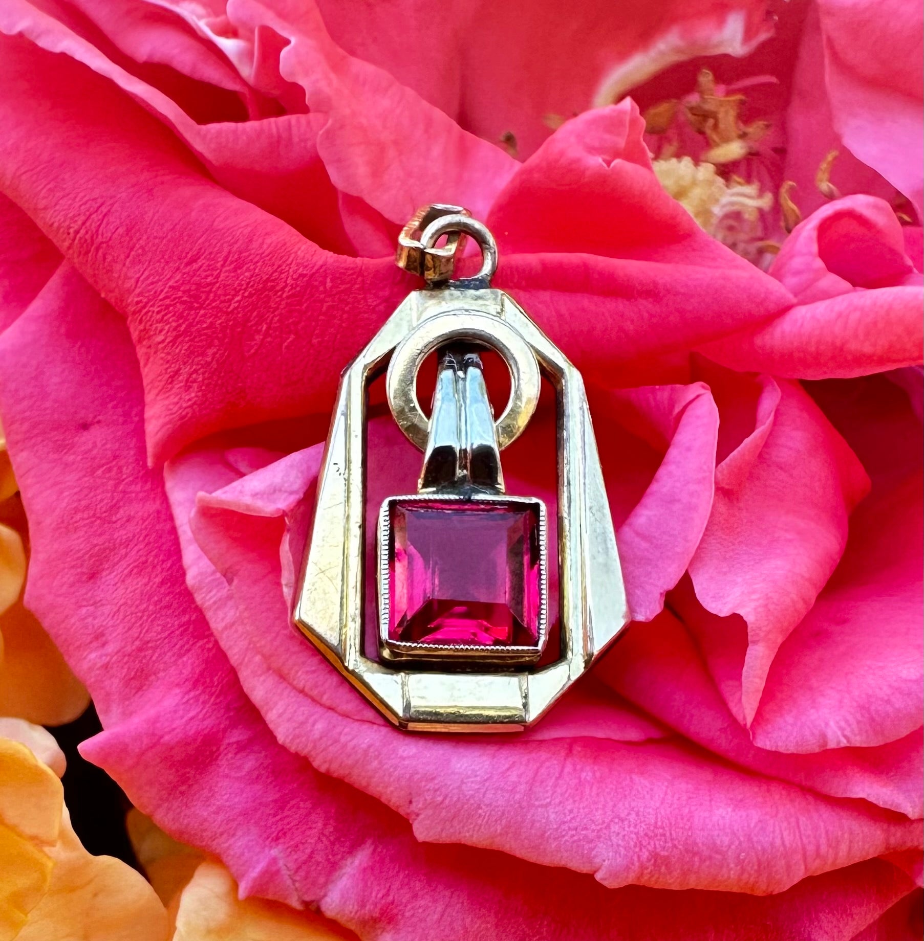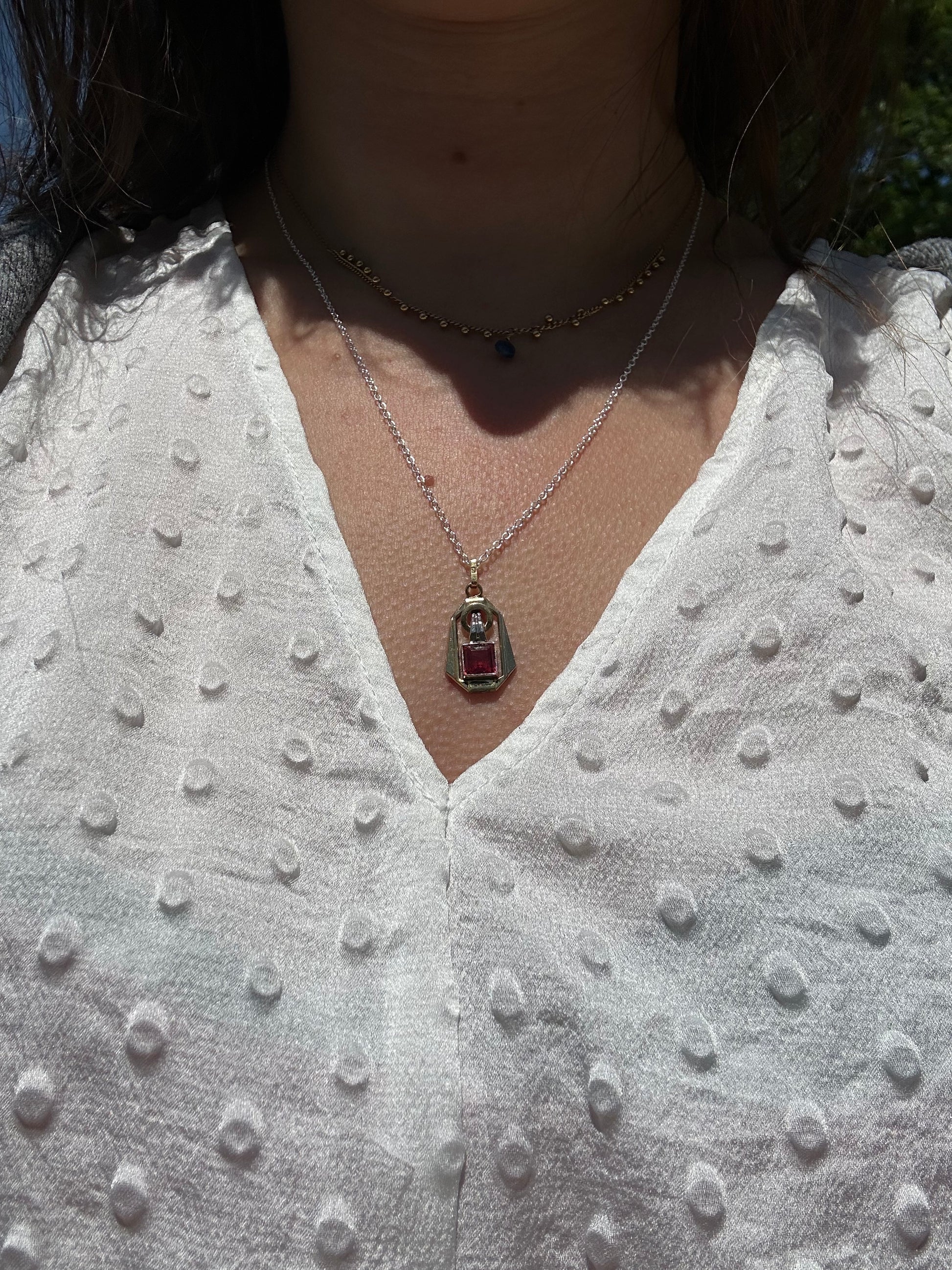 Ce magnifique pendentif a été fabriqué à partir de métal plaqué or 18 carats, offrant une lueur riche et chaleureuse et une durabilité exceptionnelle. La pierre de verre rubis carrée a été sertie dans une monture plaquée argent.