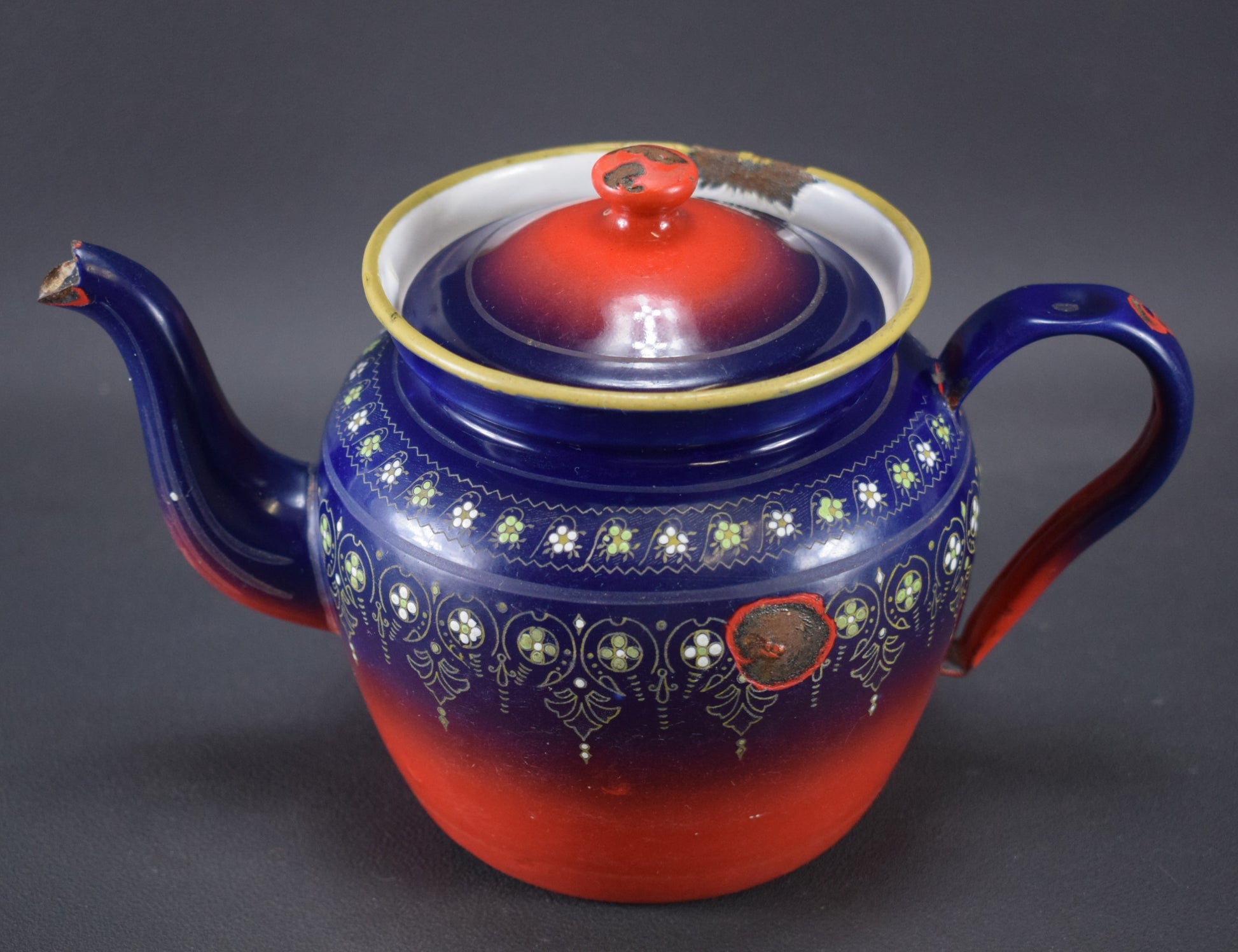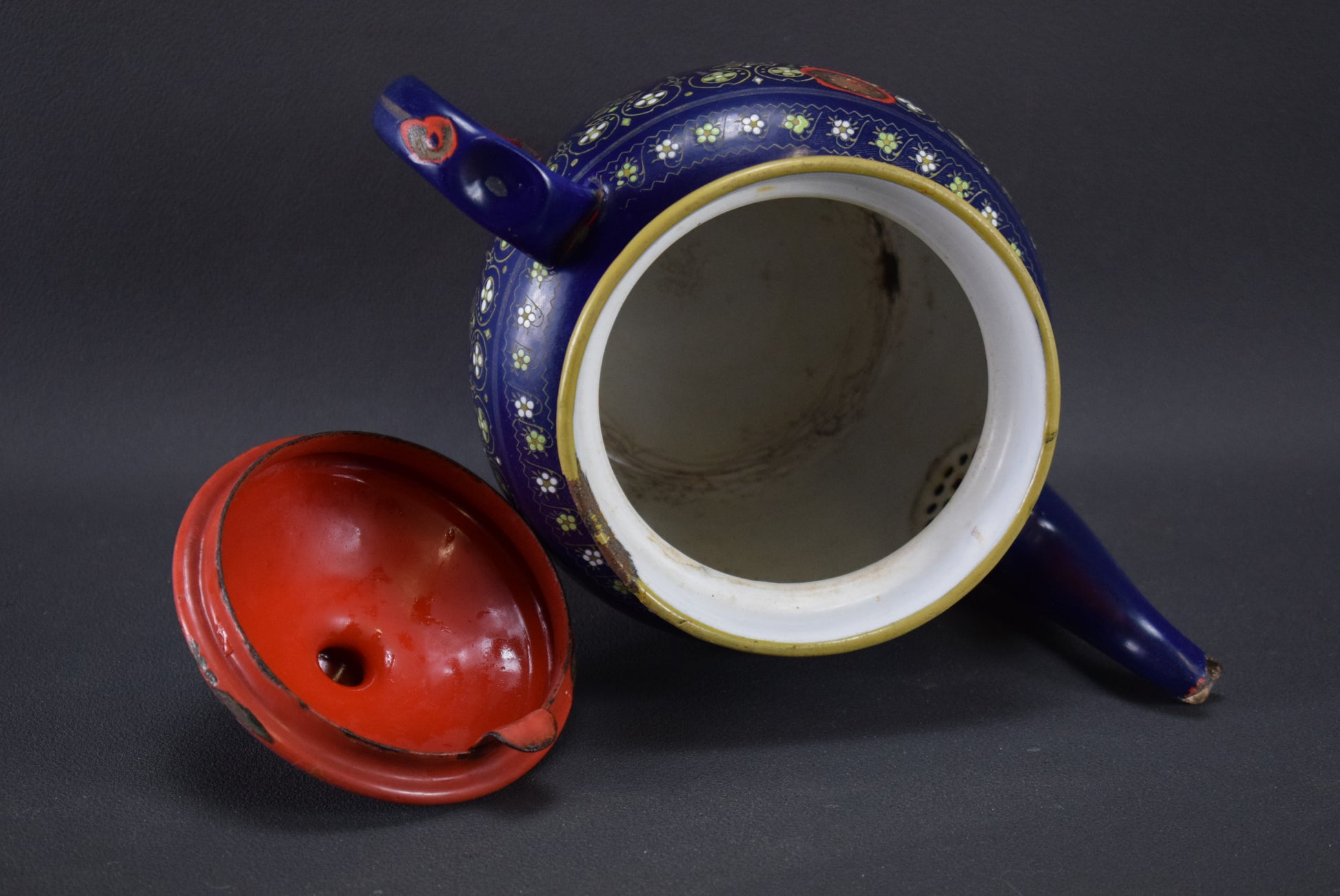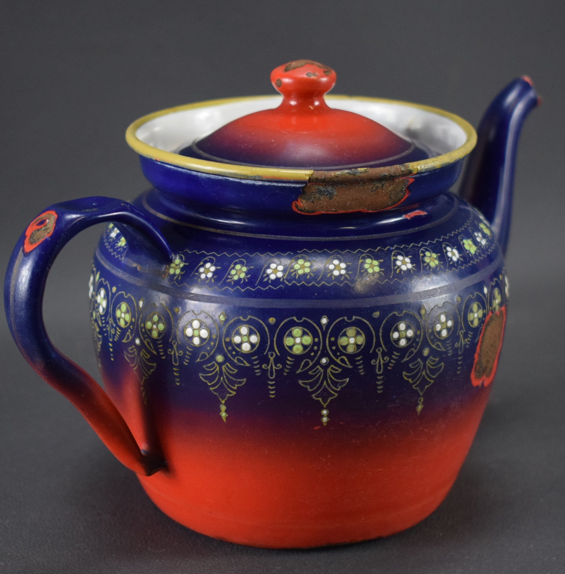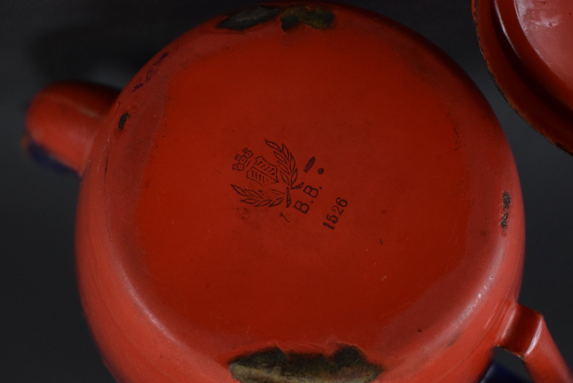 Une rare théière française émaillée décorée de couleurs rouge et bleu foncé avec de petites fleurs émaillées. Il est marqué BB. BB Frères était connu au début des années 1900 pour ses ustensiles en émail épais de haute qualité. Ils fabriquaient leurs produits principalement en Autriche et en Tchécoslovaquie.