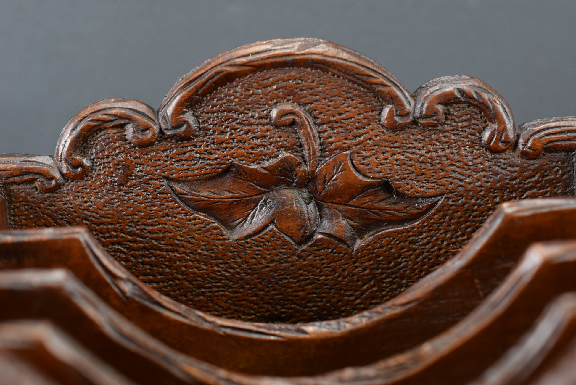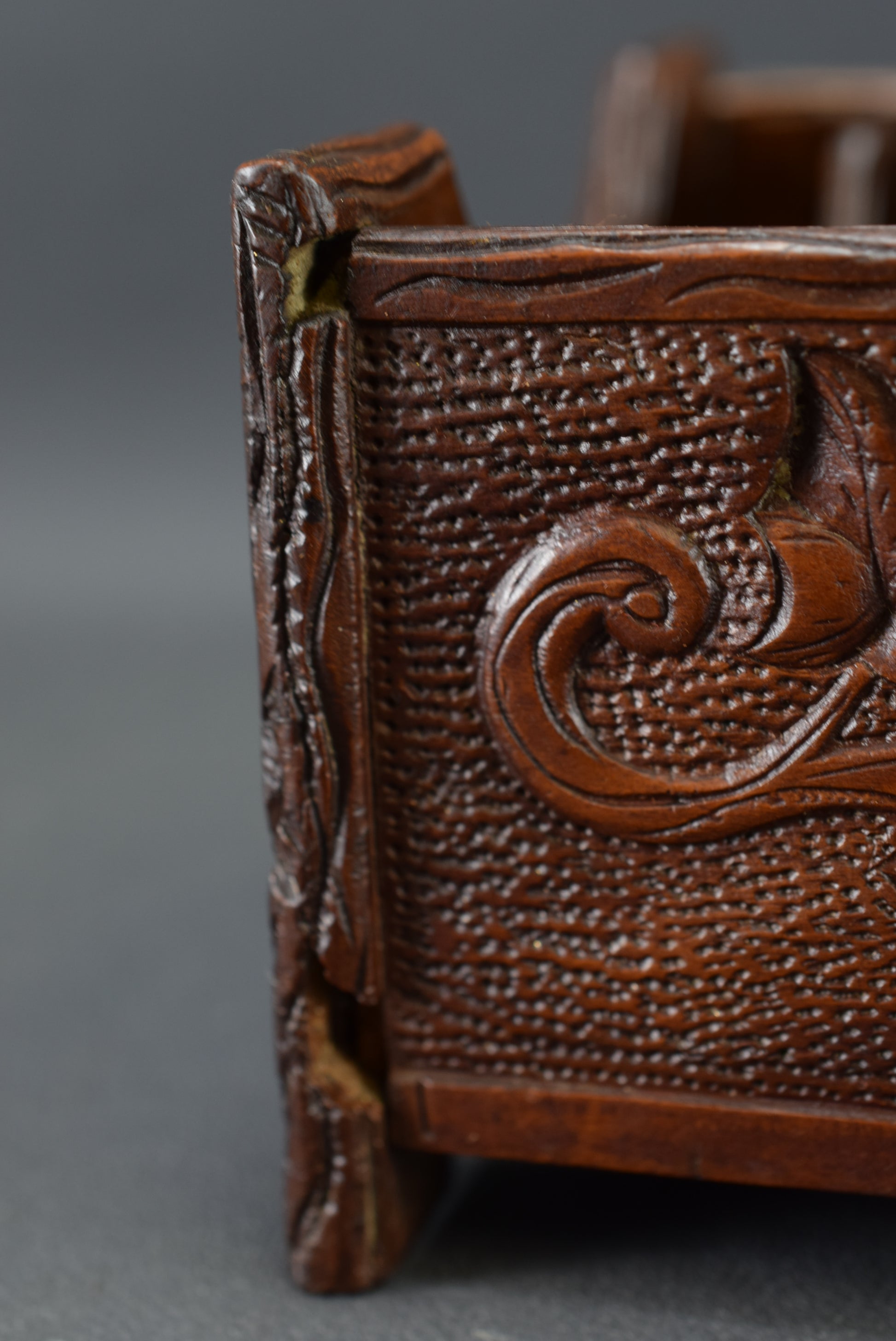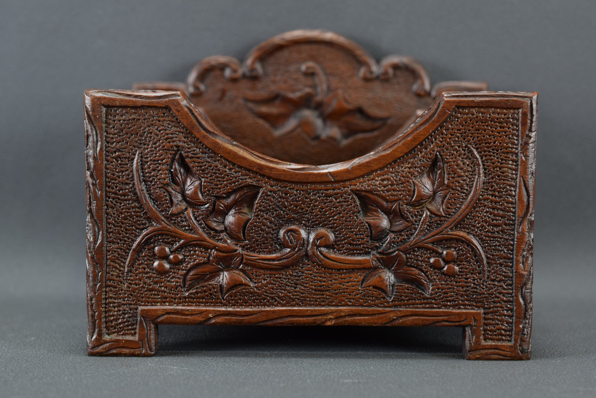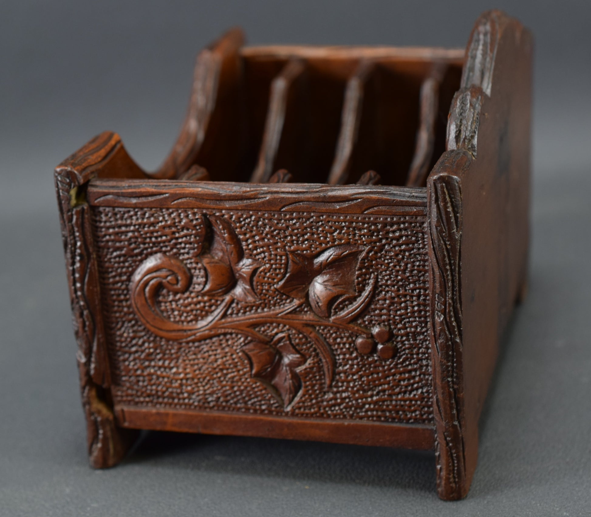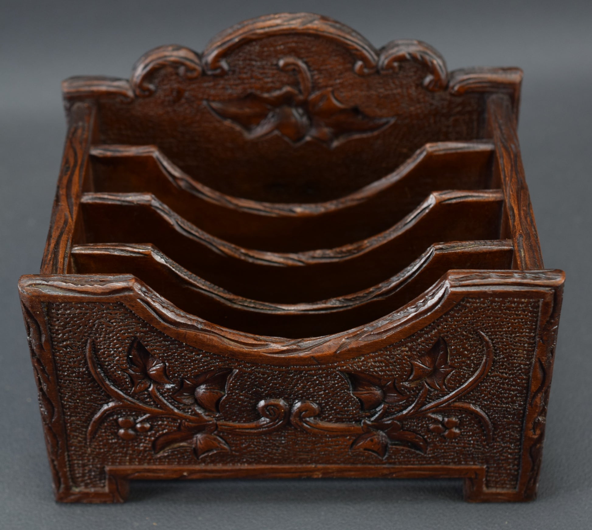 Ce magnifique support de bureau/porte-lettres antique est fabriqué en bois sculpté à la main. Le décor représente un motif de feuillage. Ce porte-lettre de la Forêt Noire date de la fin du XIXème siècle, époque Napoléon III.