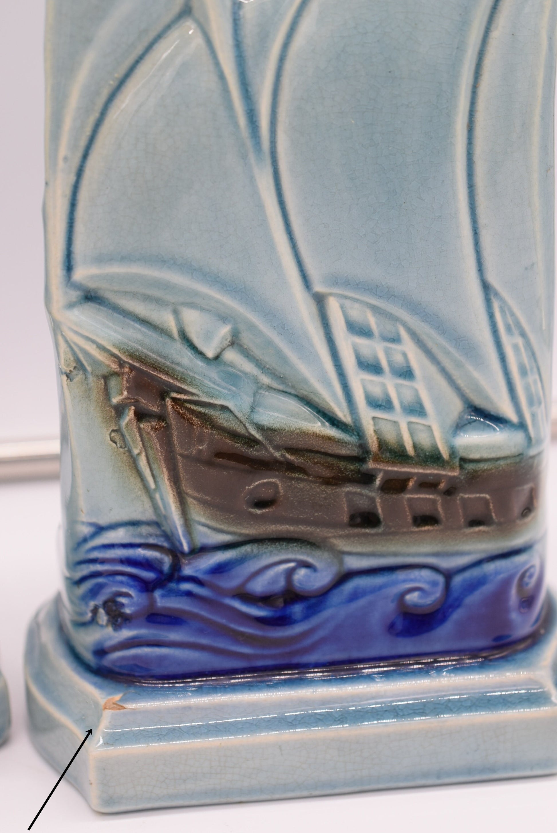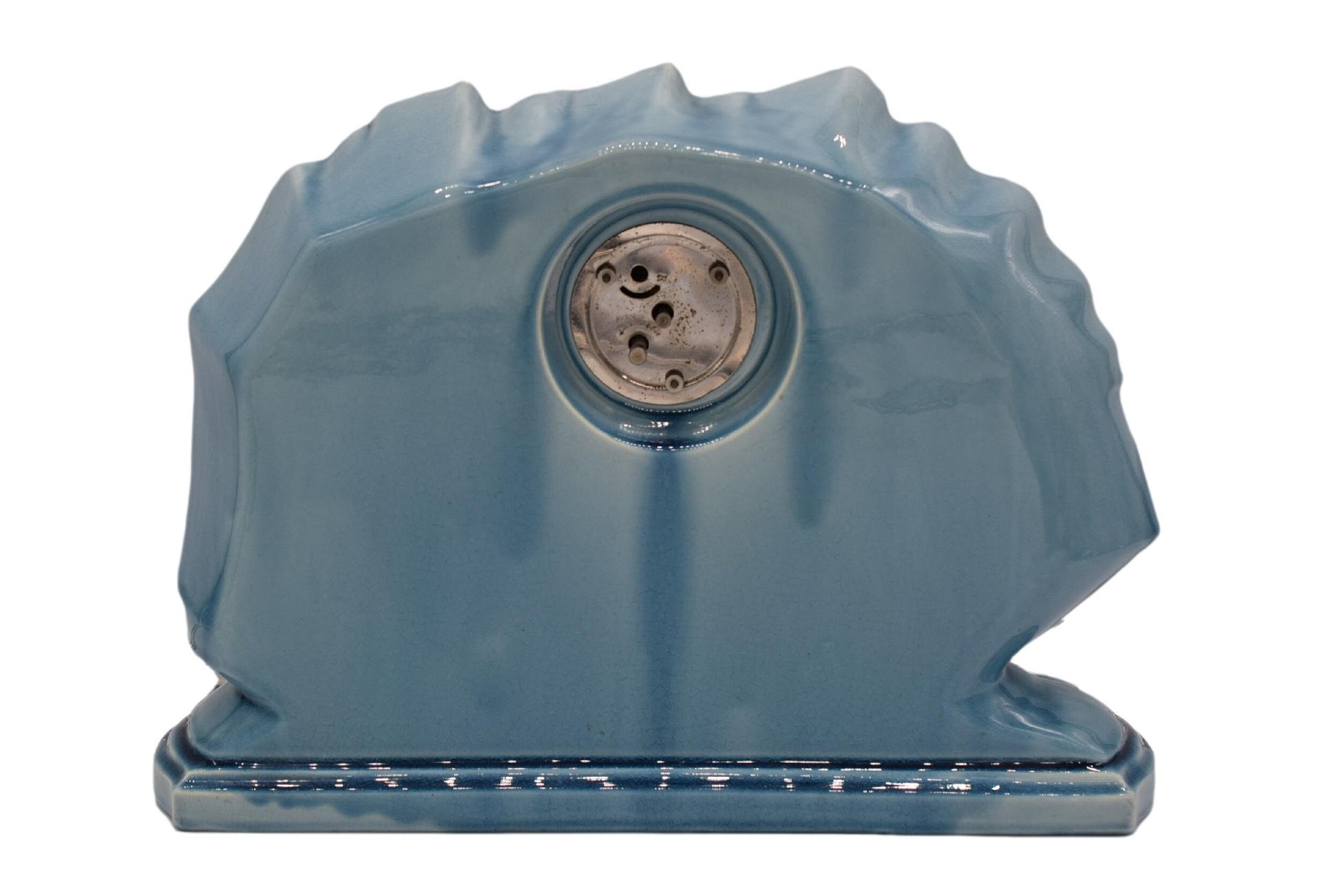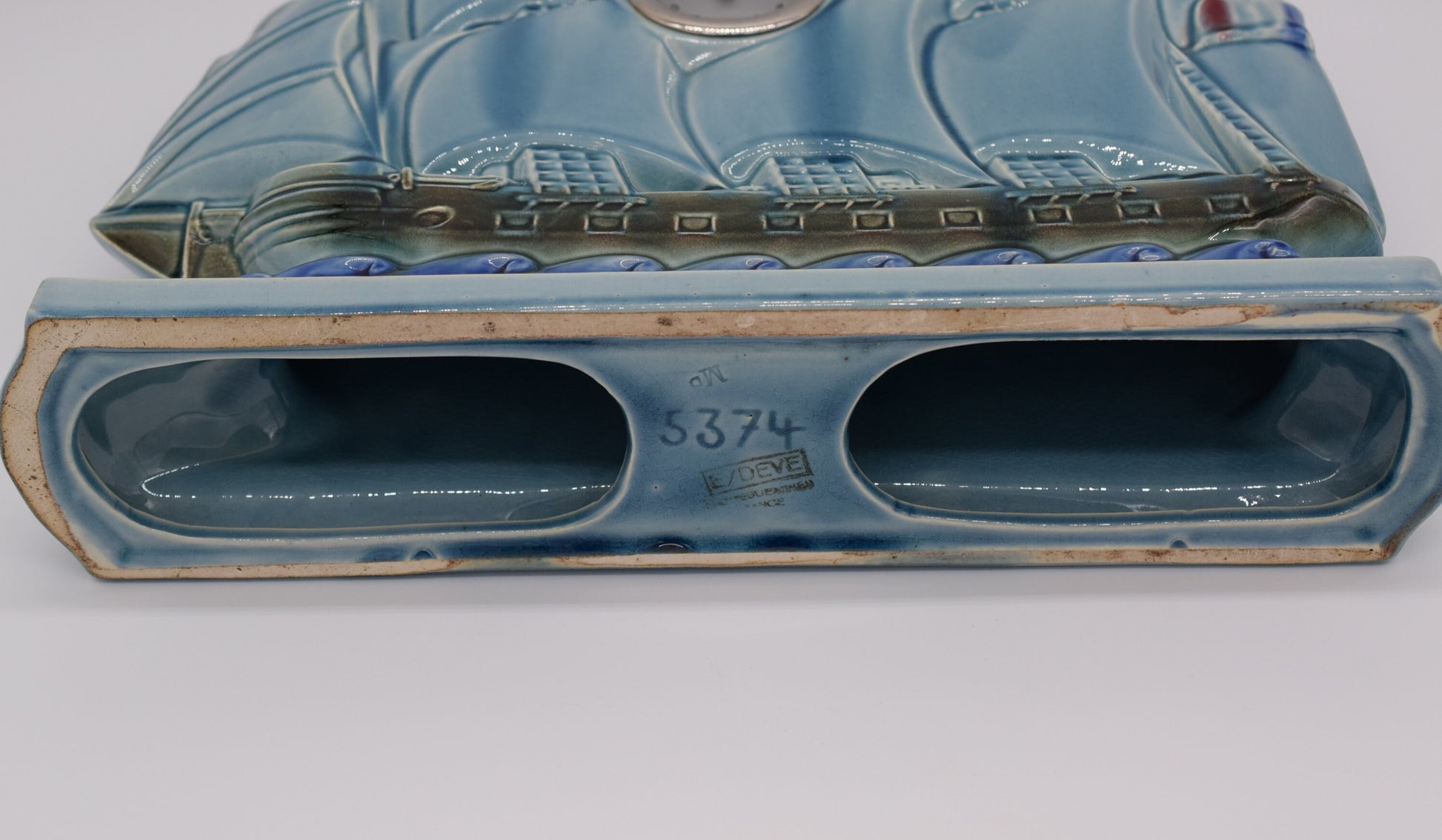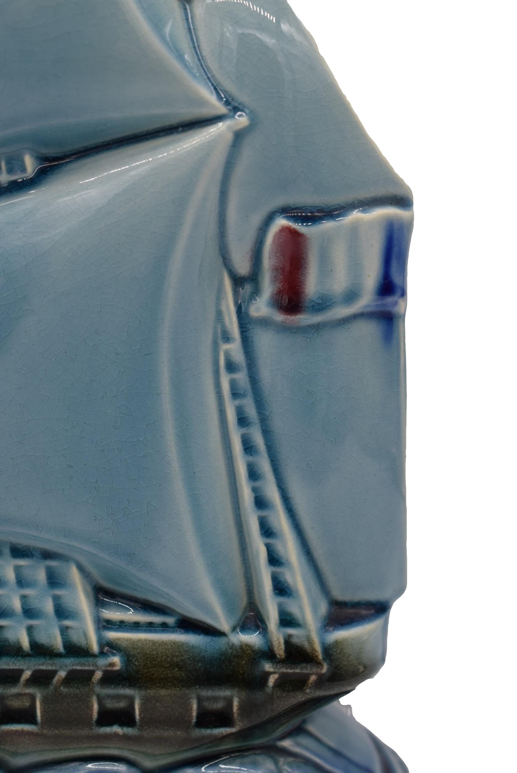 The central piece is a beautifully crafted clock, designed to resemble a sleek and elegant boat. The body of the clock features a rich, glossy glaze in a deep blue hue, accented with intricate detailing that mimics the flowing lines and symmetry of a boat's hull. Flanking the clock are two matching vases, each echoing the nautical theme with their graceful, elongated forms and complementary glazing. The vases are adorned with stylized wave patterns and boat that reflect the same deep blue glaze as the clock, creating a cohesive and visually striking ensemble.