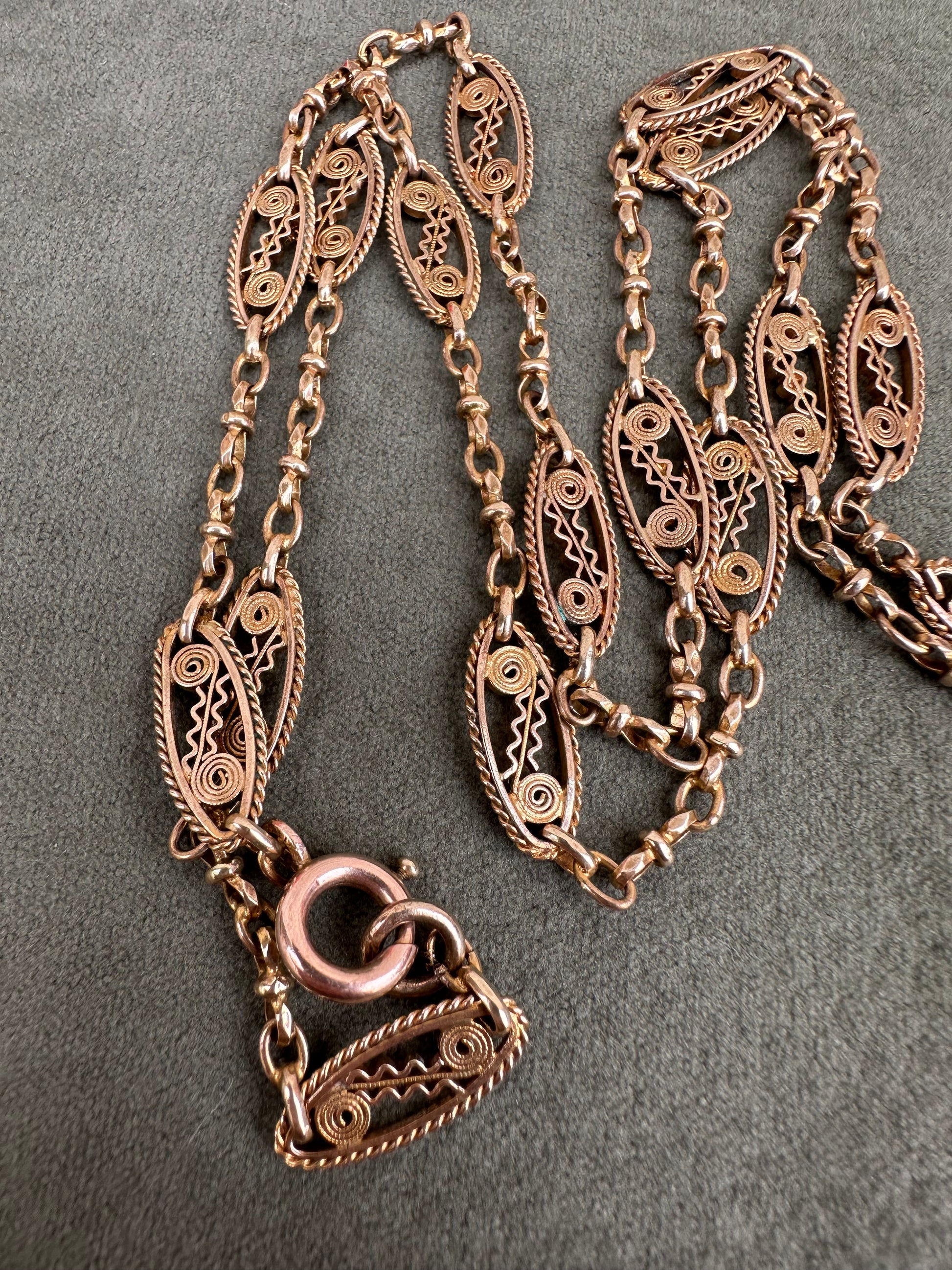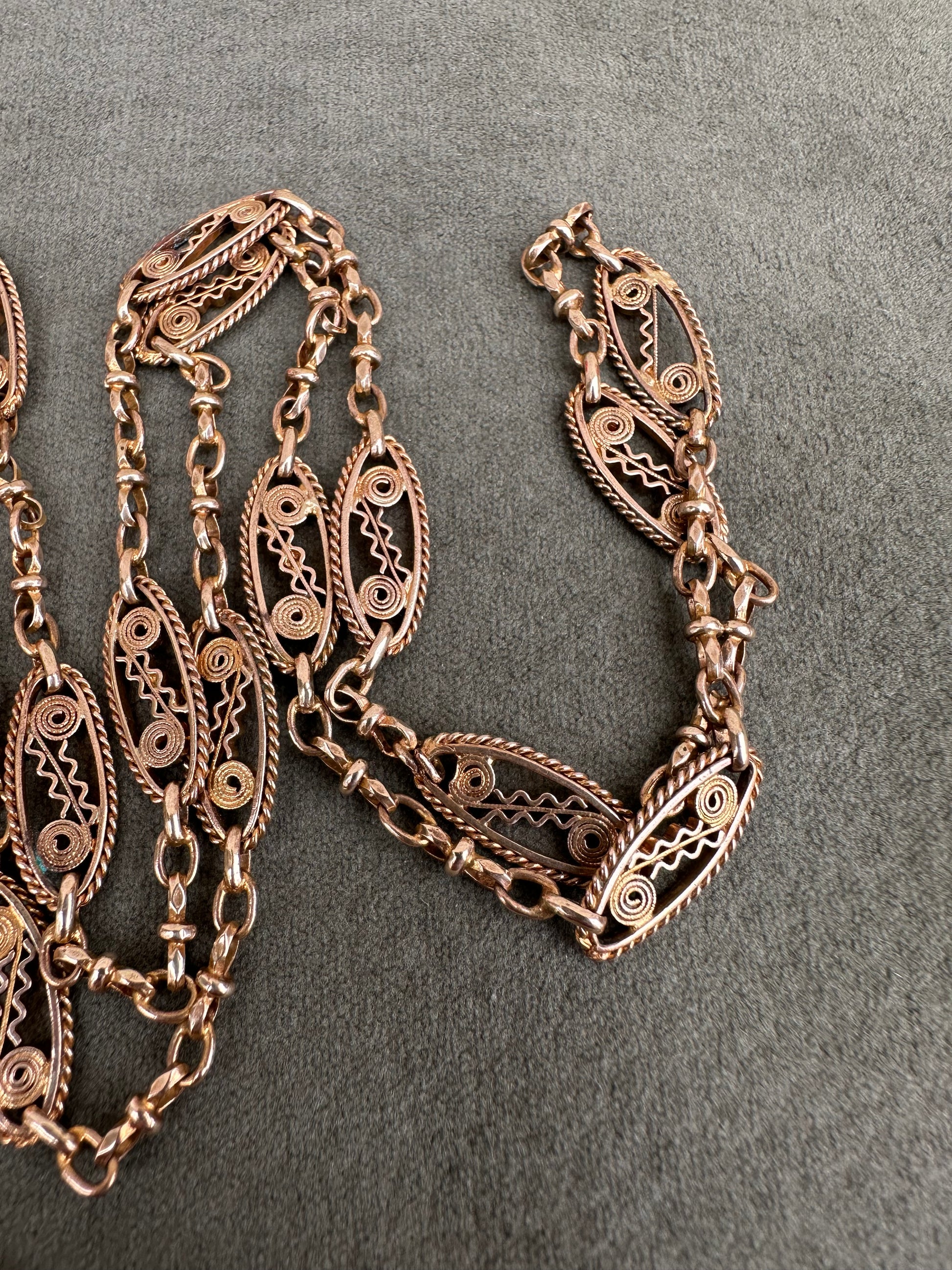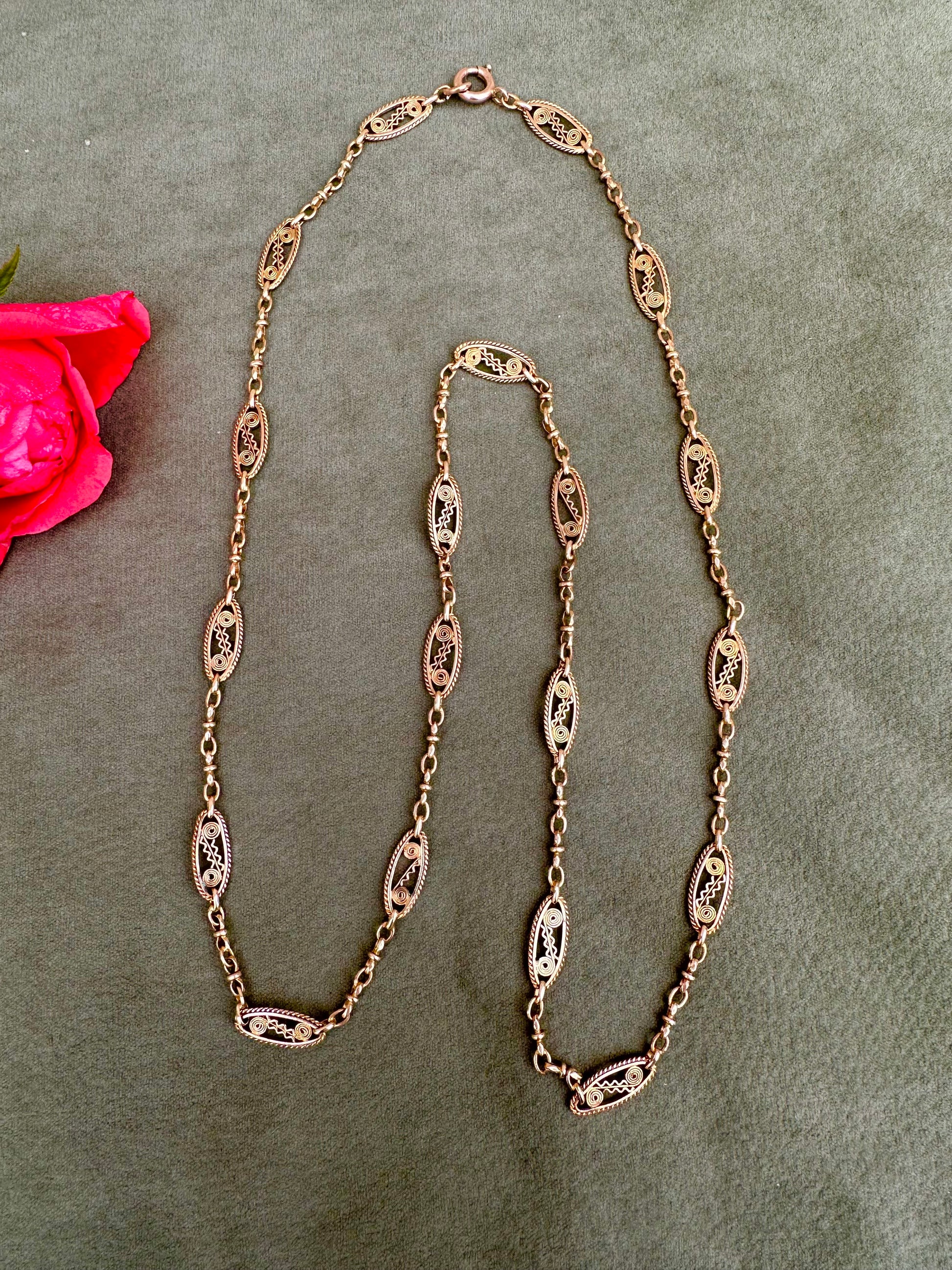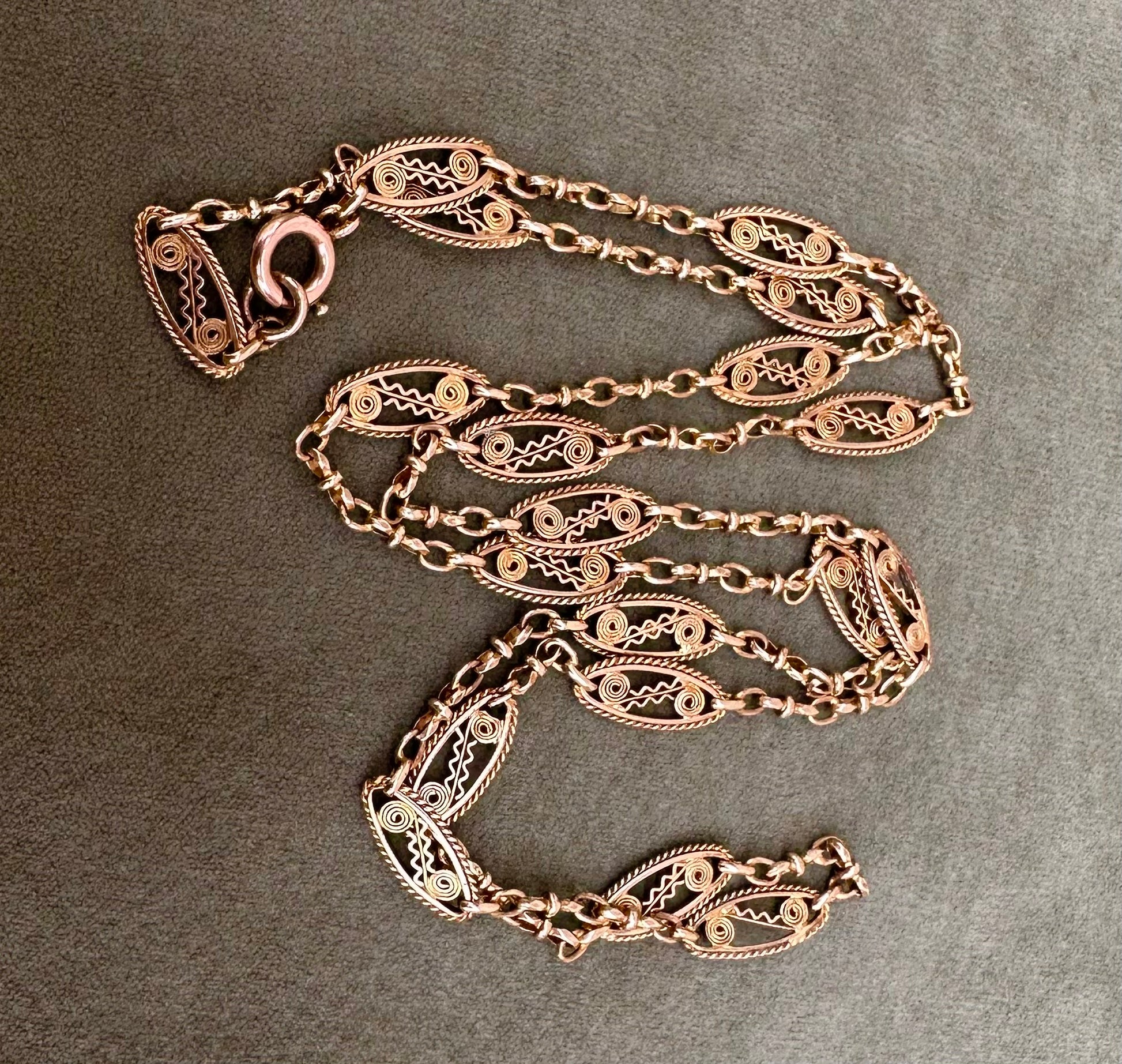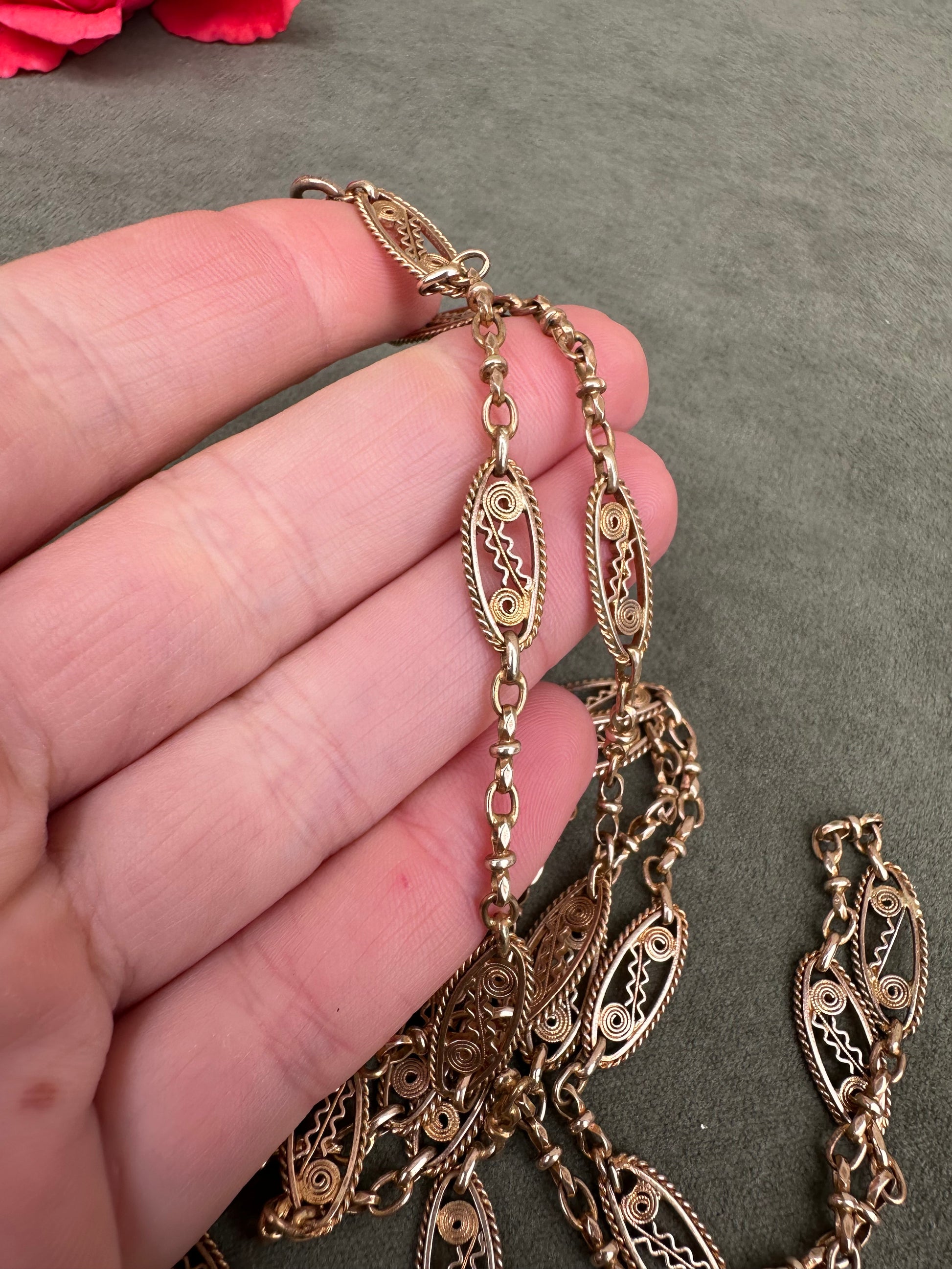 This exquisite antique French sautoir chain necklace, crafted by Maison Savard in the early 1900s, is a true testament to fine craftsmanship. Made from gold-filled metal and hallmarked with “titre fixe,” it showcases intricate filigree links that add an elegant, lace-like texture to the chain. Measuring 31 1/2 inches, this long muff chain necklace embodies the sophistication of the Belle Époque era, ideal for layering or as a statement piece. Remarkably well-preserved for a piece over 120 years old, it remains in very good condition, offering both historical significance and timeless beauty for any vintage jewelry enthusiast.