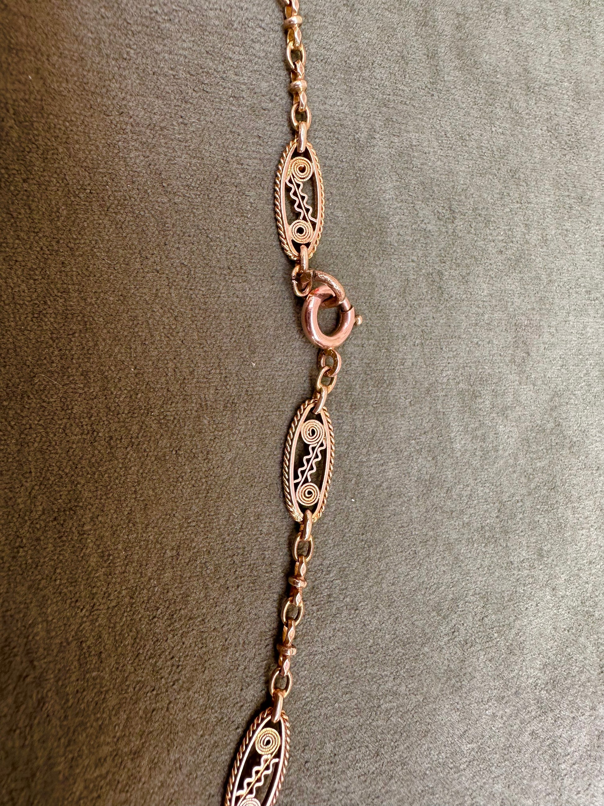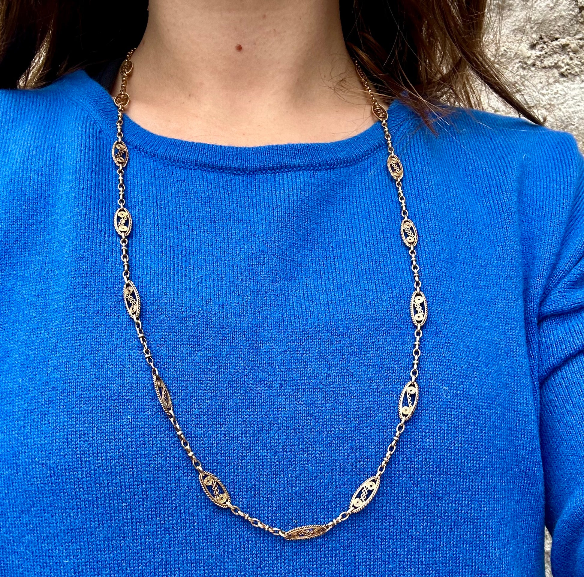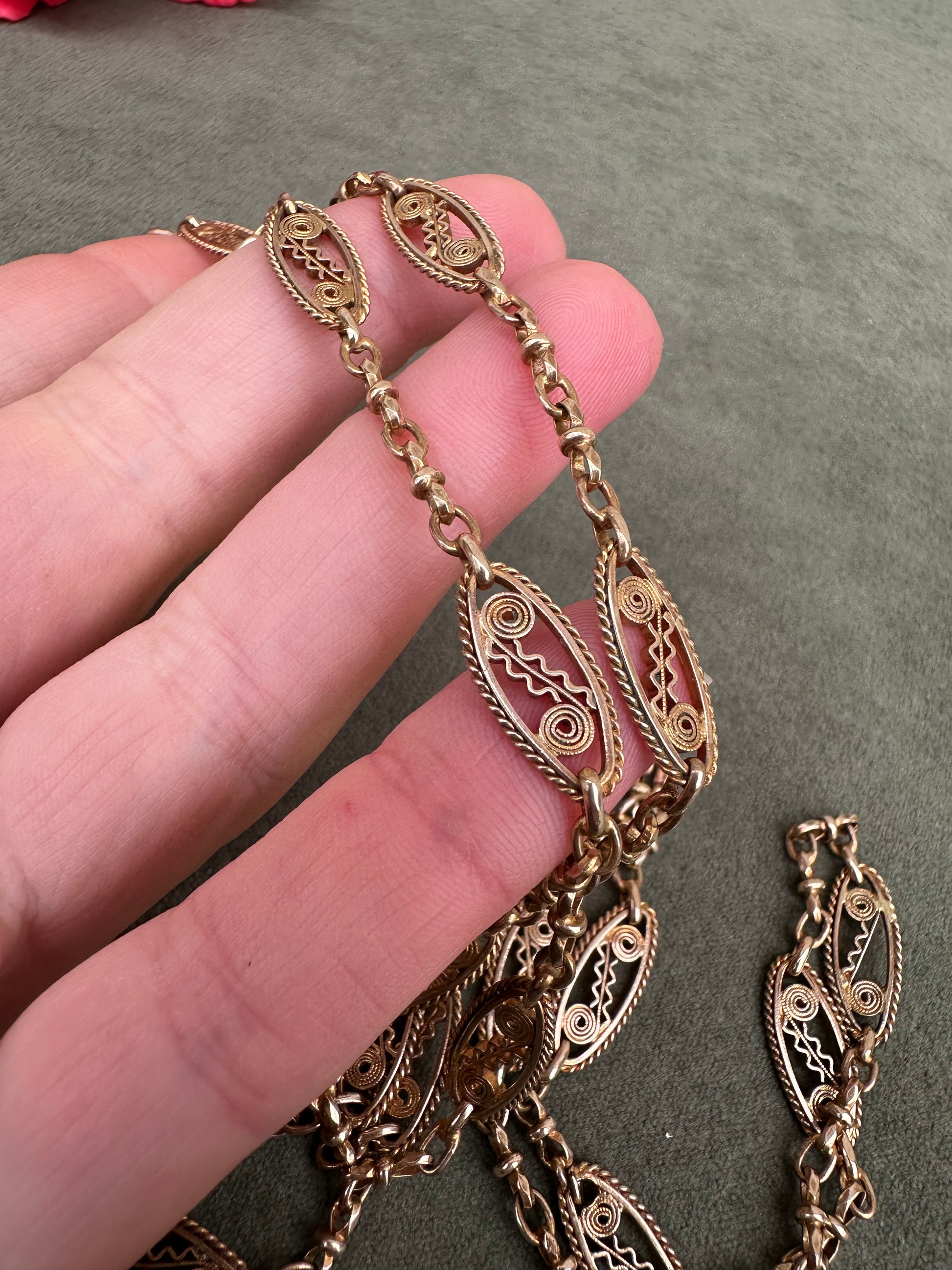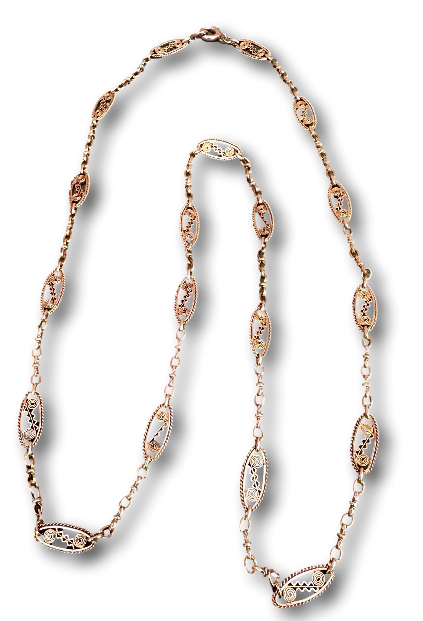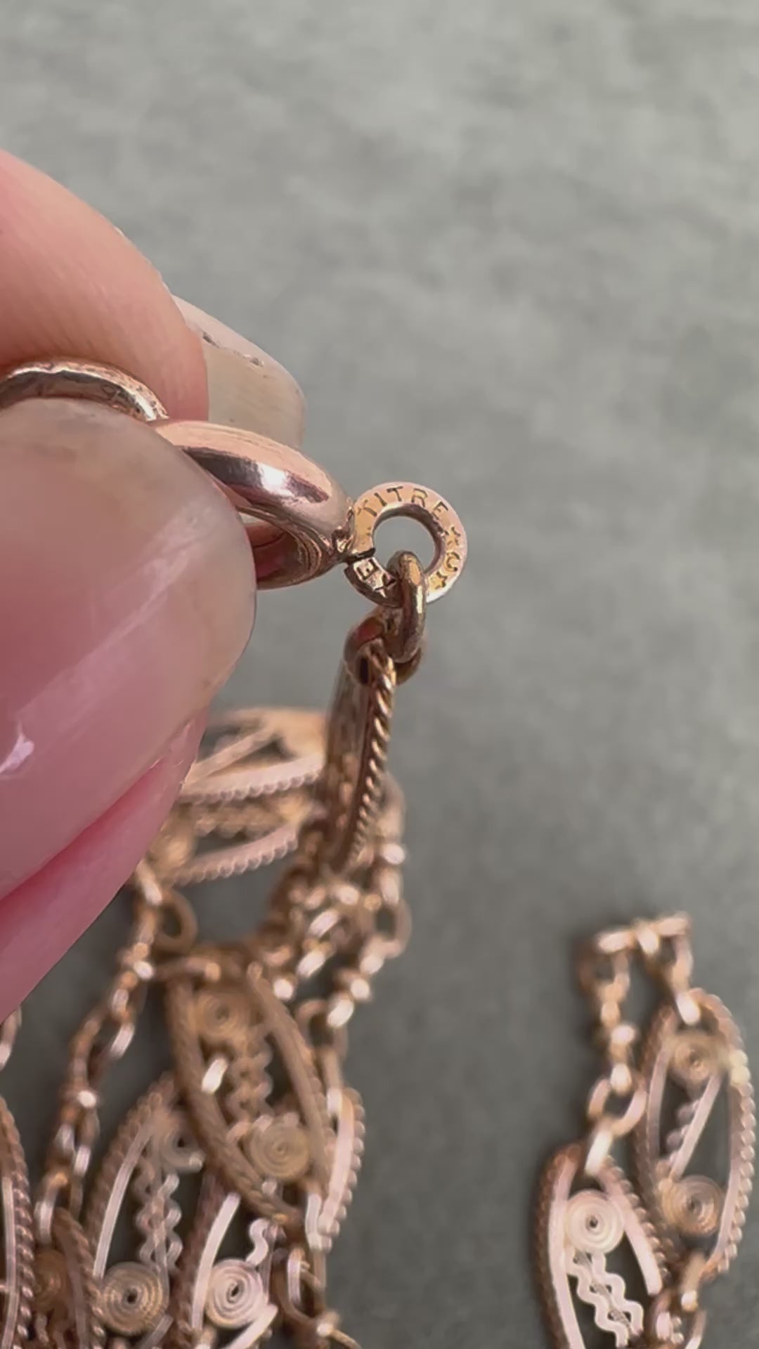 This exquisite antique French sautoir chain necklace, crafted by Maison Savard in the early 1900s, is a true testament to fine craftsmanship. Made from gold-filled metal and hallmarked with “titre fixe,” it showcases intricate filigree links that add an elegant, lace-like texture to the chain. Measuring 31 1/2 inches, this long muff chain necklace embodies the sophistication of the Belle Époque era, ideal for layering or as a statement piece. Remarkably well-preserved for a piece over 120 years old, it remains in very good condition, offering both historical significance and timeless beauty for any vintage jewelry enthusiast.