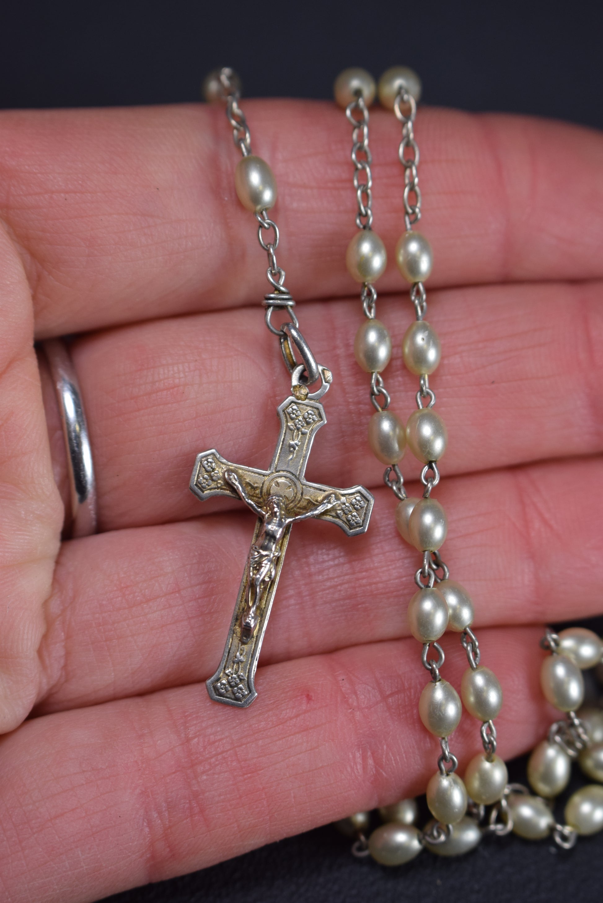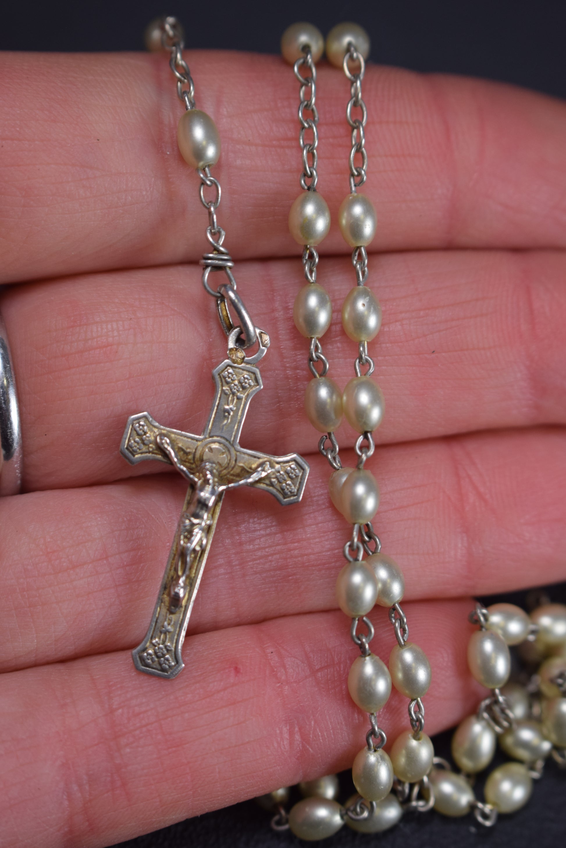Un joli chapelet antique français composé de 59 perles et d'argent sterling, datant du début du 20e siècle. Le connecteur présente un portrait de Notre-Dame Vierge Marie. La croix est finement ouvragée et porte le poinçon français en argent sterling. Il a un ton doré clair. Les perles de forme ovale sont recouvertes d'une couche imitant les perles culturelles. Ce petit chapelet est très délicat.