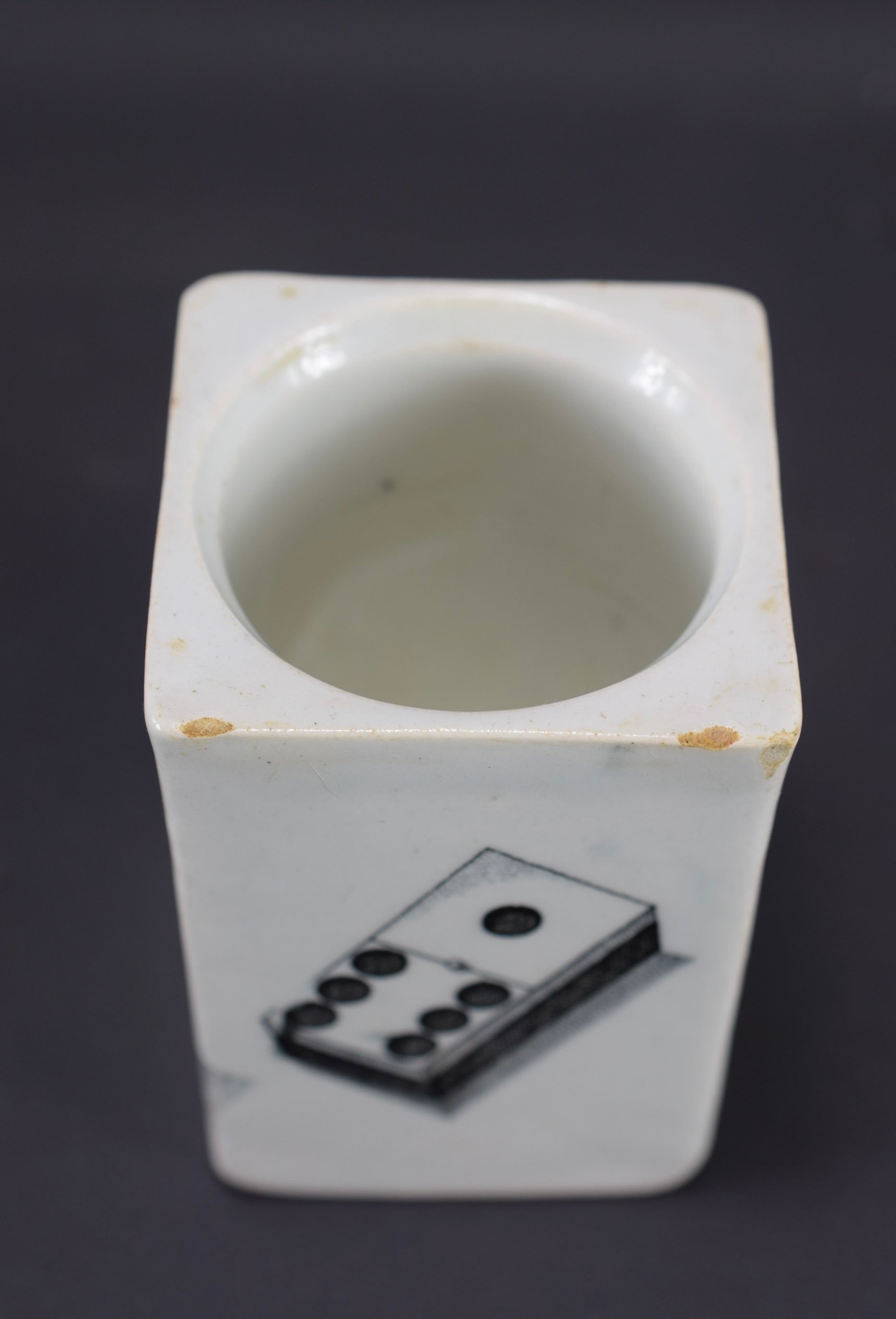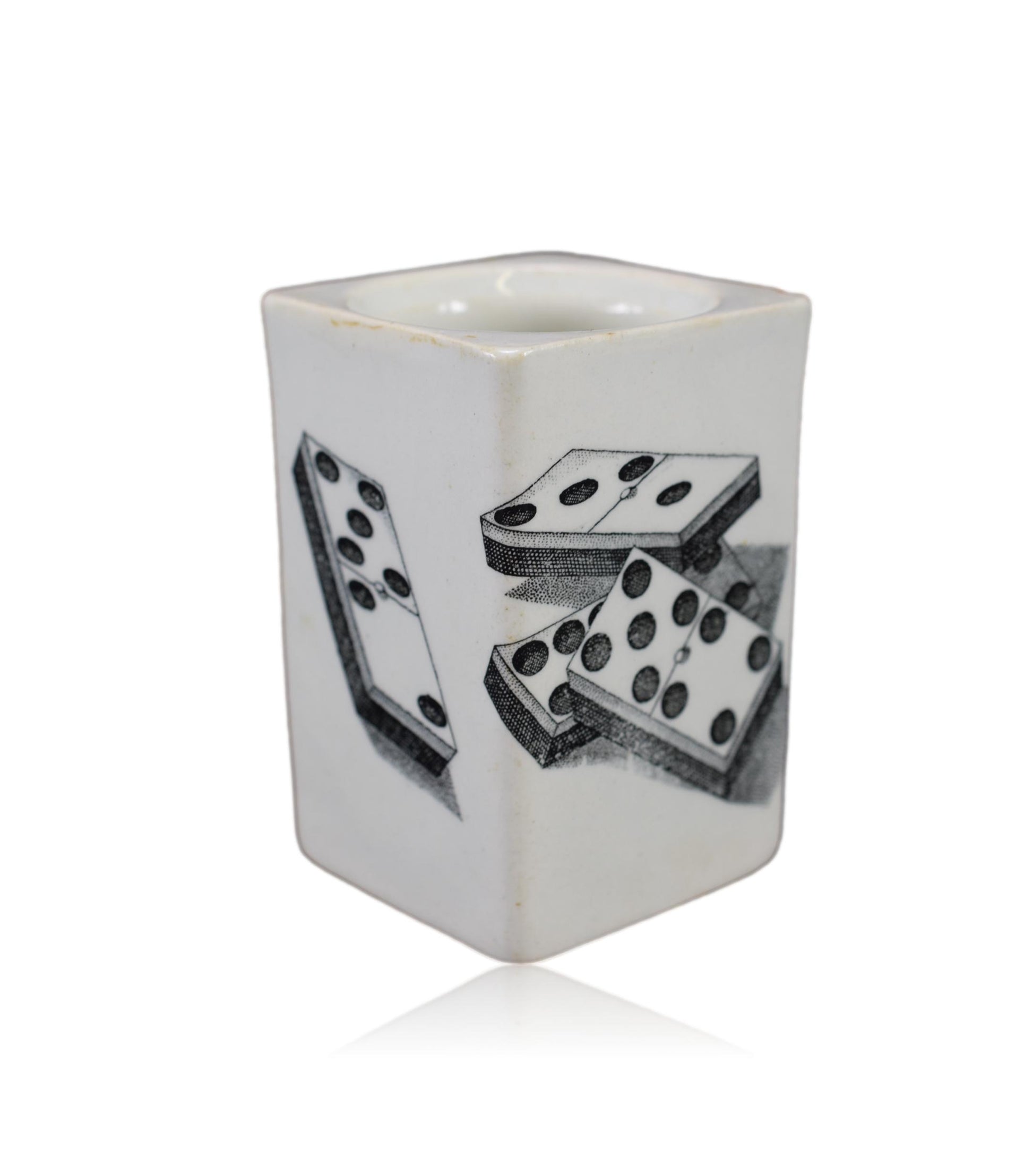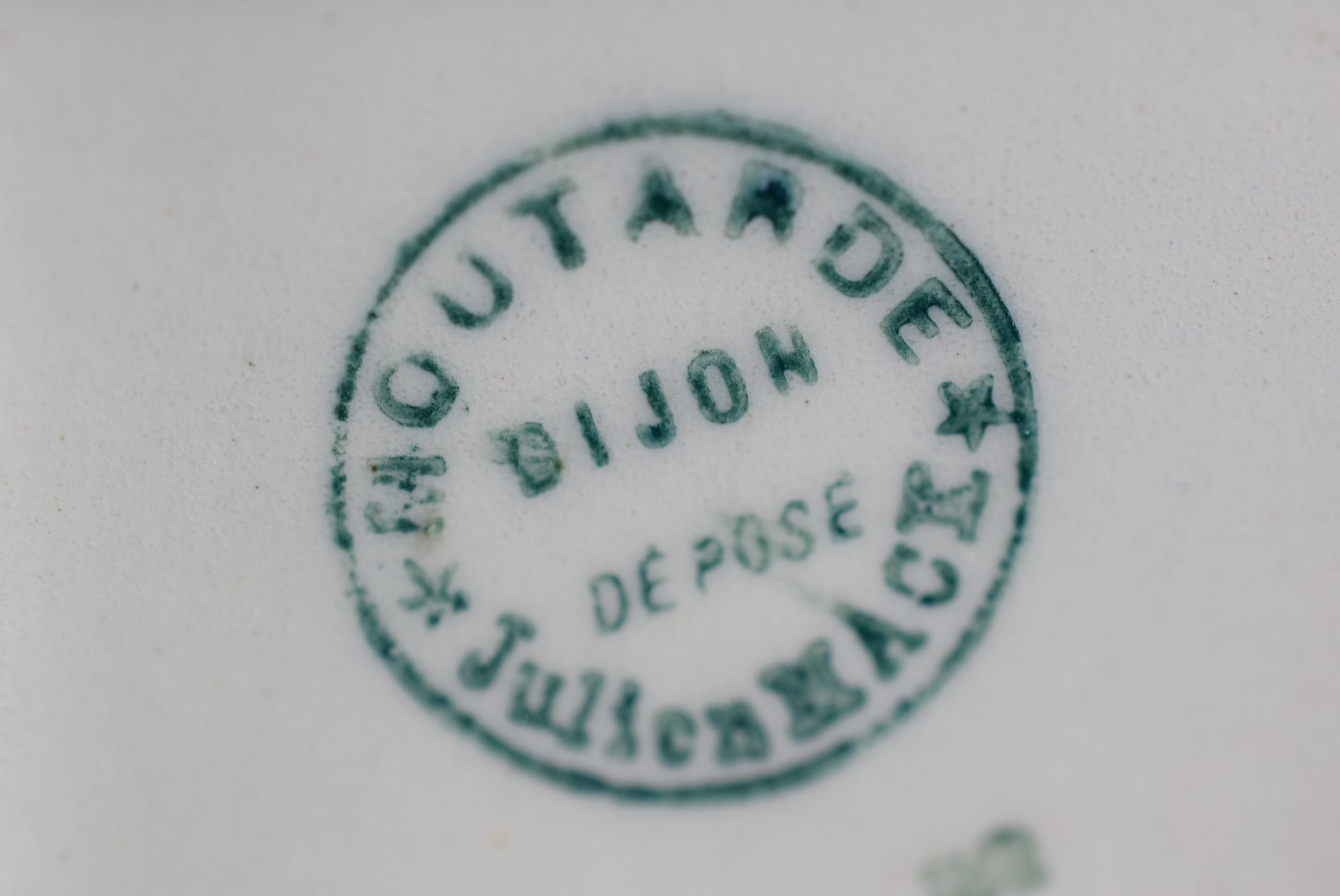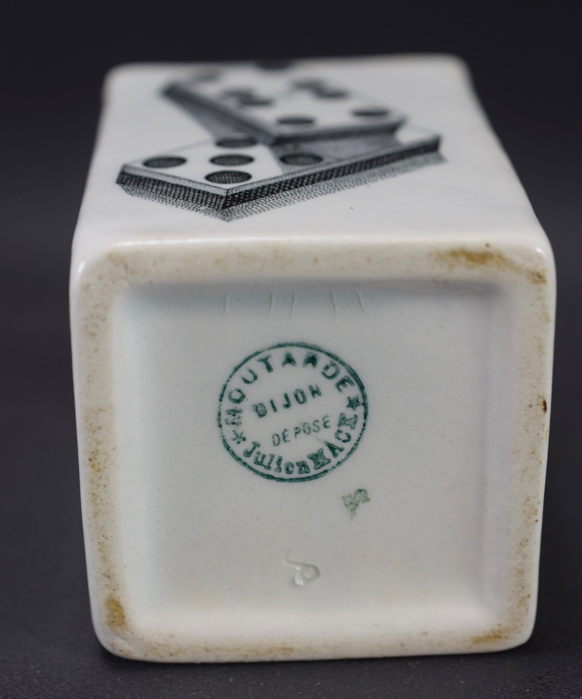 Un charmant pot à moutarde français antique datant du début du 20ème siècle. Le pot en céramique noir et blanc présente des dominos de chaque côté. Design rare créé pour la moutarde de Dijon Julien Mack. Une pièce de collection.