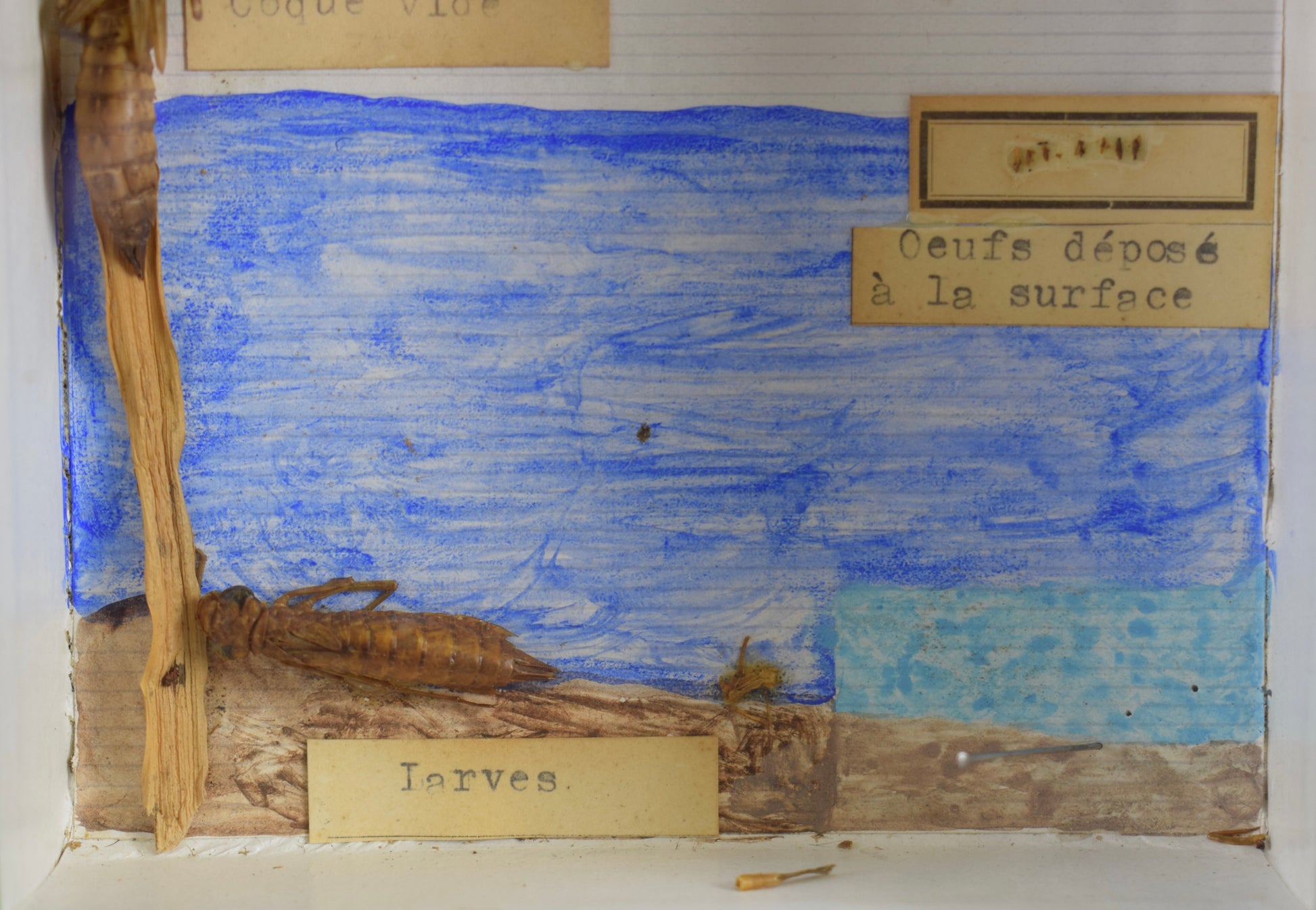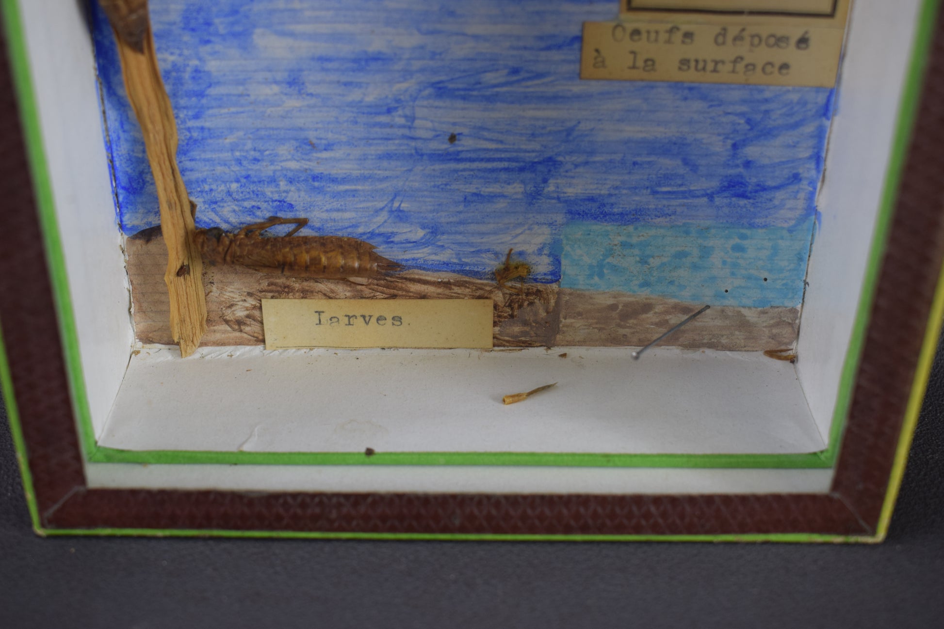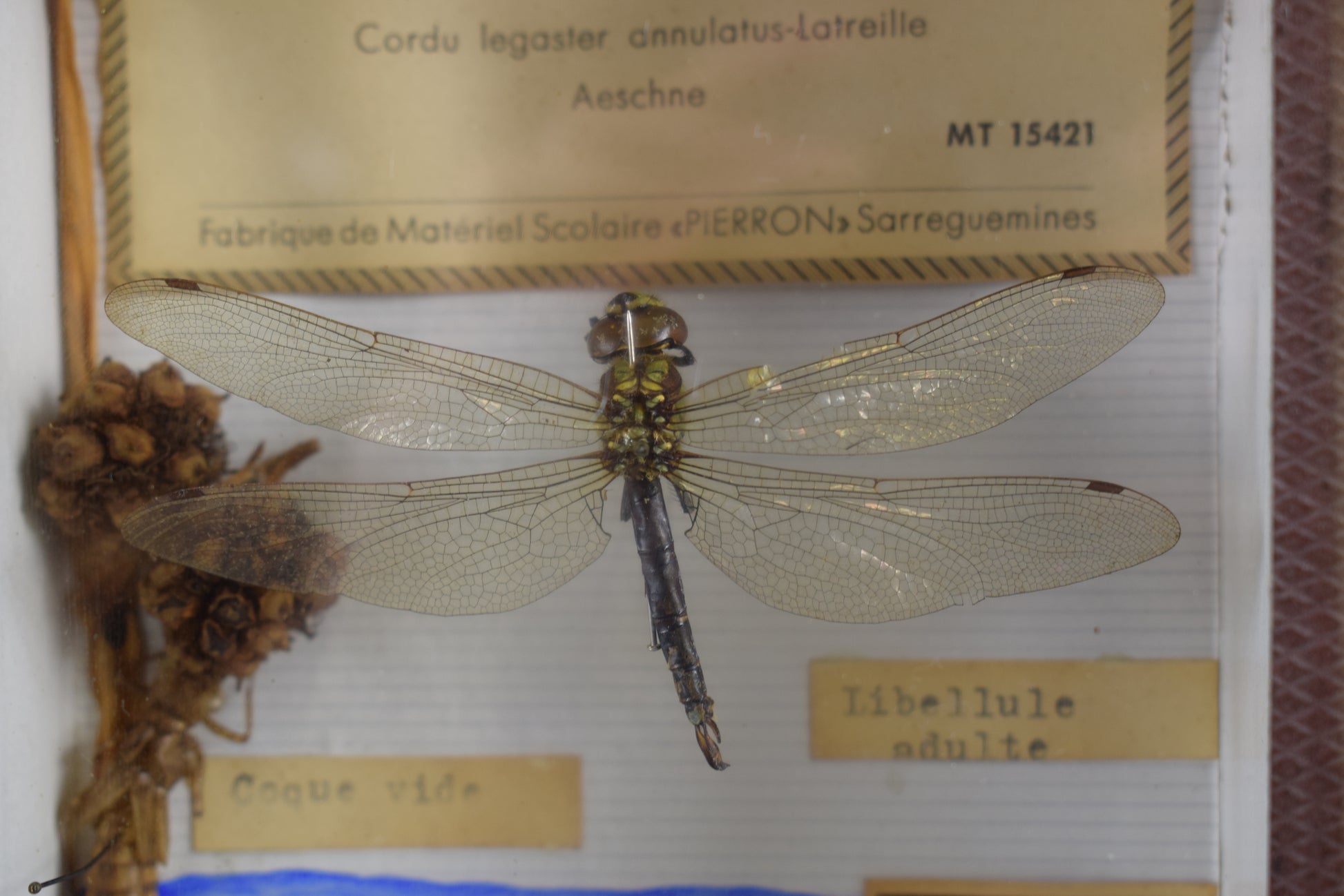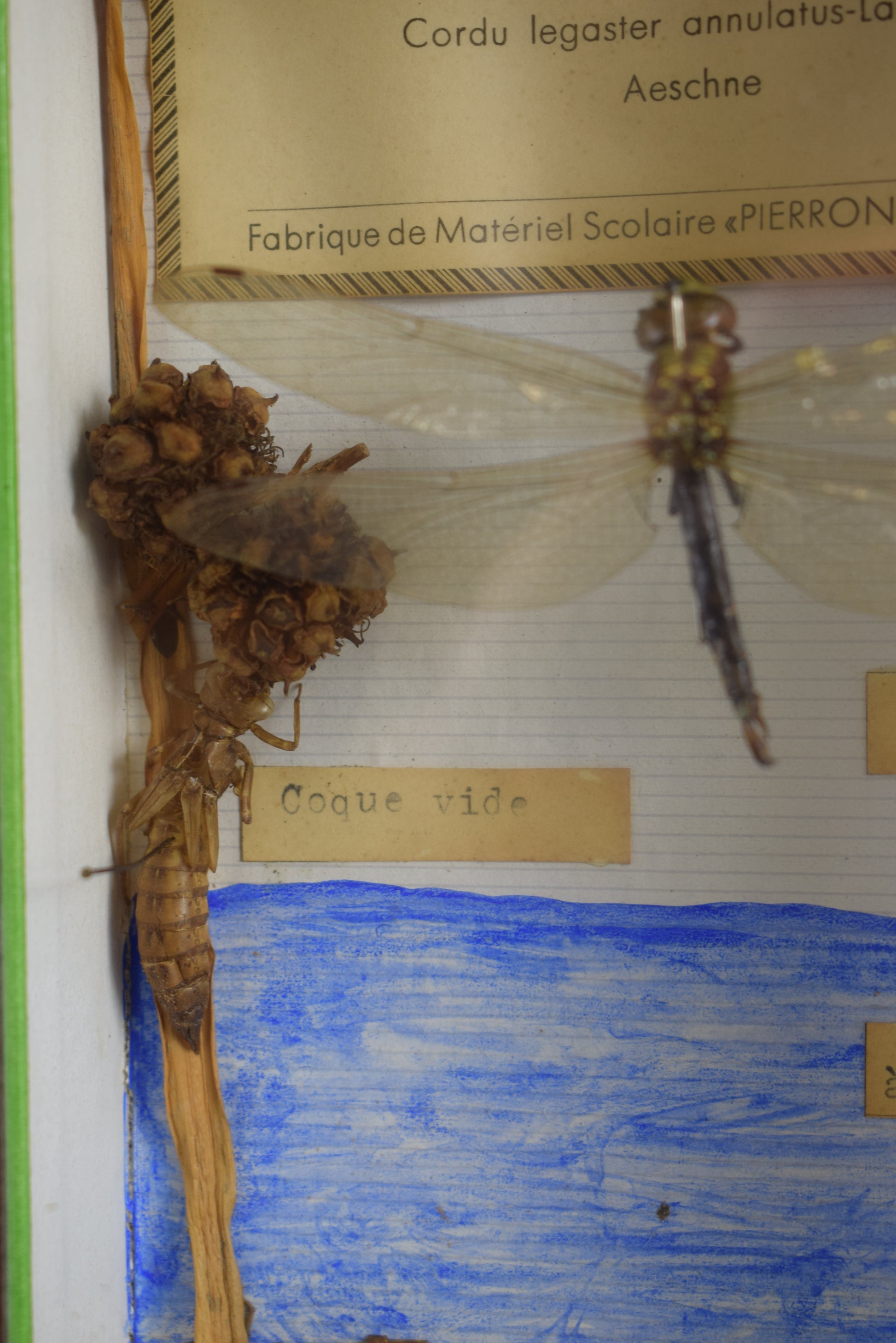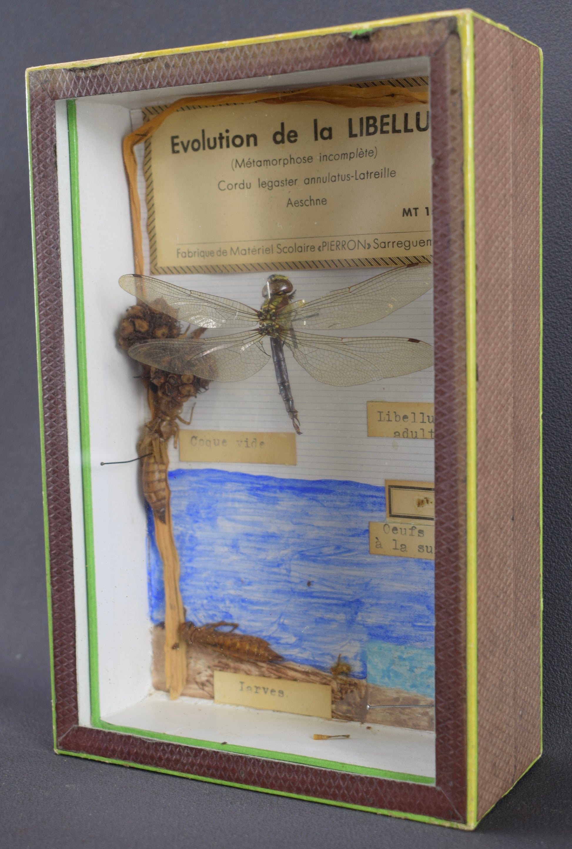 Une rare exposition d'insectes antiques français datant des années 1940-1960. La zone fantôme montre le développement de la libellule. Les travaux d'entomologie à l'ancienne ont été mis sous verre. La boîte a été fabriquée par l'usine de matériel scolaire "Pierron" fondée en France en 1871.