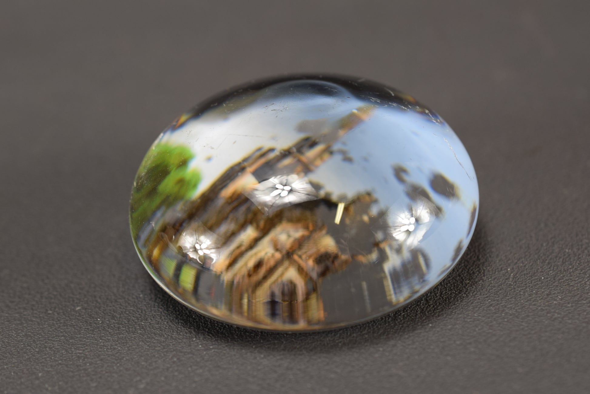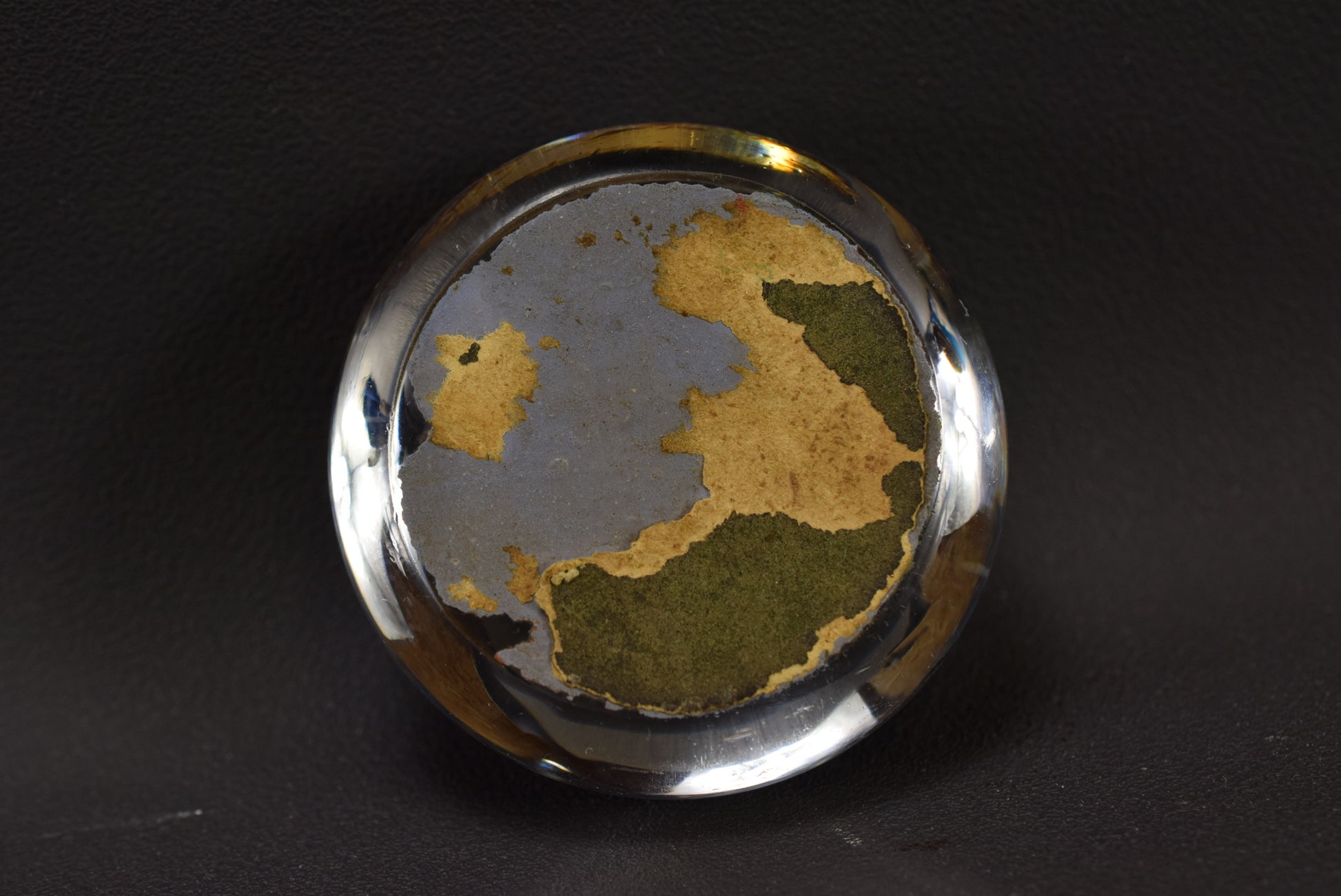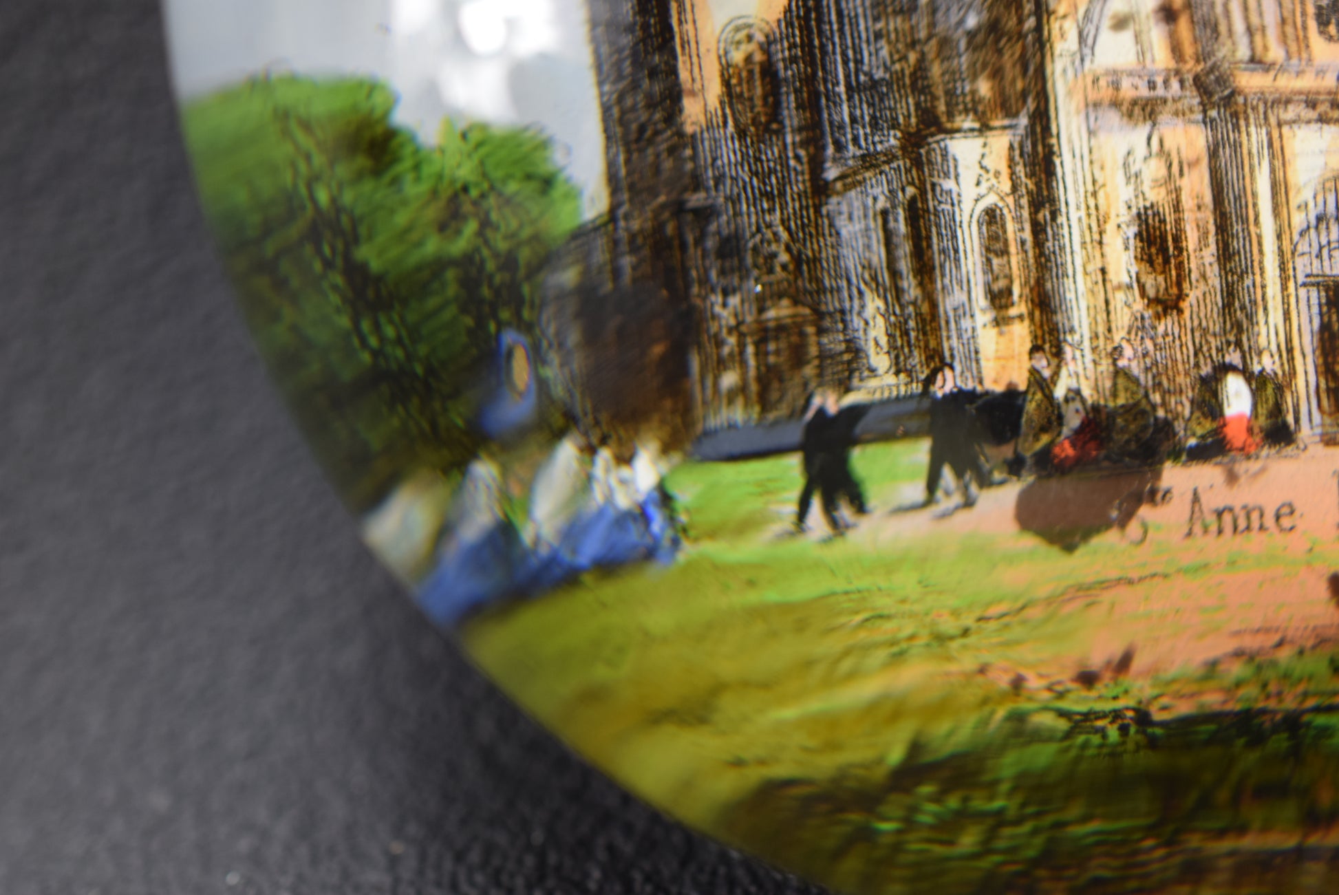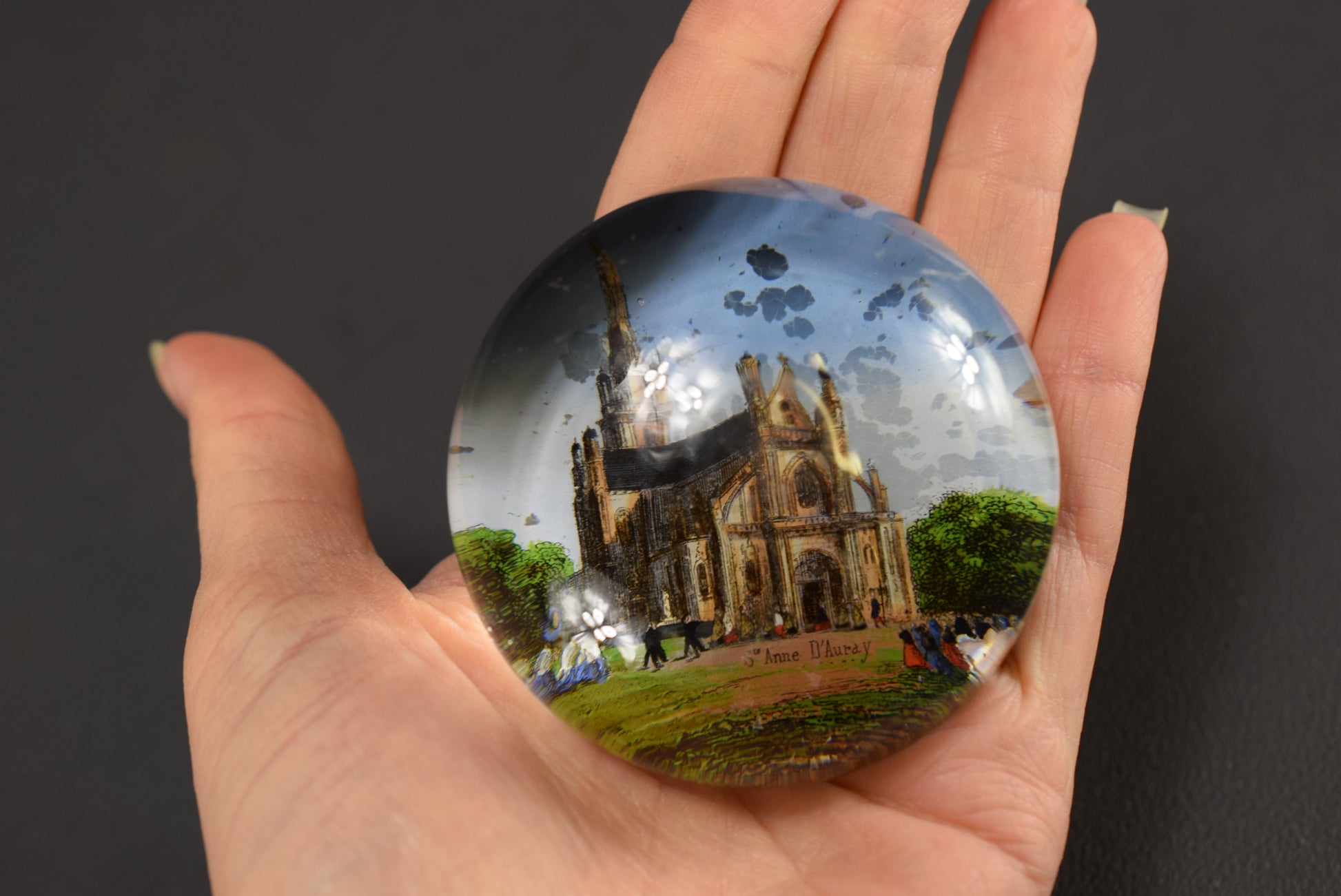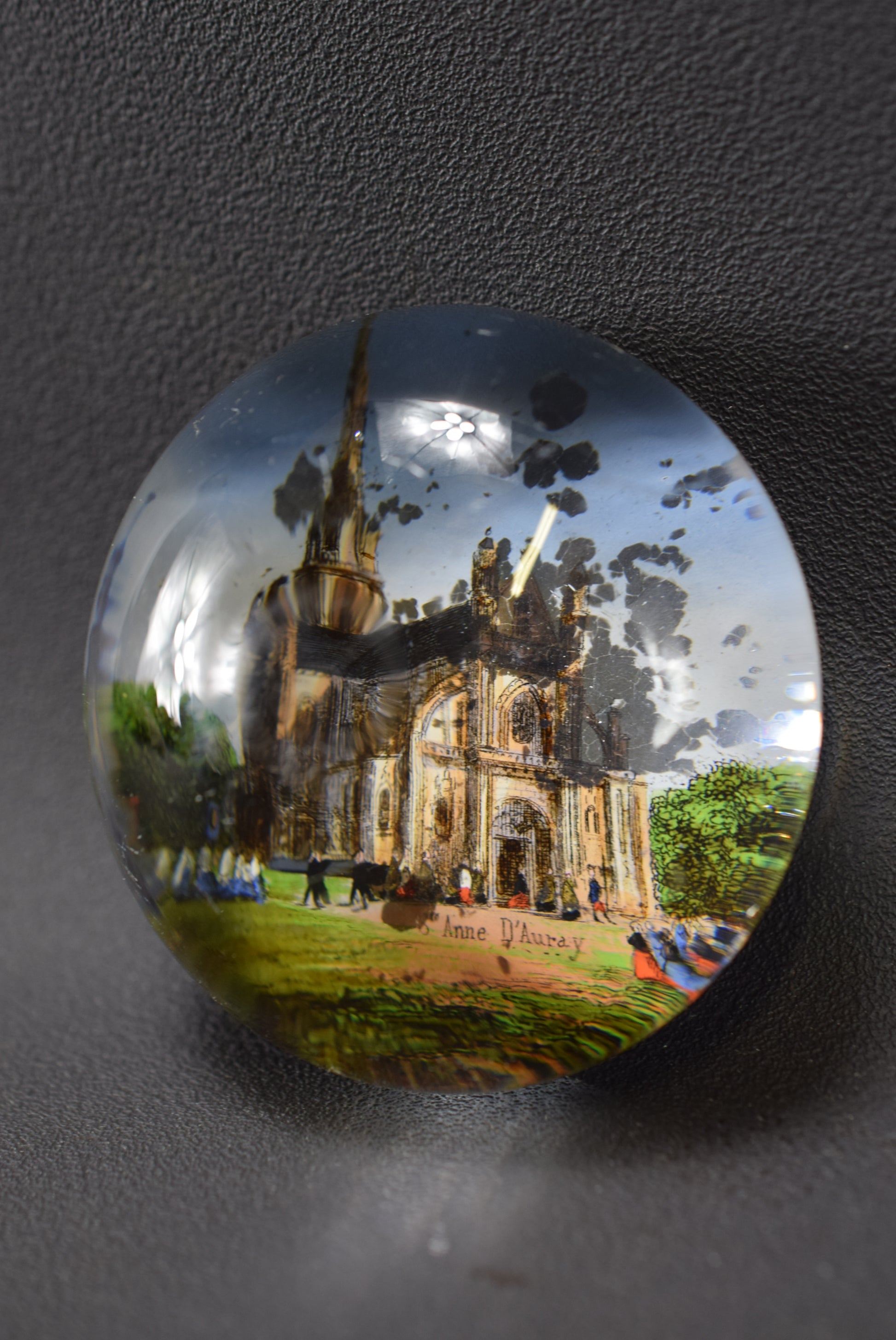 Un magnifique presse-papier en verre antique français datant du début du 20e siècle, vers 1900. Le décor églomisé représente un pèlerinage à la basilique Sainte Anne d'Auray (St Ann d'Auray). "Eglomise" est le terme appliqué aux panneaux de verre rétro-peints. Sainte Anne d'Auray est le plus important lieu de pèlerinage de Bretagne, où sainte Anne, la grand-mère de Jésus, apparut à un laboureur, Yvon Nicolazic, et lui dit en breton : " Me zo Anna mamm Mari", " Je suis la mère de Marie". Sainte-Anne d'Auray est un lieu de rassemblement, de ressourcement, d'espérance et de réconfort.