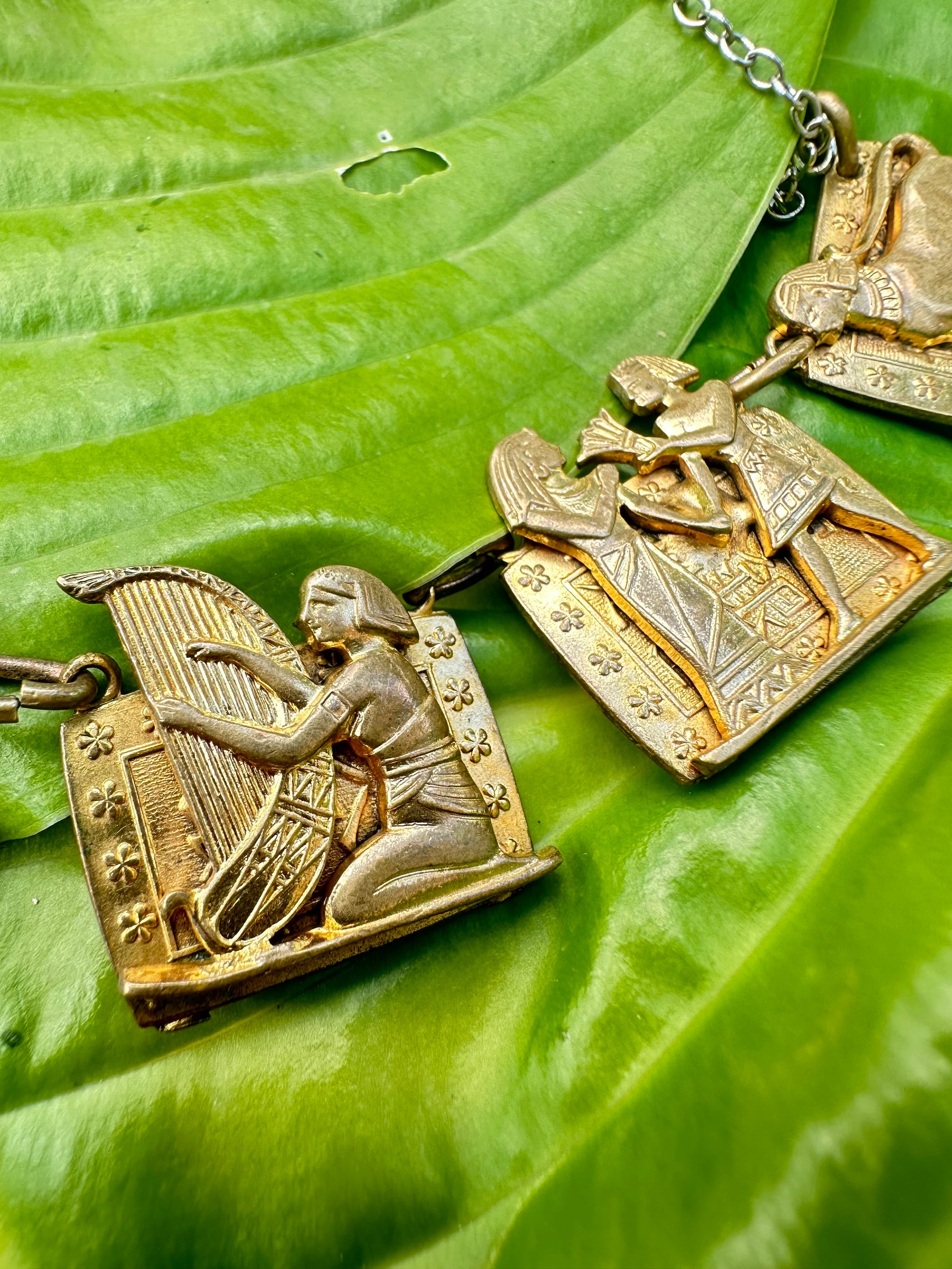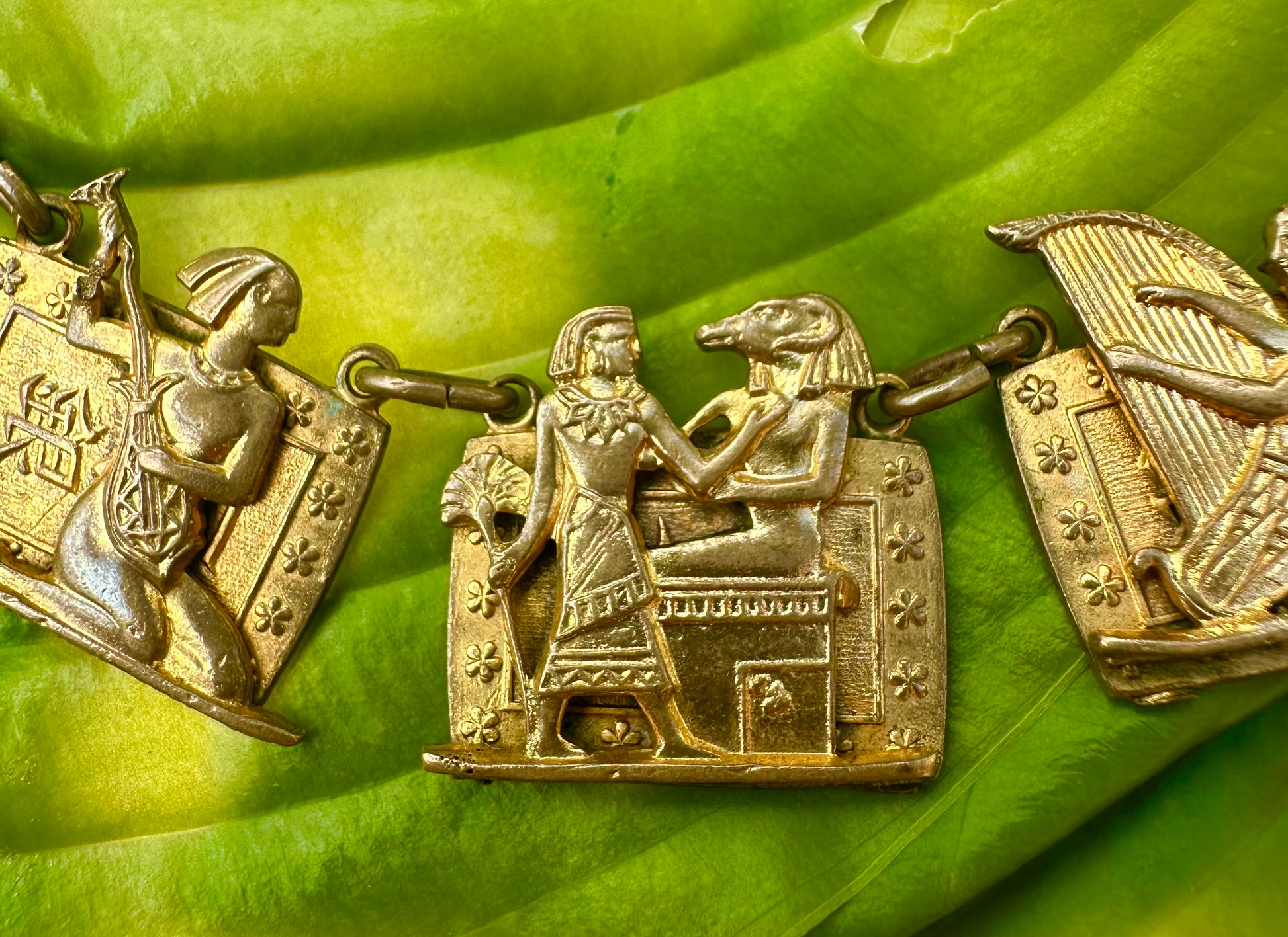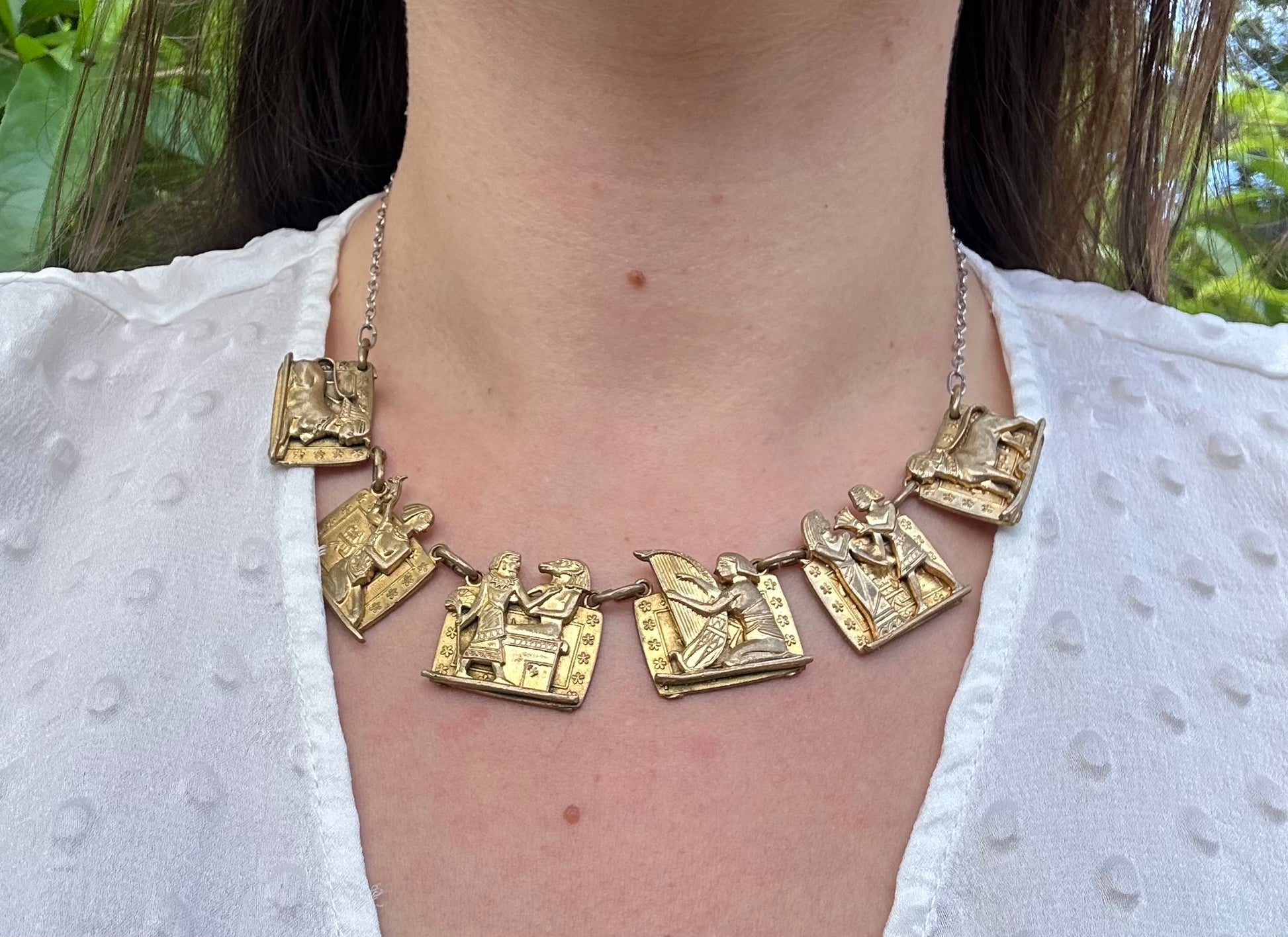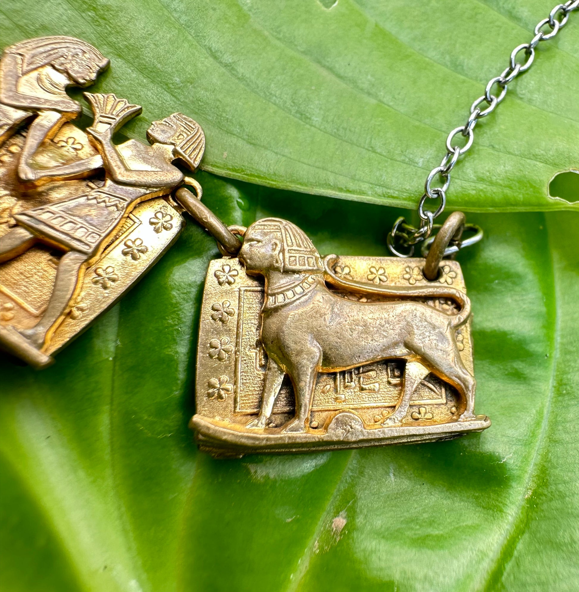 A beautiful vintage French Egyptian Revival jewelry. The Art Deco choker is made of six gilded brass pieces depicting traditional Egyptian symbols like sphinx. This Egyptian revival necklace is gorgeous. The quality of the craftsmanship ensures that it will continue to be a cherished necklace for years to come.