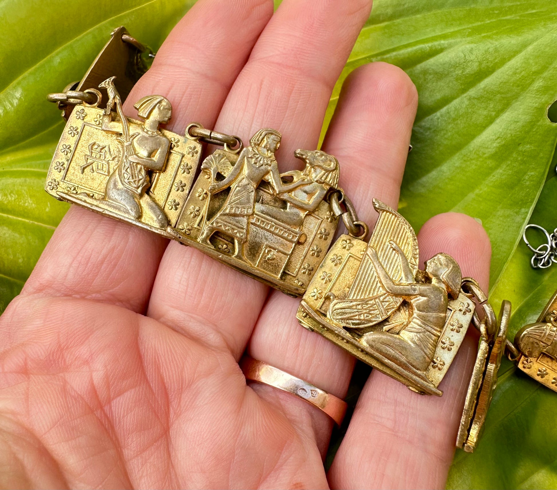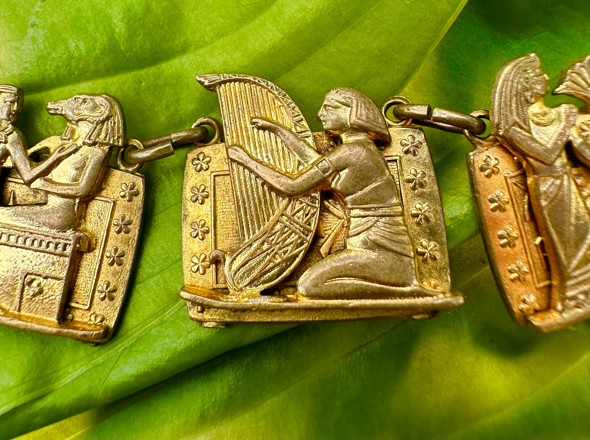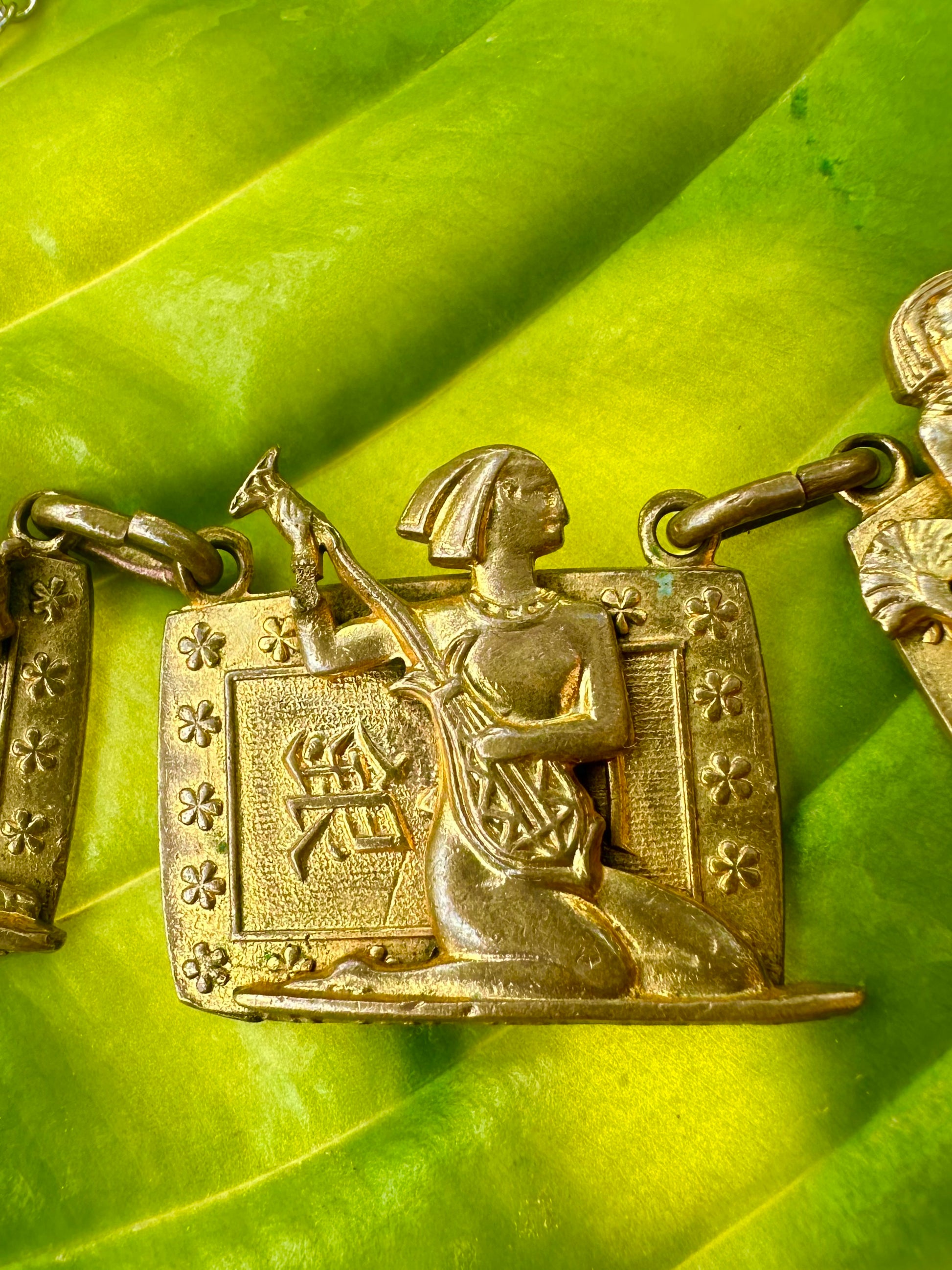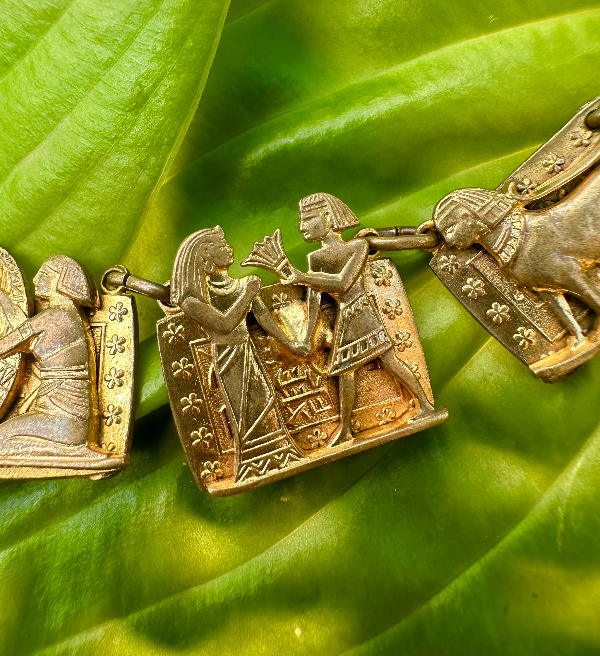 A beautiful vintage French Egyptian Revival jewelry. The Art Deco choker is made of six gilded brass pieces depicting traditional Egyptian symbols like sphinx. This Egyptian revival necklace is gorgeous. The quality of the craftsmanship ensures that it will continue to be a cherished necklace for years to come.