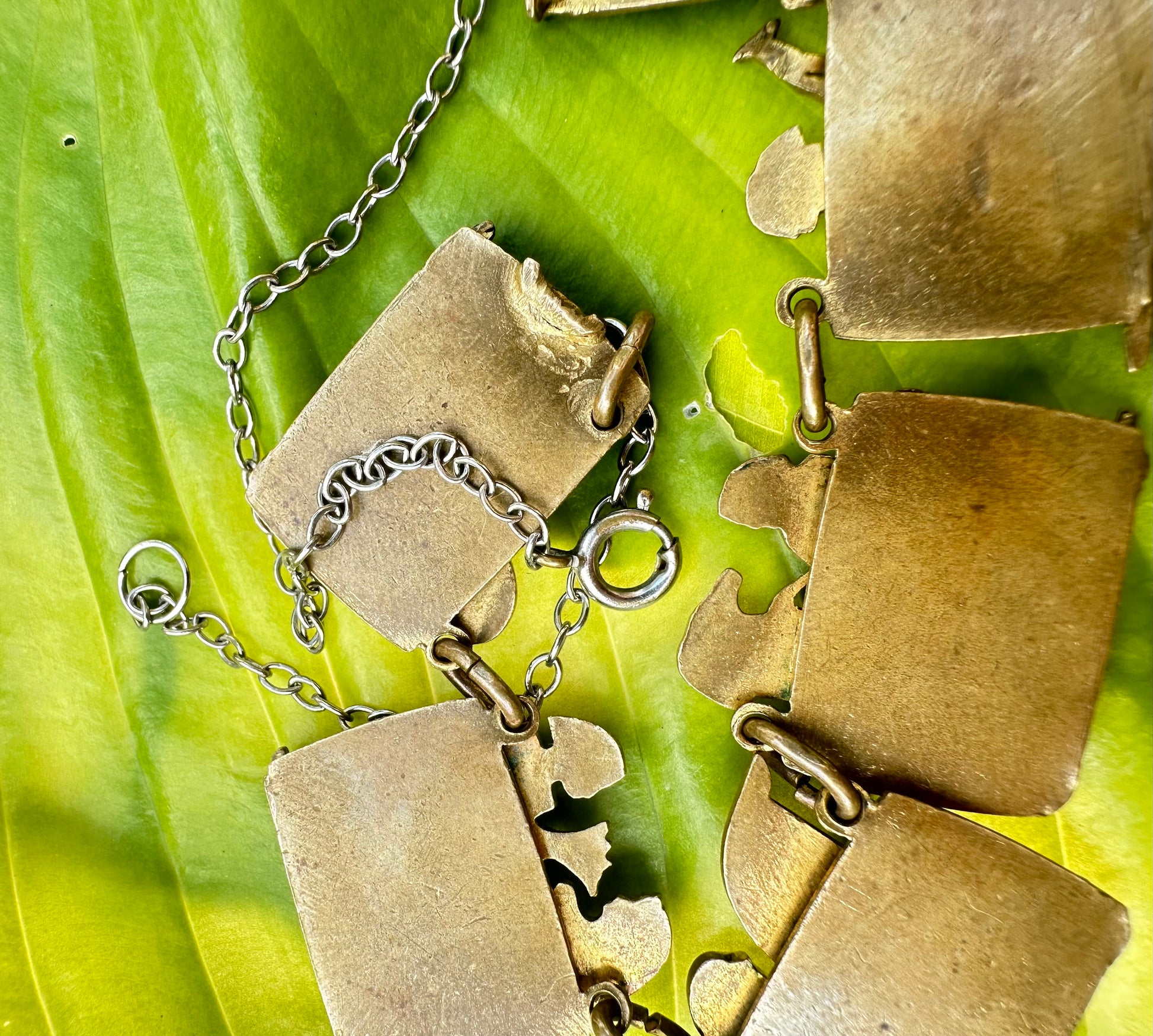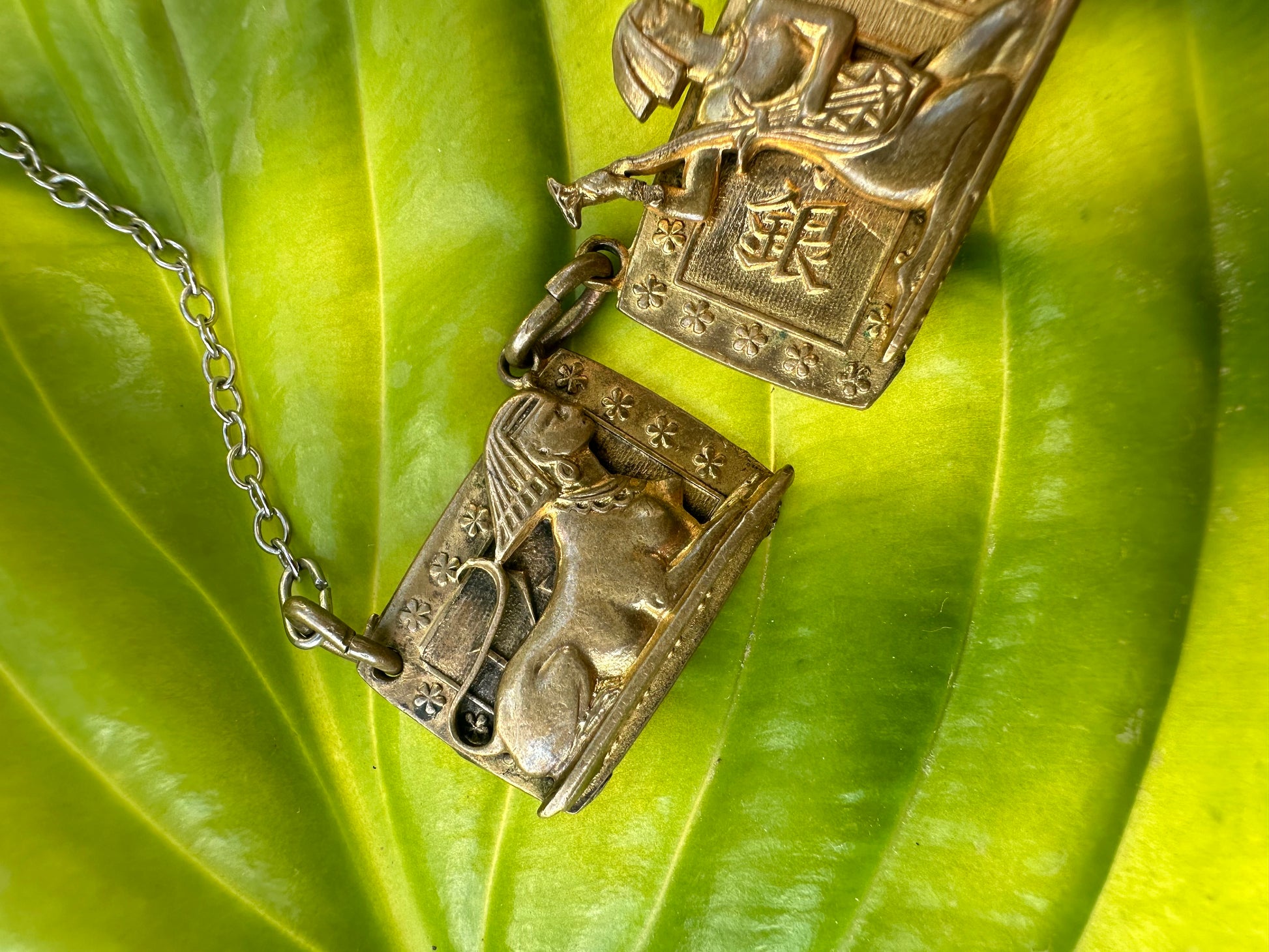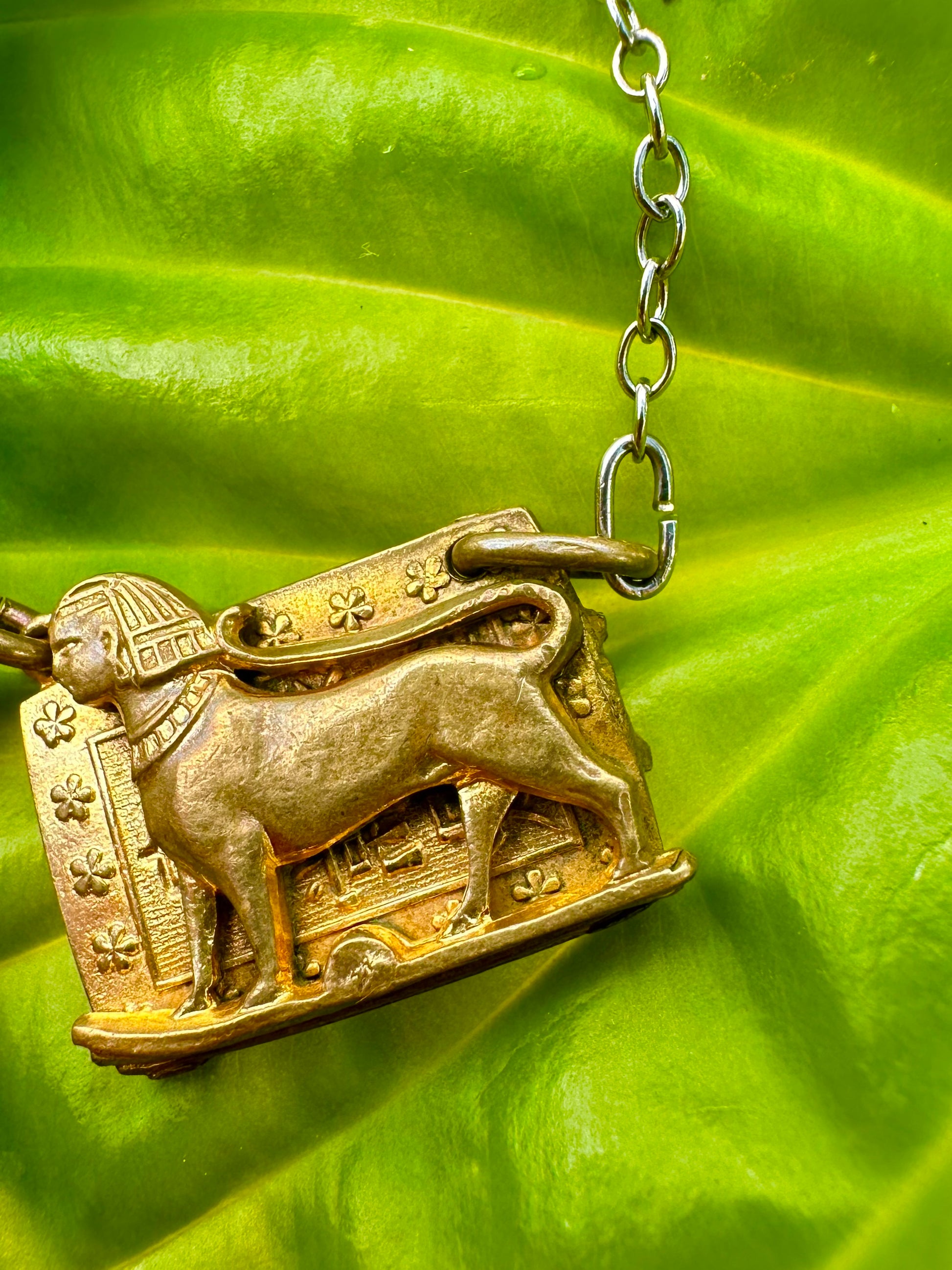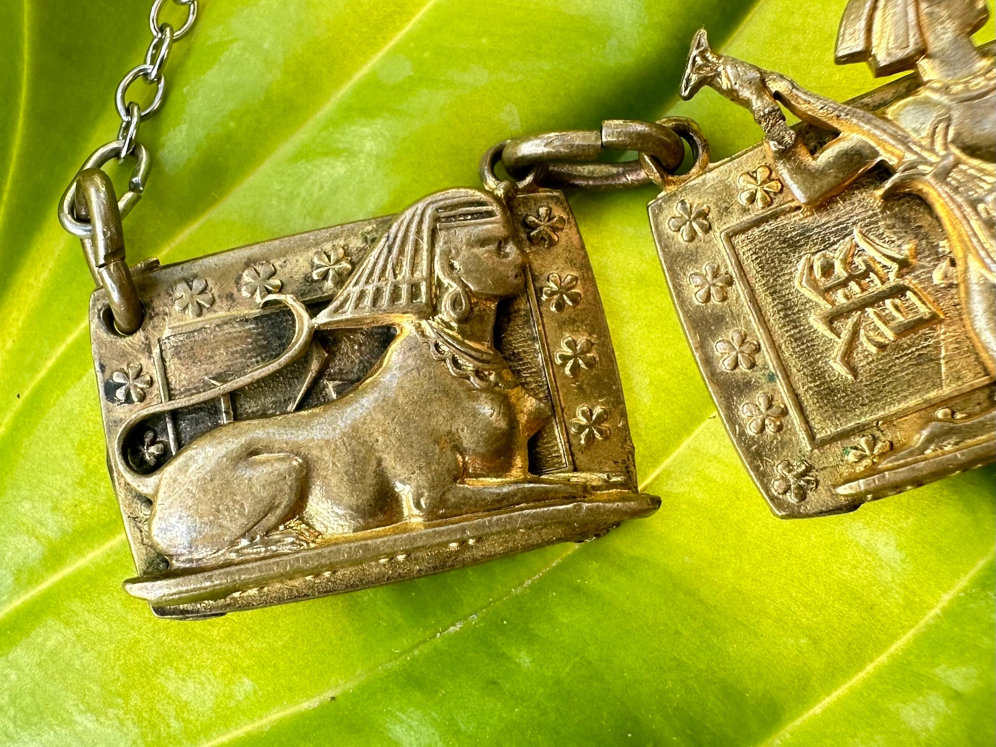A beautiful vintage French Egyptian Revival jewelry. The Art Deco choker is made of six gilded brass pieces depicting traditional Egyptian symbols like sphinx. This Egyptian revival necklace is gorgeous. The quality of the craftsmanship ensures that it will continue to be a cherished necklace for years to come.