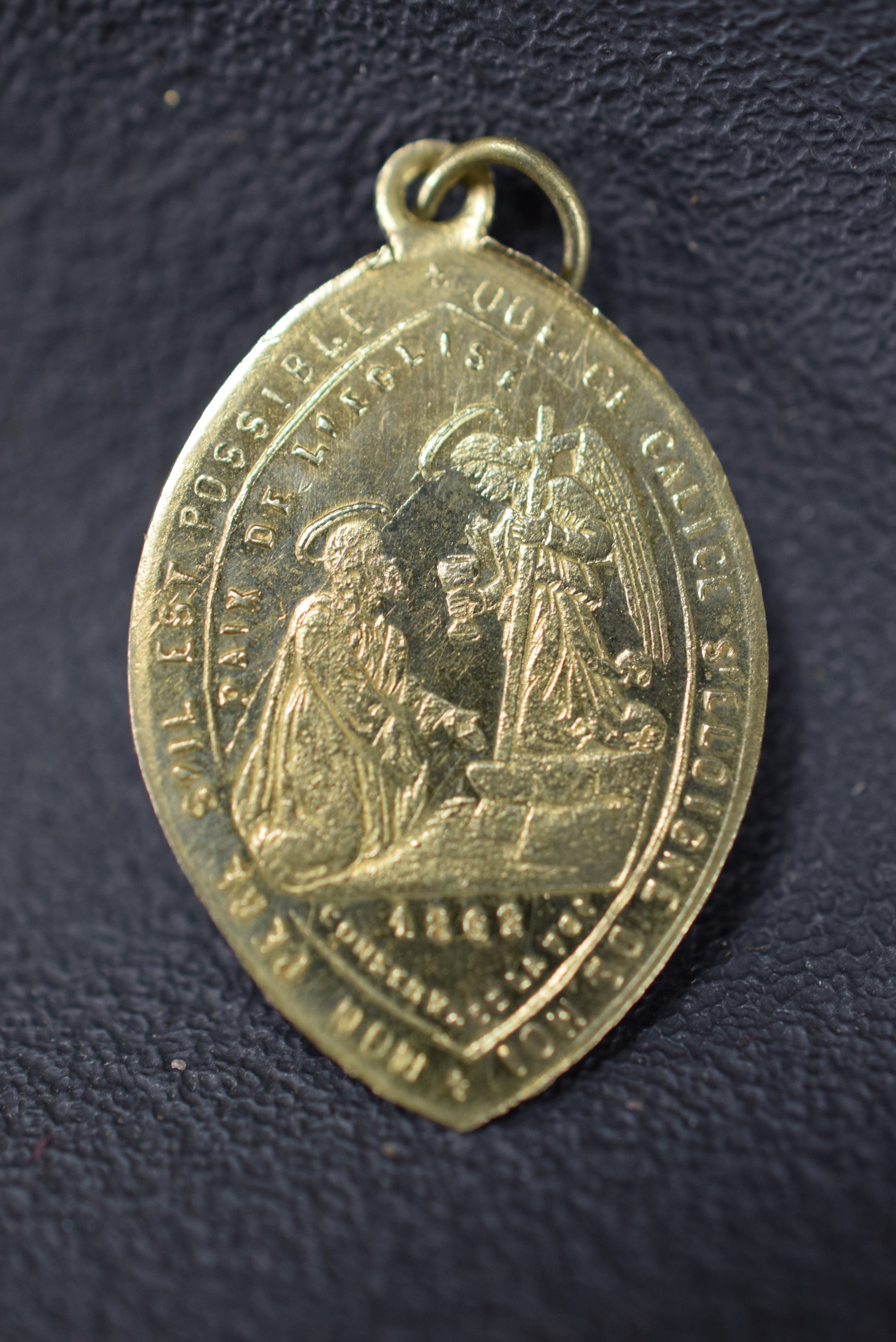 Une rare médaille du XIXe siècle représentant Mater Dolorosa. Le revers représente Jésus-Christ devant un ange tenant un calice. Ce pendentif inhabituel en laiton a été daté de 1862. Il affiche les mots suivants :
