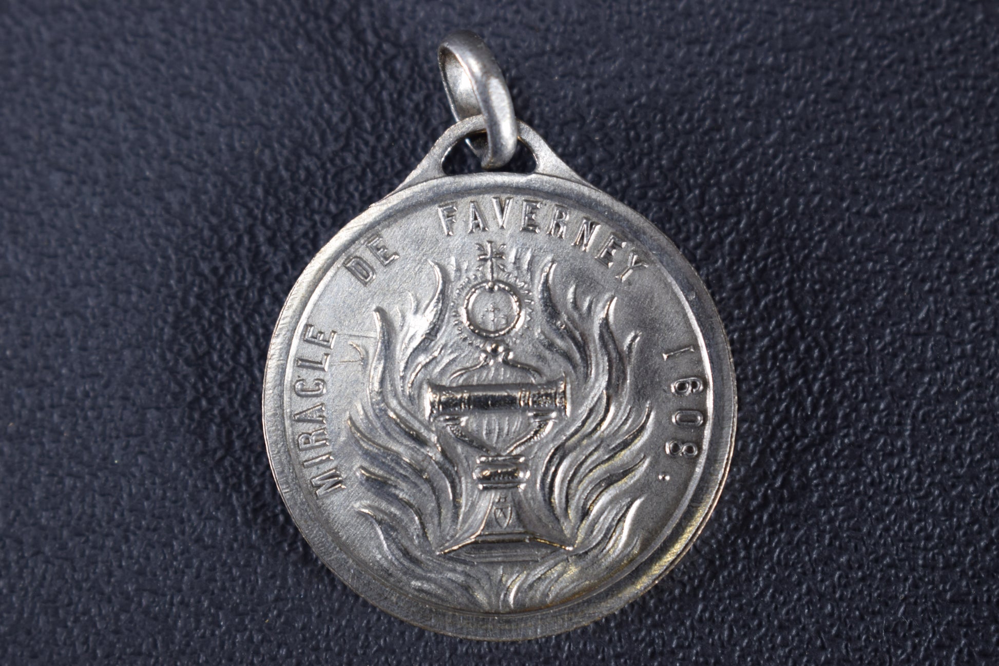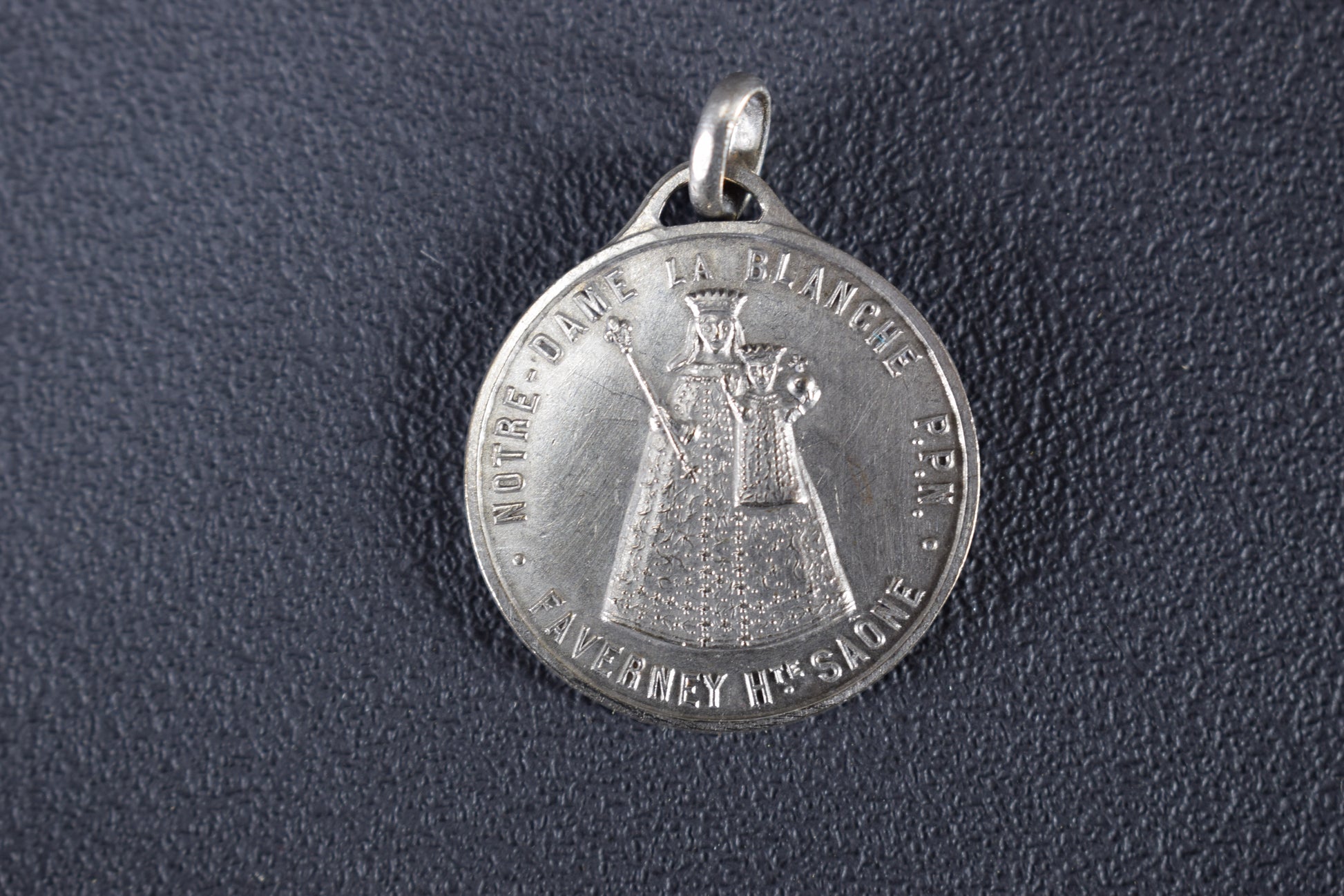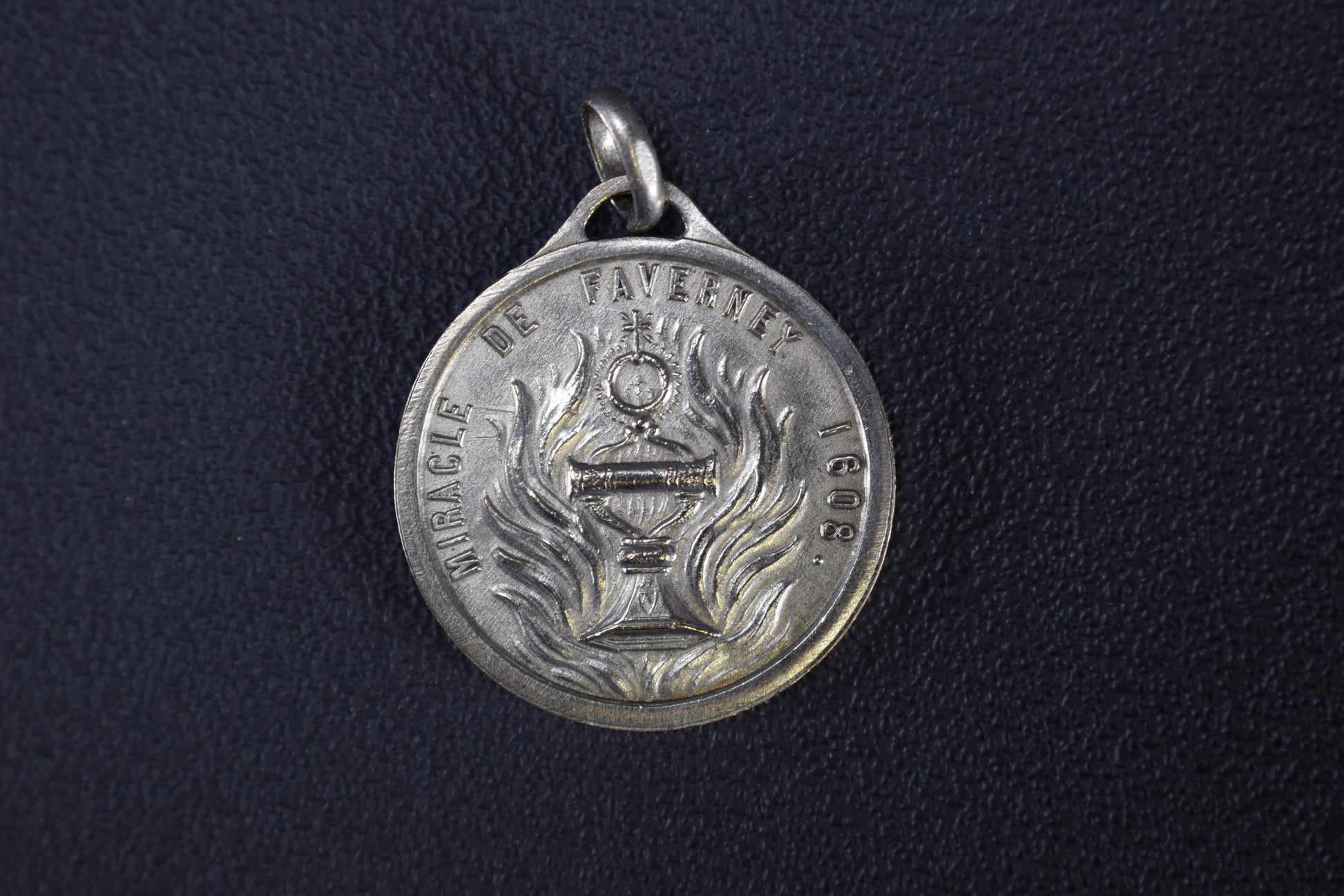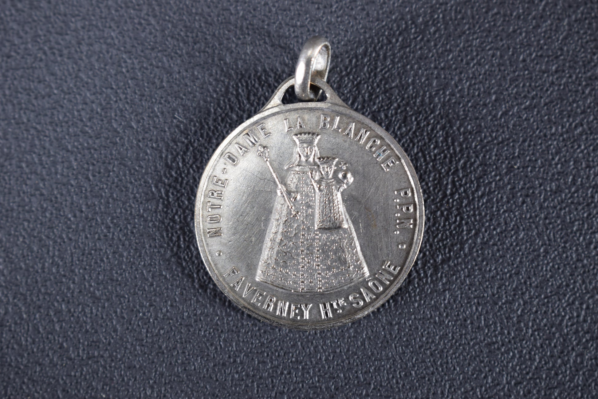 Une médaille vintage française du 20ème siècle. Le joli pendentif plaqué argent représente la Bienheureuse Marie dans le rôle de Notre Dame la Blanche (Notre Dame la Blanche). Le revers représente le reliquaire de l'abbaye de Faverney. Le miracle de Faverney est un miracle eucharistique, qui se serait produit les 26 et 27 mai 1608, au lendemain de la Pentecôte et le lendemain, dans l'église abbatiale de l'abbaye de Faverney, située dans l'ancien comté de Bourgogne, aujourd'hui en le département de la Haute-Saône. Un ostensoir, contenant deux hosties consacrées à la veille de la Pentecôte, serait resté suspendu dans les airs pendant 33 heures, avant de redescendre sur terre, devant un millier de témoins assistant à l'office. Bien que publié par l'archevêque de Besançon, Ferdinand de Rye, le 10 juillet 1608, le miracle ne fut officiellement reconnu par le Saint-Siège que le 16 mai 1864, par décision du pape Pie IX. La seule hostie ayant survécu à la Révolution est désormais exposée dans son ostension-reliquaire chaque lundi de Pentecôte dans l'église abbatiale.