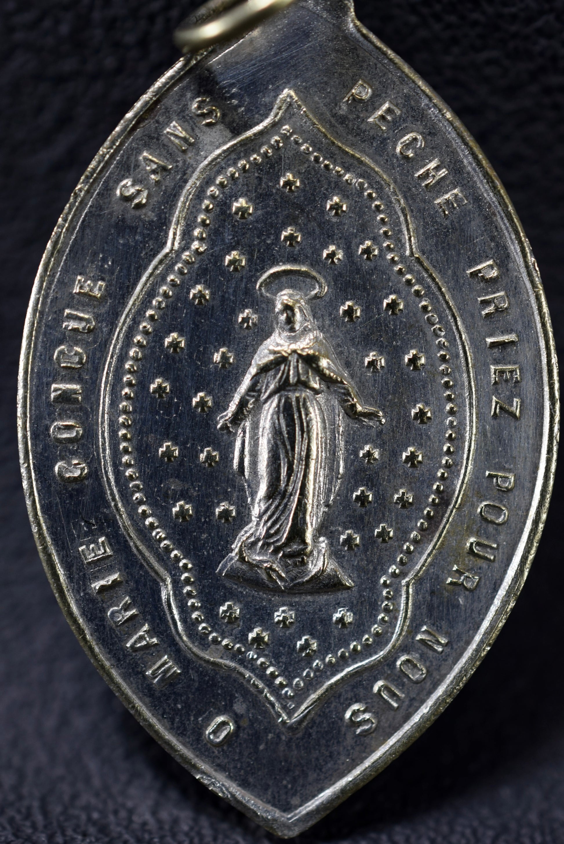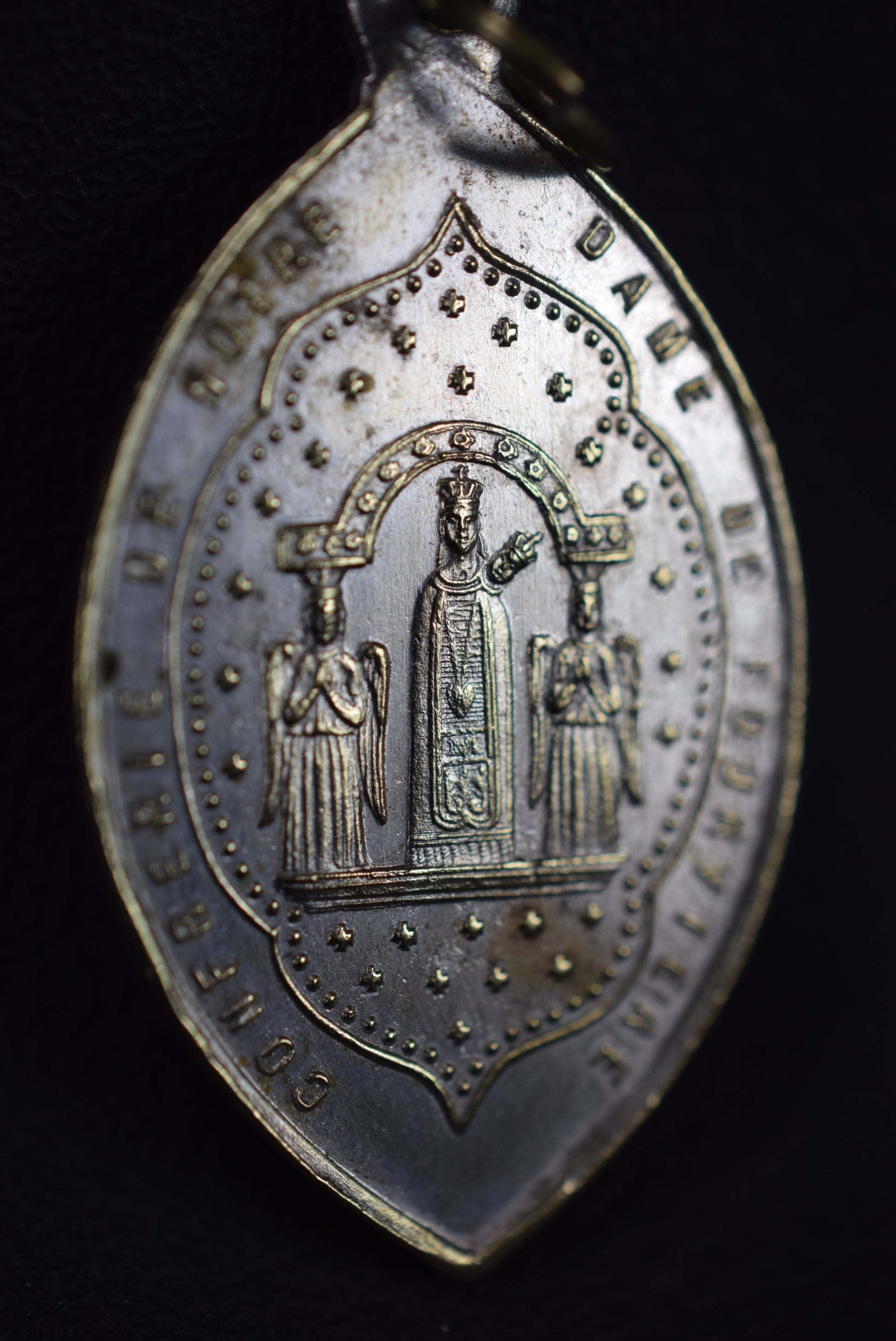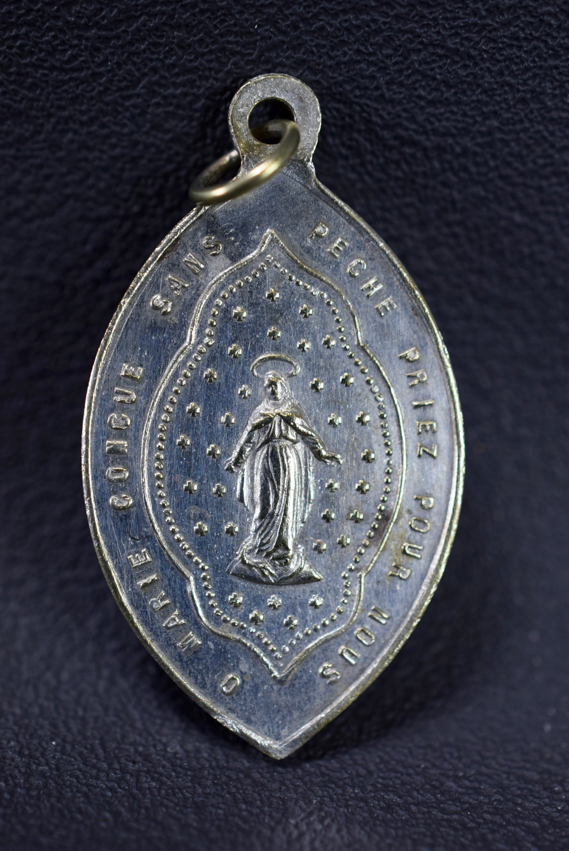Une médaille religieuse française datant de la fin du 19ème siècle. Le pendentif en métal argenté représente finement Notre-Dame de Fourvière, gardienne de la ville de Lyon (France). Couvent Notre-Dame de Fourvière. L'autre face représente Marie, conception immaculée.