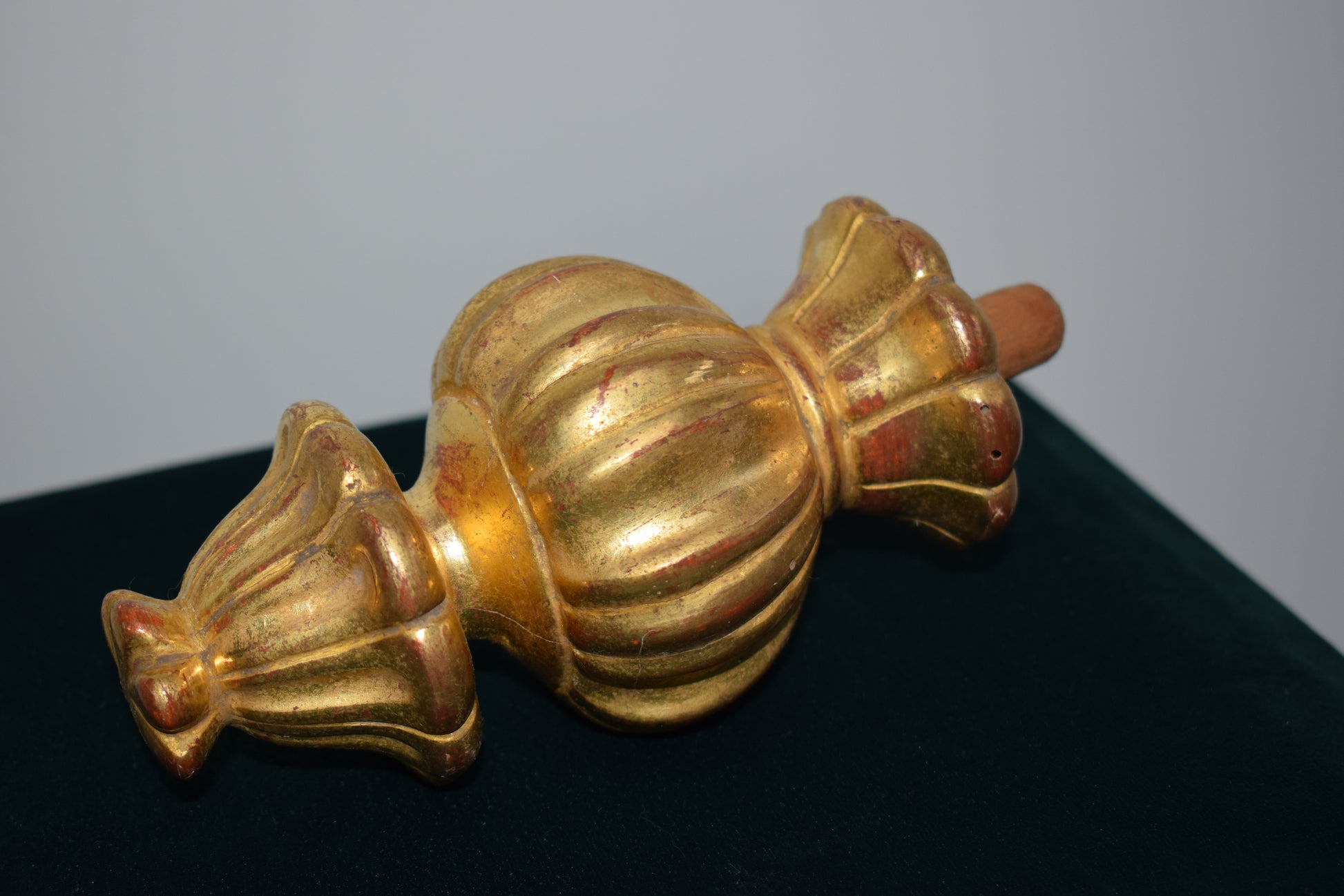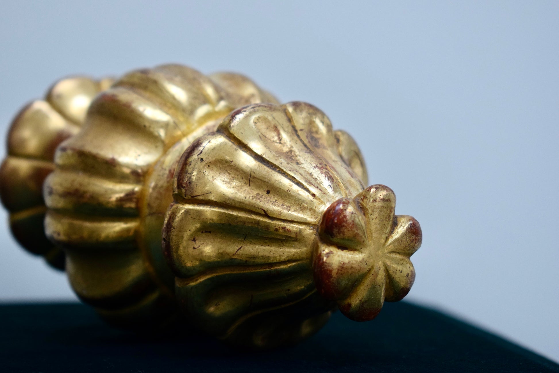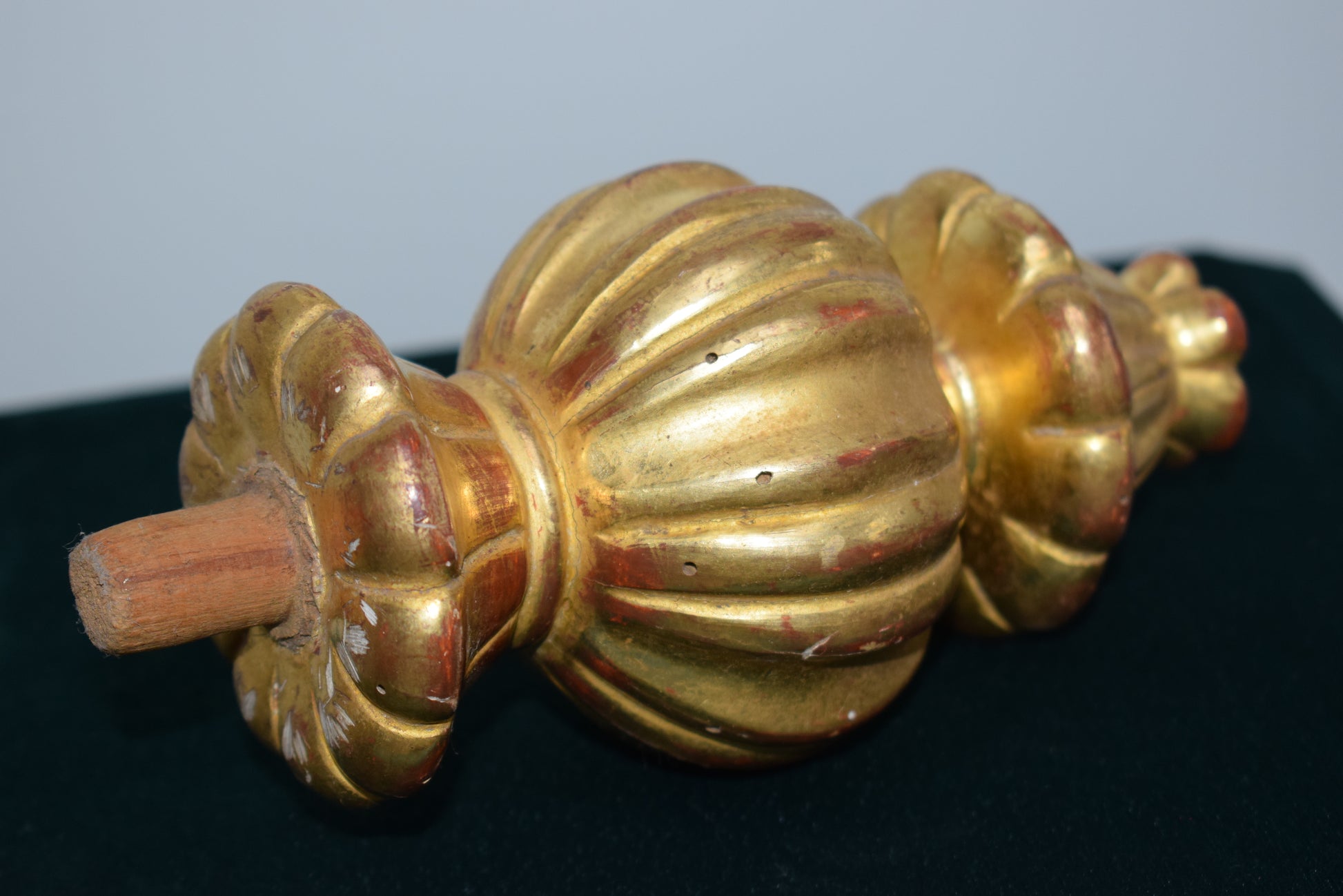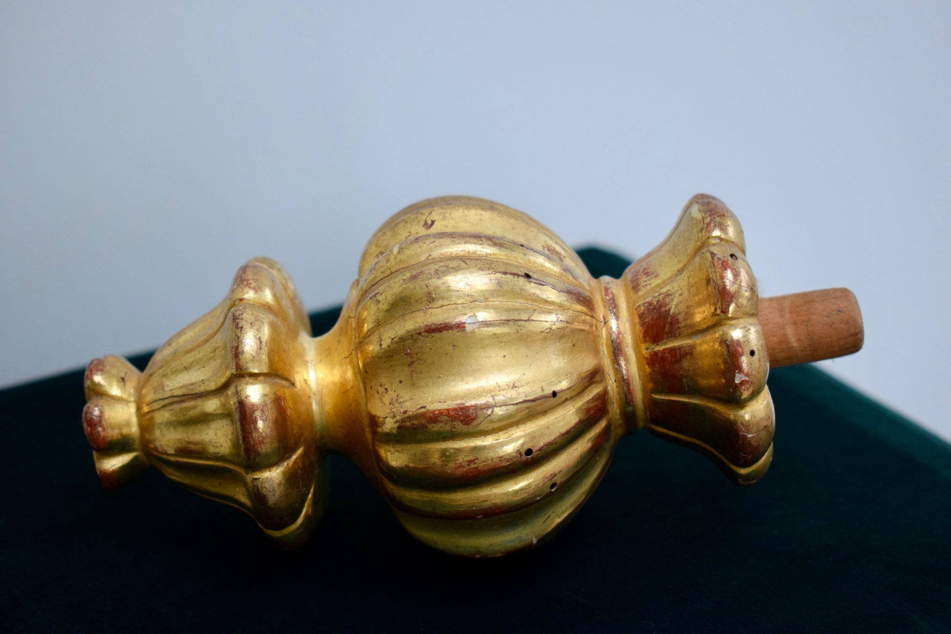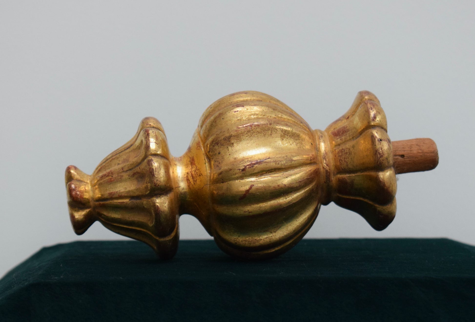 Il s'agit d'un superbe embout de poteau d'escalier/embout de meuble/embout de tringle à rideau en bois doré, datant du milieu du 19ème siècle, vers 1850. Design élégant et somptueux qui apportera une touche de château français. Ce fleuron tourné à la main pourrait être utilisé au sommet d’un poteau au pied d’un escalier.