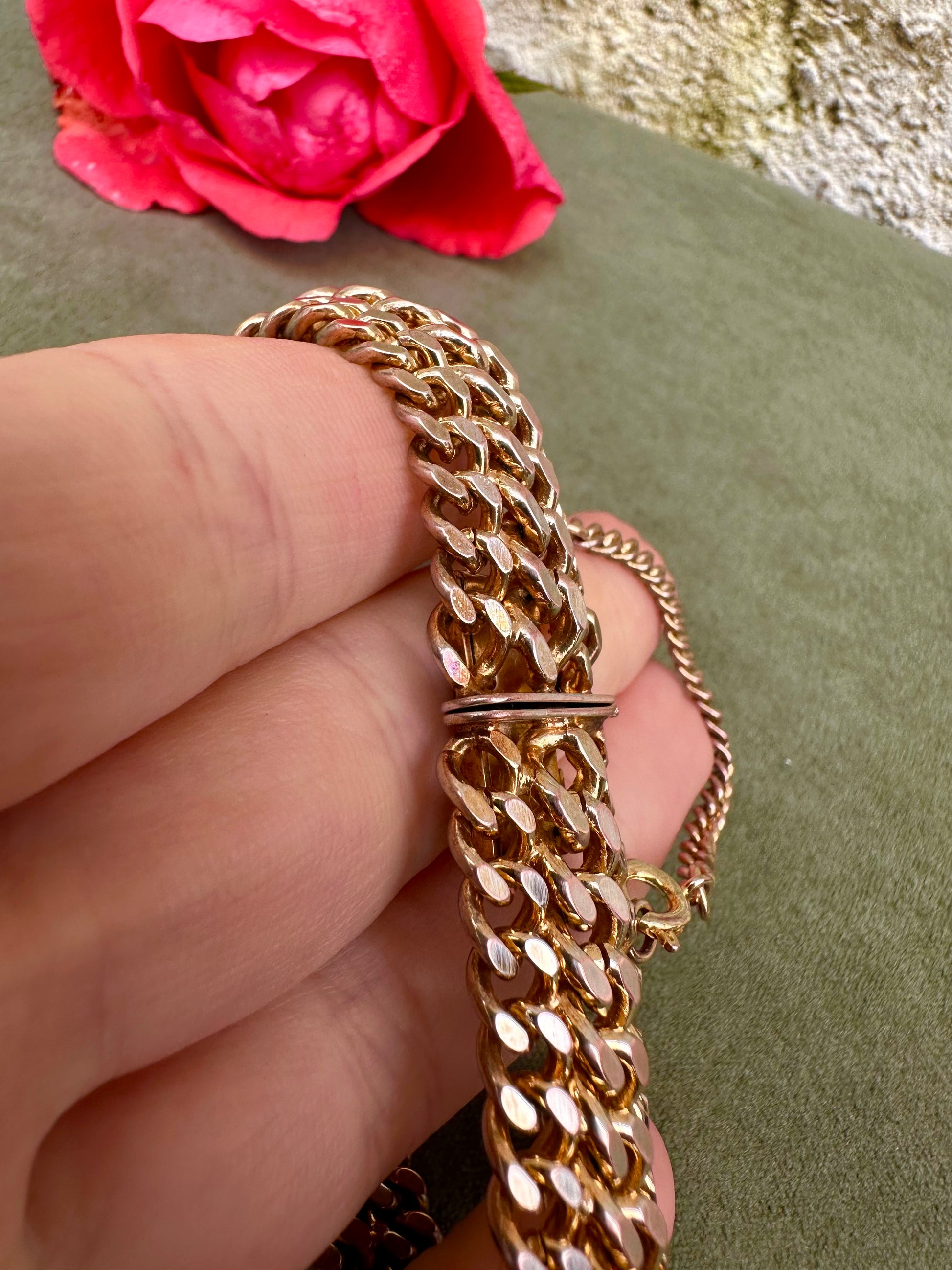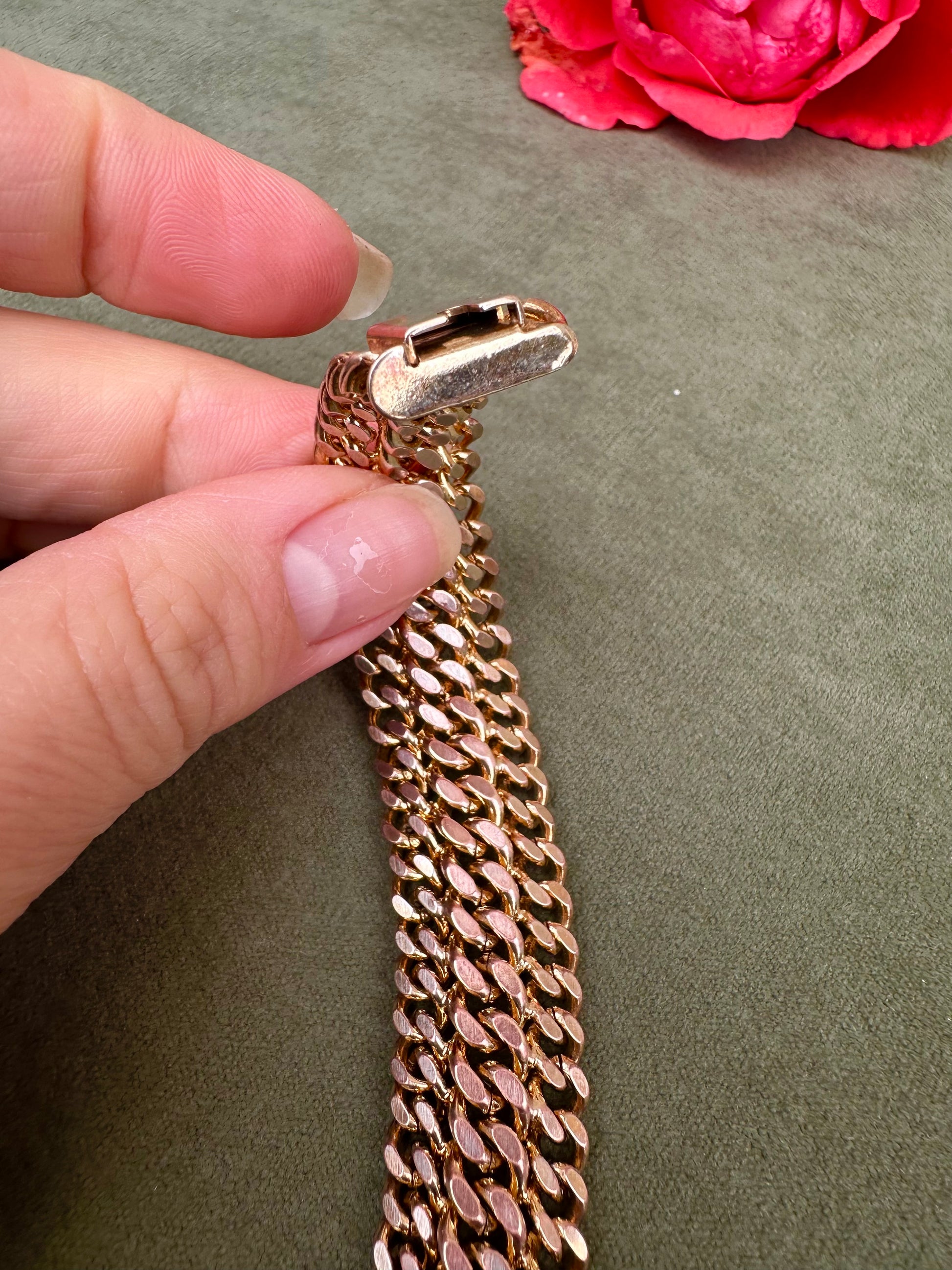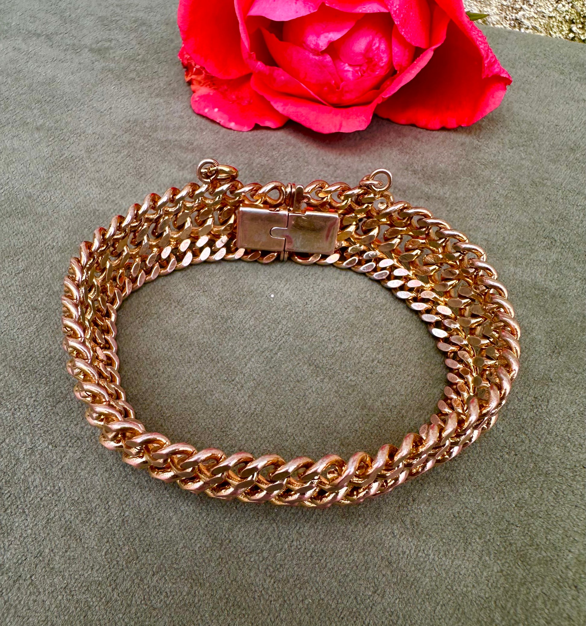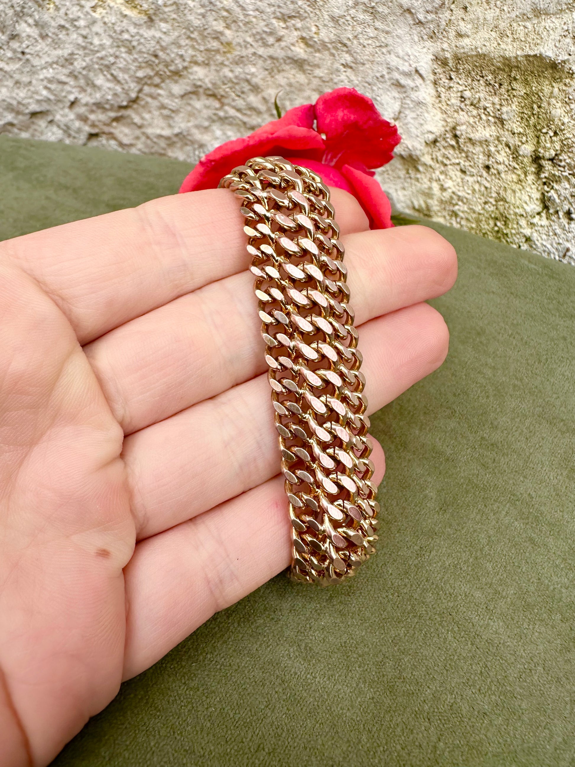 This vintage French mid-century curb link chain bracelet from the 1950s is a sophisticated piece of jewelry that epitomizes timeless elegance. Made from high-quality gold-filled metal, it features three parallel curb link chains that come together to create a width of 5/8 inches, giving it a substantial, luxurious feel. The links are smooth and polished, catching the light beautifully while remaining understated and versatile—ideal for daily wear or special occasions. This bracelet’s classic design makes it a thoughtful gift for him or her, combining mid-century style with a quality that endures.