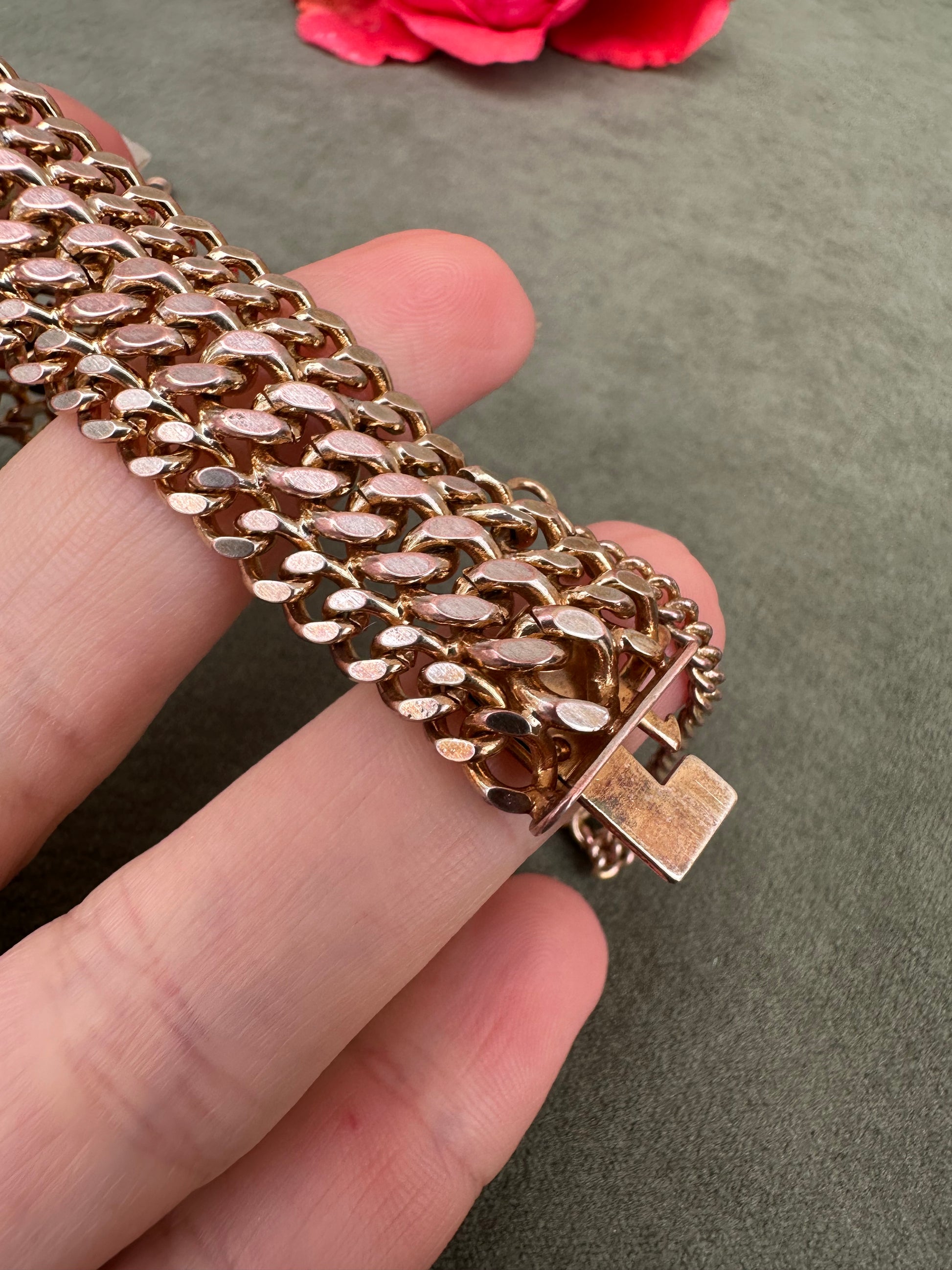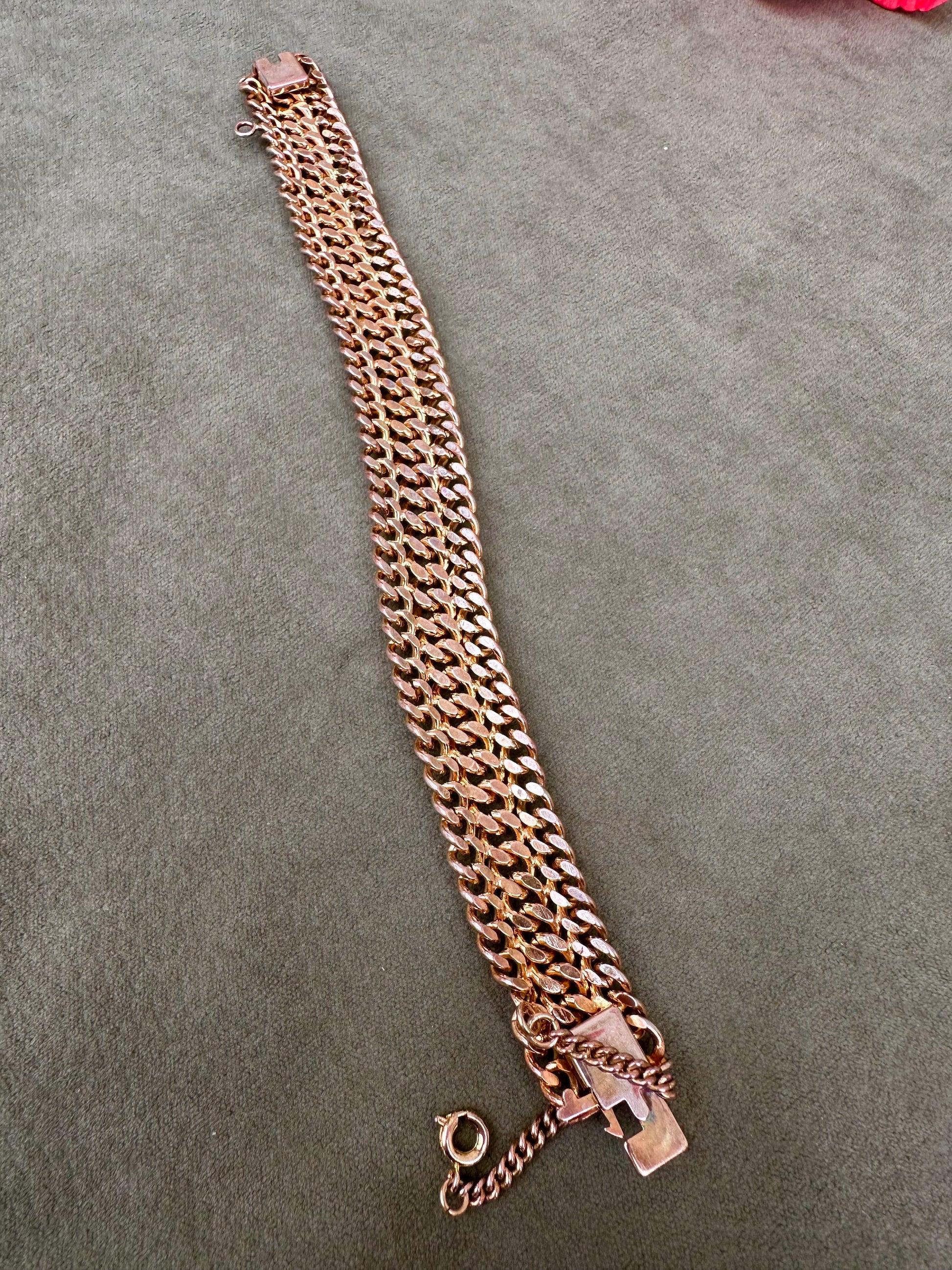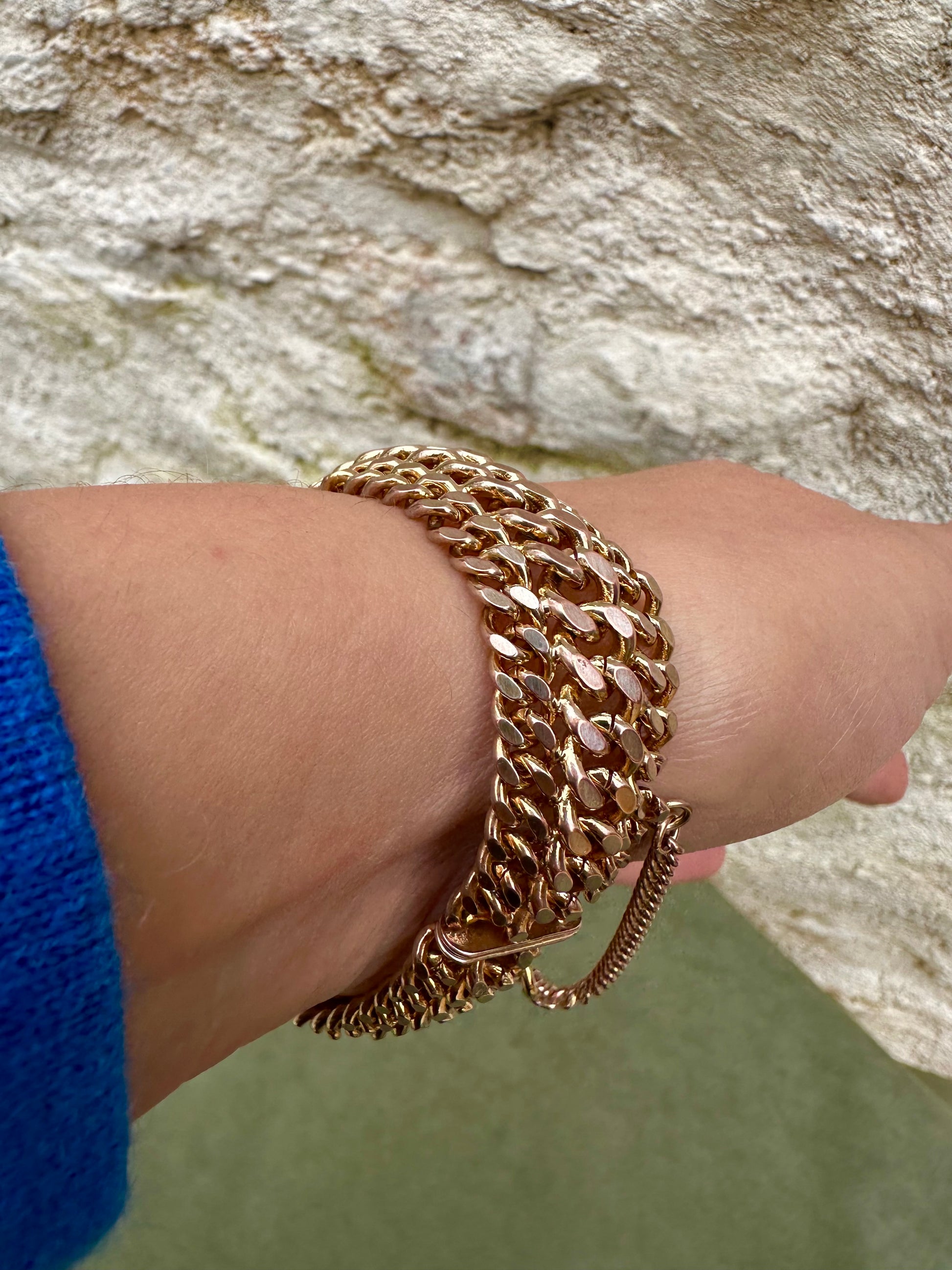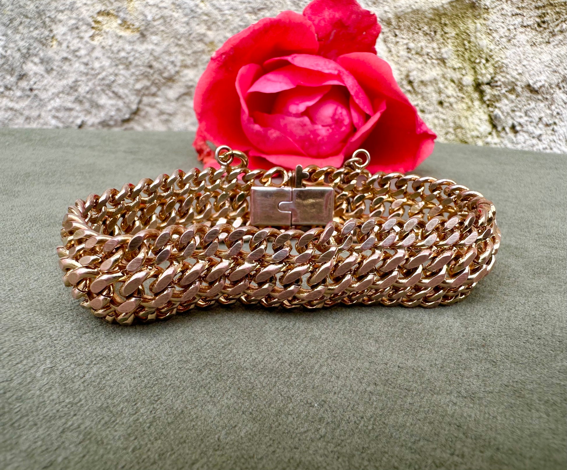 This vintage French mid-century curb link chain bracelet from the 1950s is a sophisticated piece of jewelry that epitomizes timeless elegance. Made from high-quality gold-filled metal, it features three parallel curb link chains that come together to create a width of 5/8 inches, giving it a substantial, luxurious feel. The links are smooth and polished, catching the light beautifully while remaining understated and versatile—ideal for daily wear or special occasions. This bracelet’s classic design makes it a thoughtful gift for him or her, combining mid-century style with a quality that endures.