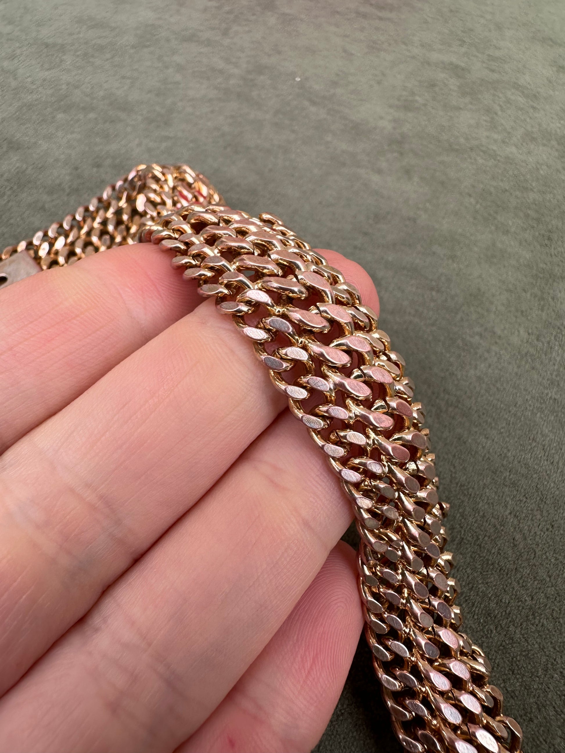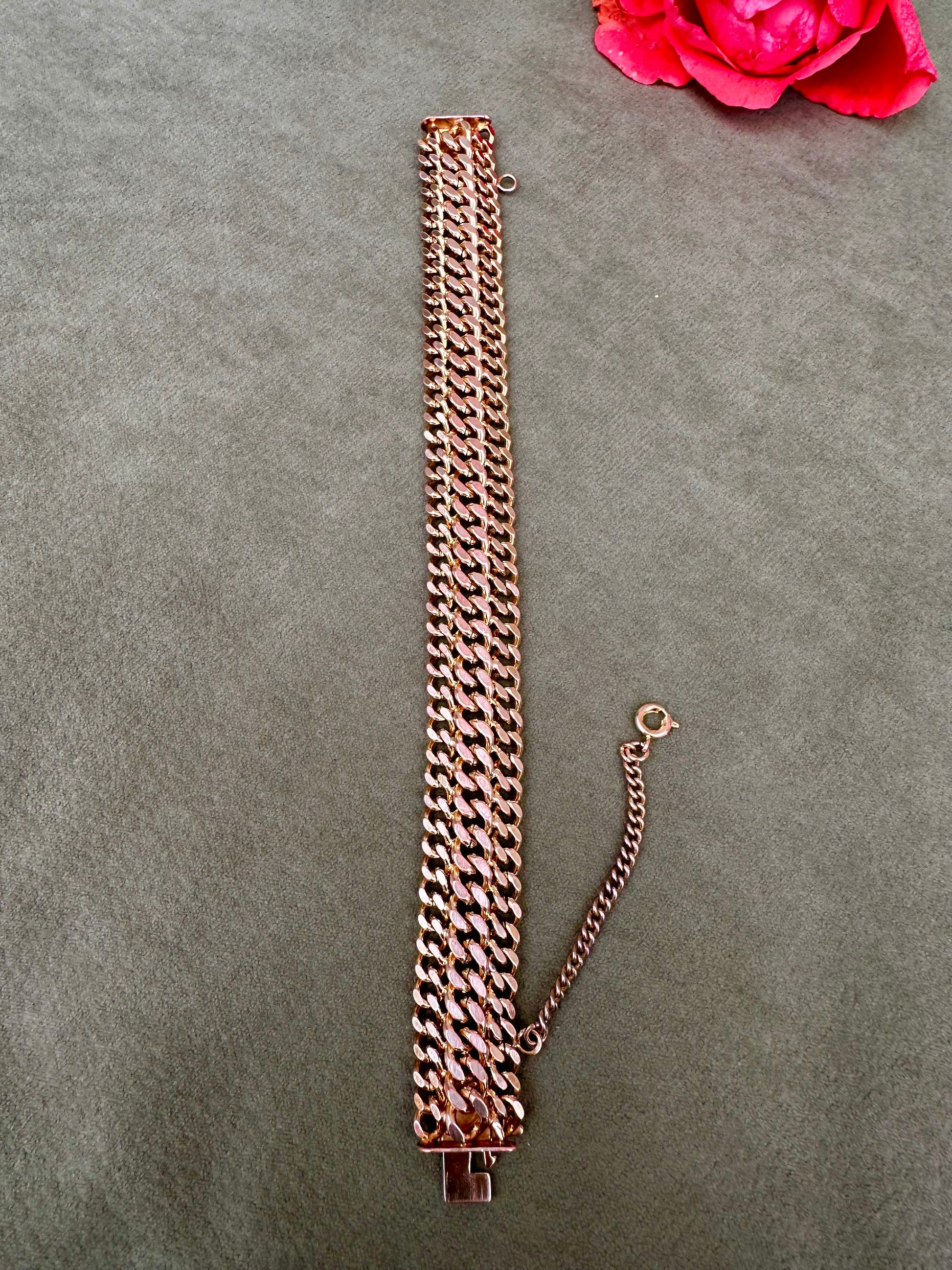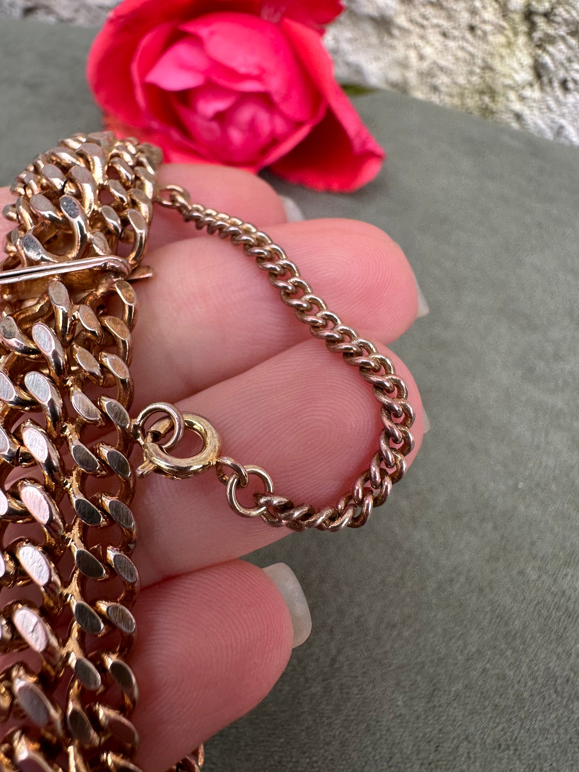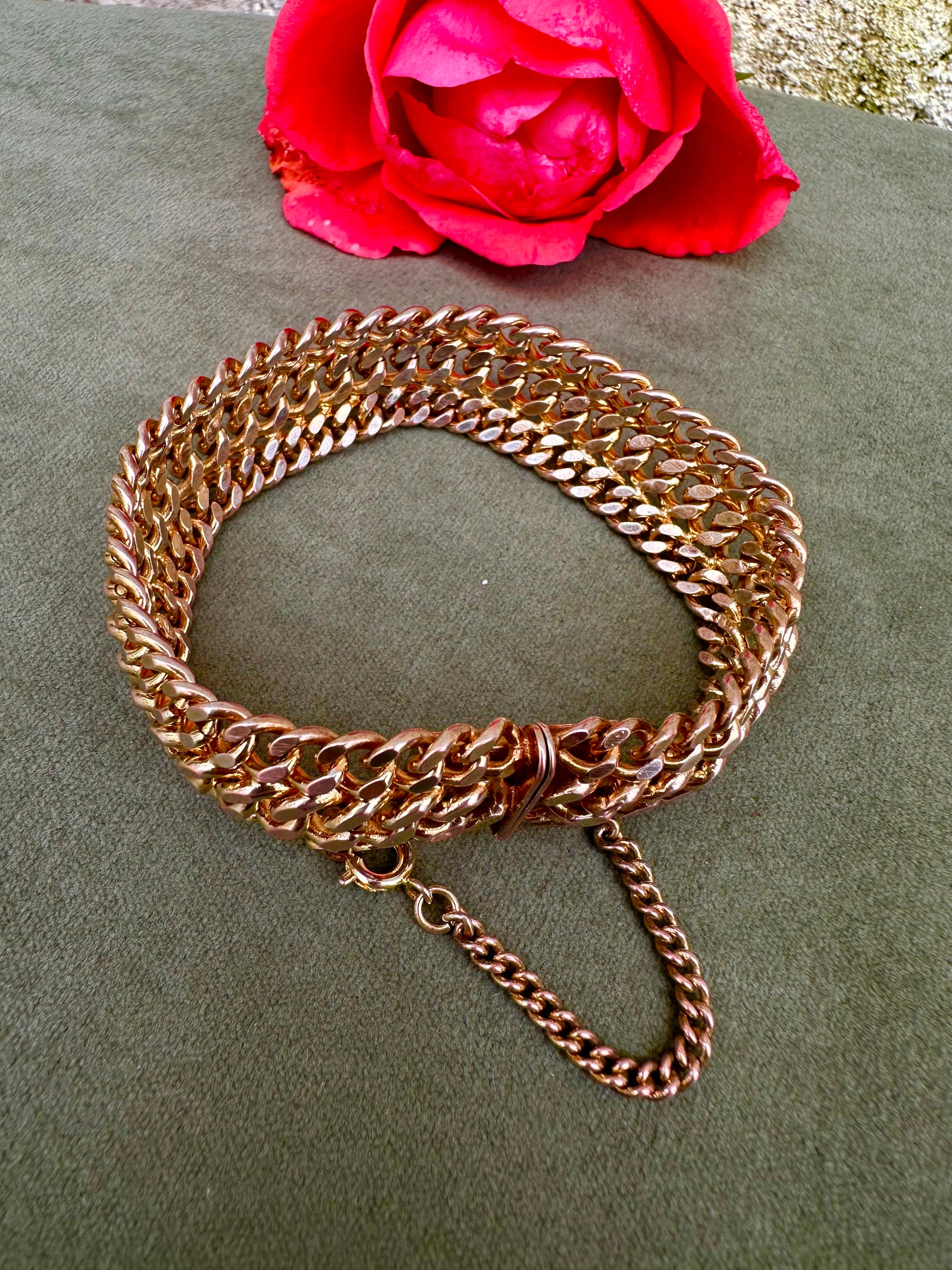 This vintage French mid-century curb link chain bracelet from the 1950s is a sophisticated piece of jewelry that epitomizes timeless elegance. Made from high-quality gold-filled metal, it features three parallel curb link chains that come together to create a width of 5/8 inches, giving it a substantial, luxurious feel. The links are smooth and polished, catching the light beautifully while remaining understated and versatile—ideal for daily wear or special occasions. This bracelet’s classic design makes it a thoughtful gift for him or her, combining mid-century style with a quality that endures.