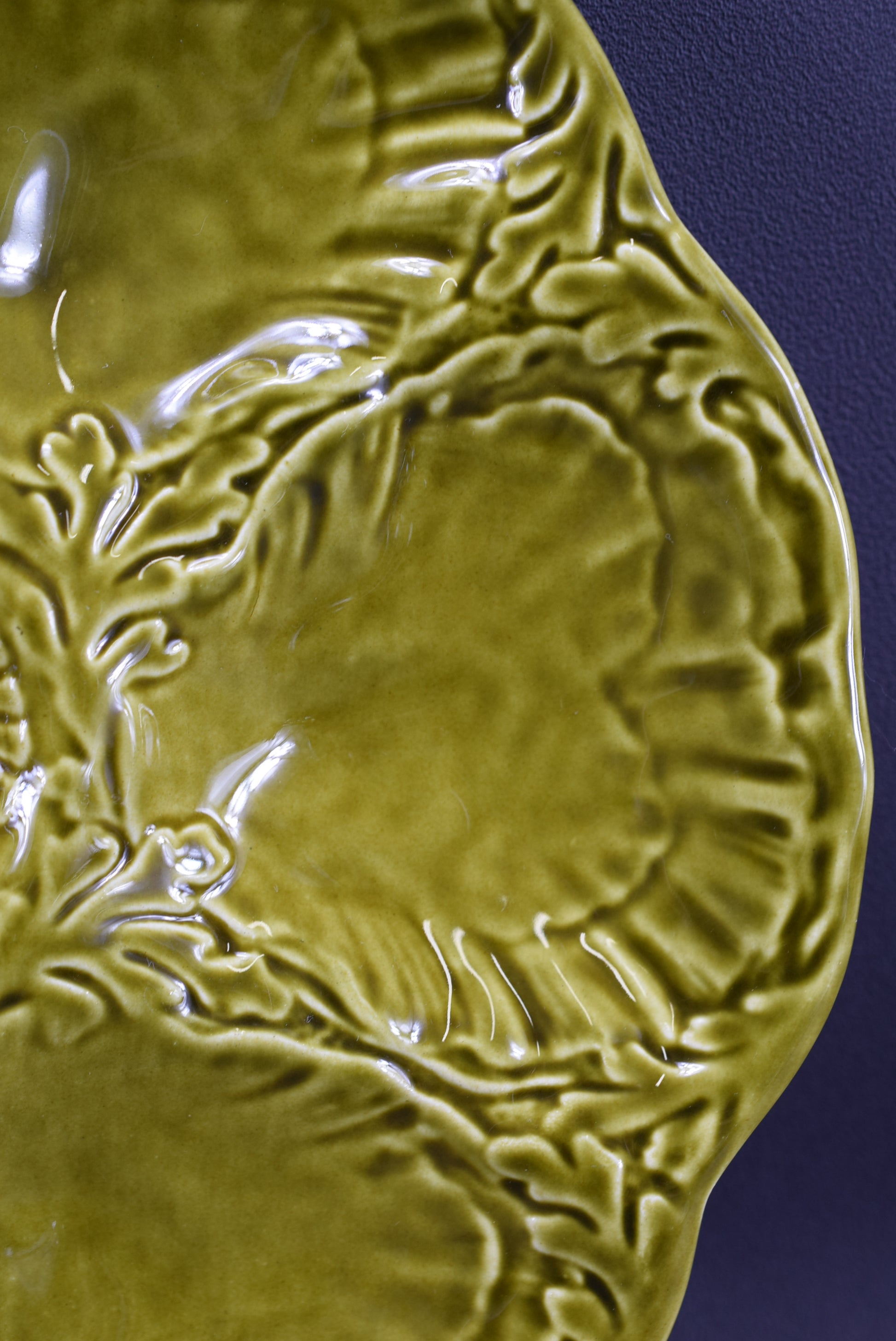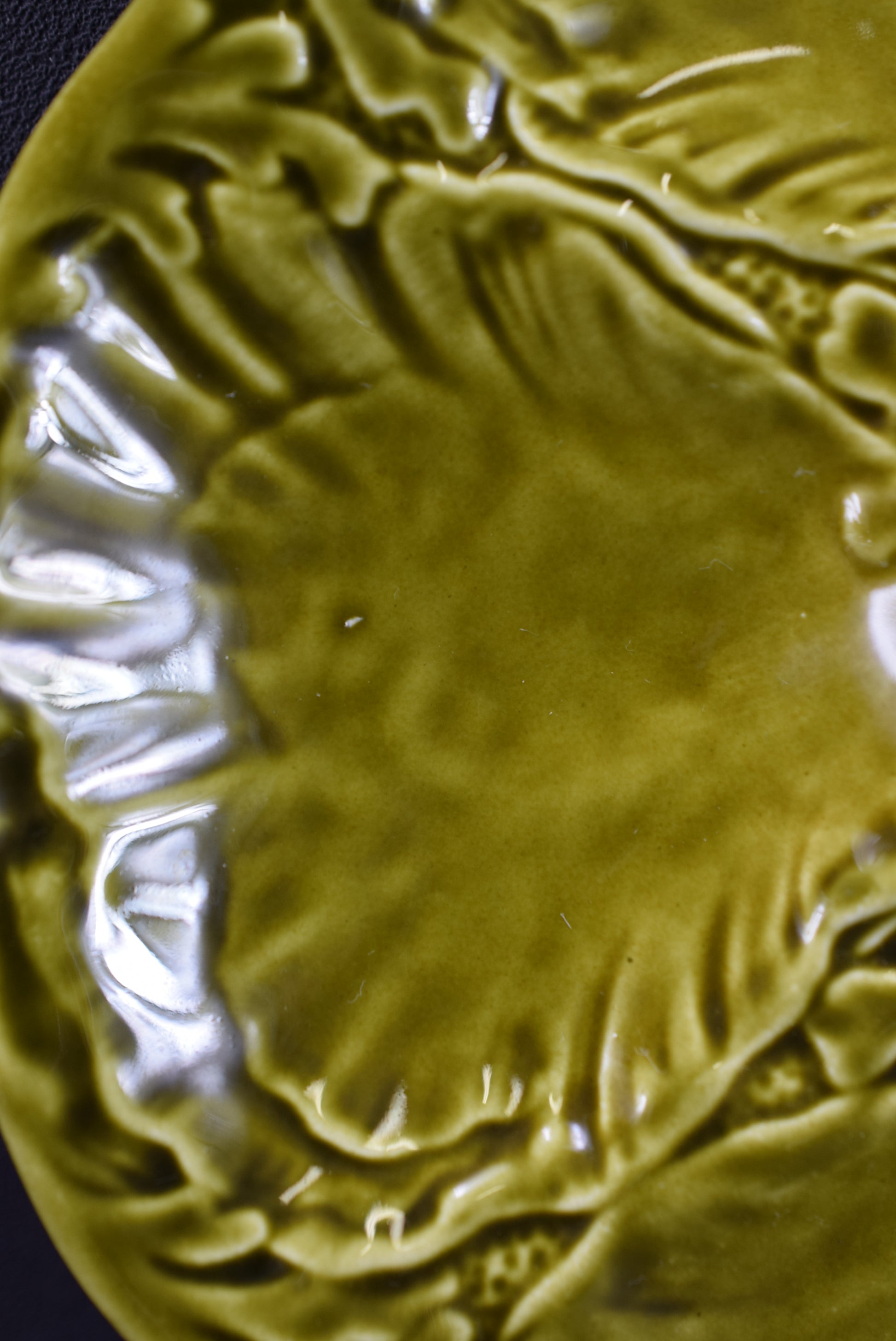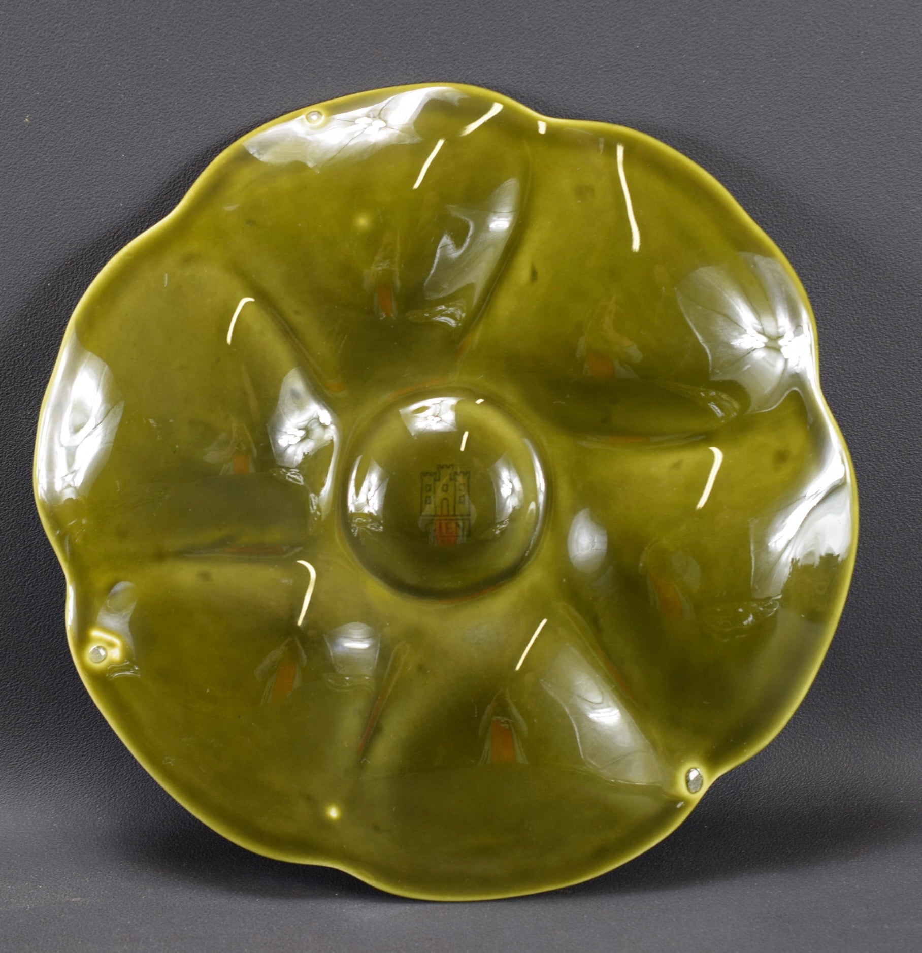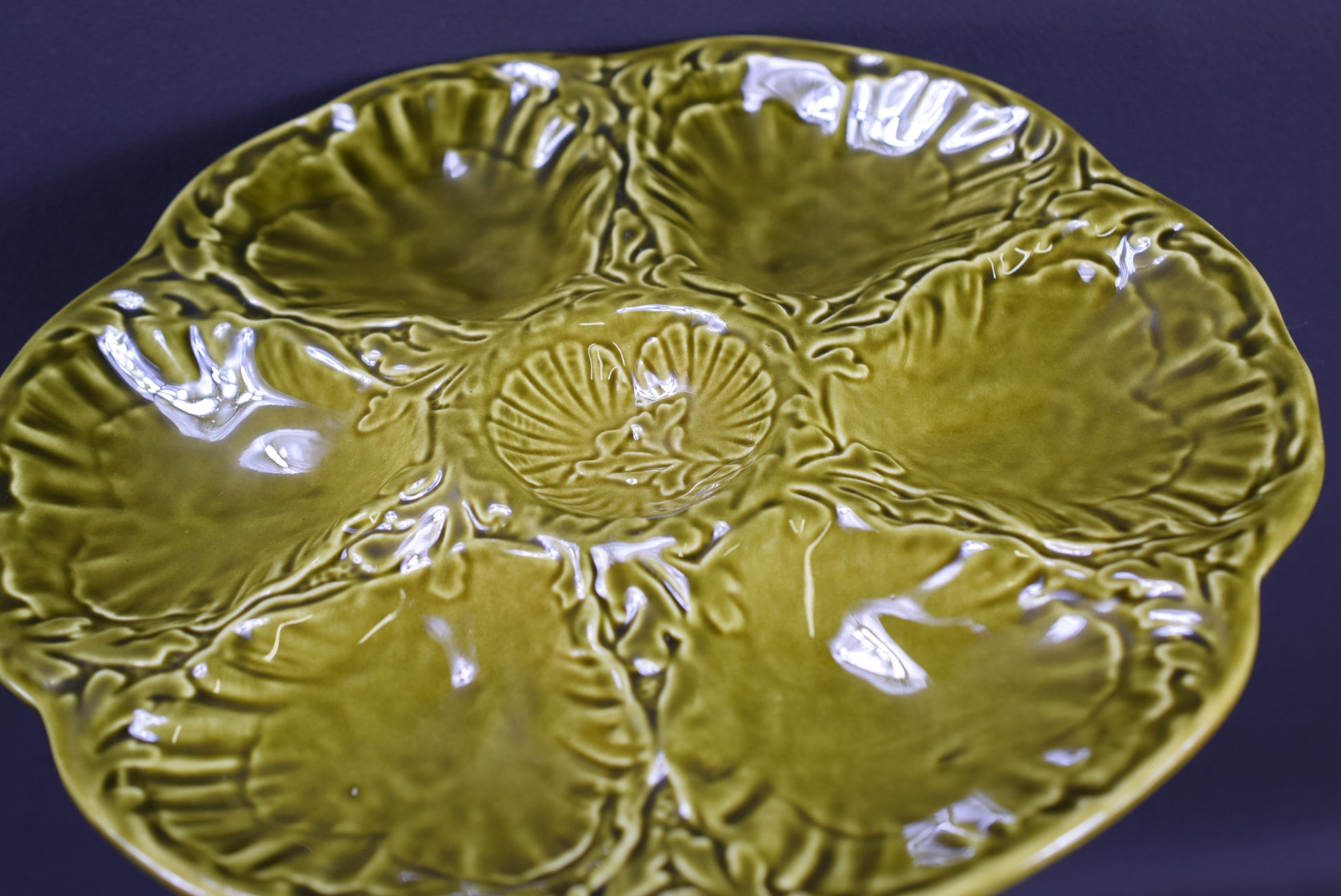 Une belle assiette de fruits de mer vintage française produite par Gien (France) dans les années 1960. L'assiette en majolique est composée de 6 compartiments coquilles en forme de coquille Saint-Jacques et un au milieu pour le citron. Le glaçage brillant vert clair est incroyable.