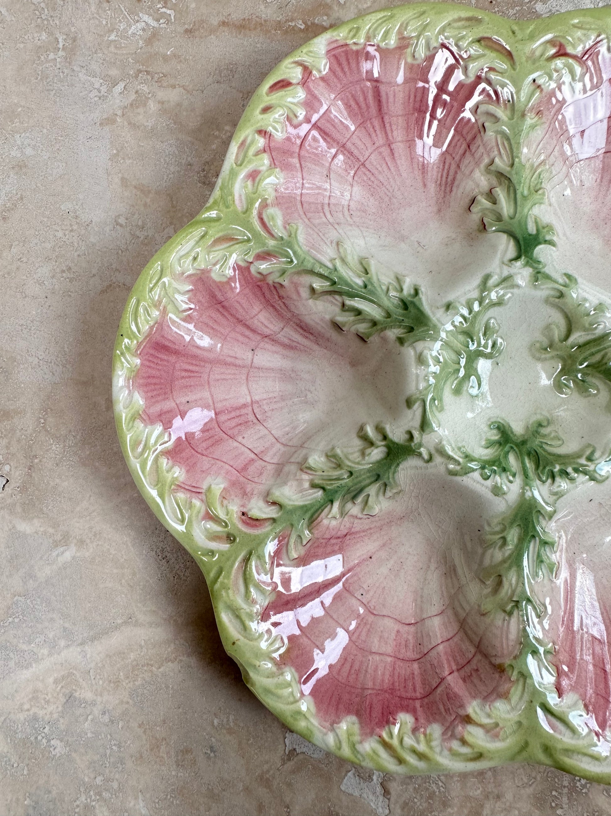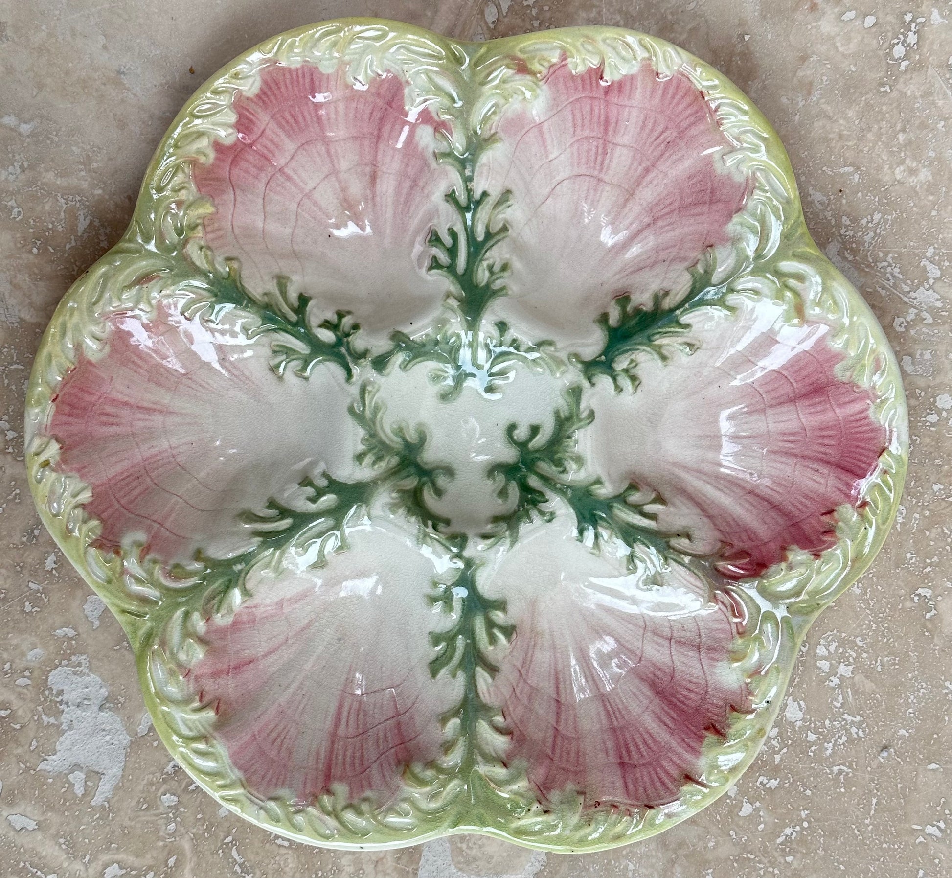 Une fabuleuse assiette de fruits de mer en majolique antique française datant de la fin du 19e siècle, vers 1890. Le décor rose représente des détails d'algues vertes entre chacun des six puits festonnés. Ce magnifique plat à huîtres a été réalisé par Keller & Guerin St Clément (non marqué).