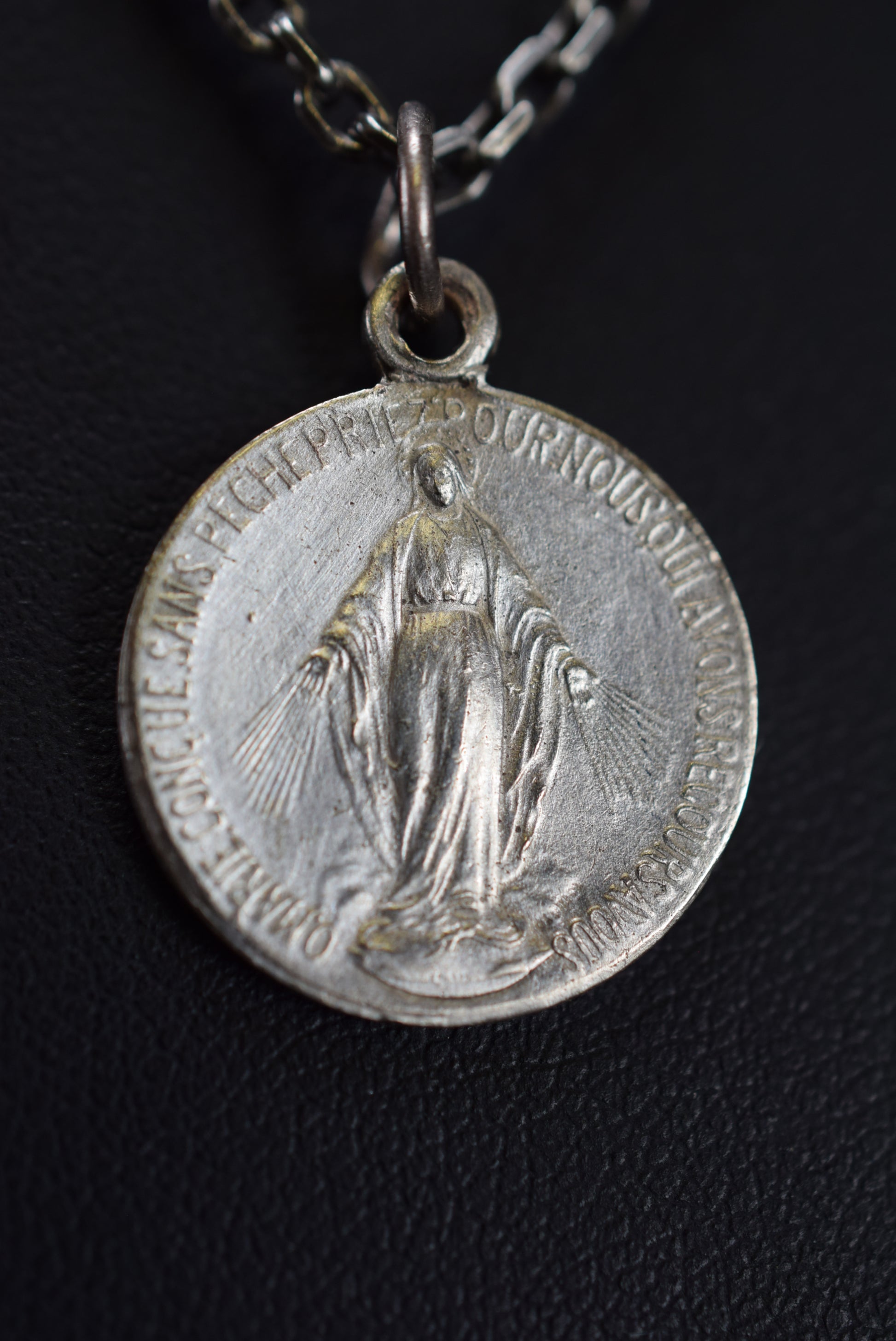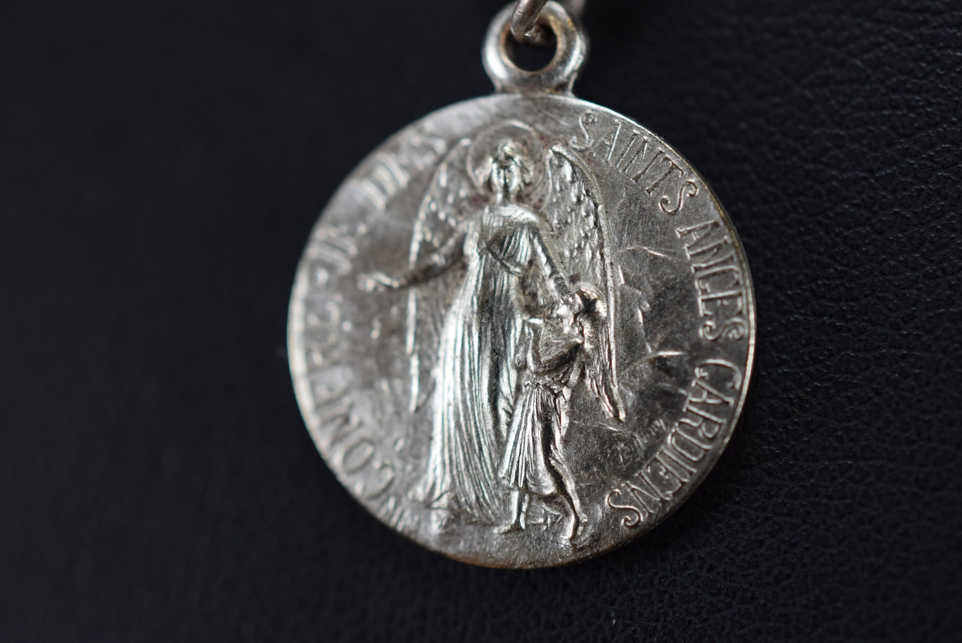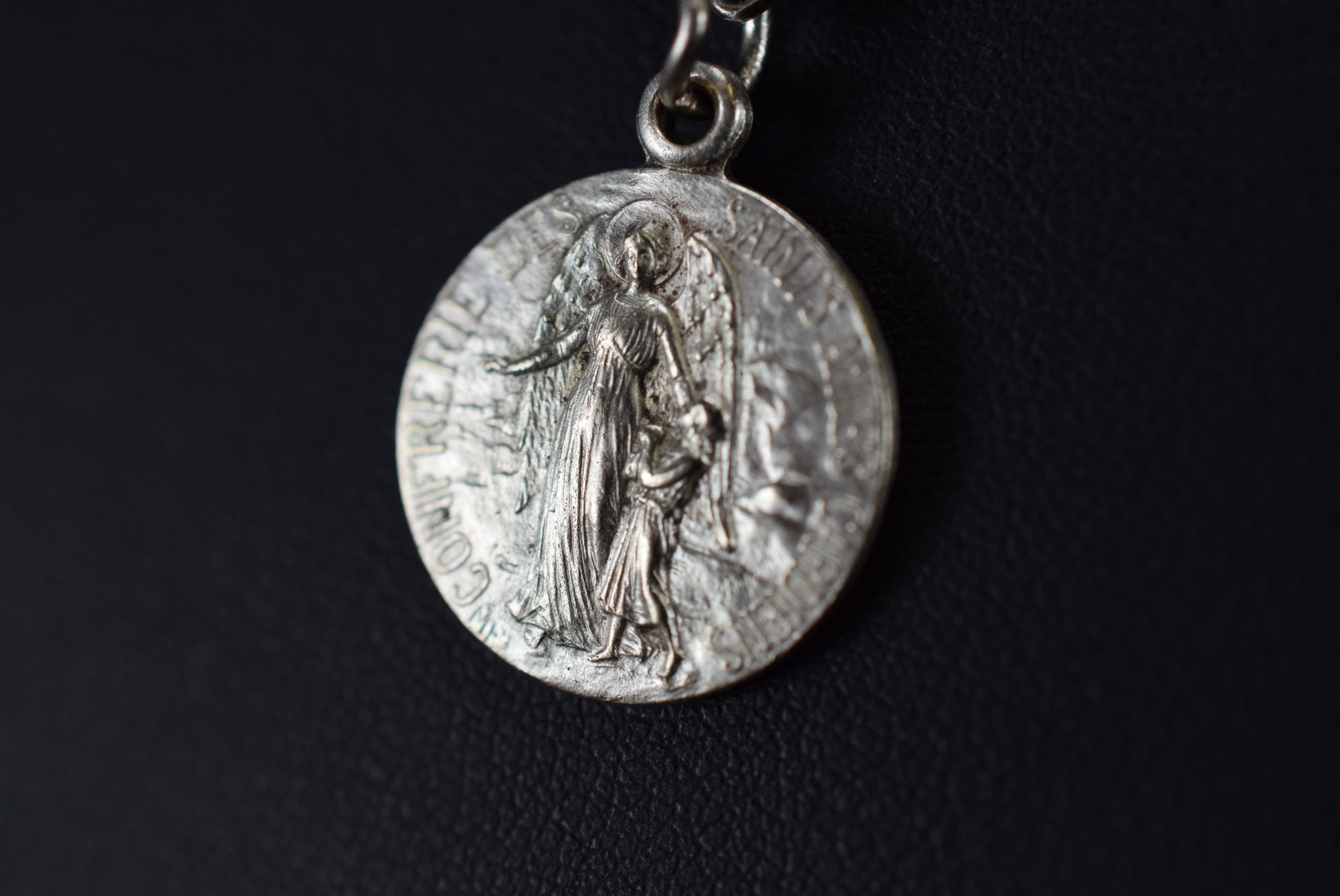 Un magnifique pendentif religieux français. La belle médaille représente un saint ange gardien avec un enfant. L'inscription sur le pourtour est en français « Confrérie des Saints Anges Gardiens » et se traduit par « Confrérie des Saints Anges Gardiens ».