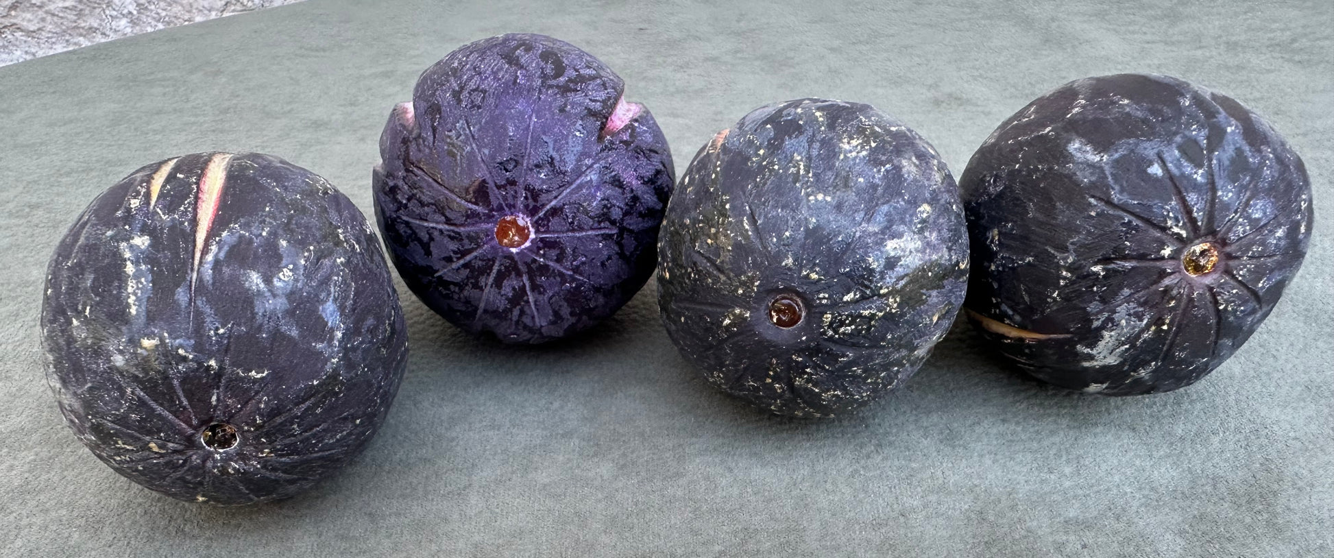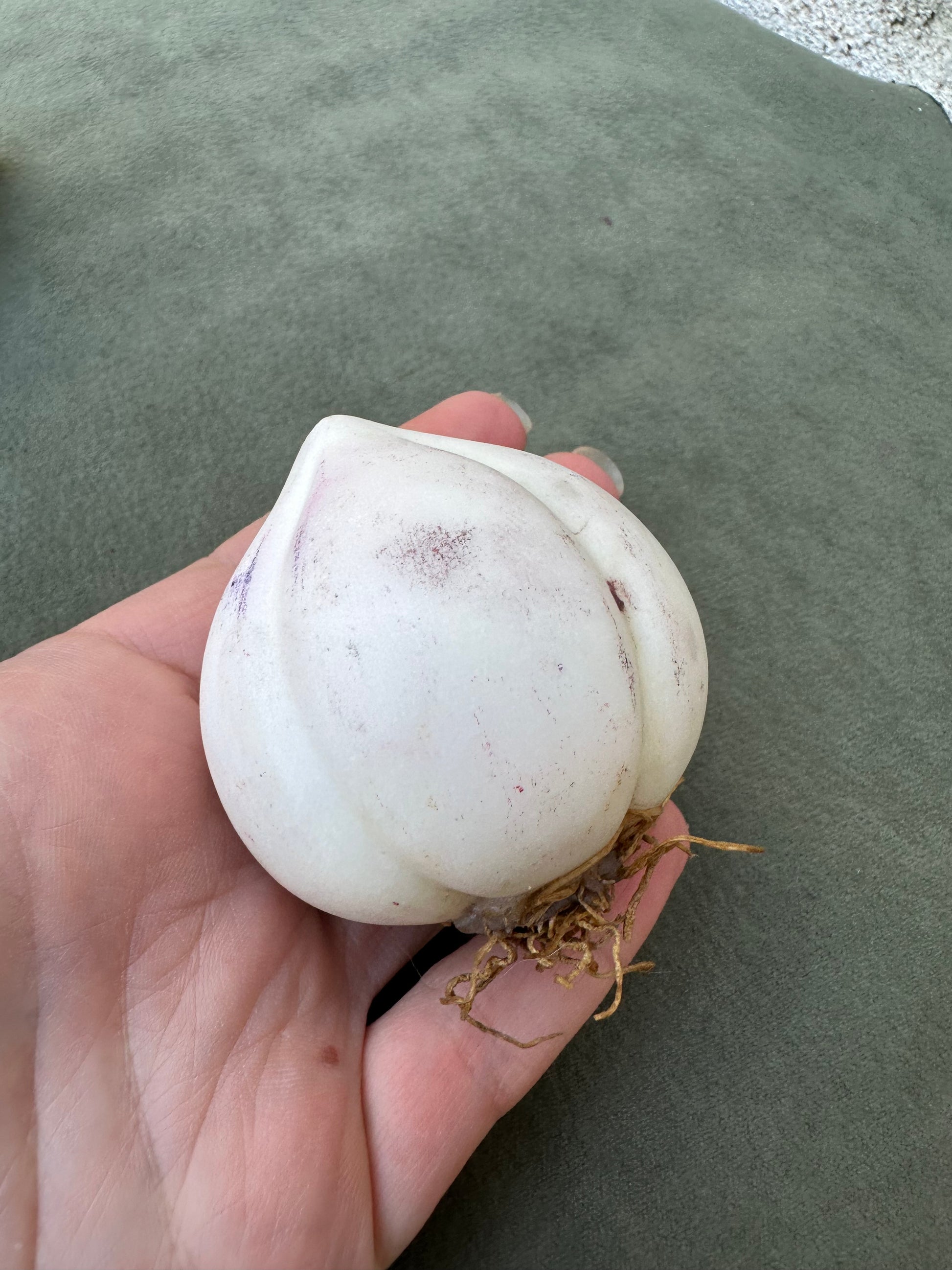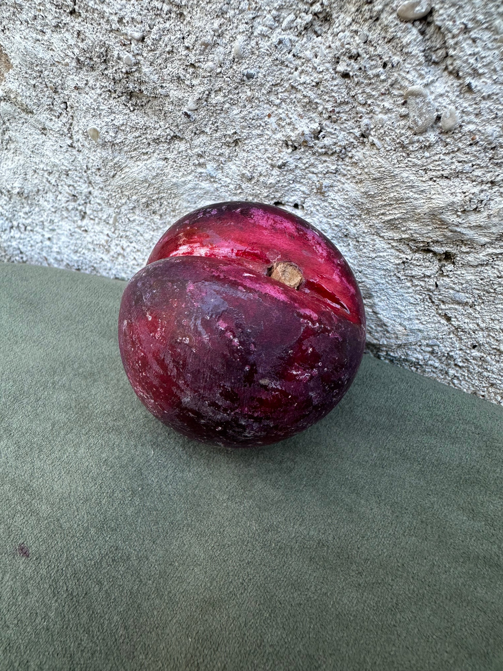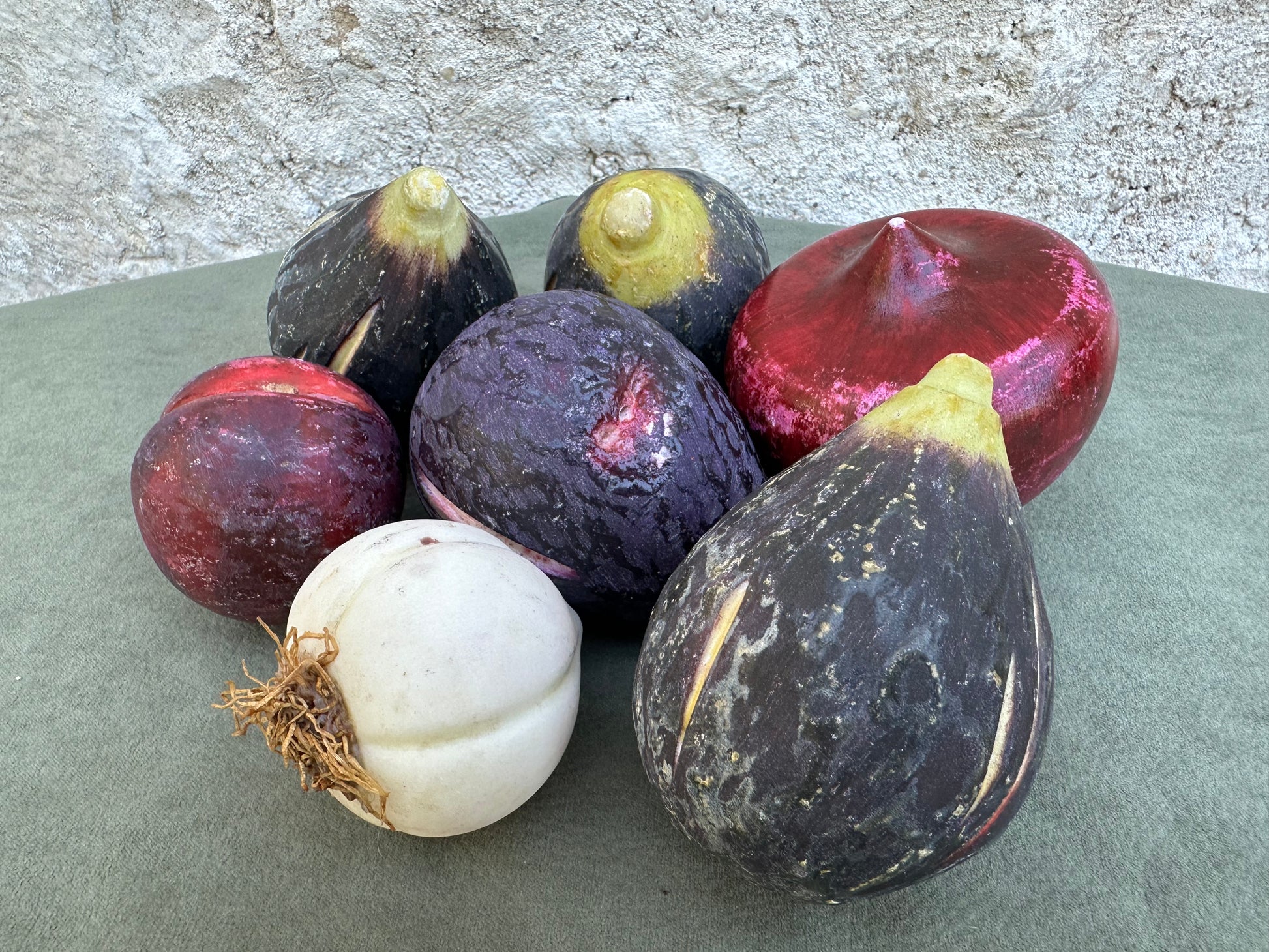 The Carrara marble, prized for its purity and fine grain, provides a refined foundation, while the hand-painted details add a rich, realistic touch. The subtle, natural hues of the paint enhance the vibrancy of the figs, the reddish-purple of the plum, and the soft sheen of the onion and garlic, capturing the freshness of the produce. This set reflects the Italian tradition of creating realistic still-life sculptures, blending both artistic finesse and the timeless elegance of marble. Ideal for collectors of fine art and antiques, this set embodies the beauty and craftsmanship of 19th-century Italian artistry. Would be perfect to add a Tuscan ambiance in your home.