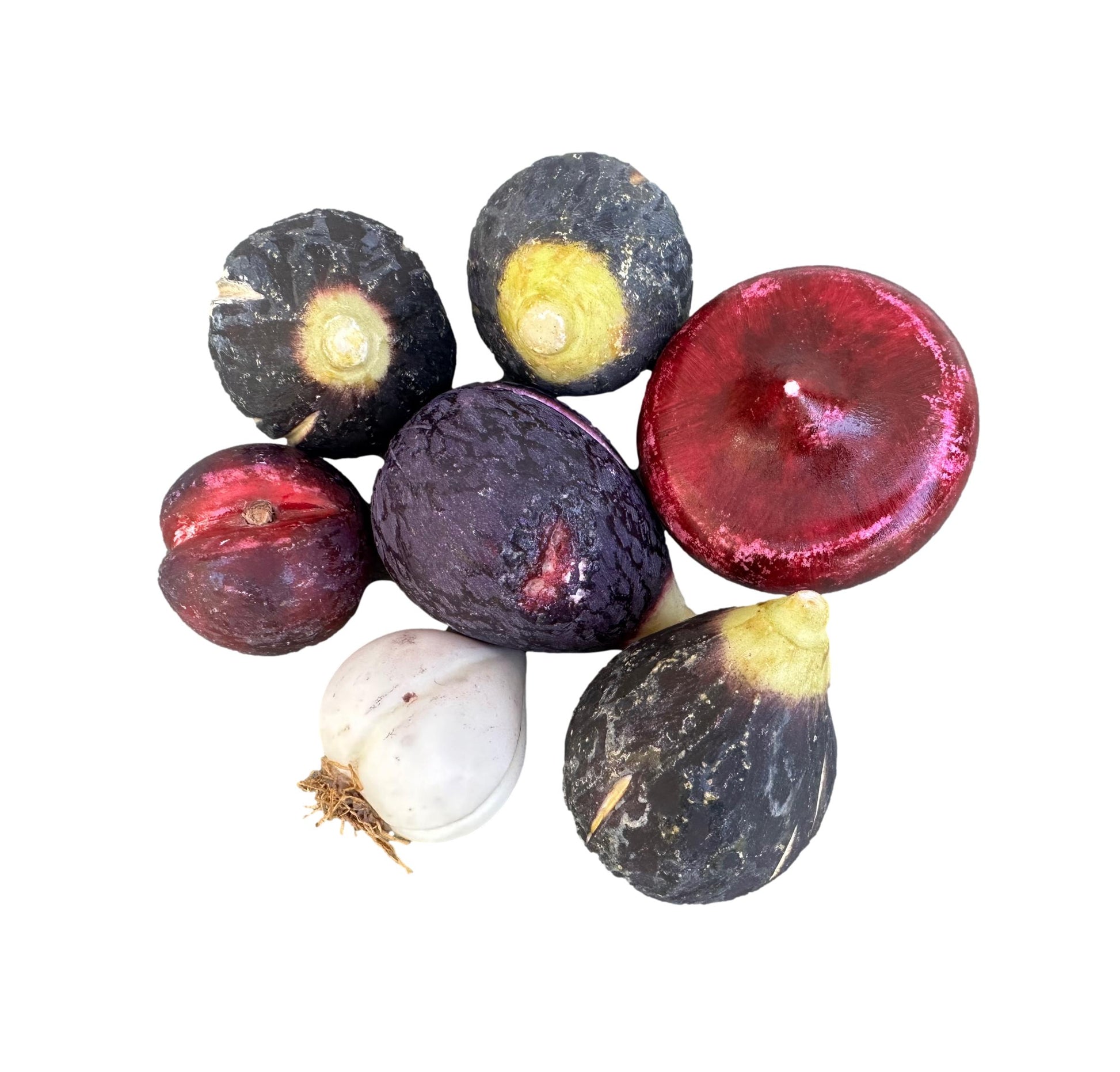 This Italian Antique Marble of Carrara Fruits and Vegetables set, dating back to the 19th century, is a stunning example of masterful craftsmanship in fine Carrara marble. The set features a beautifully carved and hand-painted selection of produce, including four figs, one garlic bulb, one red onion, and one plum. Each piece is meticulously rendered with lifelike precision, showcasing the natural textures and shapes of the fruits and vegetables.
