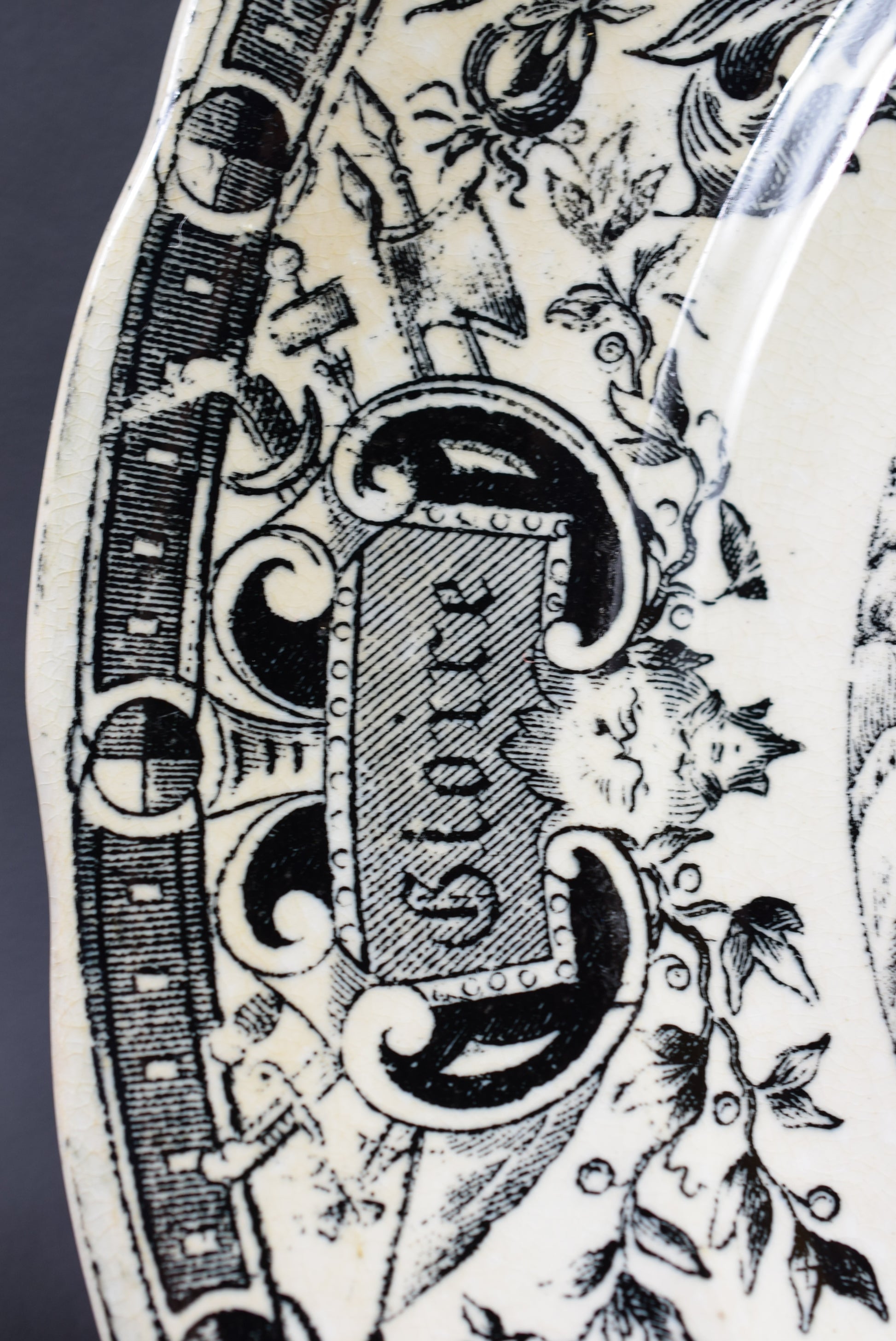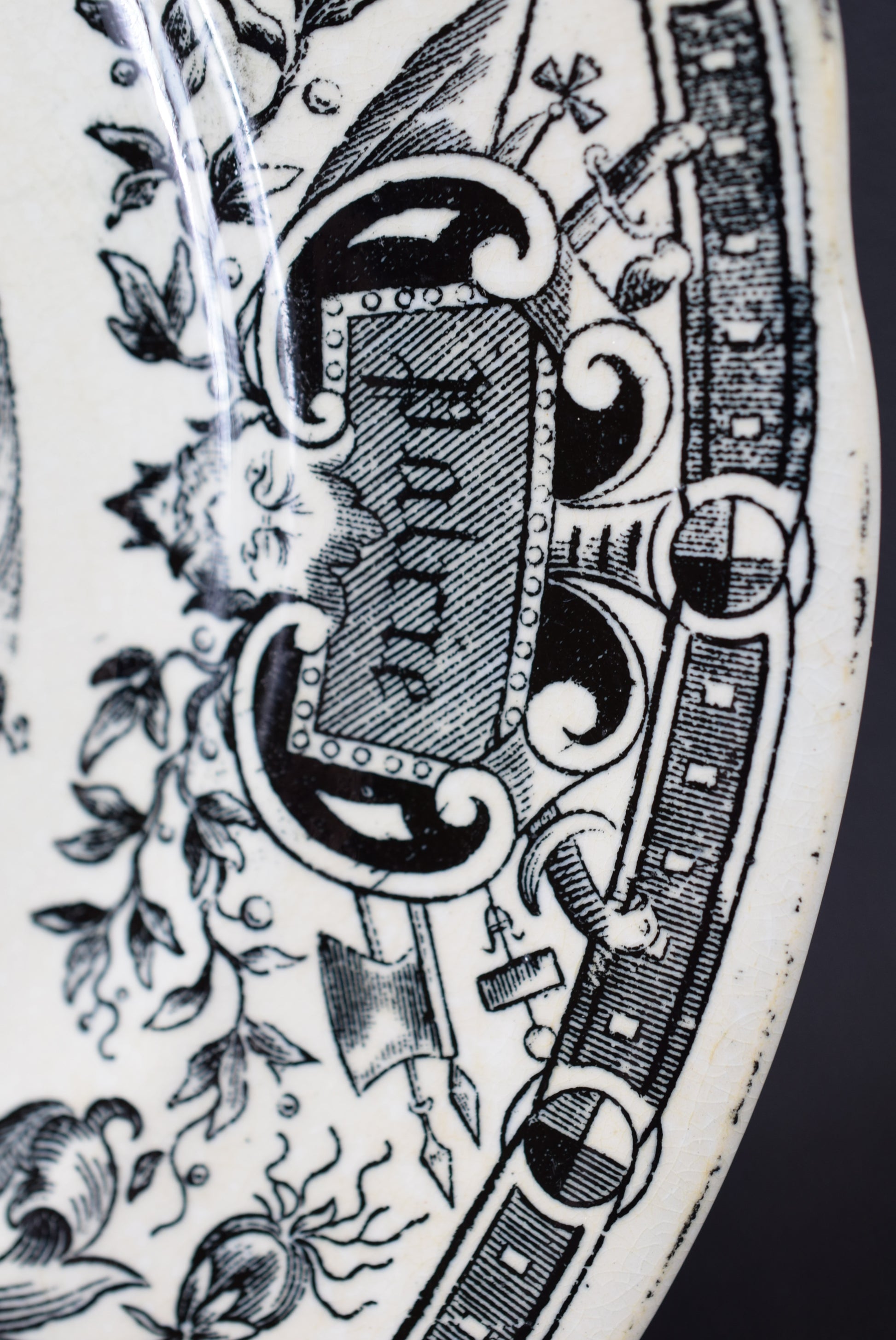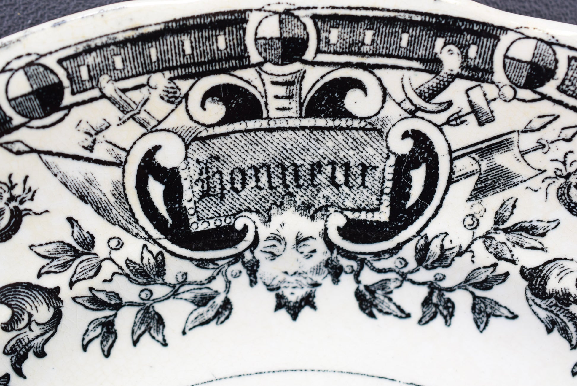 Une belle assiette française antique fabriquée par la célèbre entreprise de céramique Digoin Sarreguemines, datant de la fin des années 1800. La plaque murale de collection présente un motif de transfert noir représentant Sainte Jeanne brûlant sur le bûcher. Le bord est finement orné. L'assiette de collection a été intitulée en français "Mort de Jeanne d'Arc (30 mai 1431)
