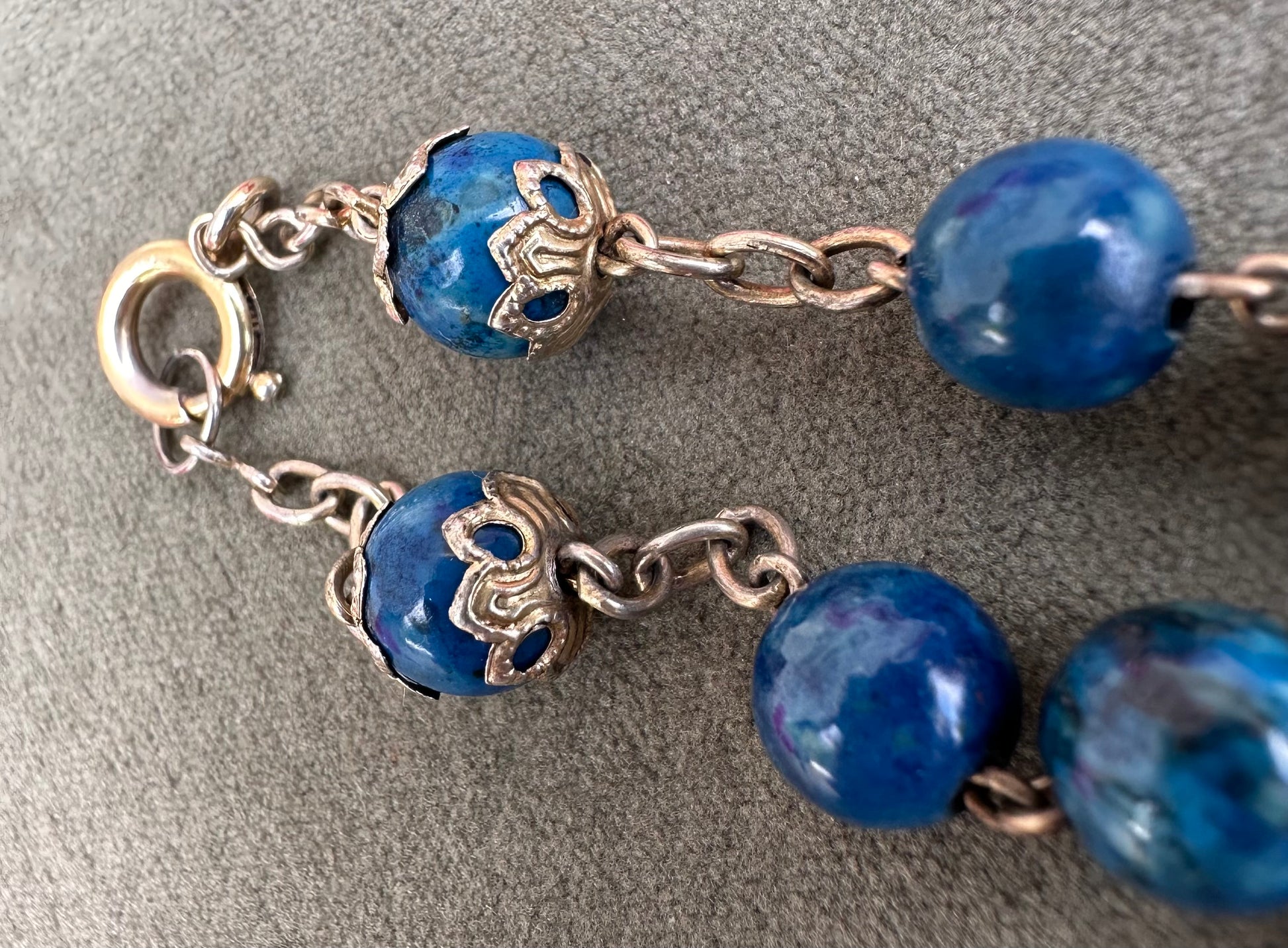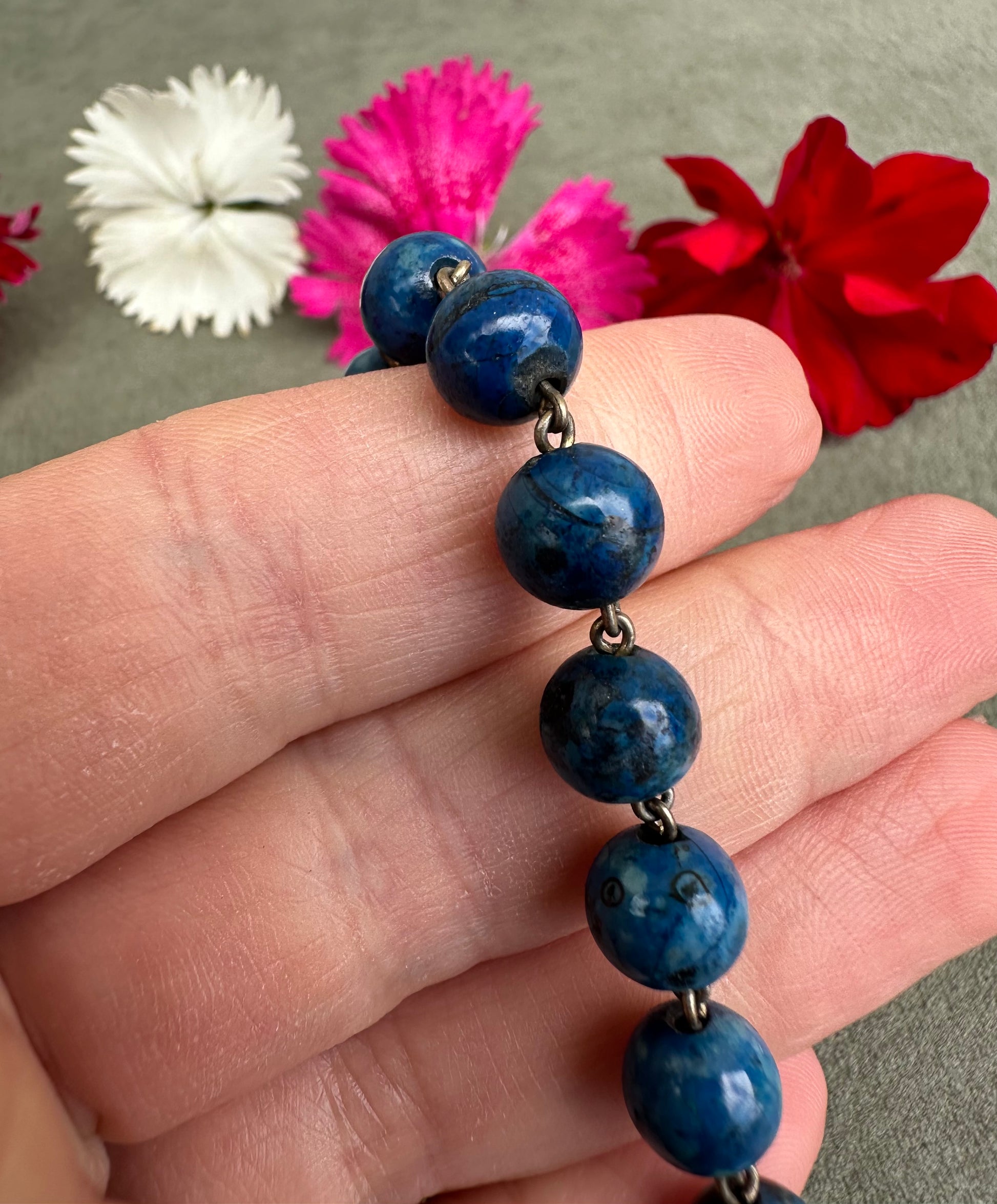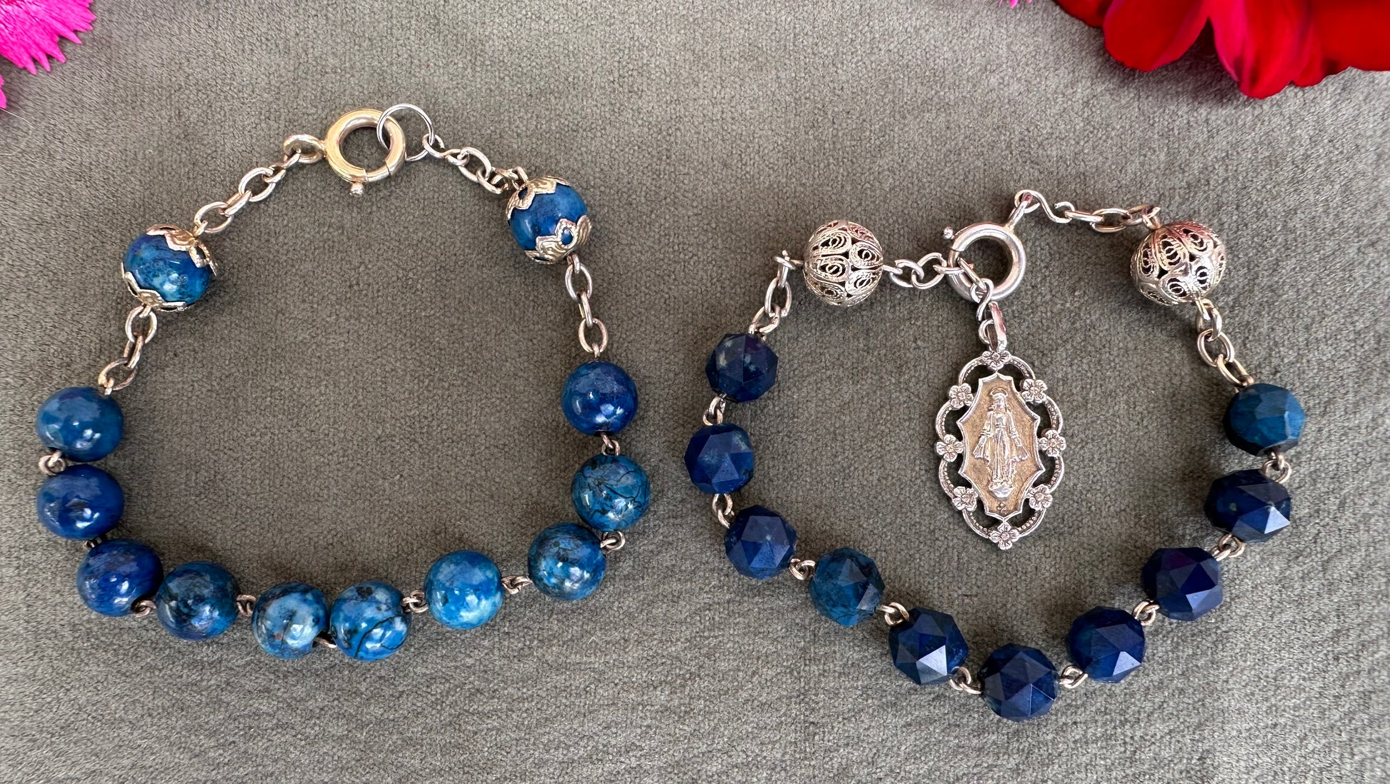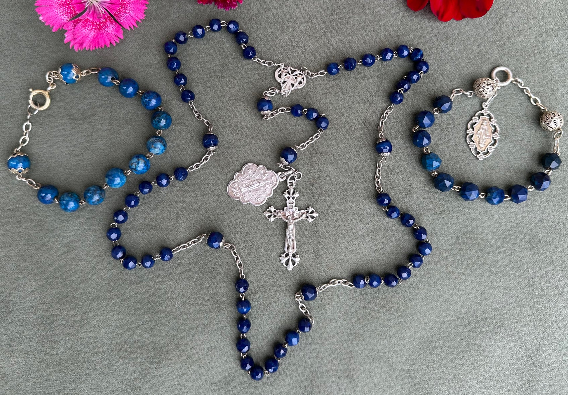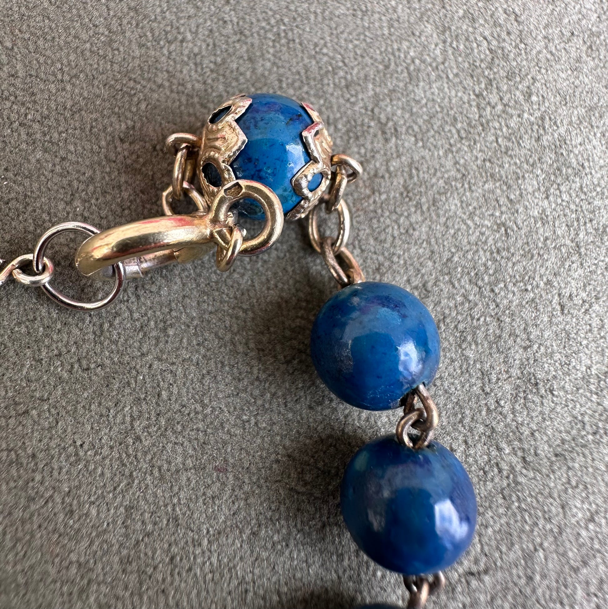 This stunning late 19th-century silver and lapis lazuli beaded bracelet is a timeless treasure, designed as a one-decade rosary bracelet for women. The bracelet showcases twelve natural deep blue lapis lazuli beads, two of which are elegantly capped in silver, adding a touch of sophistication and charm. Each bead is smooth and polished, symbolizing serenity and devotion. With its spiritual significance and intricate craftsmanship, this bracelet serves as both a beautiful piece of jewelry and a meaningful prayer accessory, perfect for personal devotion or as a special gift.