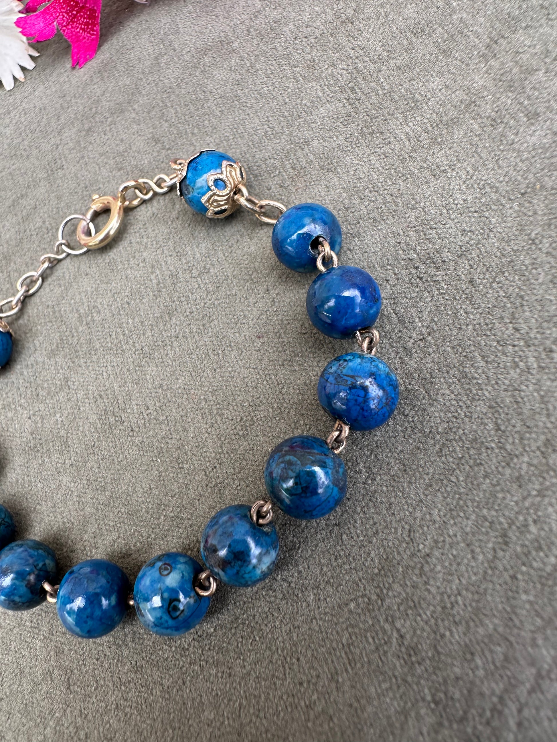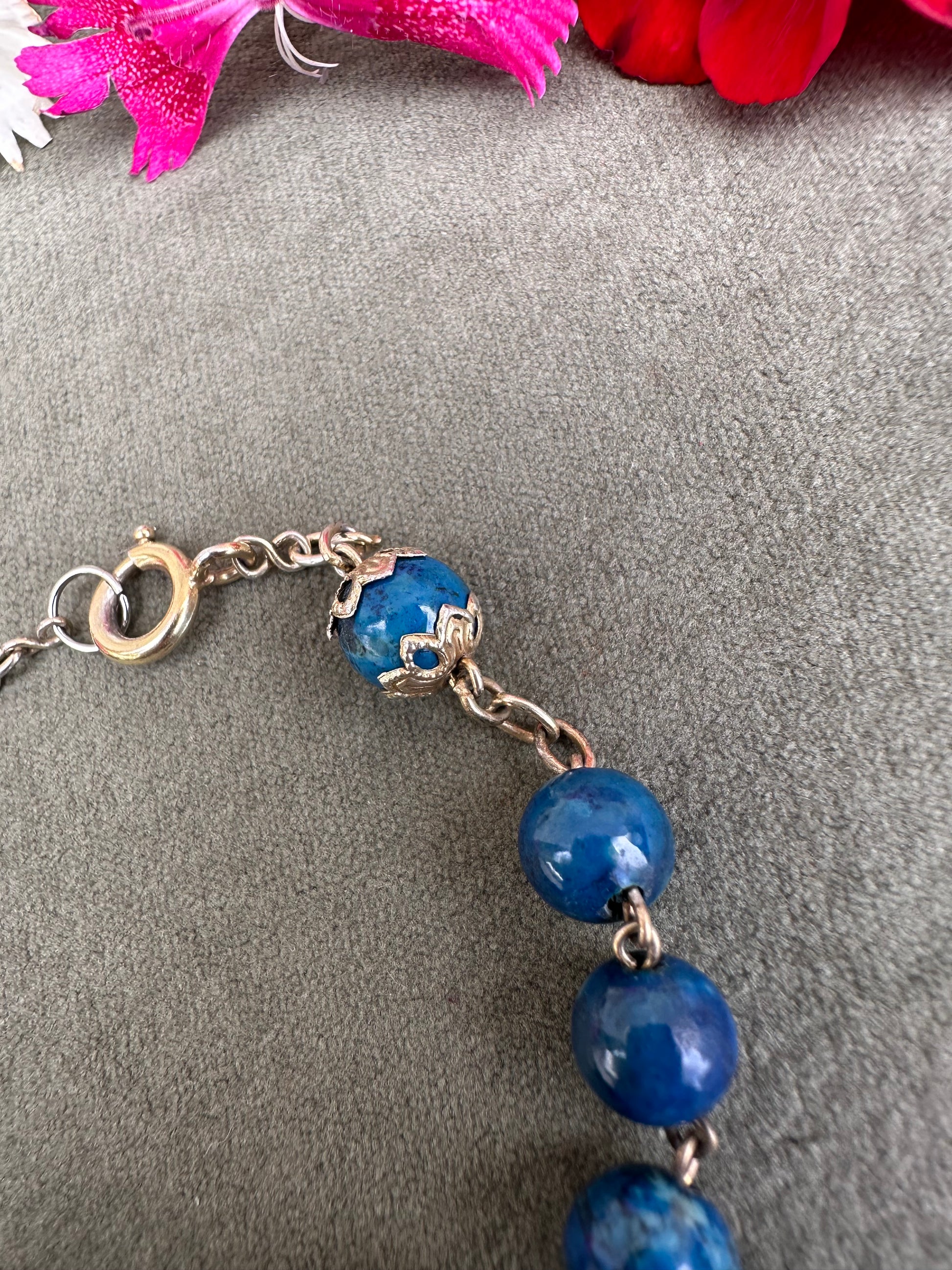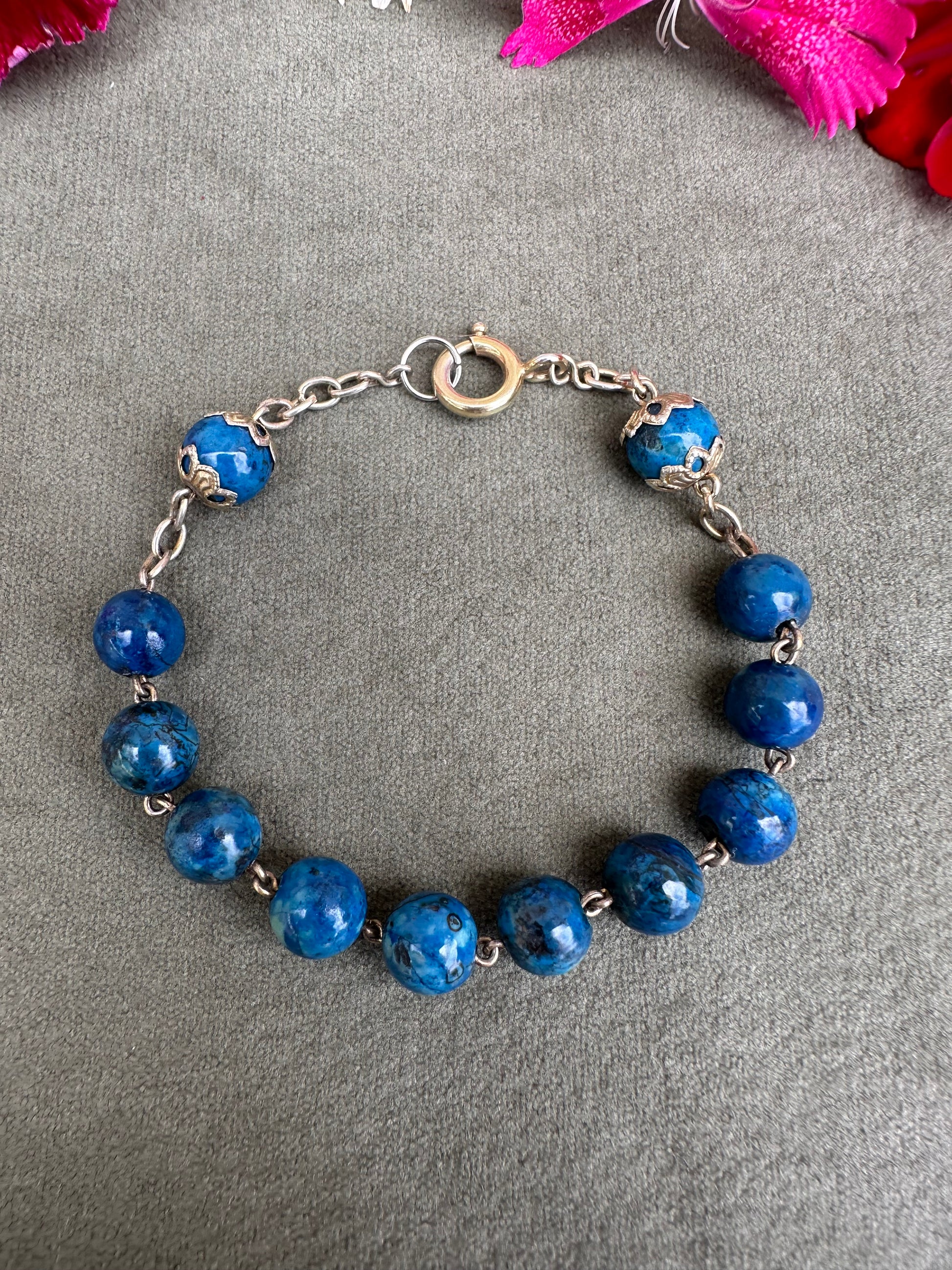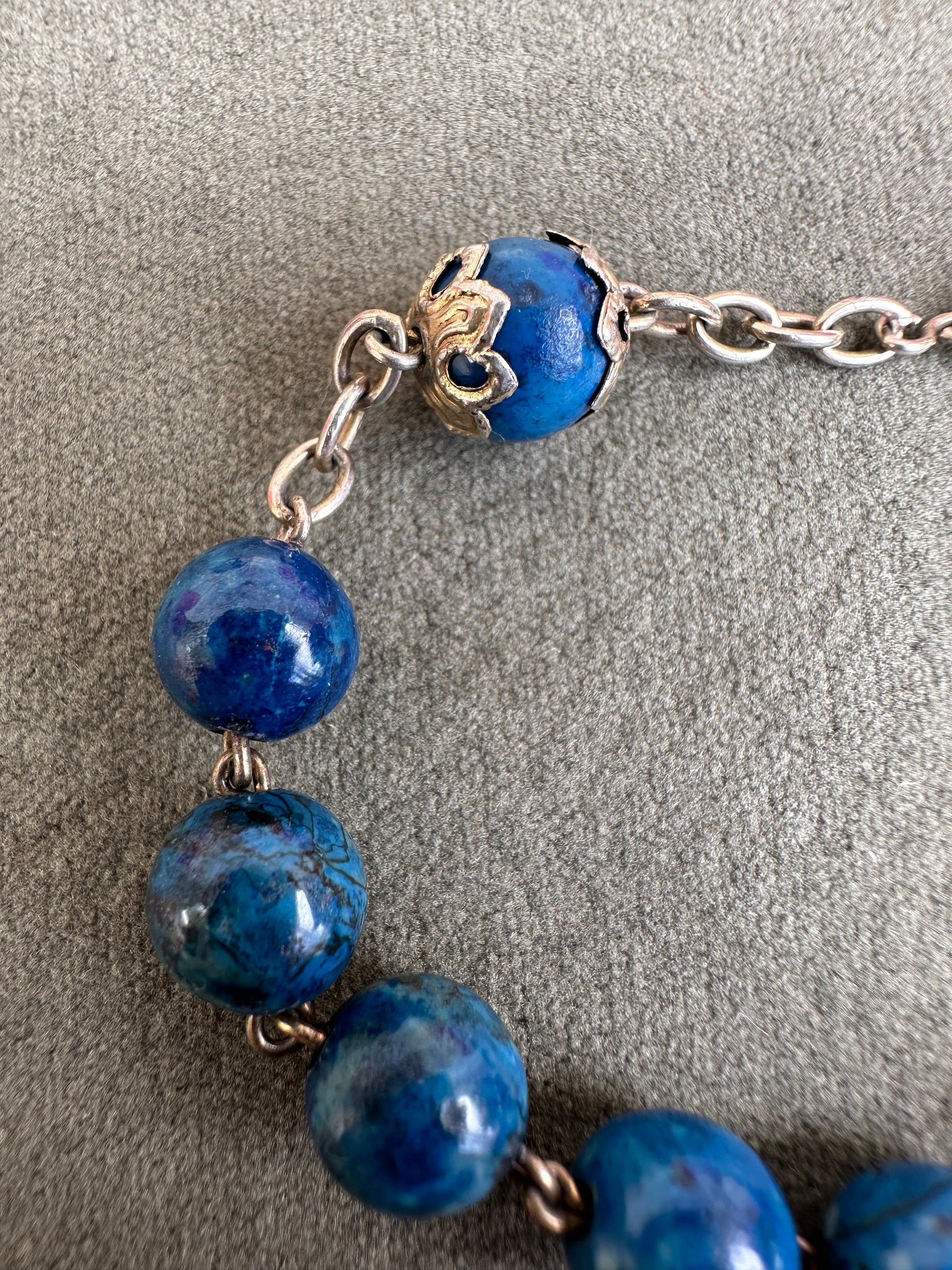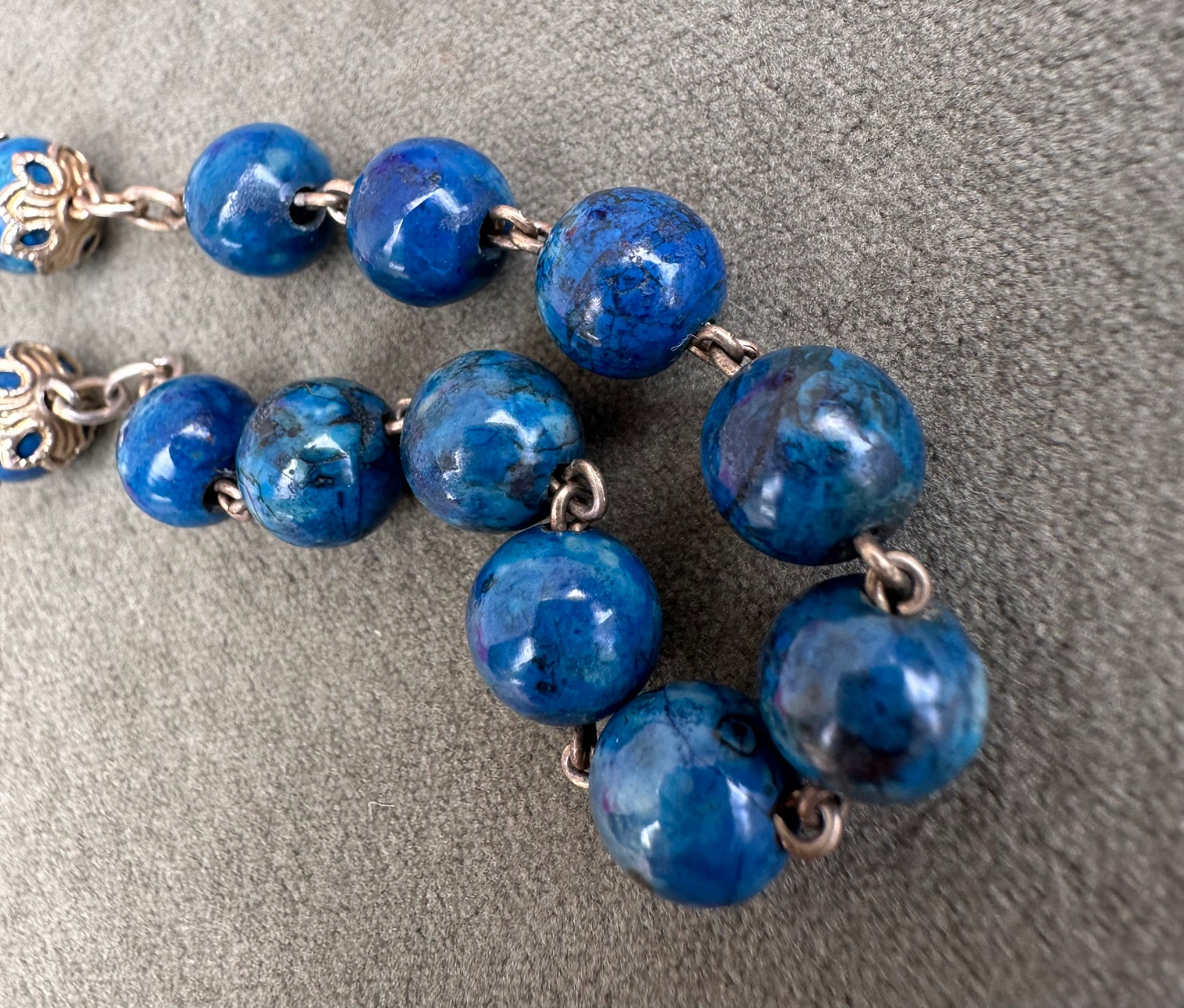 This stunning late 19th-century silver and lapis lazuli beaded bracelet is a timeless treasure, designed as a one-decade rosary bracelet for women. The bracelet showcases twelve natural deep blue lapis lazuli beads, two of which are elegantly capped in silver, adding a touch of sophistication and charm. Each bead is smooth and polished, symbolizing serenity and devotion. With its spiritual significance and intricate craftsmanship, this bracelet serves as both a beautiful piece of jewelry and a meaningful prayer accessory, perfect for personal devotion or as a special gift.