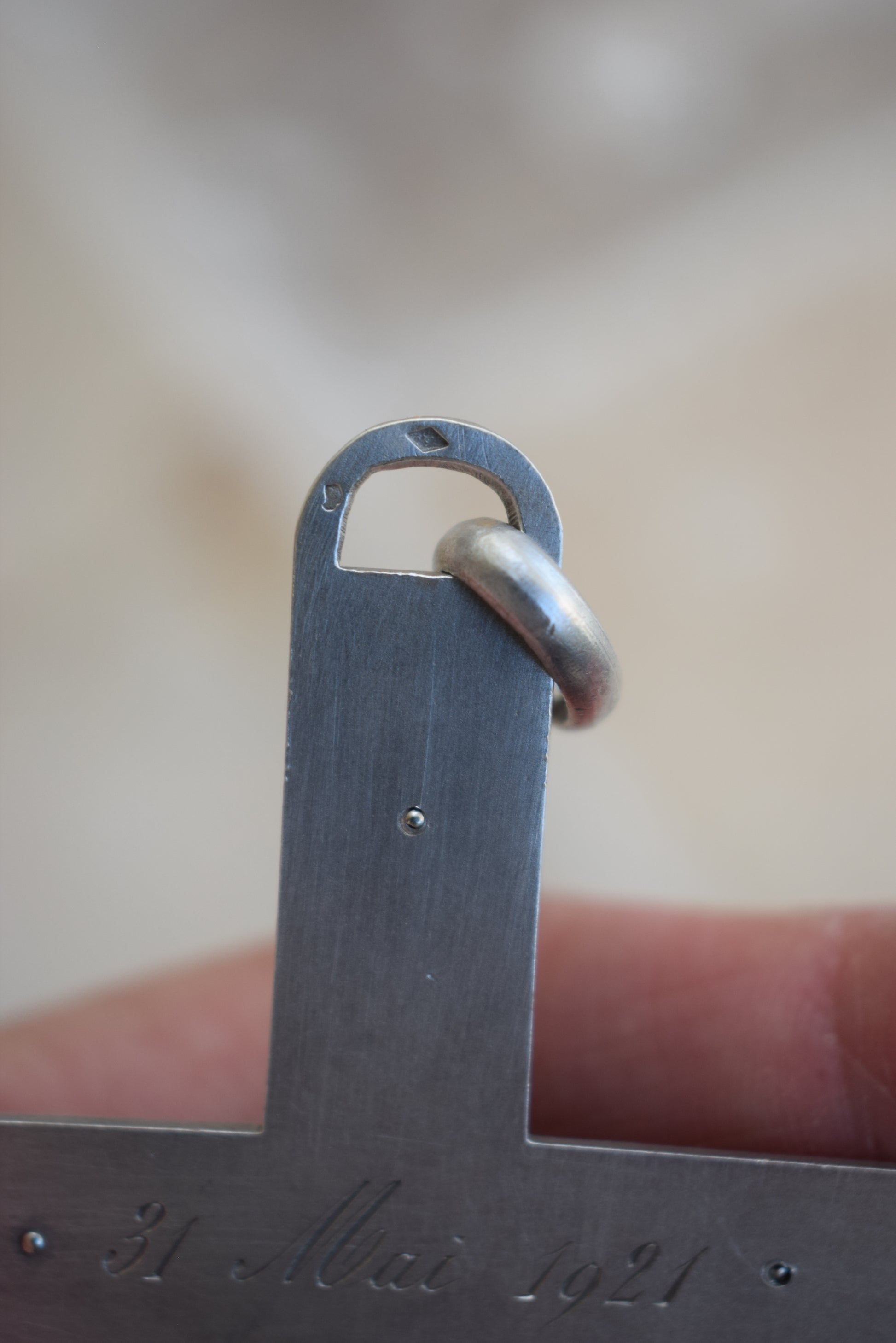 Un beau crucifix antique datant du début du 20ème siècle. La croix est en argent sterling massif et pèse environ 38 grammes. Elle mesure 4 3/8 pouces de haut (11 cm). Le revers a été gravé avec la date du 31 mai 1921. Je suppose que cette croix pectorale était un cadeau de la Sainte Communion.
