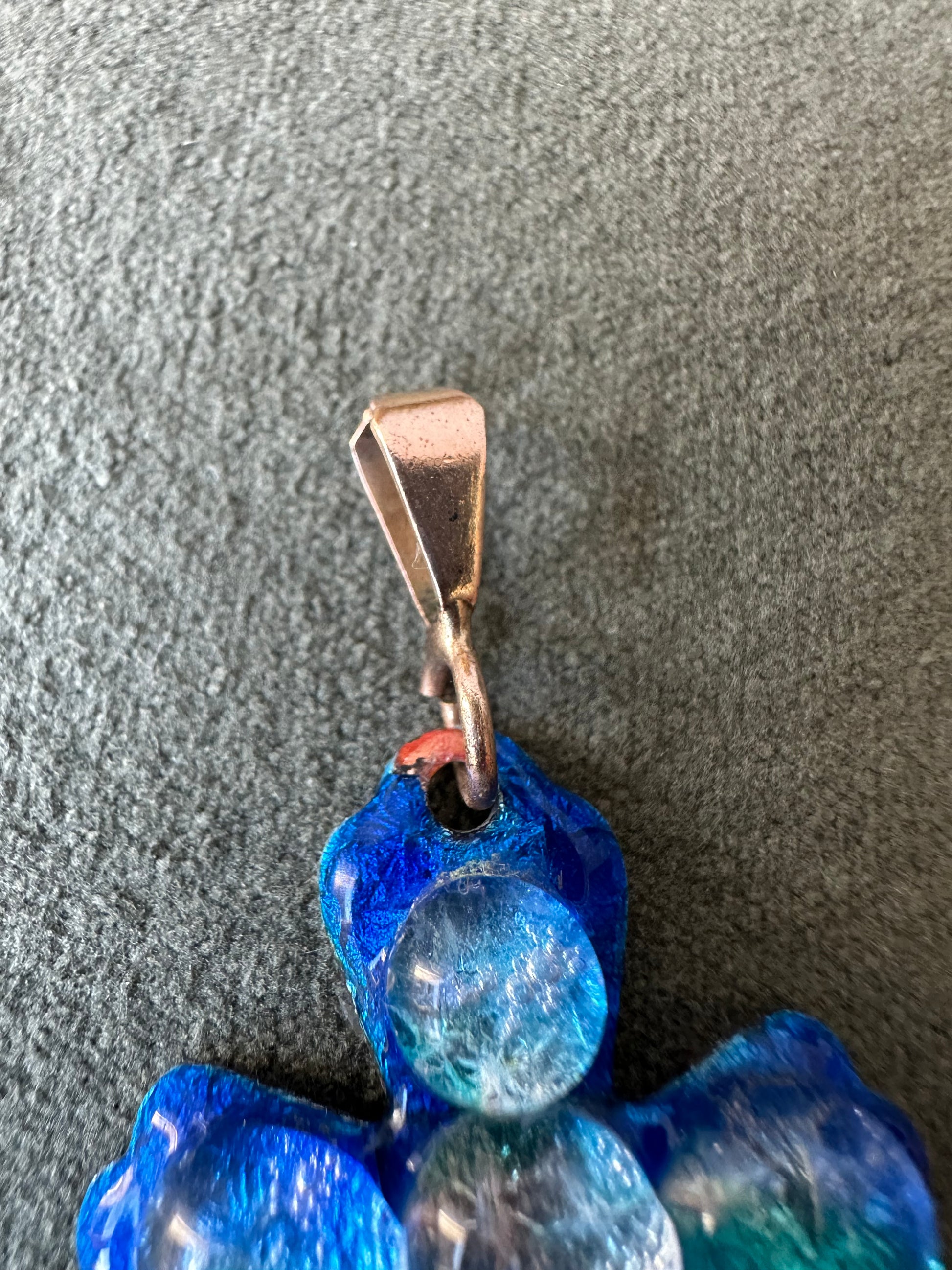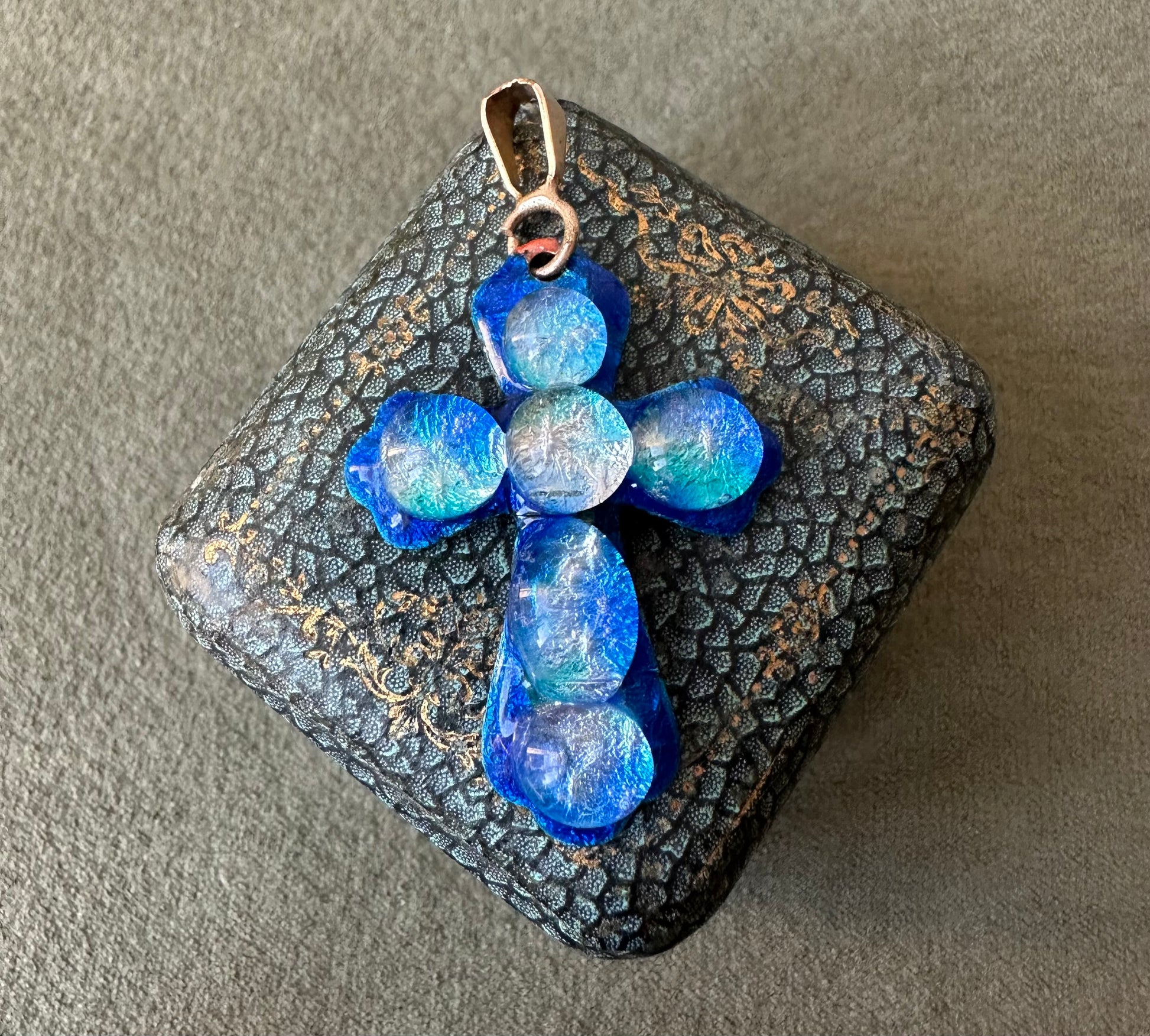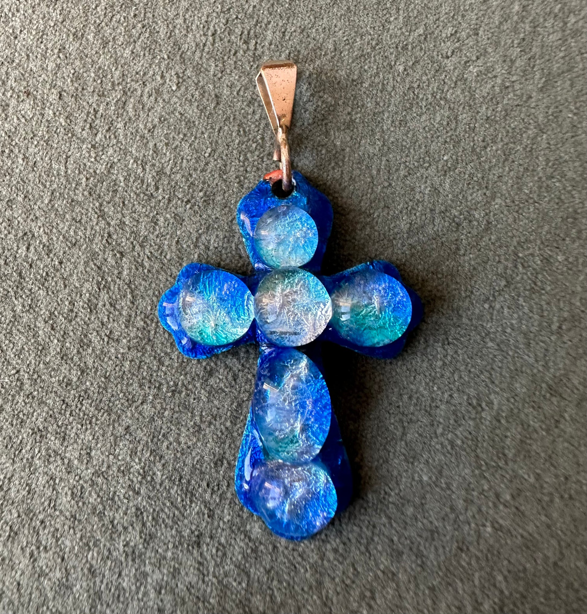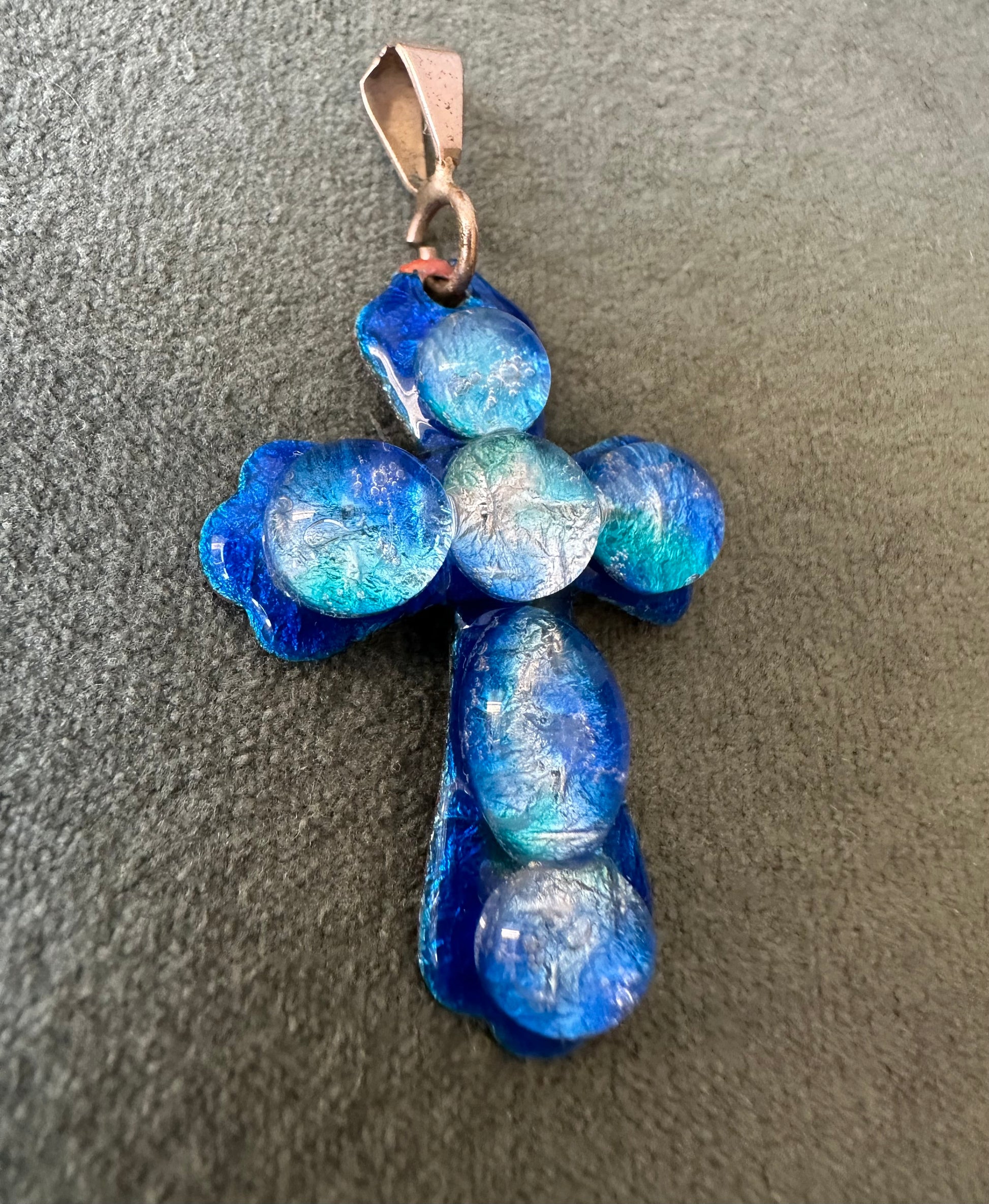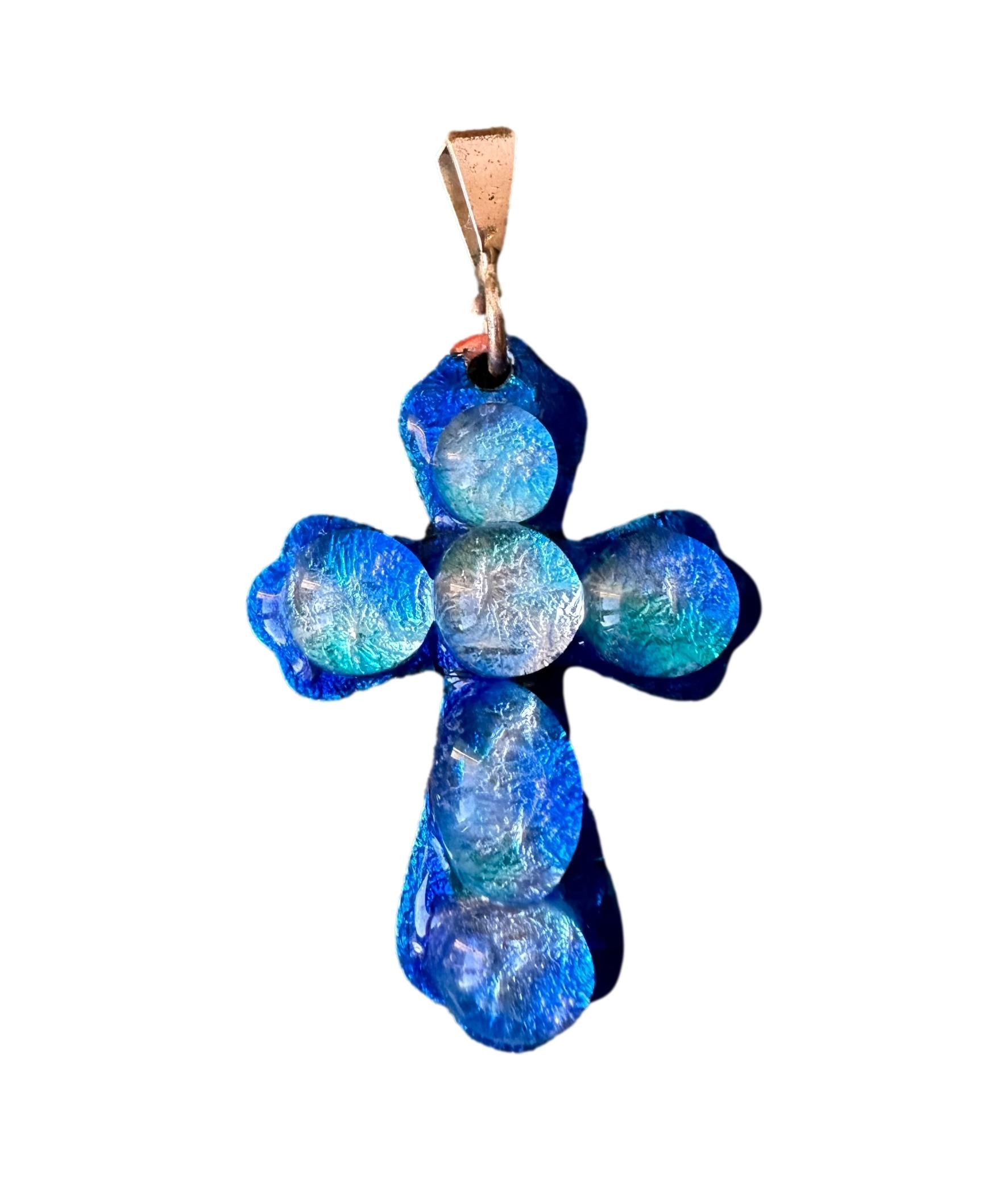 Rare and beautiful vintage cross pendant handmade in Limoges, France by the French artist Michel Betourne. Made of blue enamels on copper, this high quality jewelry features a unique water drop design.