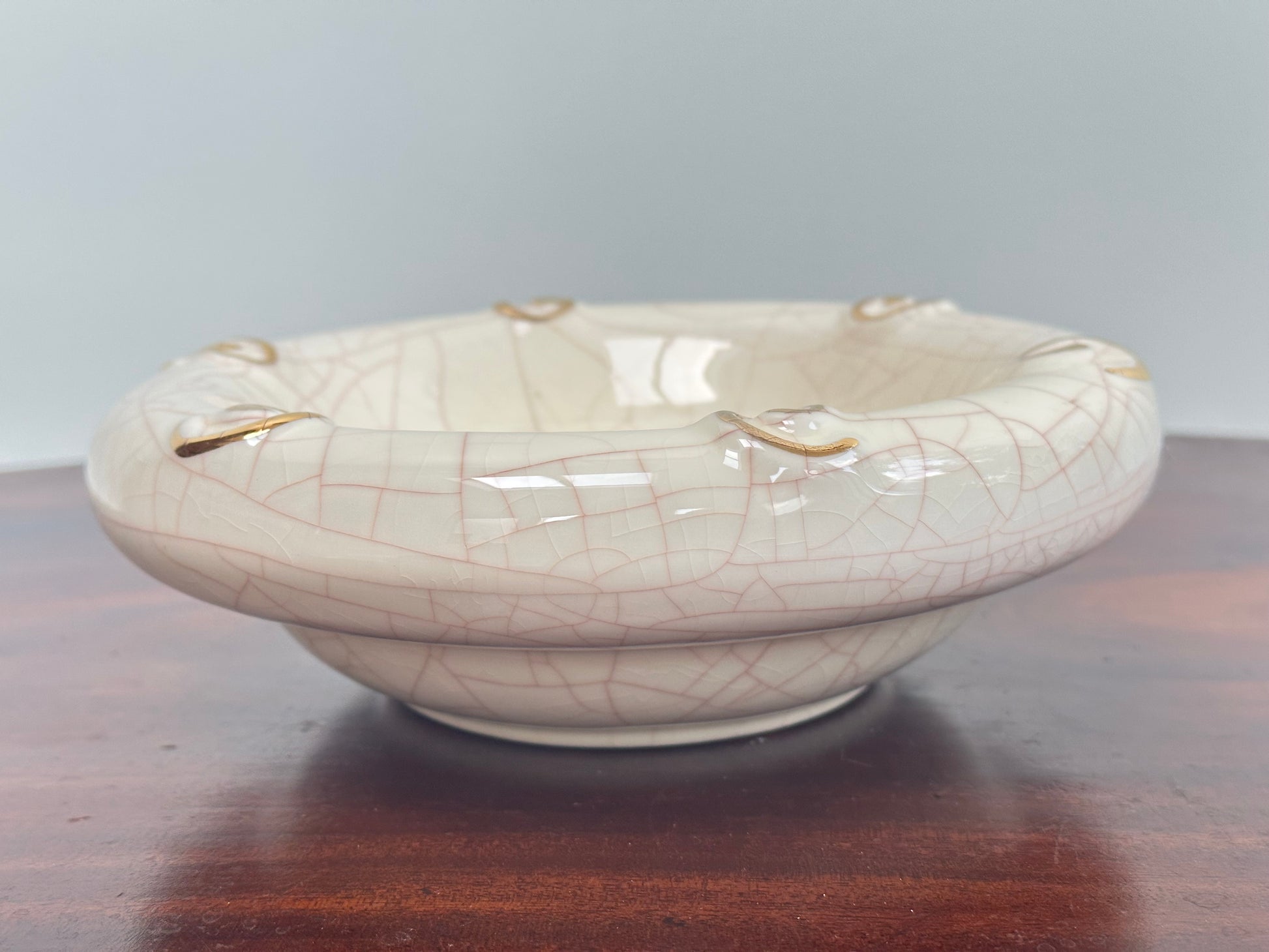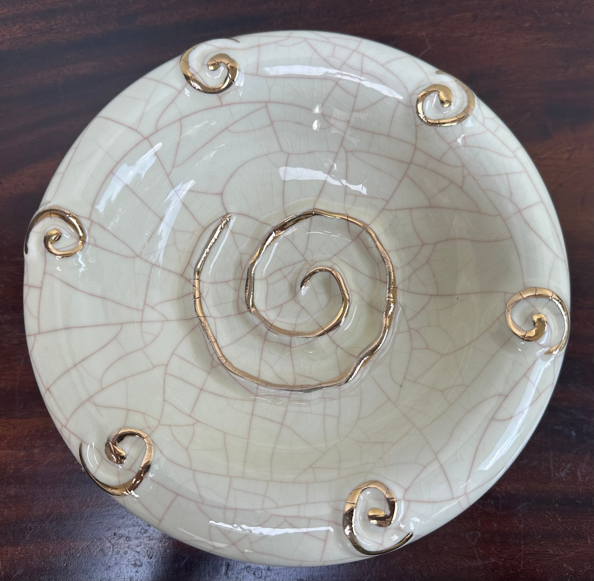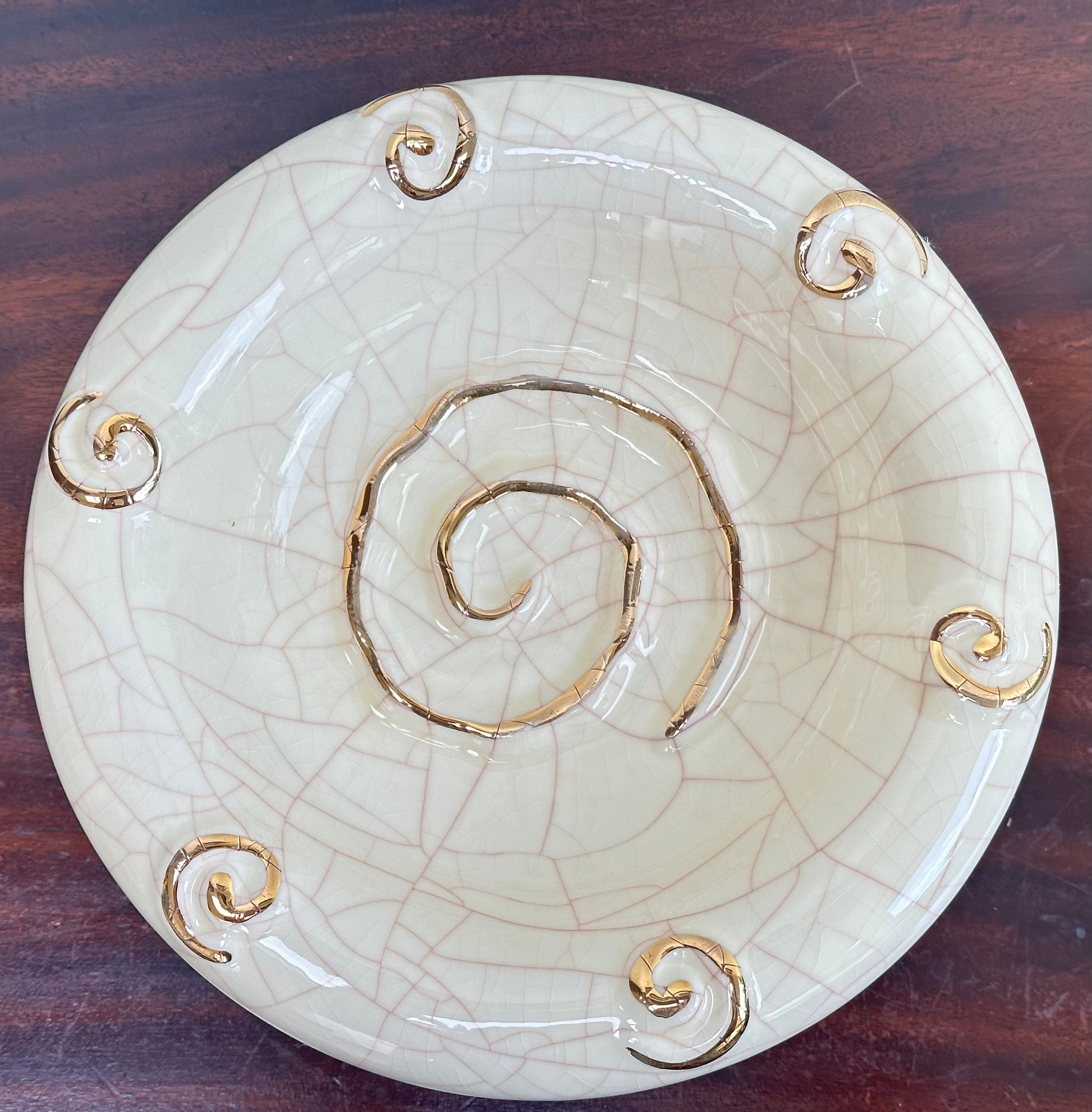 Très belle coupe vintage produite par la manufacture de Longwy créée en 1798. Le vide poche de style Art Déco est en céramique craquelée de couleur crème et est orné de spirales dorées. Le motif de la spirale est le symbole de la vie. Il représente le motif universel de la croissance et de l'évolution, de l'éternité et de la continuité. La spirale sacrée est également un symbole énergétique.