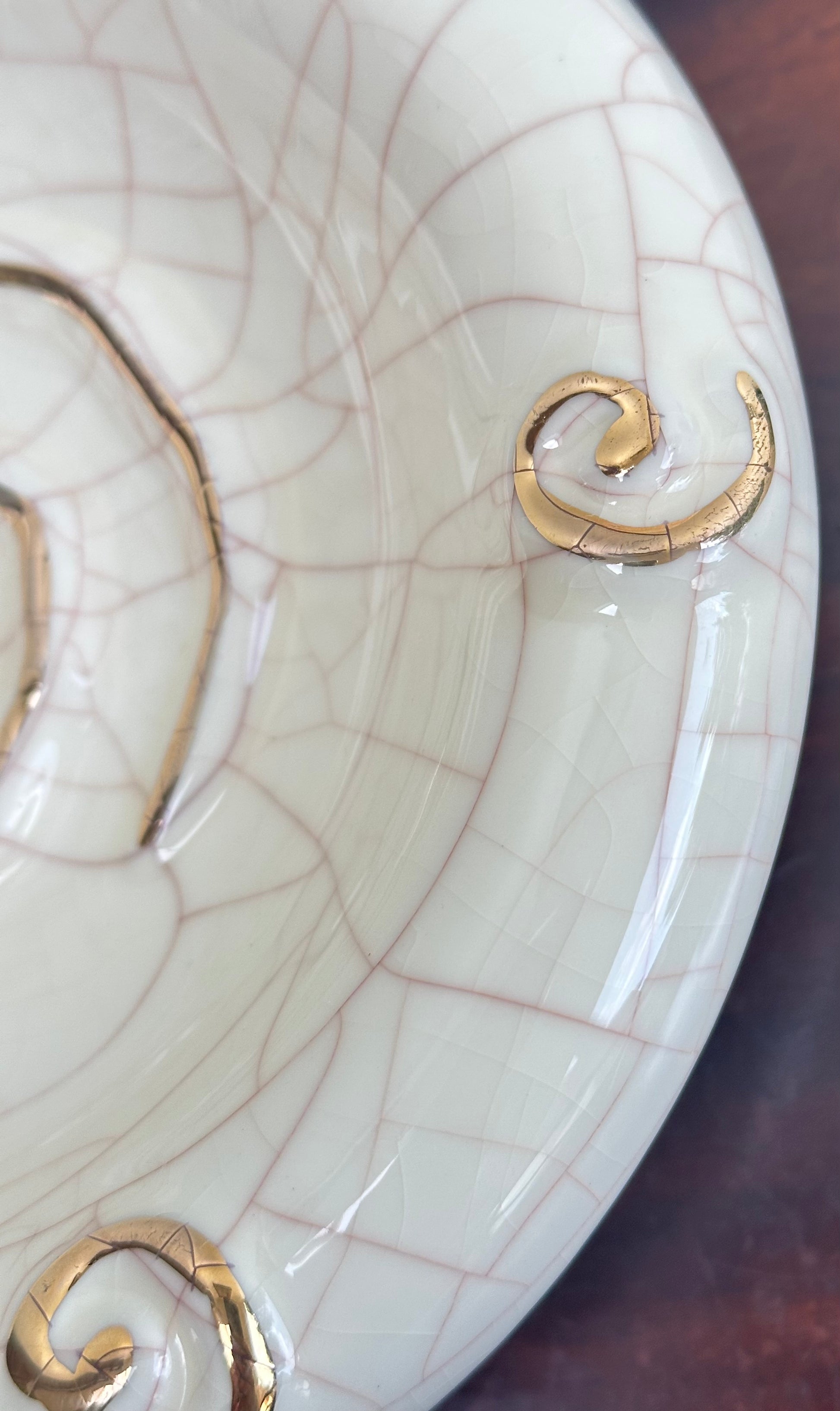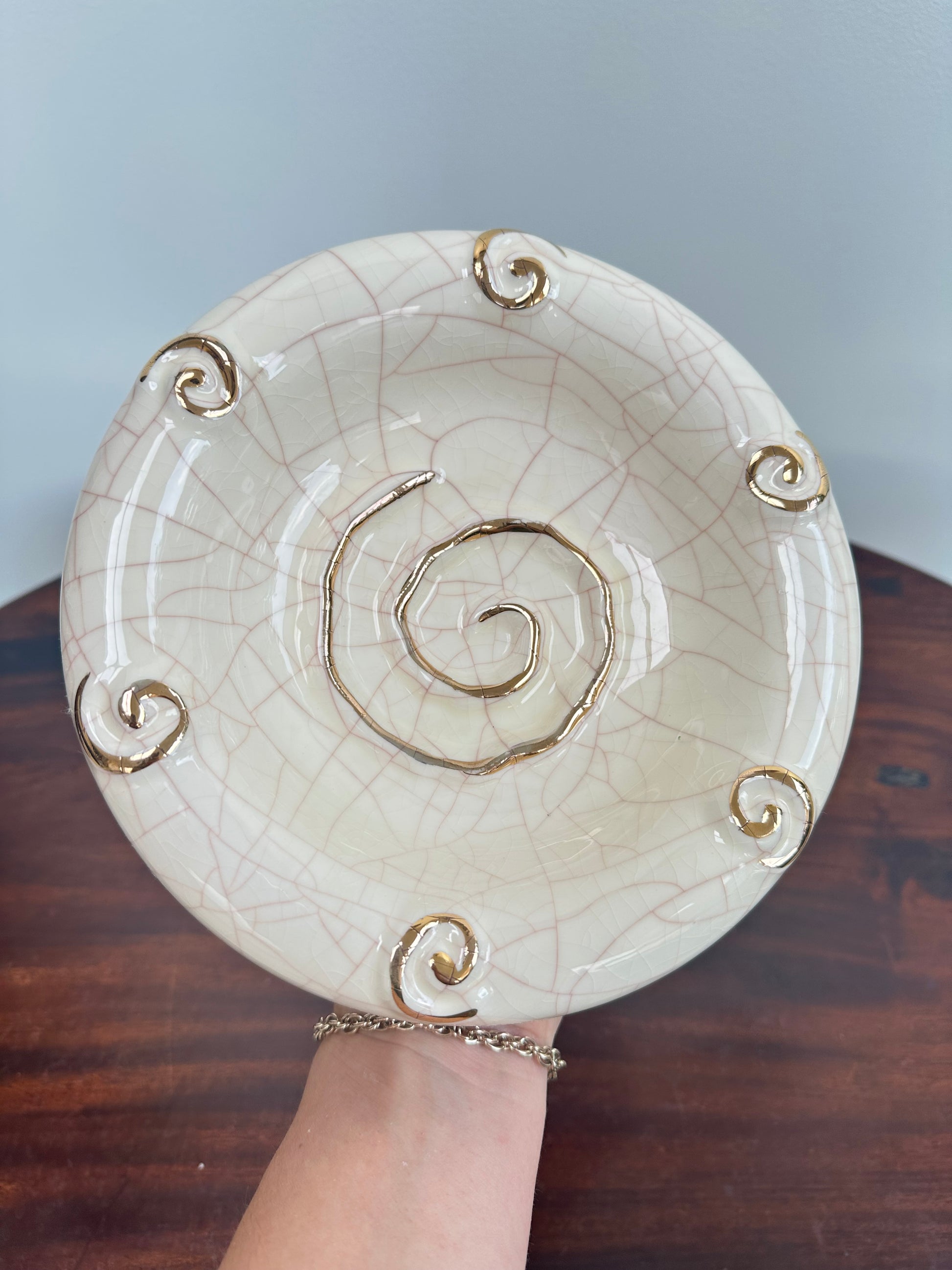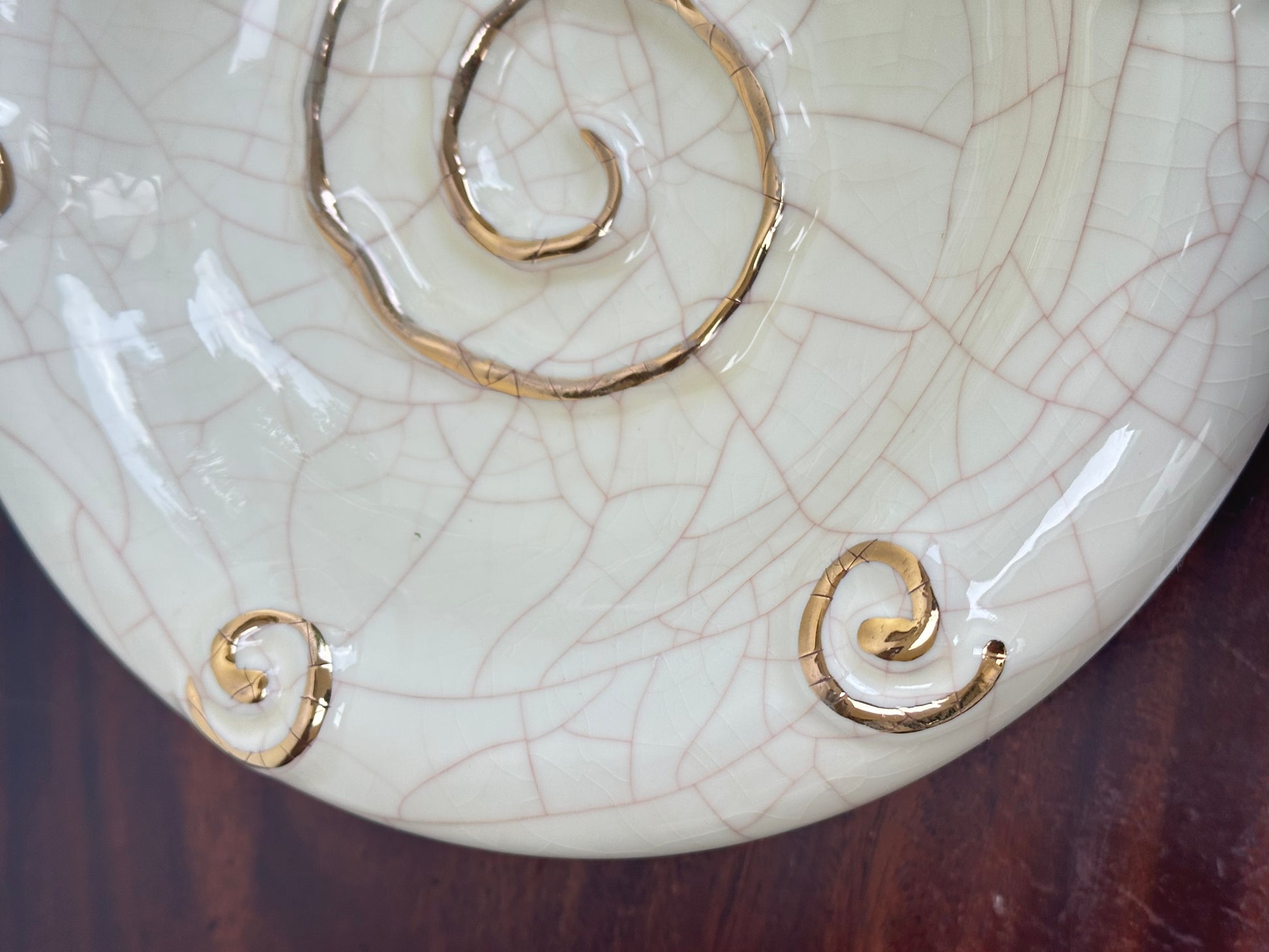 Très belle coupe vintage produite par la manufacture de Longwy créée en 1798. Le vide poche de style Art Déco est en céramique craquelée de couleur crème et est orné de spirales dorées. Le motif de la spirale est le symbole de la vie. Il représente le motif universel de la croissance et de l'évolution, de l'éternité et de la continuité. La spirale sacrée est également un symbole énergétique.