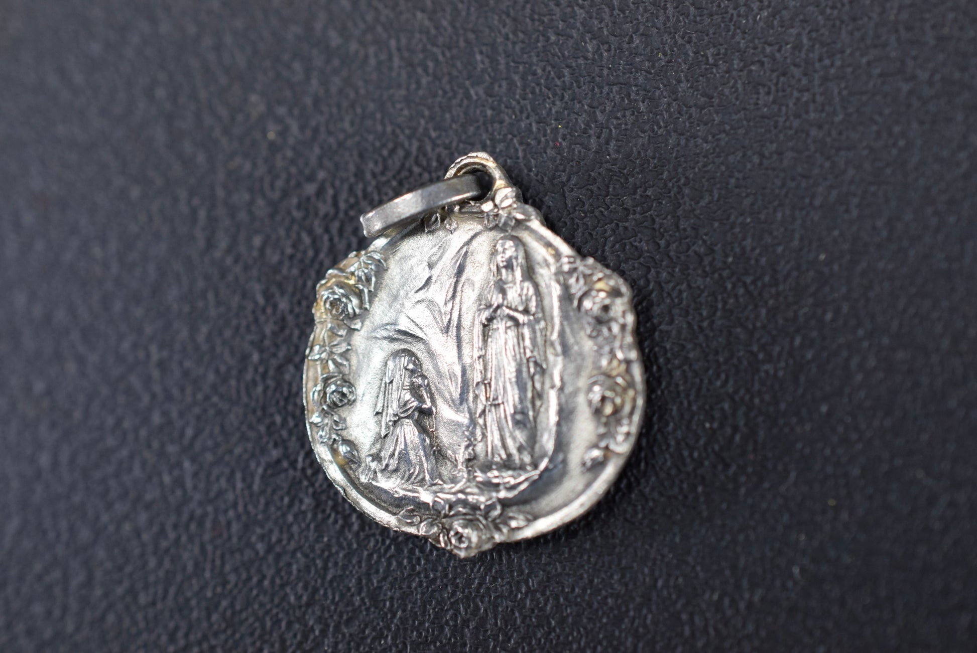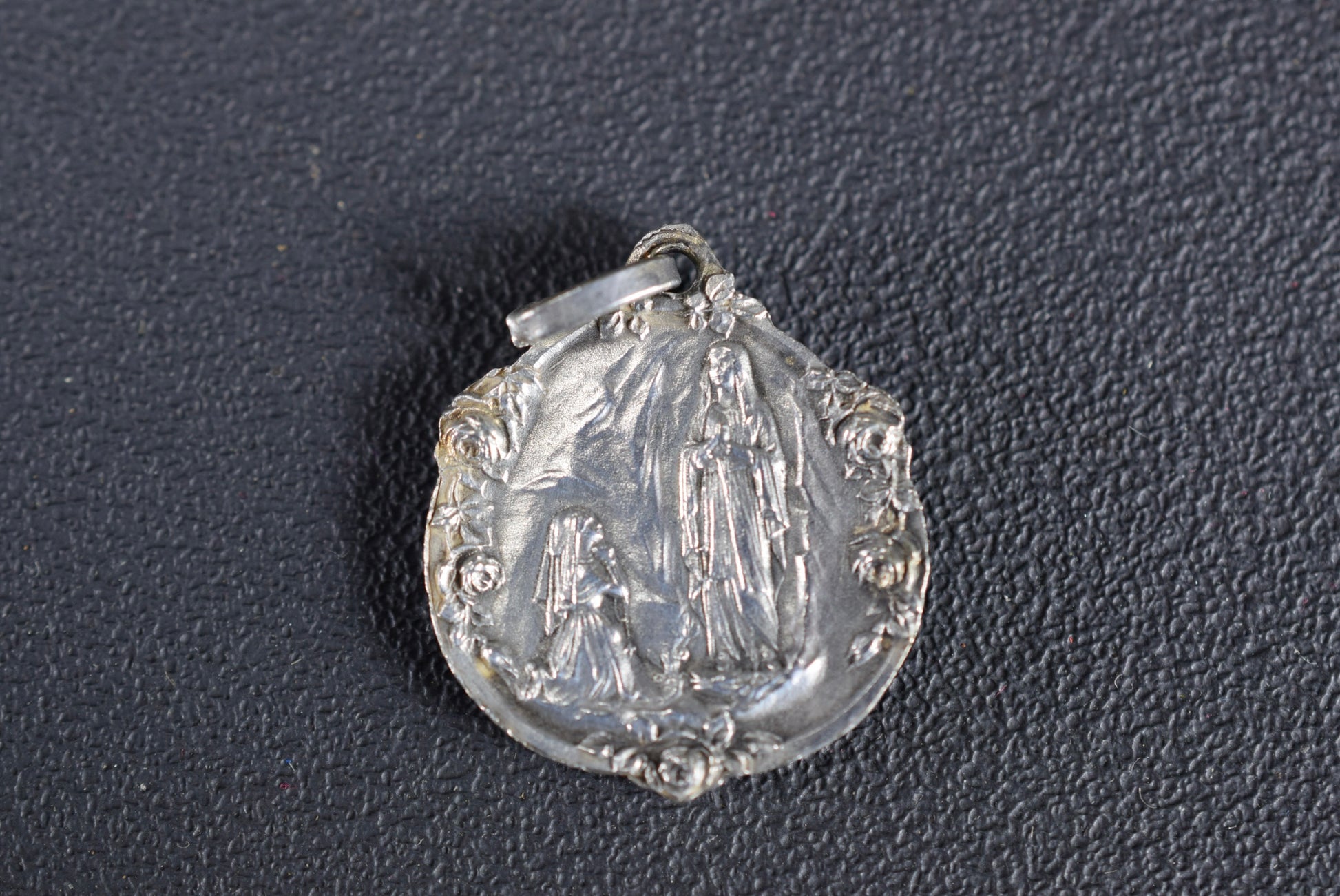Une médaille religieuse française antique et authentique de Notre-Dame Vierge Marie. Au revers, le décor représente l'apparition de Marie à sainte Bernadette. Charmant design Art Nouveau.