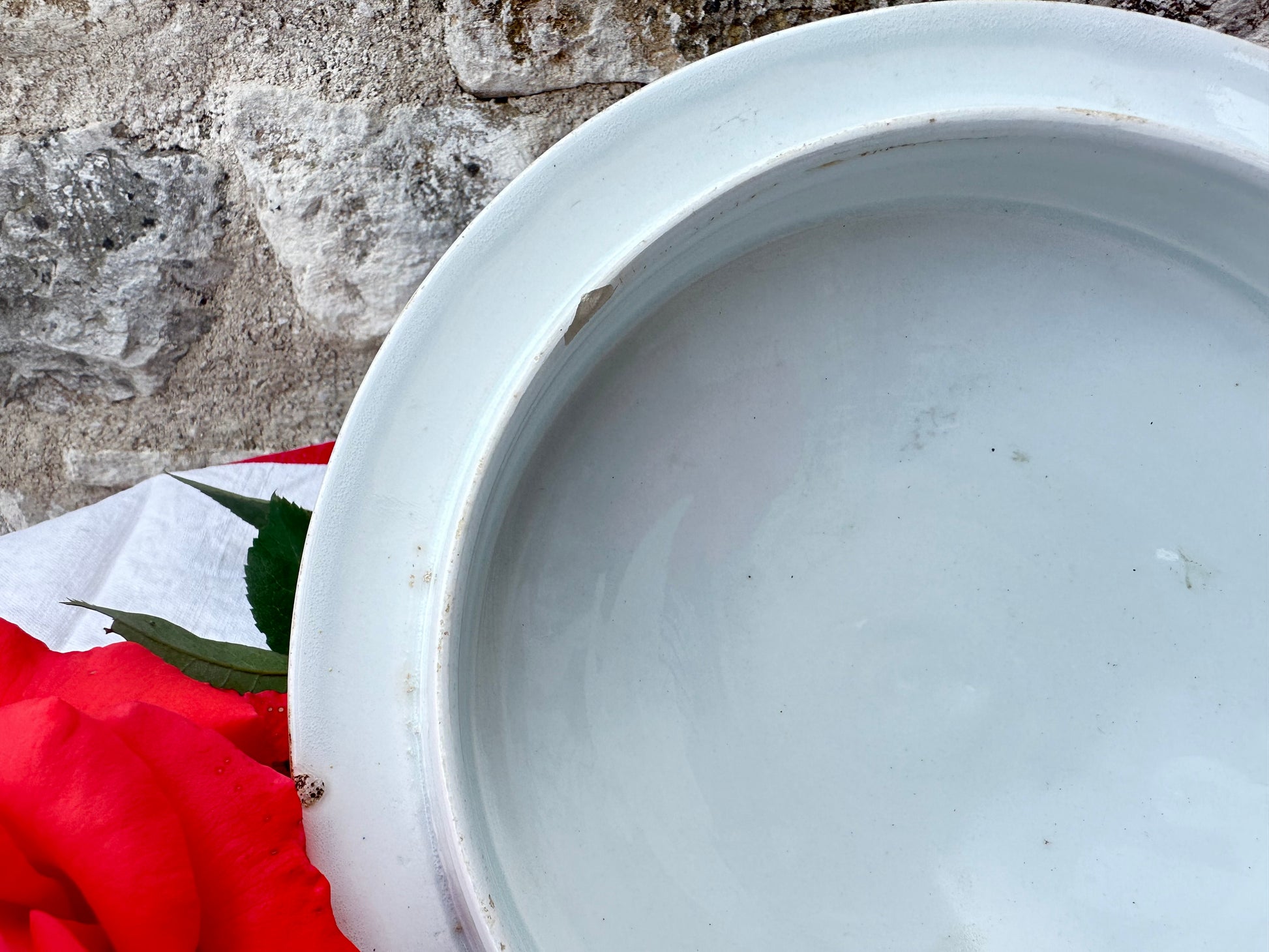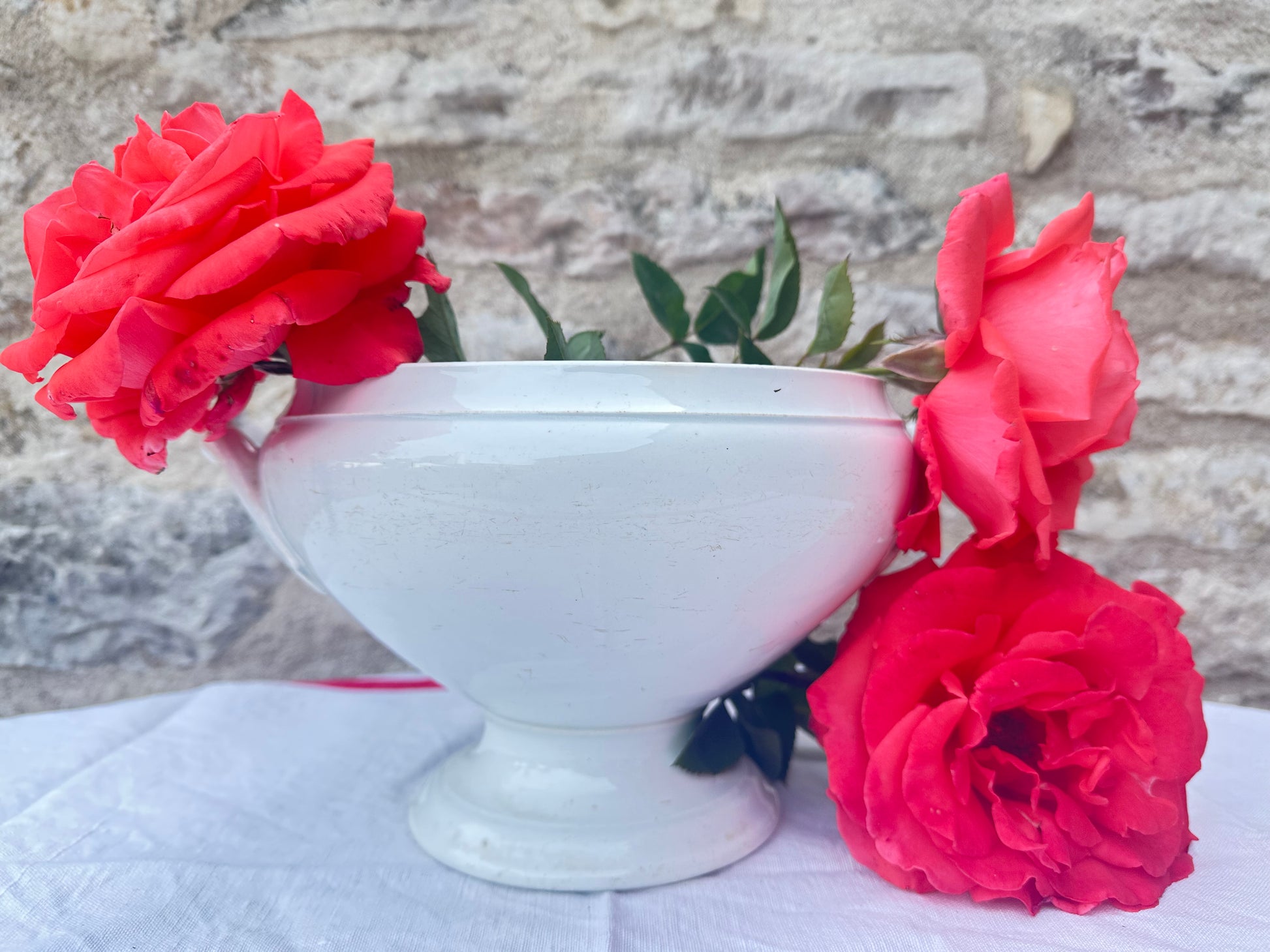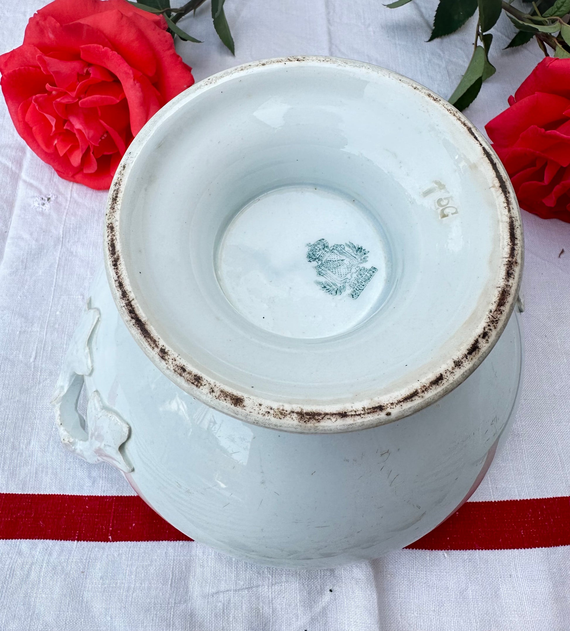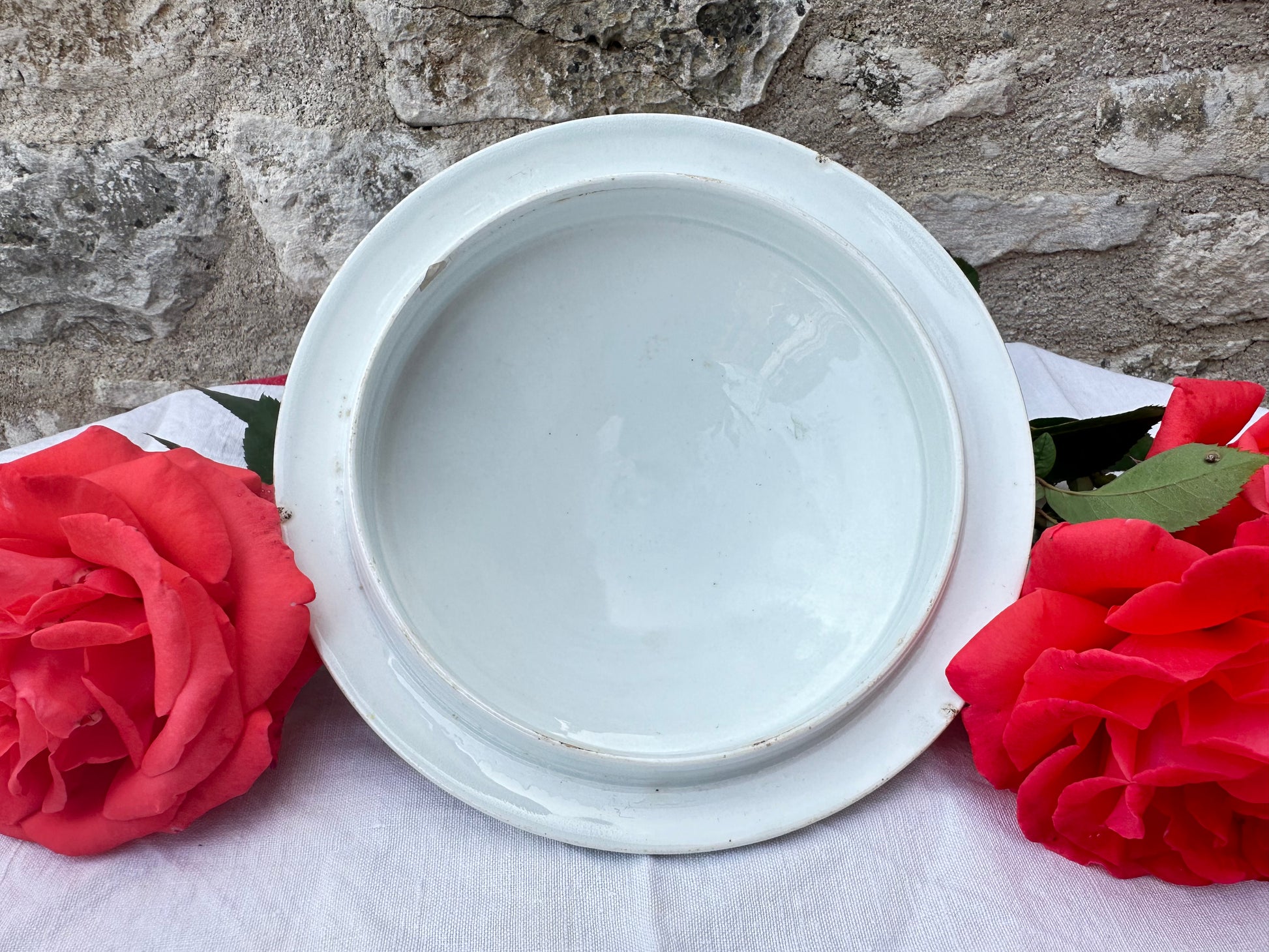 The antique white ironstone soup tureen produced by Luneville is an elegant French piece characterized by its classic, timeless design. Crafted from durable ironstone, this soup tureen has a smooth, glossy finish in a soft white shade, giving it a pristine and sophisticated appearance. The tureen features a rounded body with subtle, elegant curves and a wide base for stability. It comes with a matching lid, which is adorned with a small, ornate handle that adds to its charm. This piece is not only functional for serving soups but also serves as a beautiful decorative item, embodying the refinement and quality of antique French pottery.
