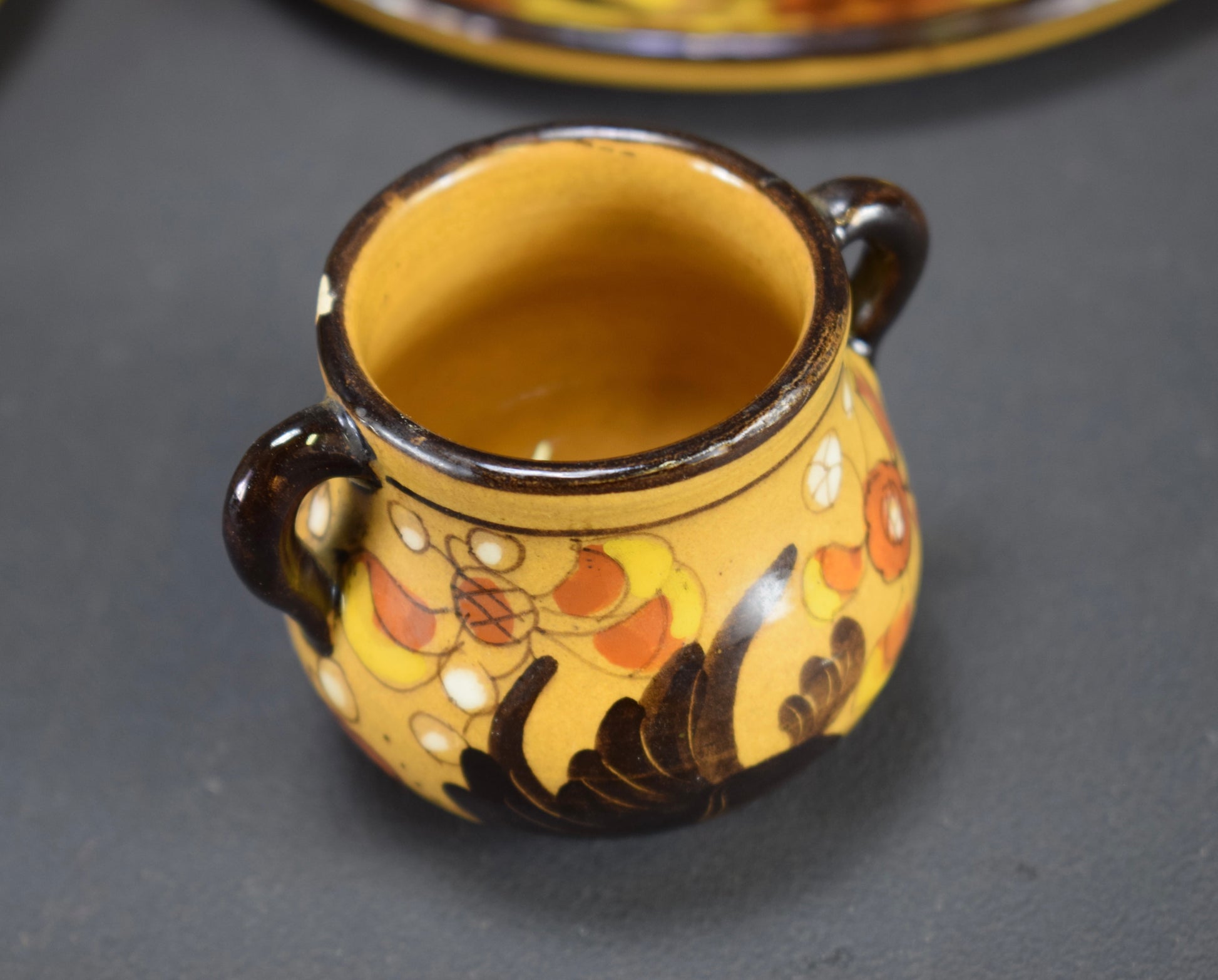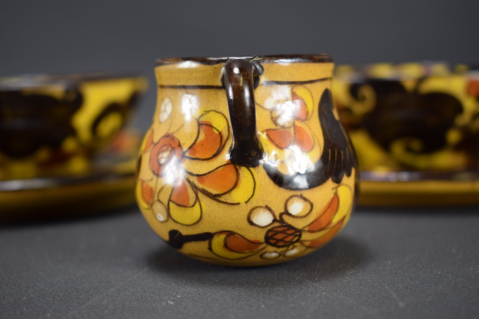 Magnifique petit pot antique en majolique italienne avec deux anses pour la crème ou le sucre, produit par Mazzotti Giuseppe Albissola dans les années 1925. Magnifique décor Renaissance marron introduit dans la production Albisola par Manlio Trucco à partir de 1925, il traduisit les canons de l'Art Déco en céramique. Elle marque le retour de la décoration « protagoniste » au XXe siècle. Il est en terre cuite décorée sous couverte de motifs floraux et végétaux stylisés et d'oiseaux. Les couleurs sont vives, jaunes avec du noir brunâtre et des touches de rouge.