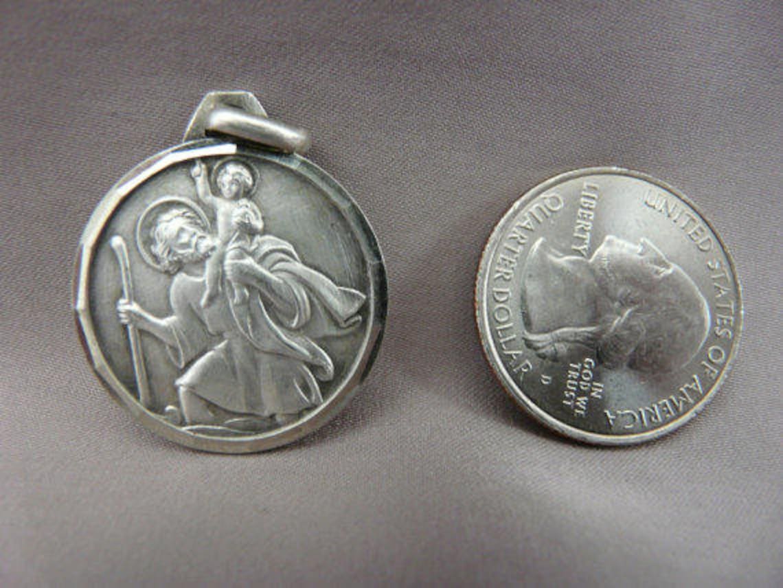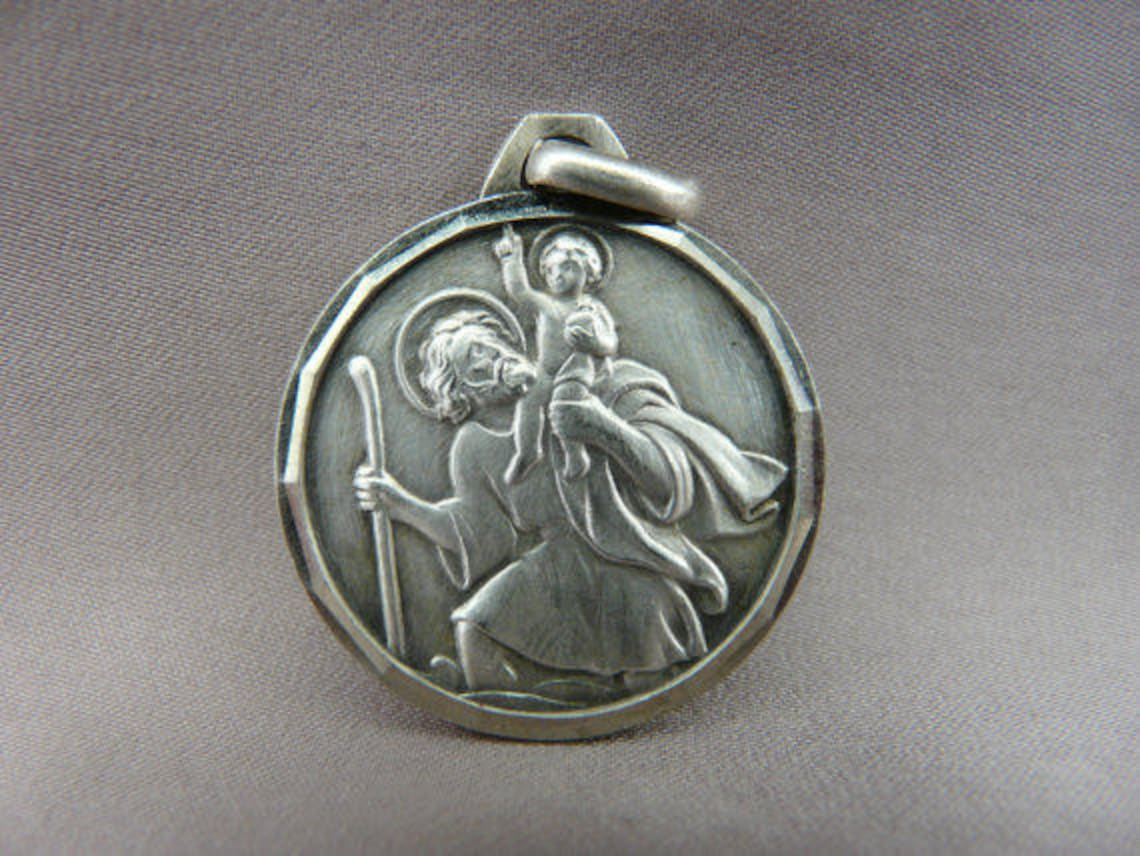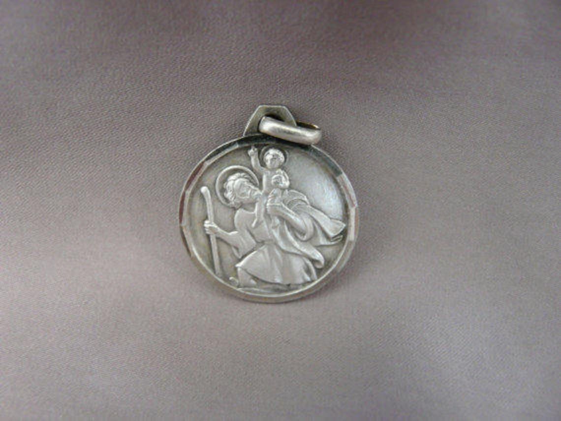 Une médaille religieuse Français vintage avec un bord fécal. Le pendentif représente Saint Christophe et Jésus.