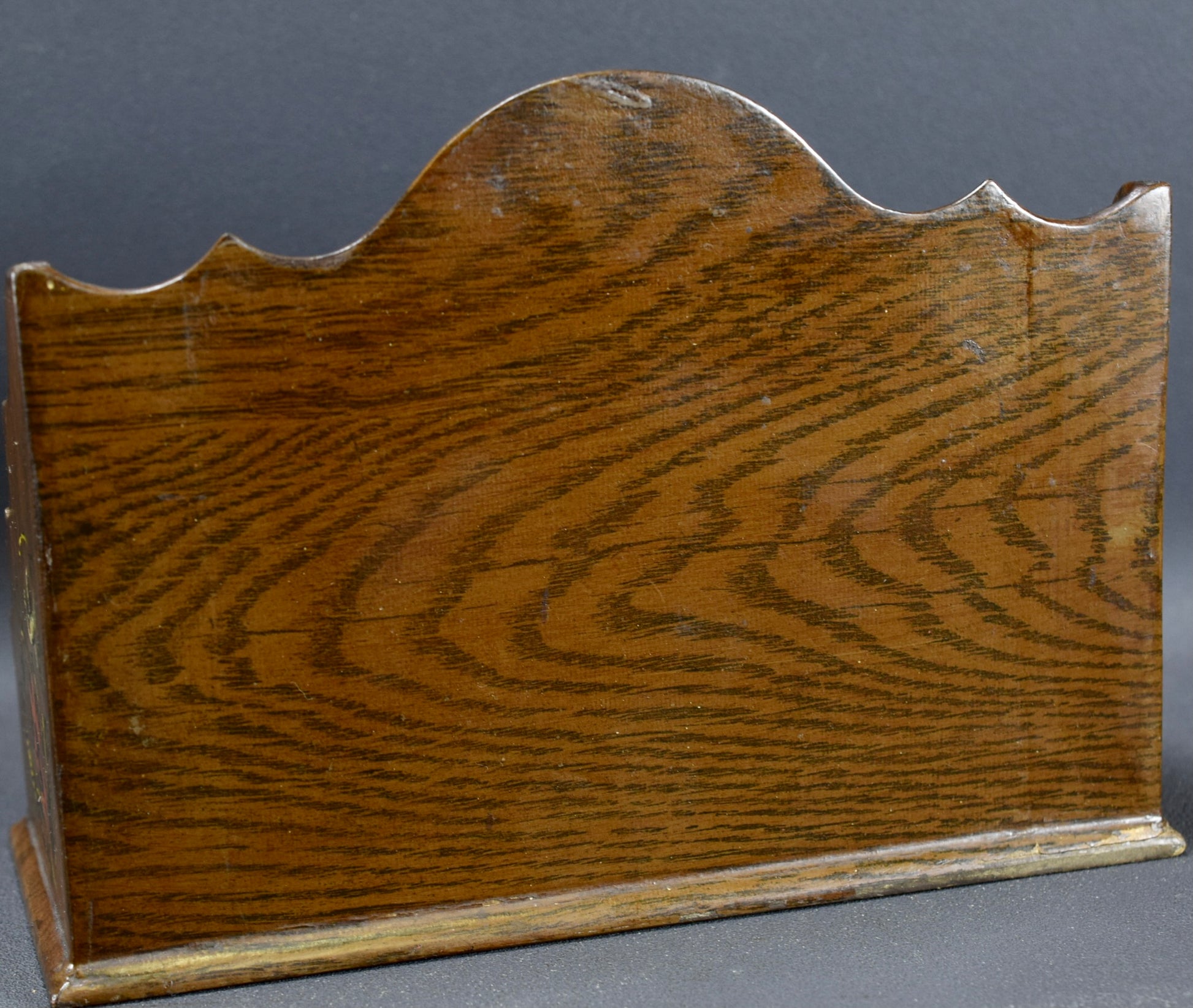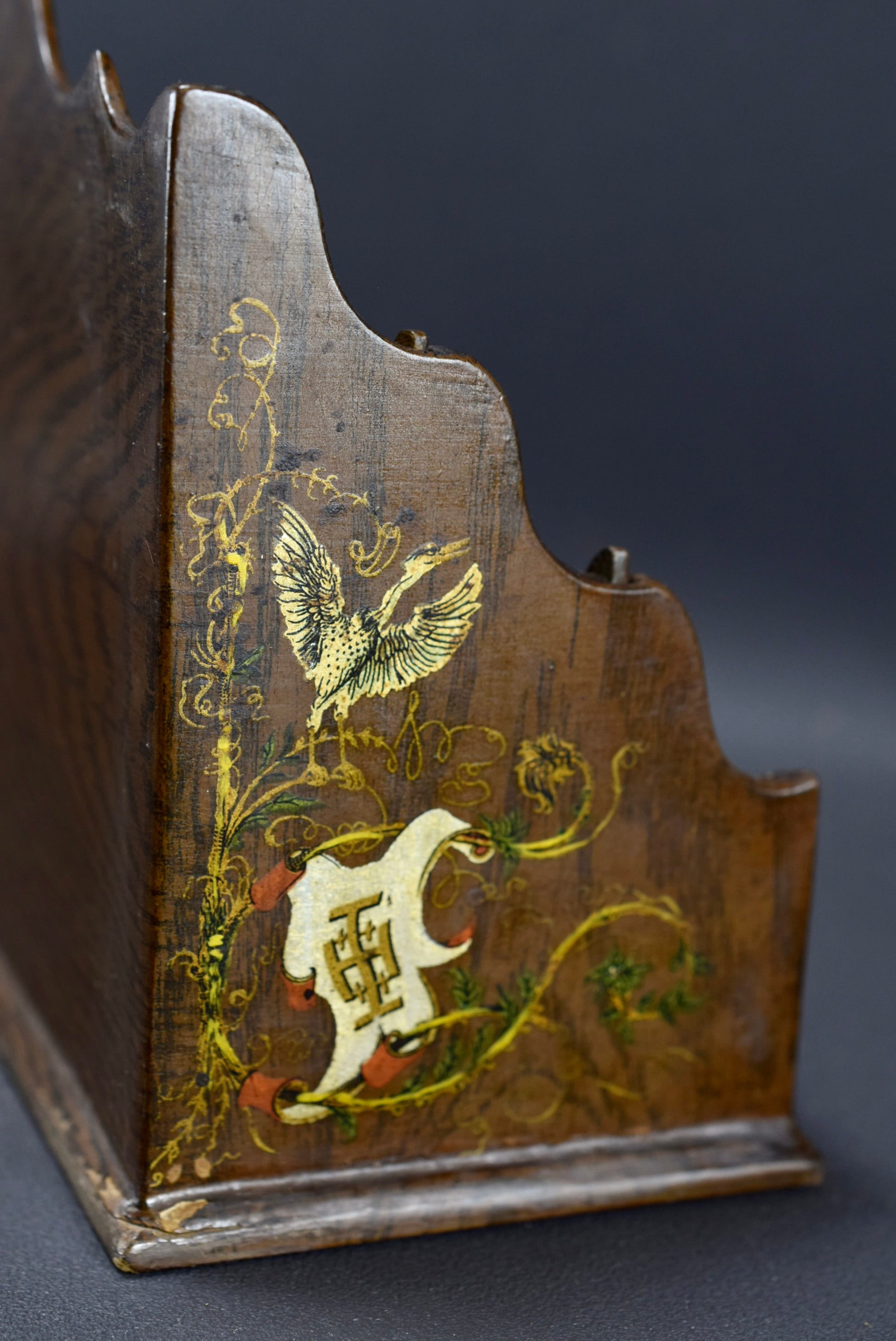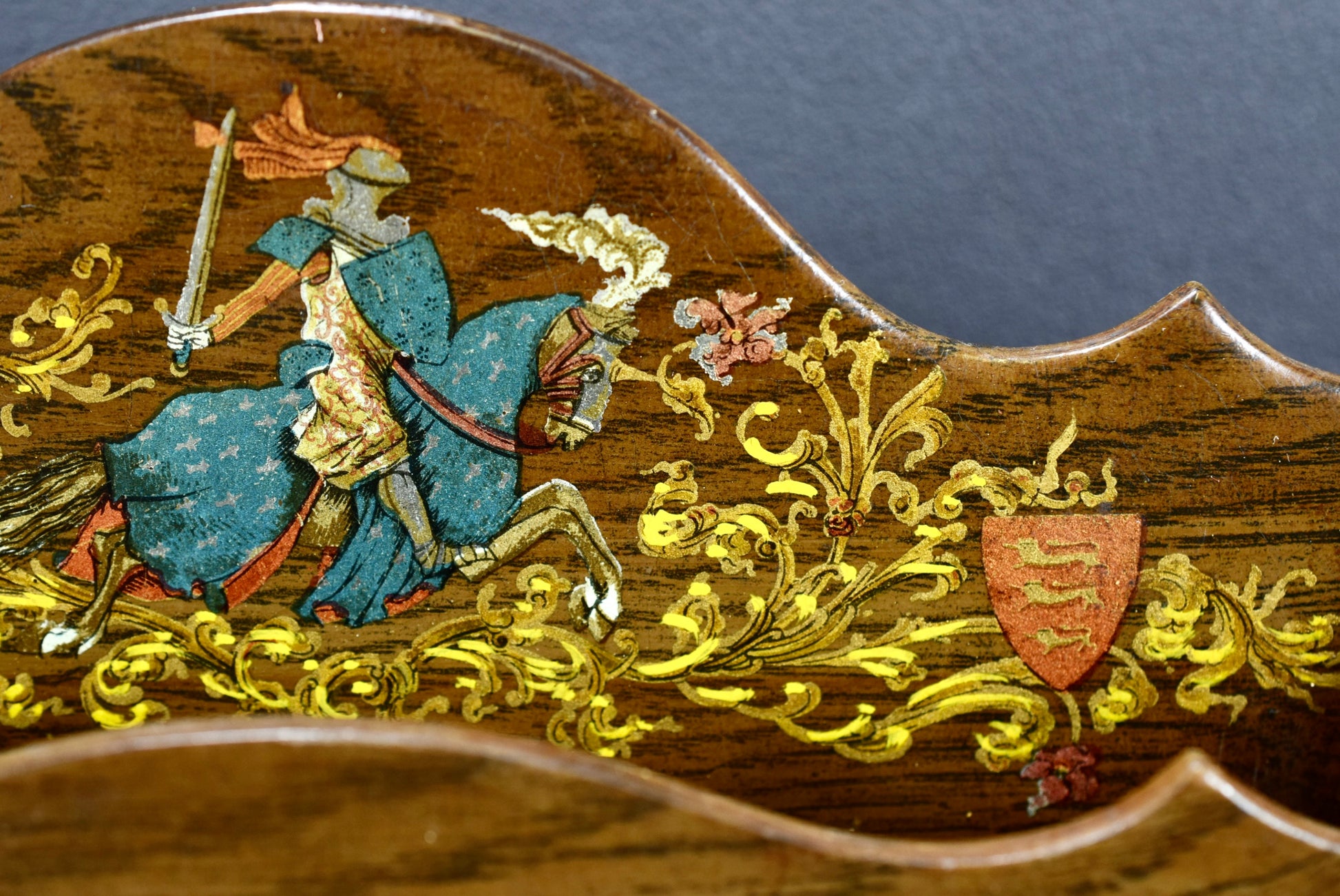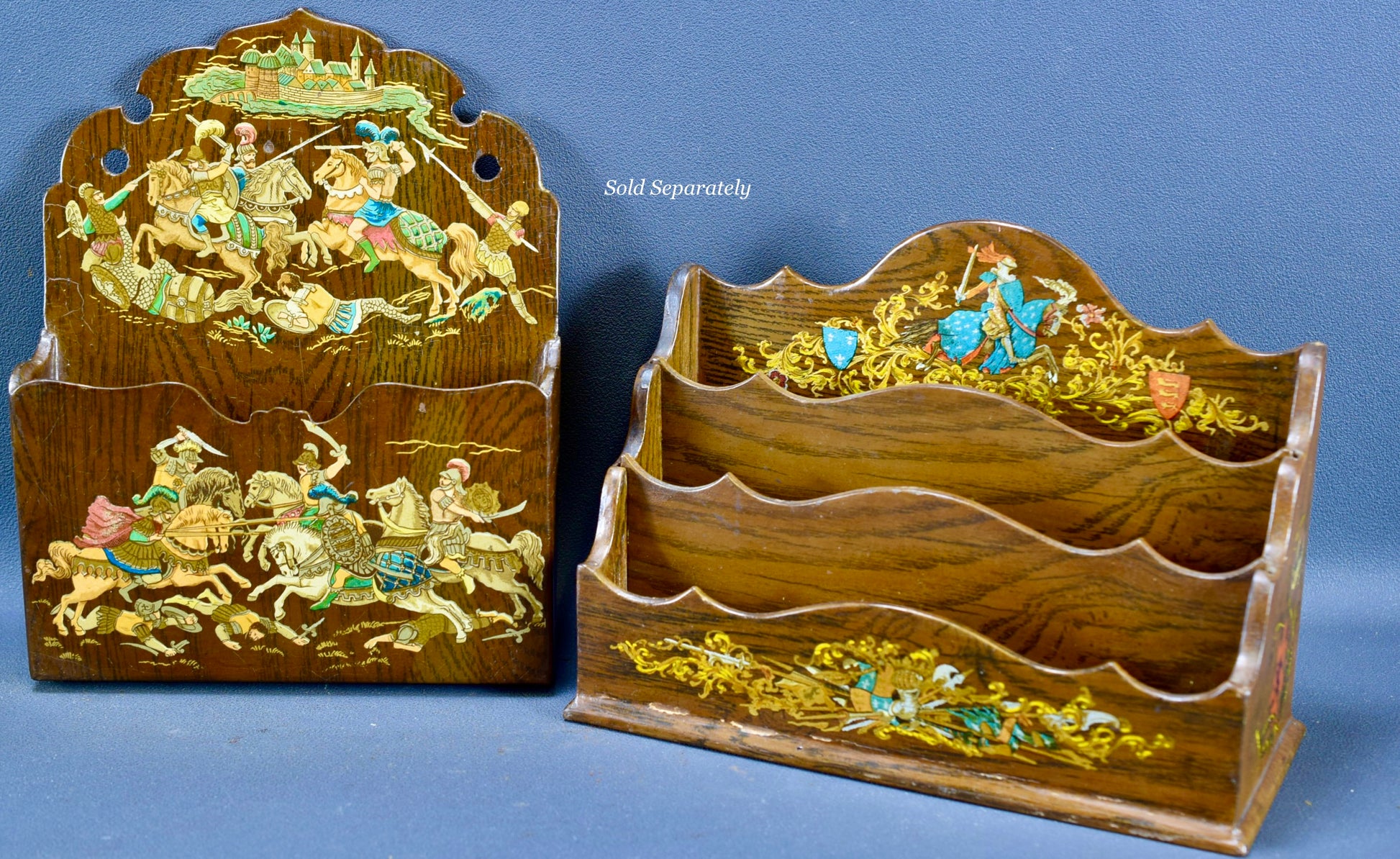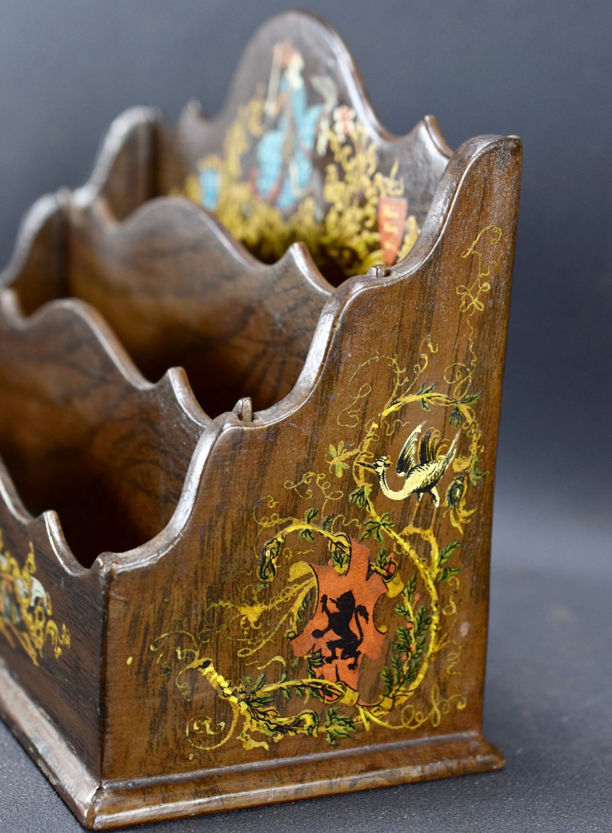 Ce magnifique support de bureau/porte-lettres antique est fait de papier mâché (papier mâché). La couleur marron imite le bois. Le décor présente des motifs de style Moyen Âge : un chevalier, des armoiries, des volutes. Elle date du début du 20e siècle. Un porte-lettre mural assorti est disponible.