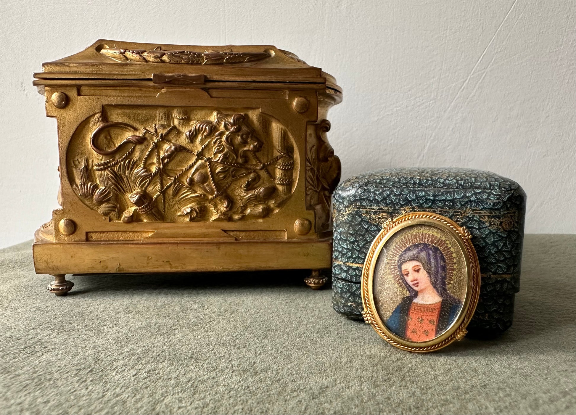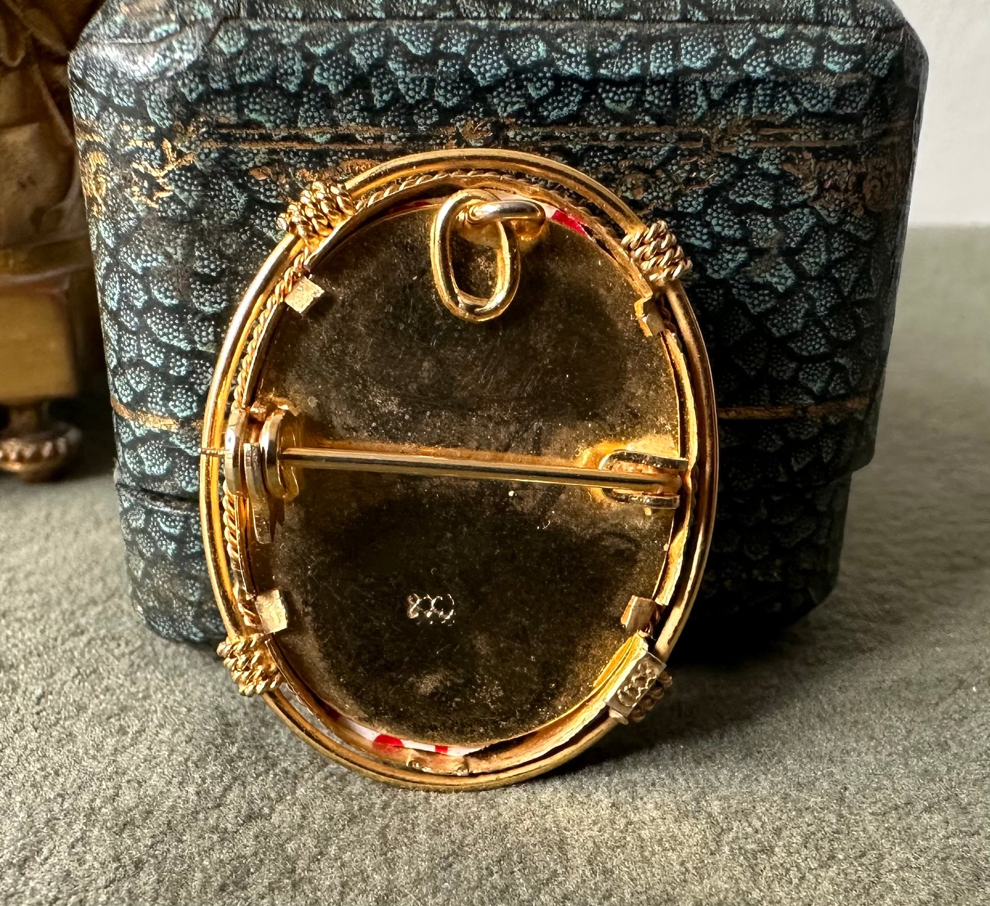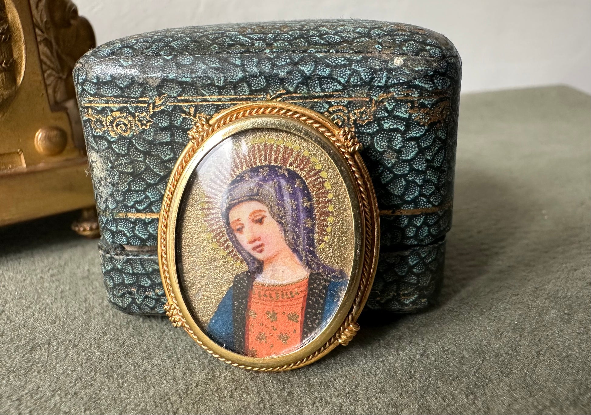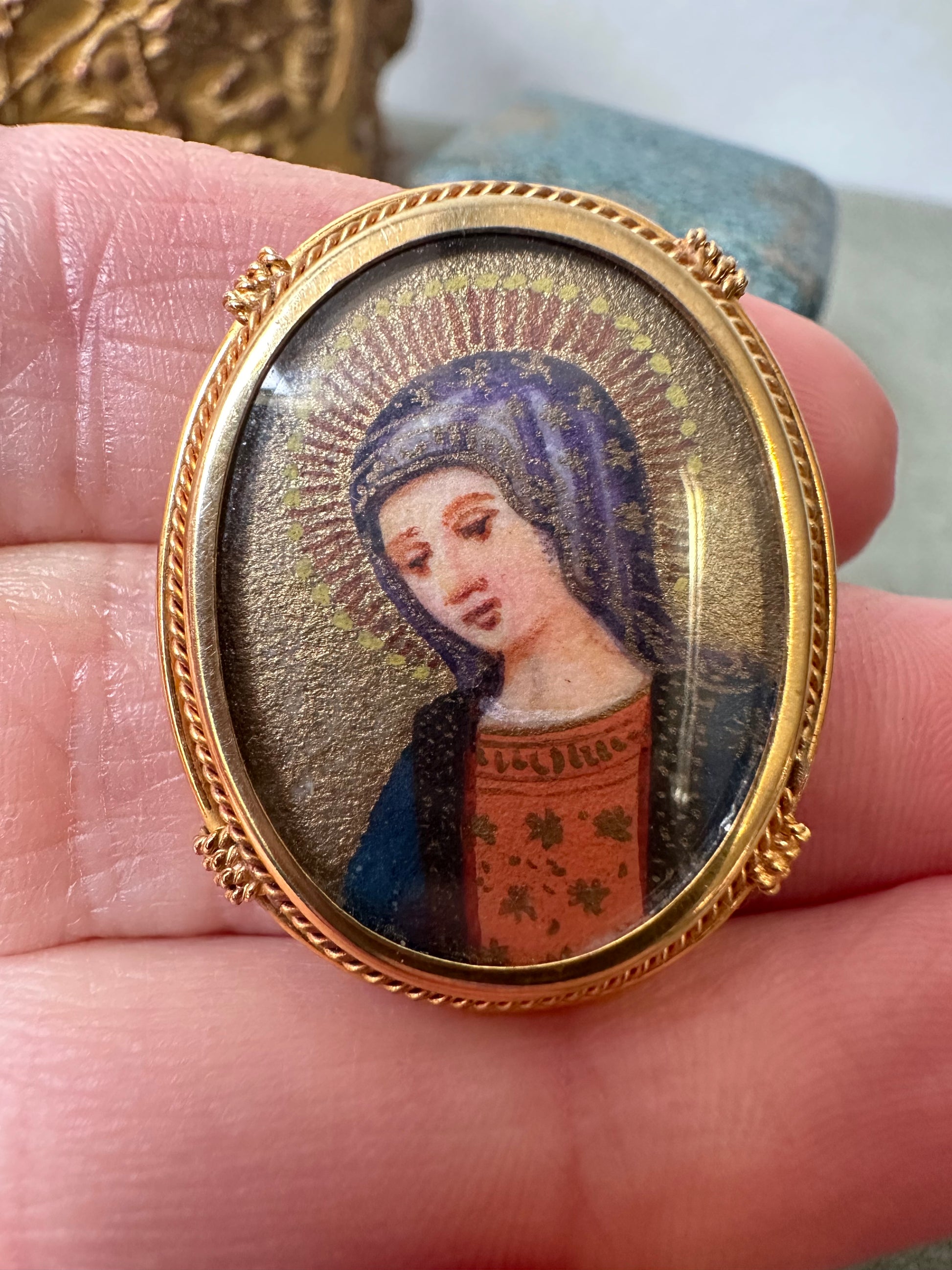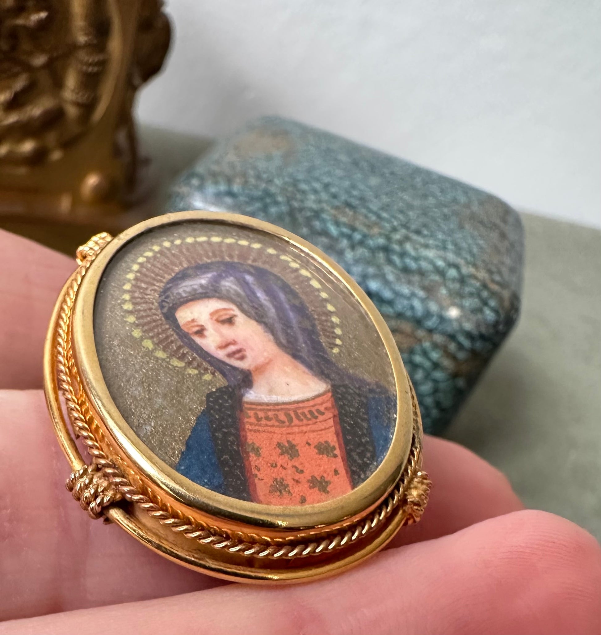 This exquisite vintage piece serves as both a brooch and a pendant, showcasing a finely detailed hand-painted miniature portrait of the Virgin Mary. The artwork depicts Mary wearing a serene blue veil and adorned with a golden halo, all accentuated by delicate gold accents. The painting is safeguarded beneath a protective glass pane, ensuring its longevity. The portrait is elegantly set in a gold-filled sterling silver mount, adding a touch of timeless sophistication. The mount bears two "800" silver hallmarks, attesting to its quality and craftsmanship. A versatile and spiritual treasure, perfect for collectors and admirers of devotional art.
