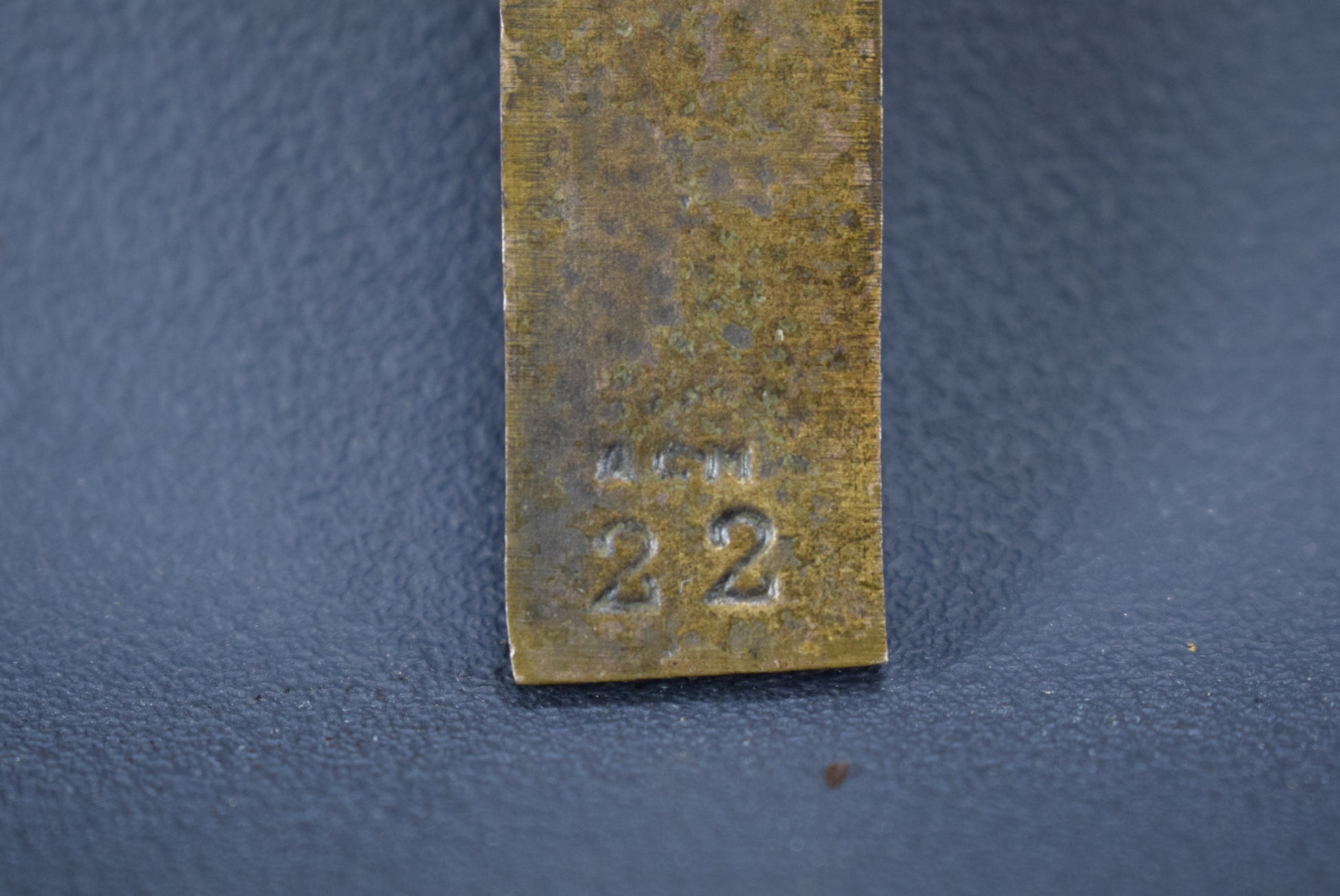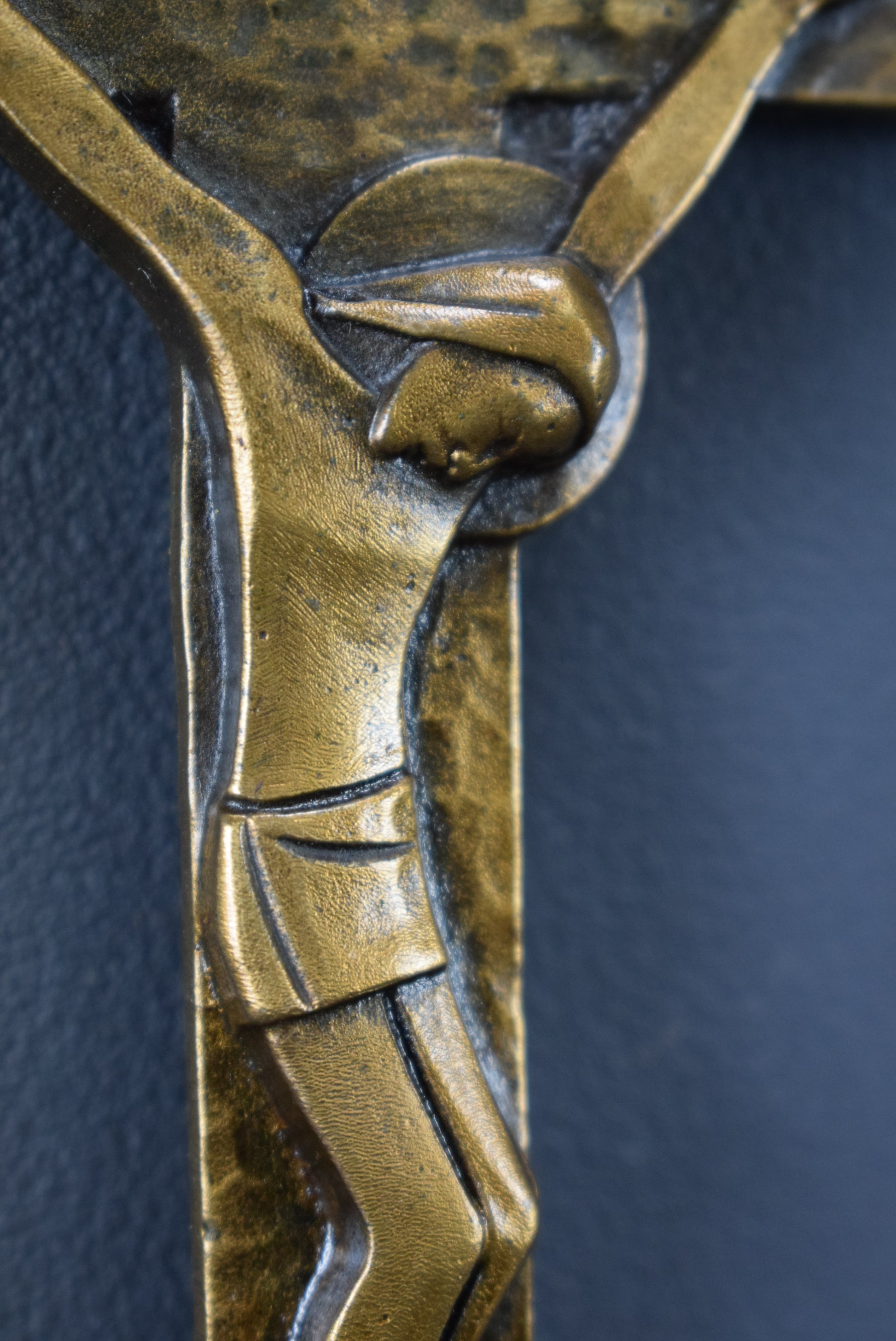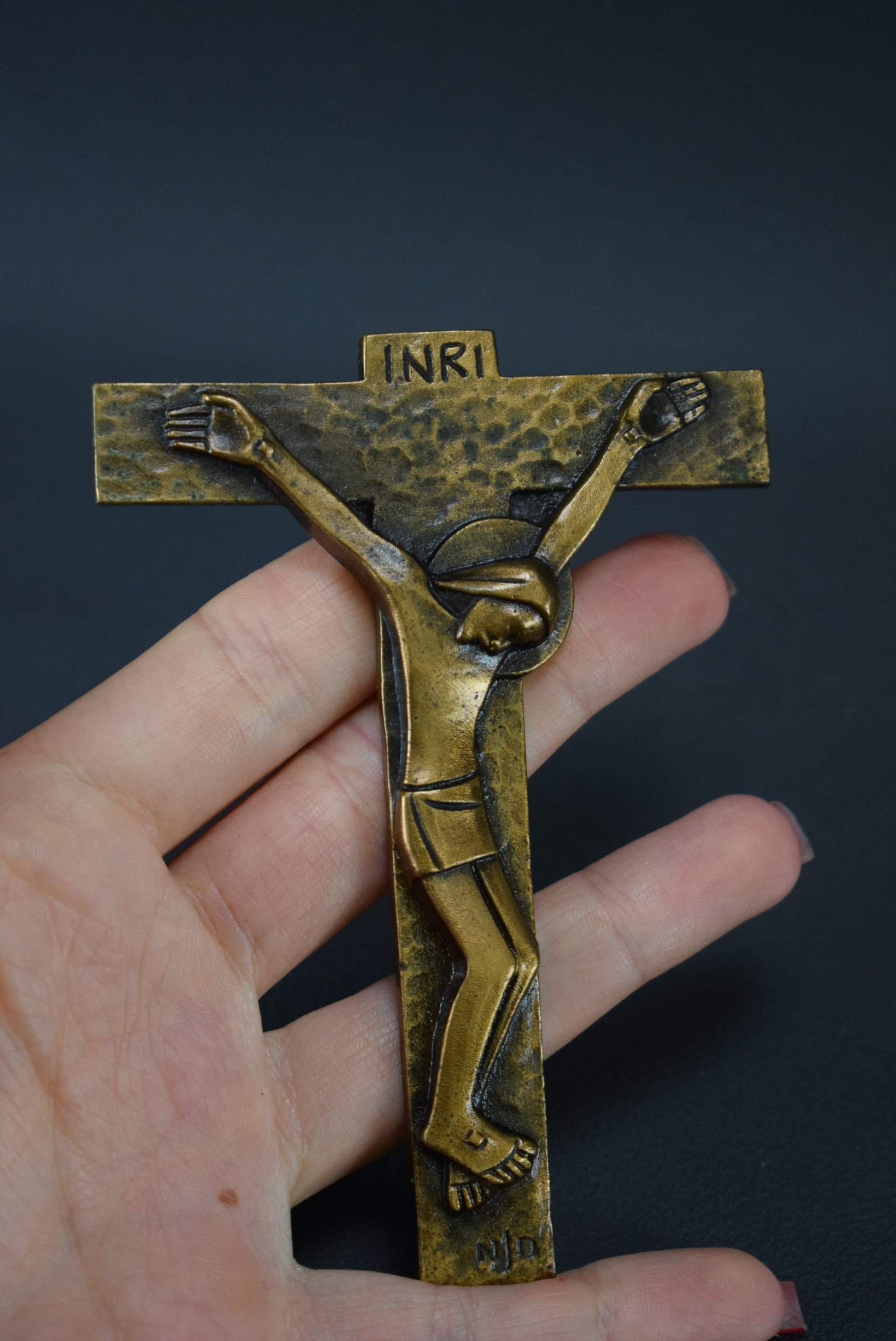 Une petite croix murale religieuse vintage française ou un grand crucifix pectoral en bronze. Le crucifix au design moderniste porte le numéro 22.