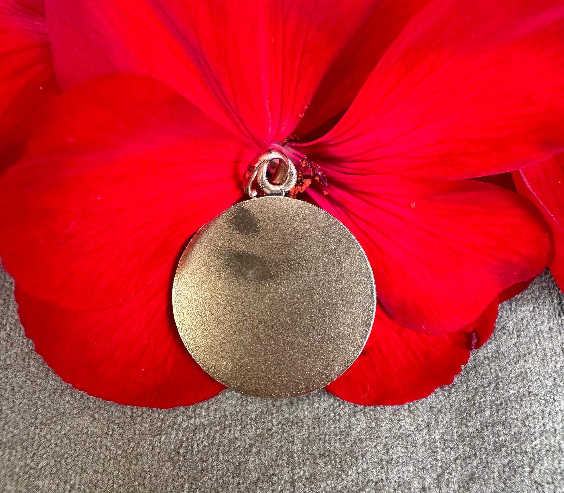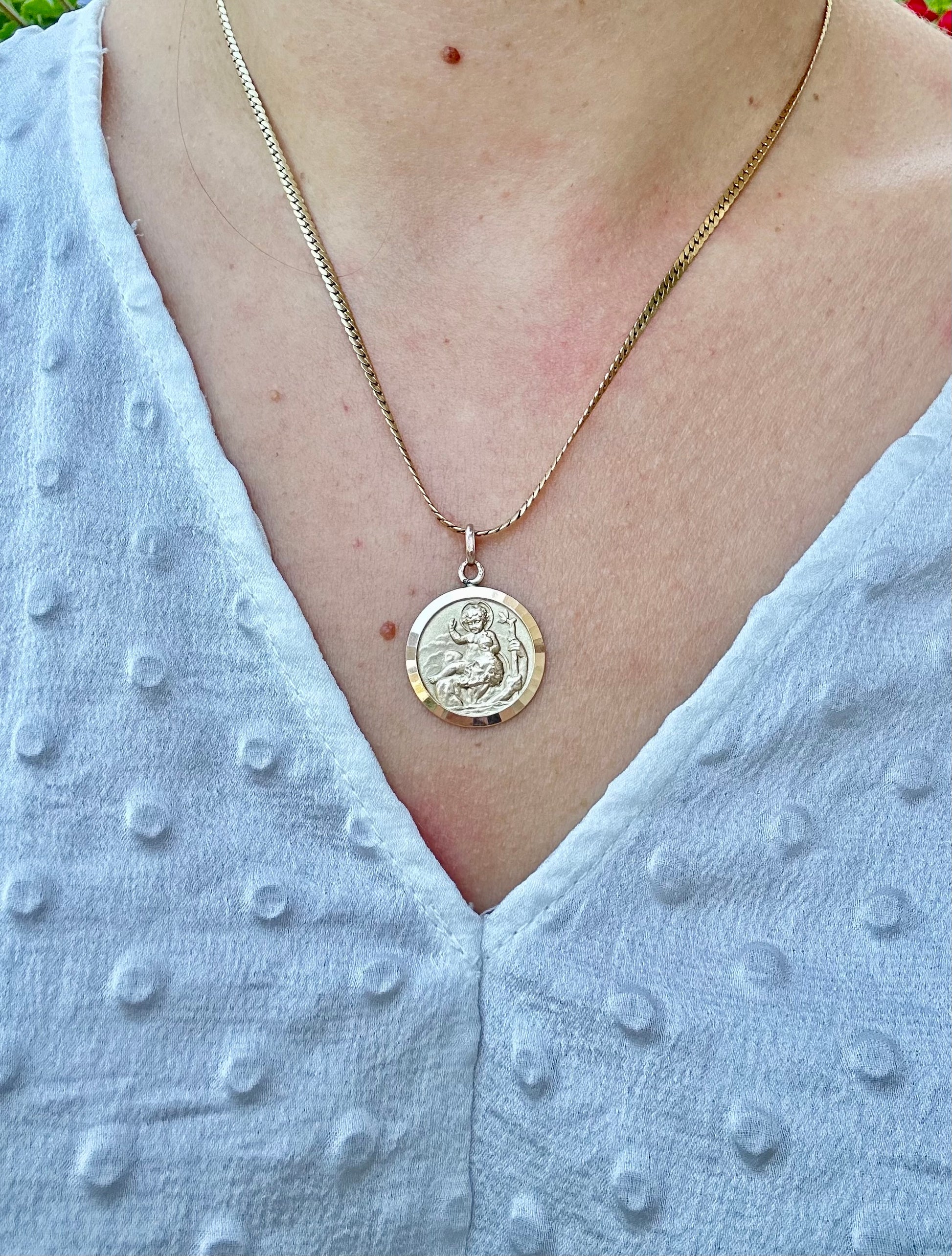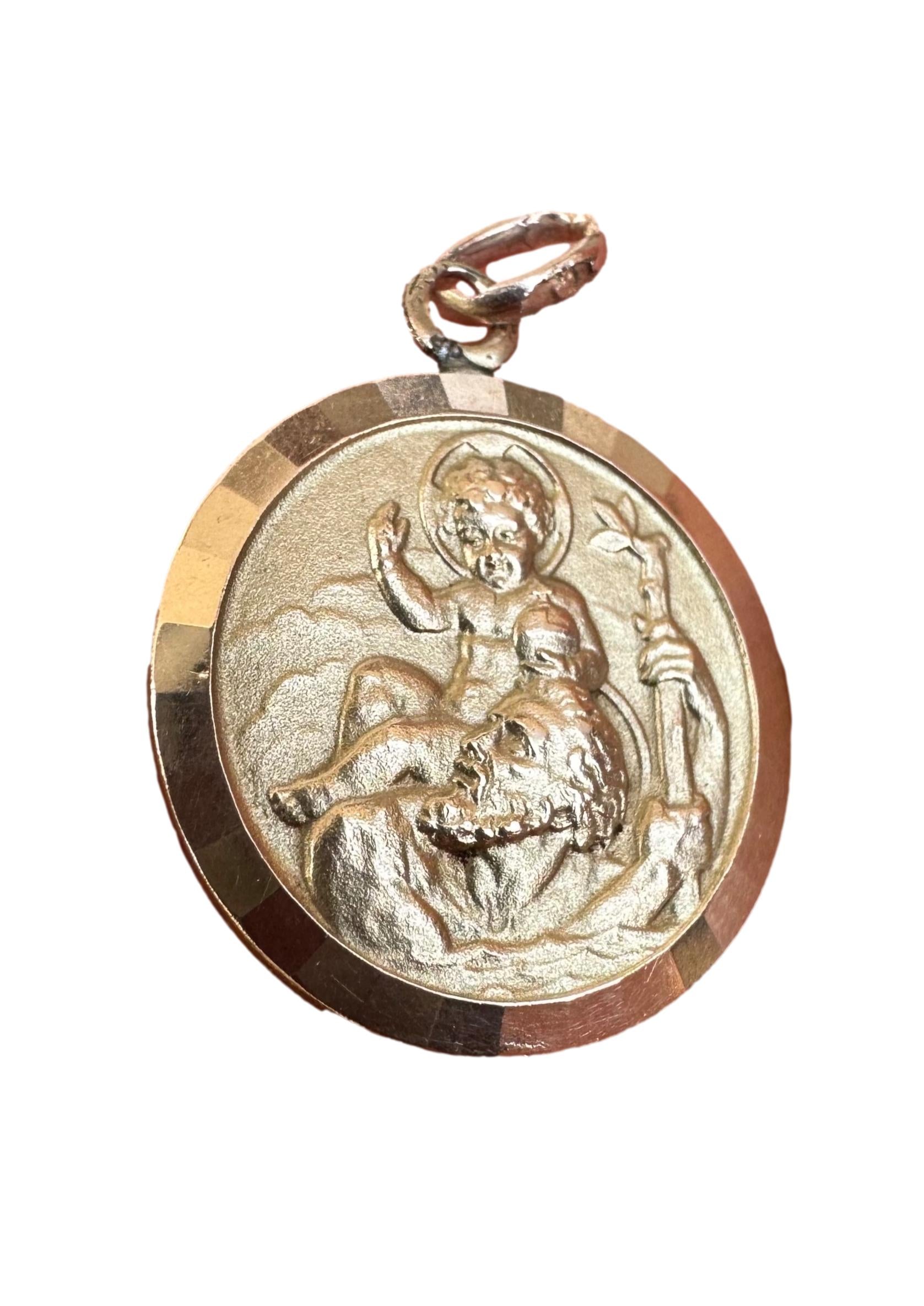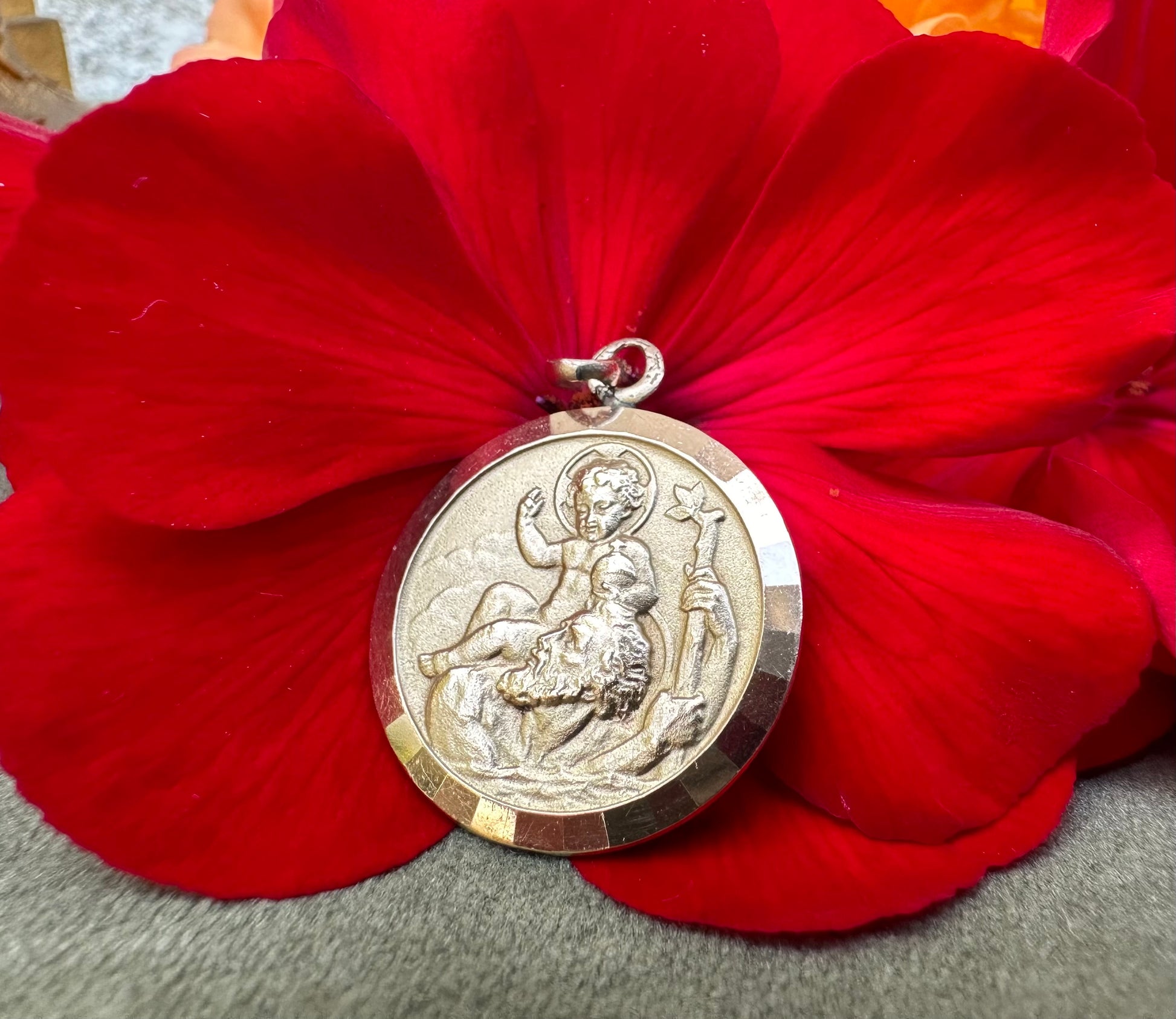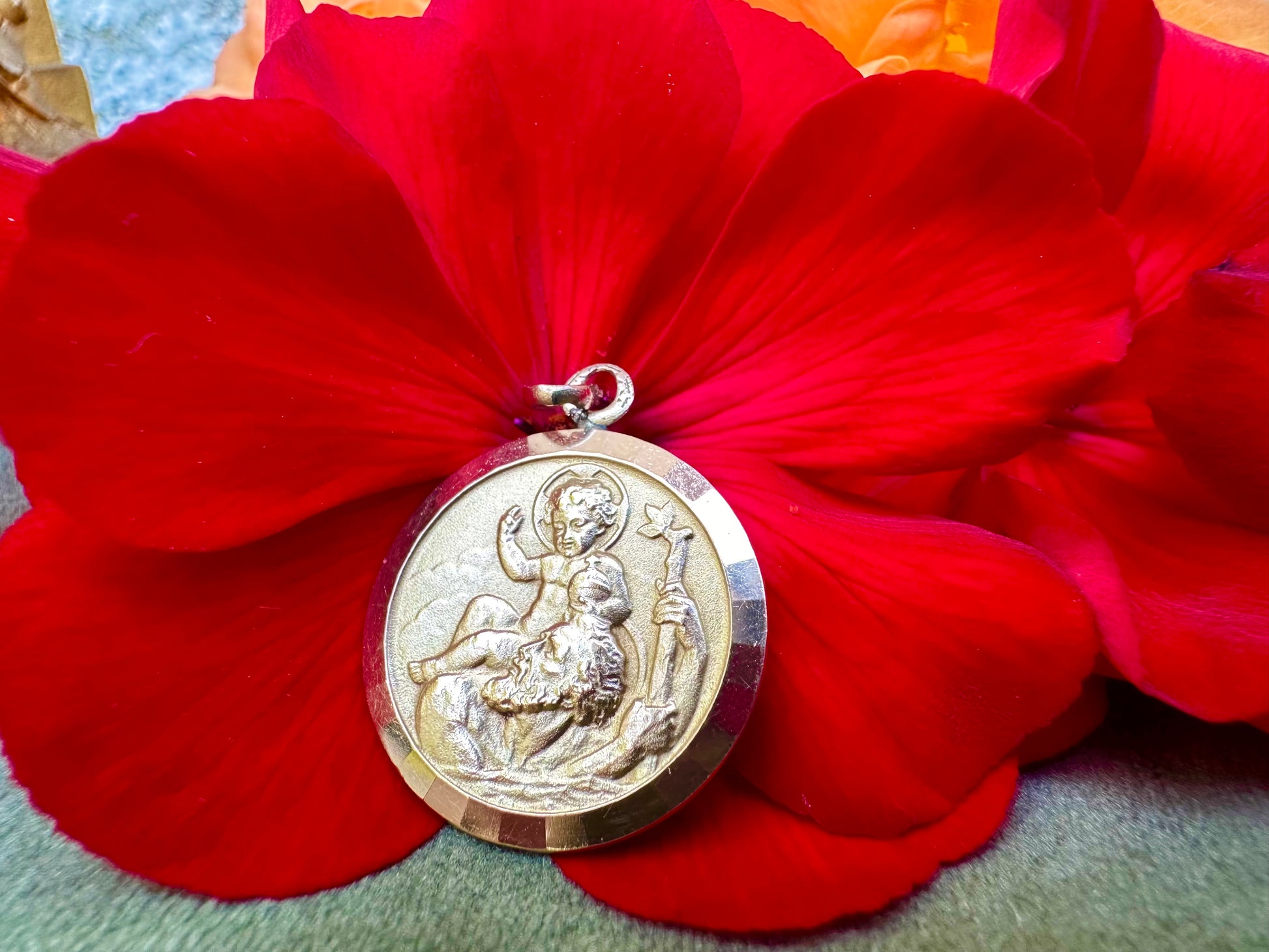 At the center of the pendant is a detailed depiction of St. Christopher, the patron saint of drivers and travelers, symbolizing protection and safe passage. The image of St. Christopher carrying the Christ child is a powerful and enduring symbol, making this pendant not only a stylish accessory but also a meaningful spiritual amulet.