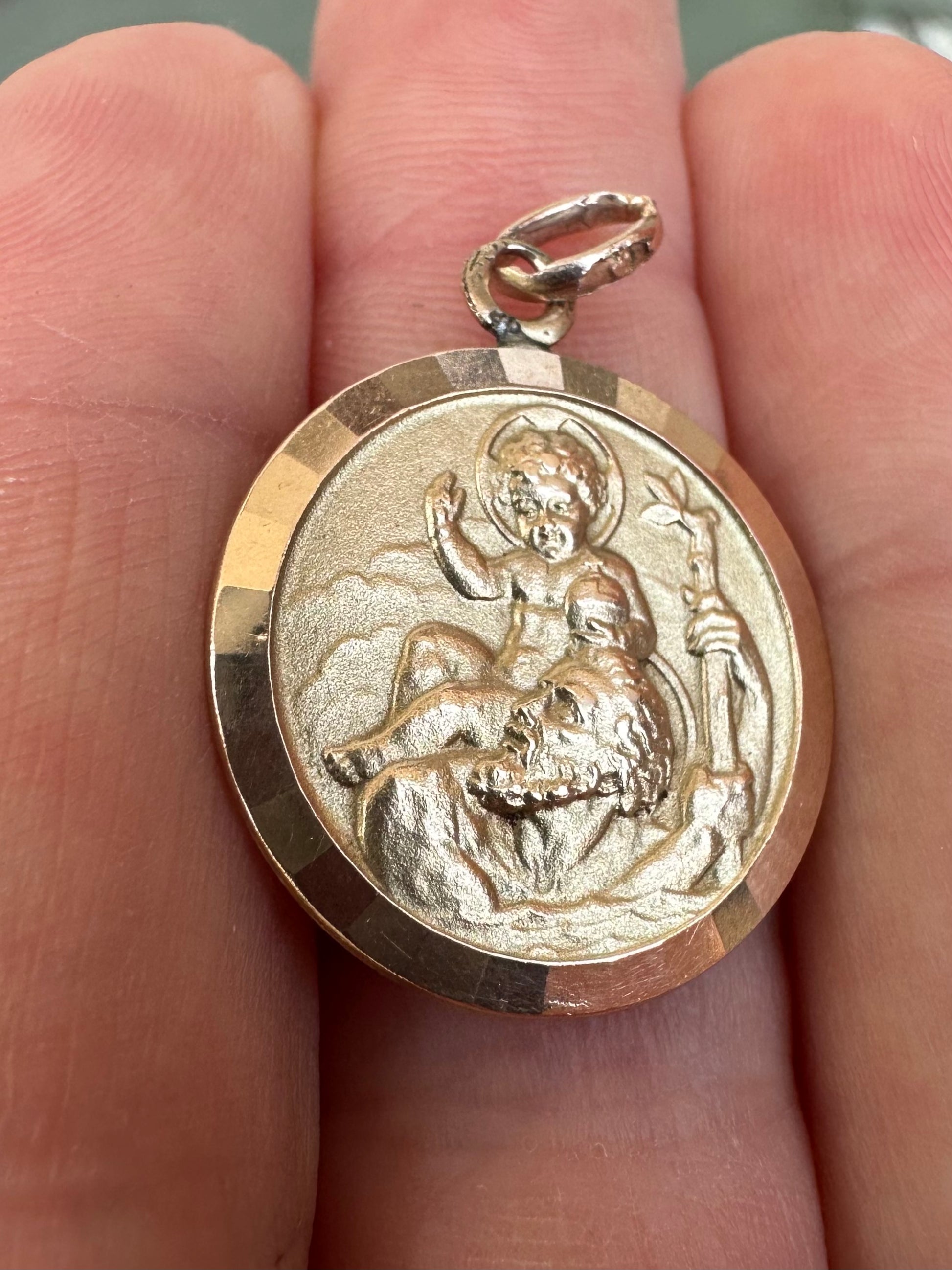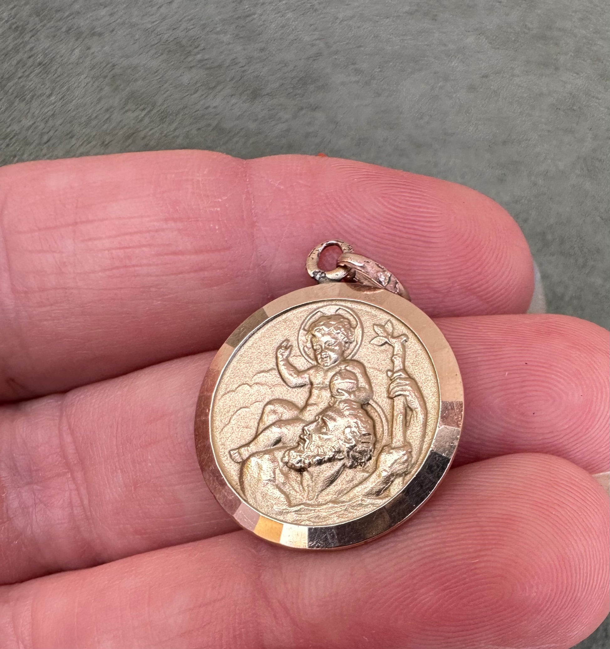 This Art Deco St. Christopher gold-plated pendant is a beautifully crafted French religious medal that reflects the sleek, geometric elegance characteristic of the Art Deco period. The pendant is gold-plated, giving it a warm, lustrous finish that highlights its fine details. The edges of the pendant are faceted, adding a touch of sophistication and creating a subtle play of light that enhances its visual appeal.